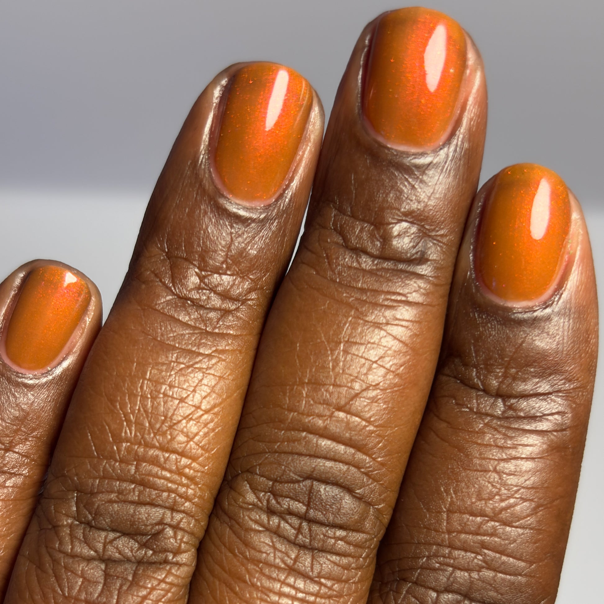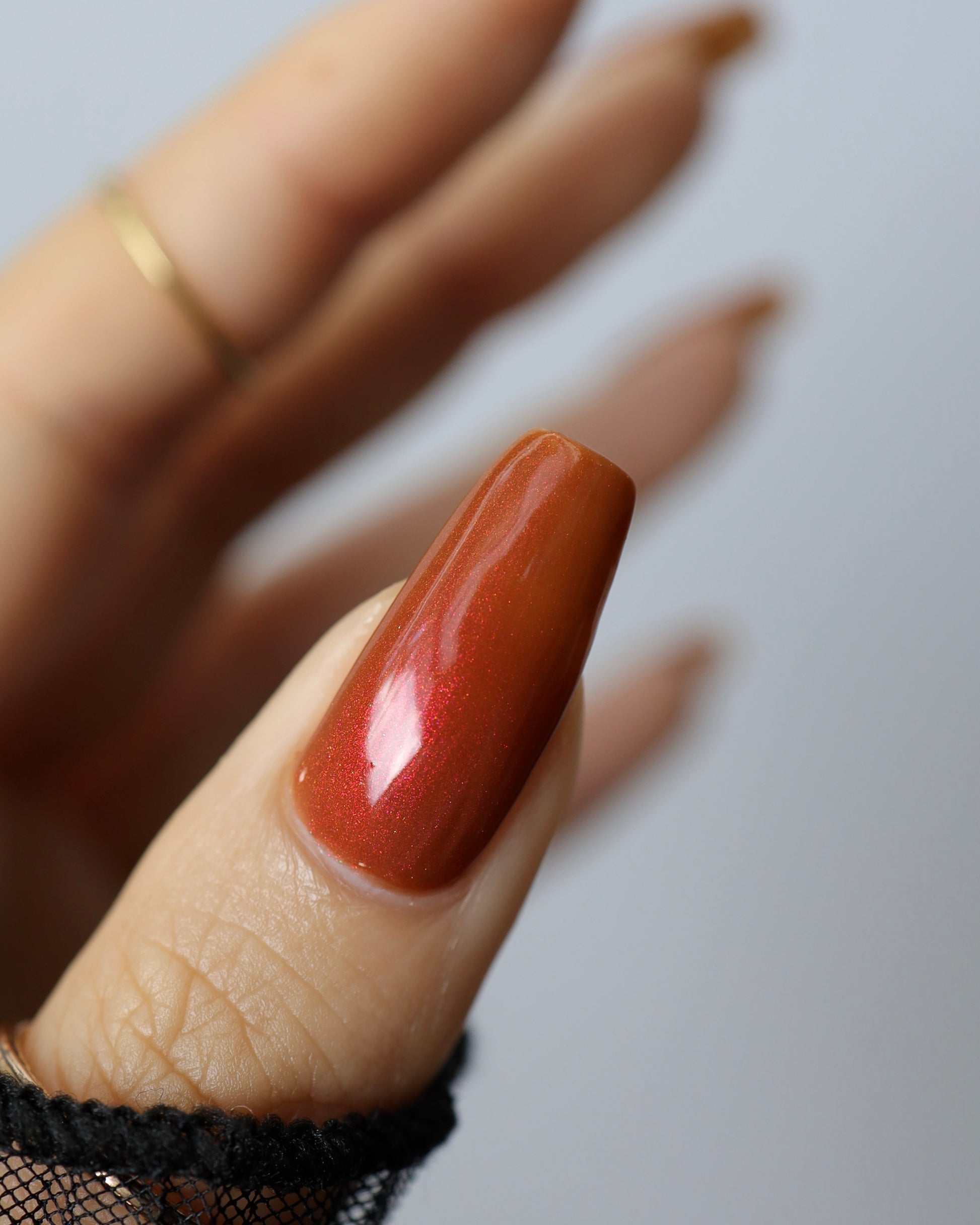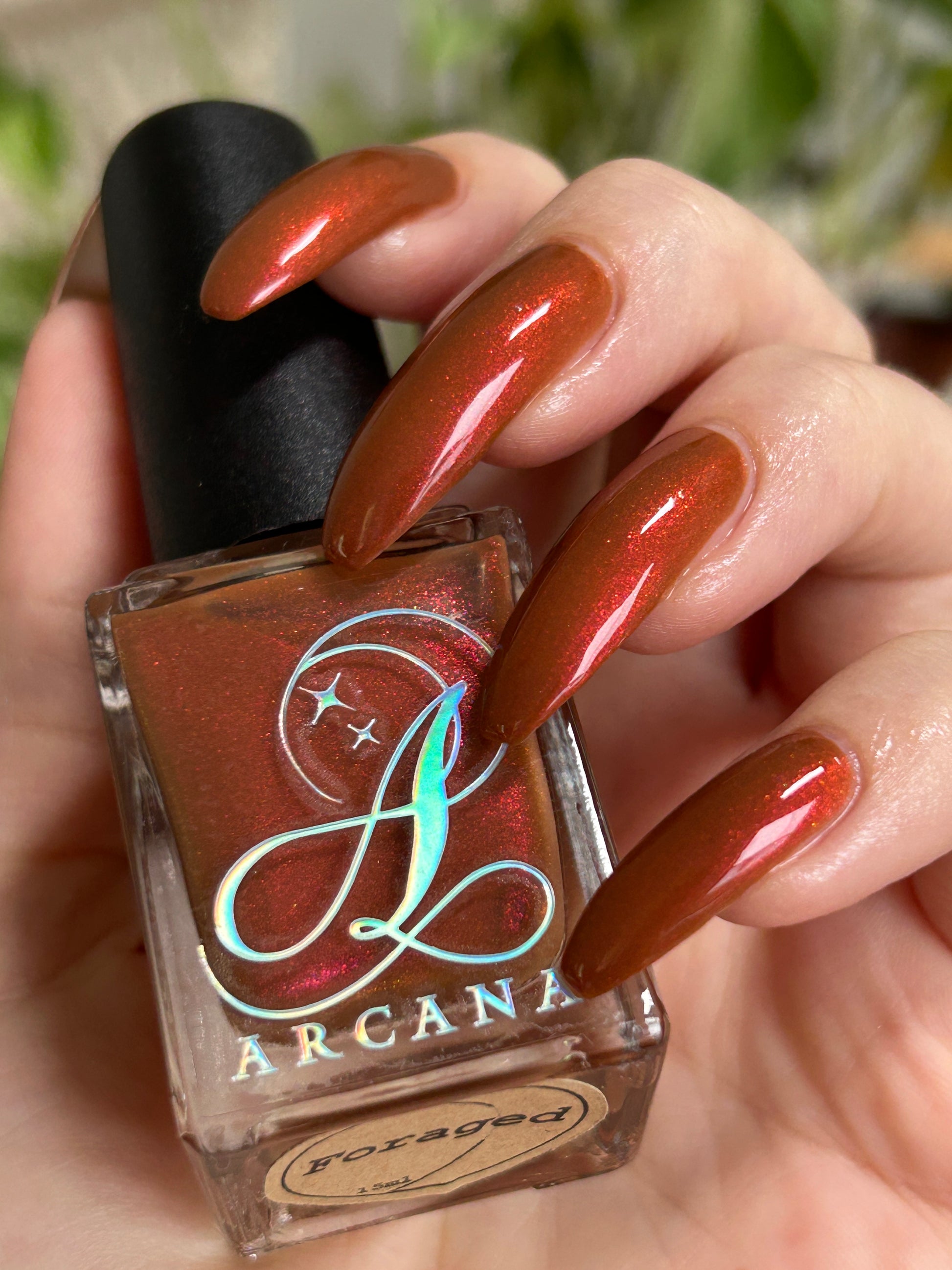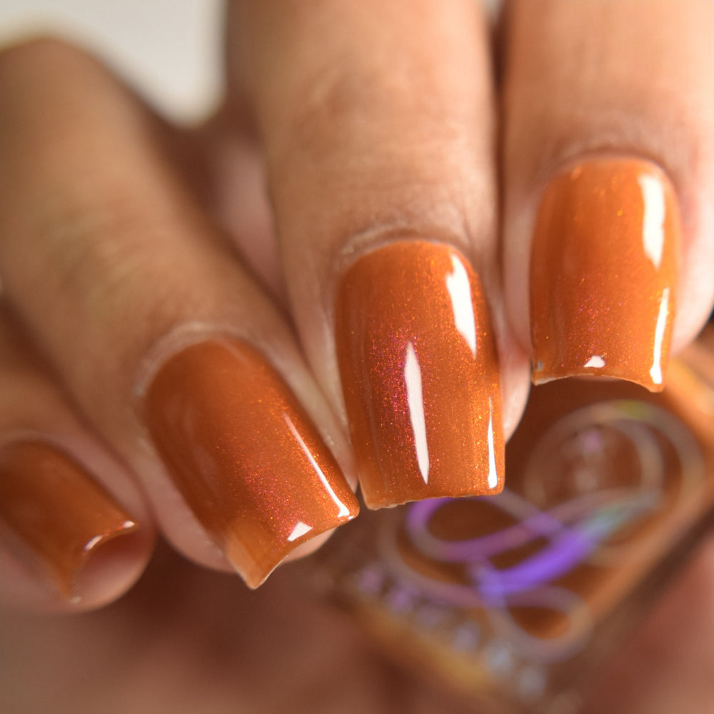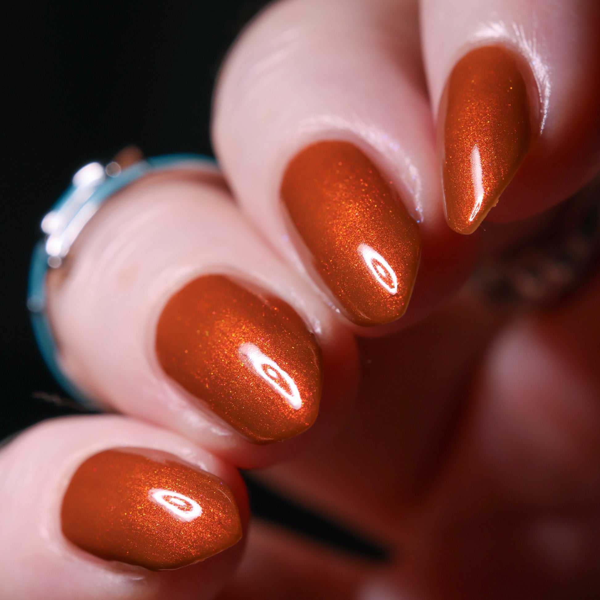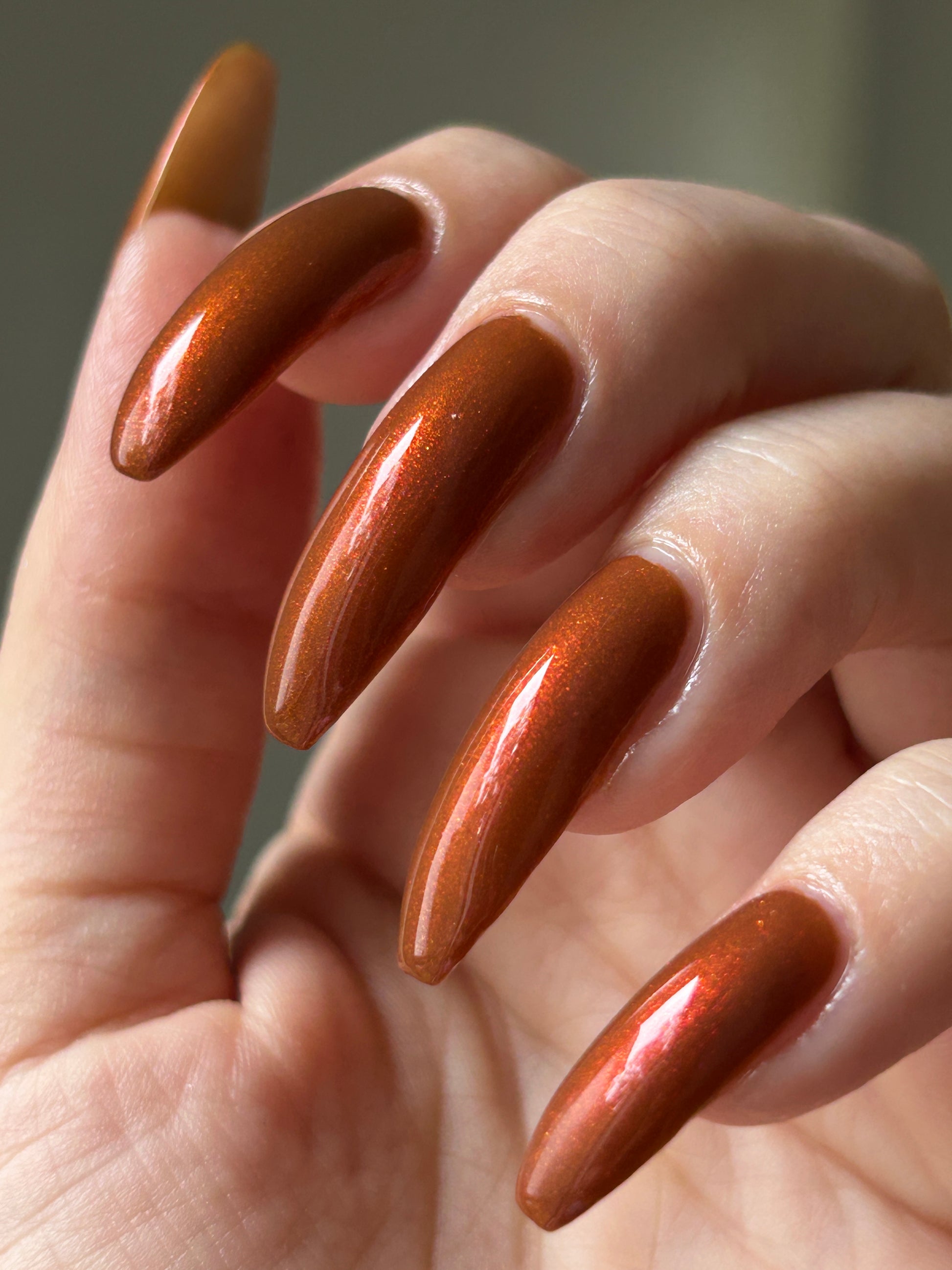 Foraged has a muted brown-orange base with red to orange shimmer.