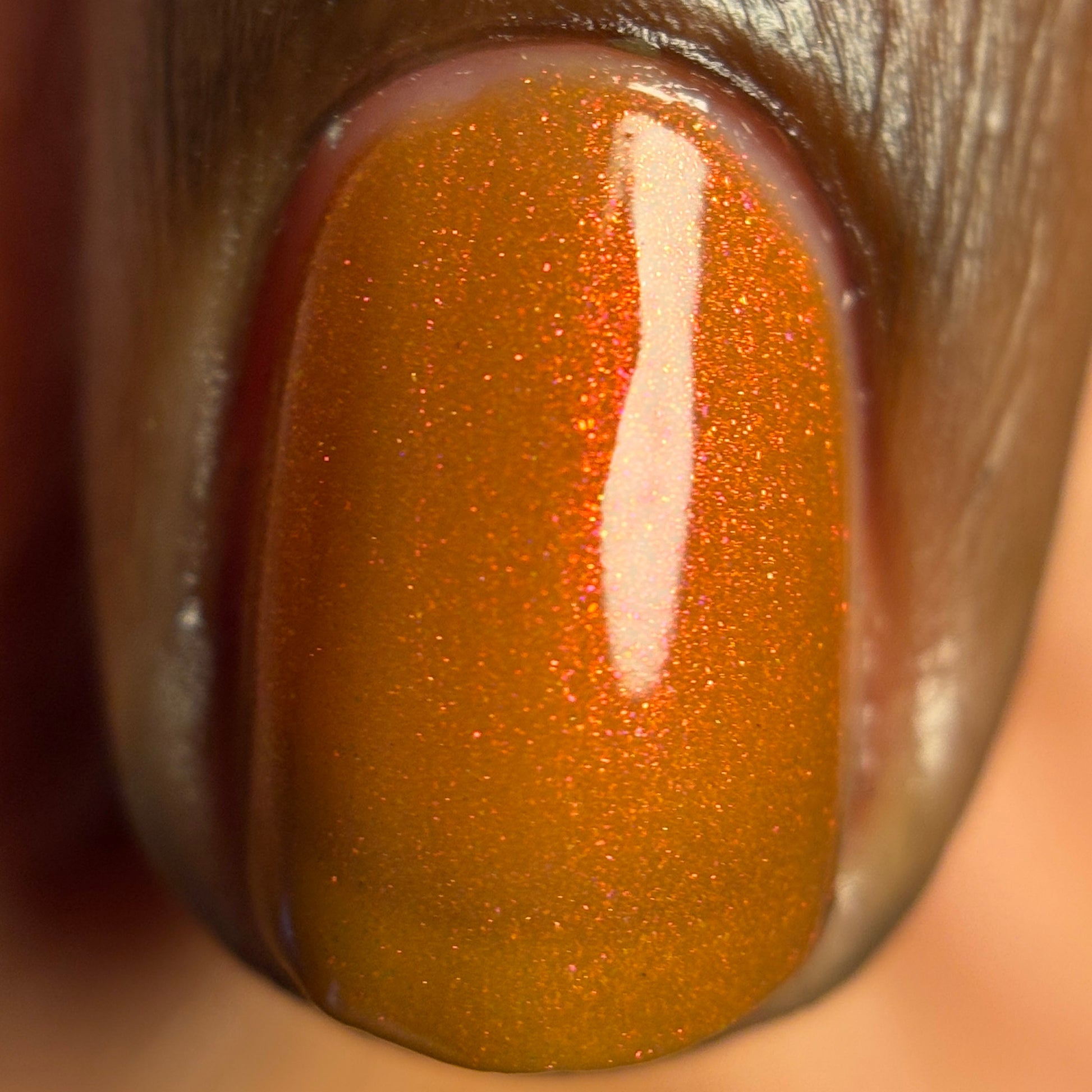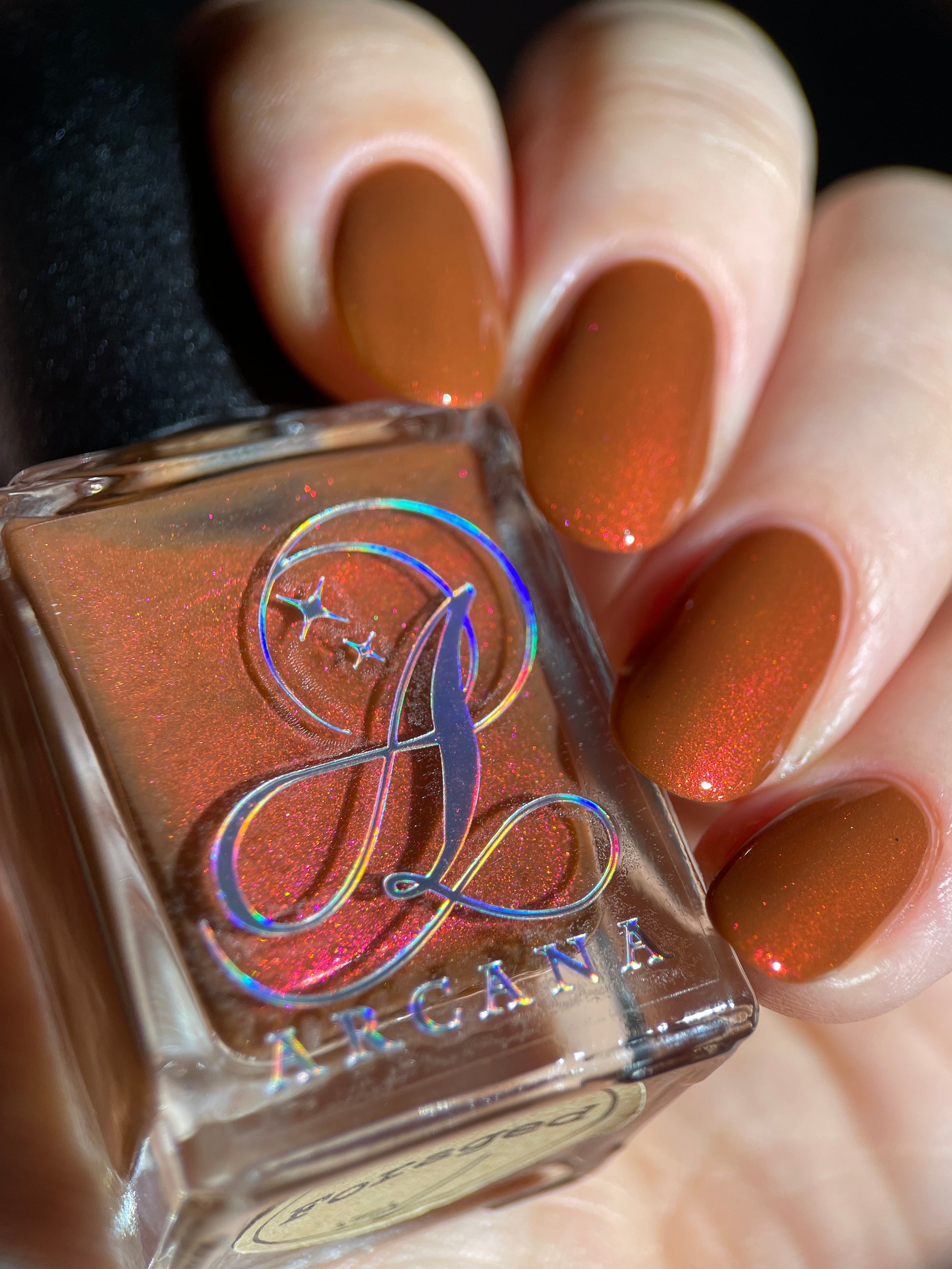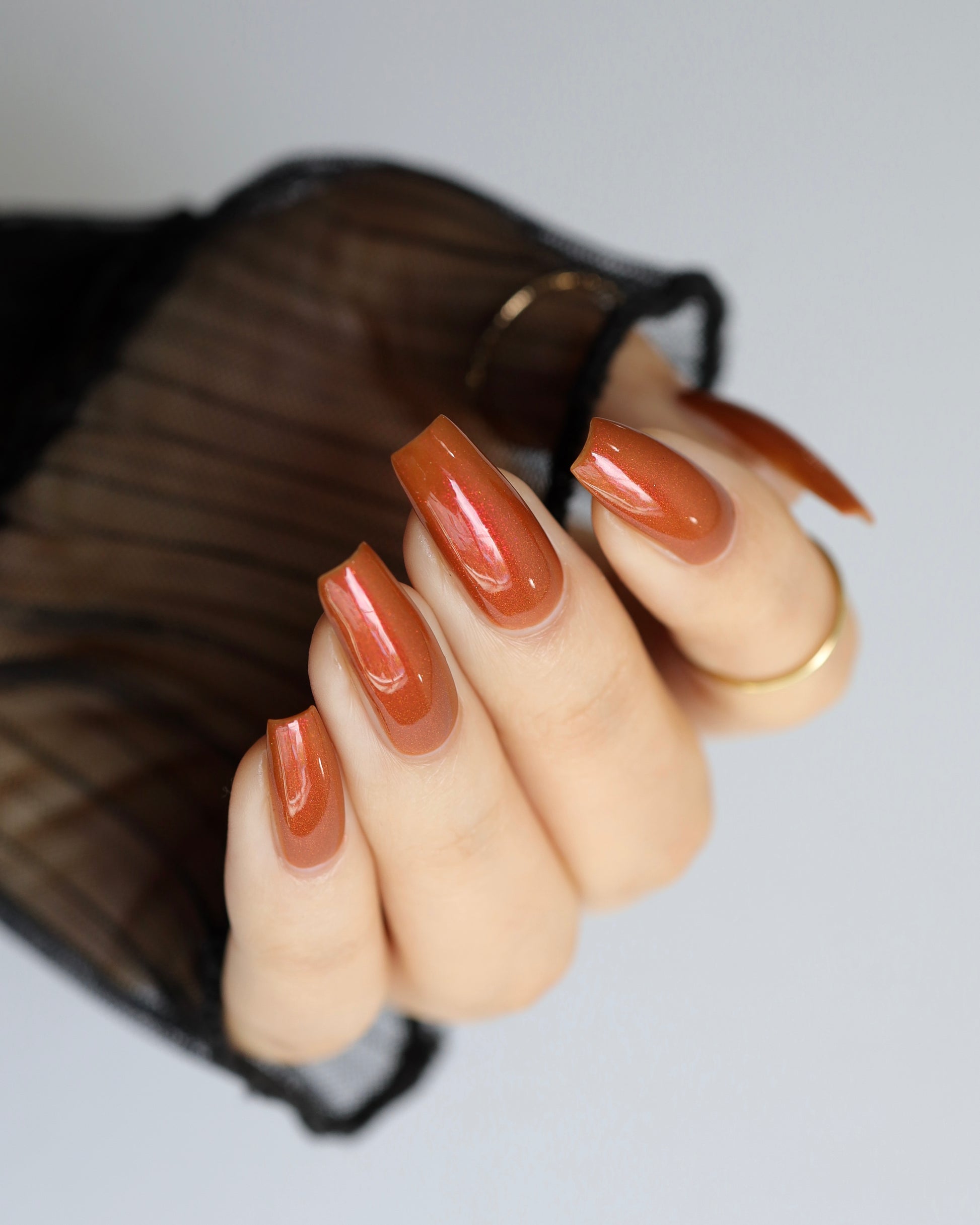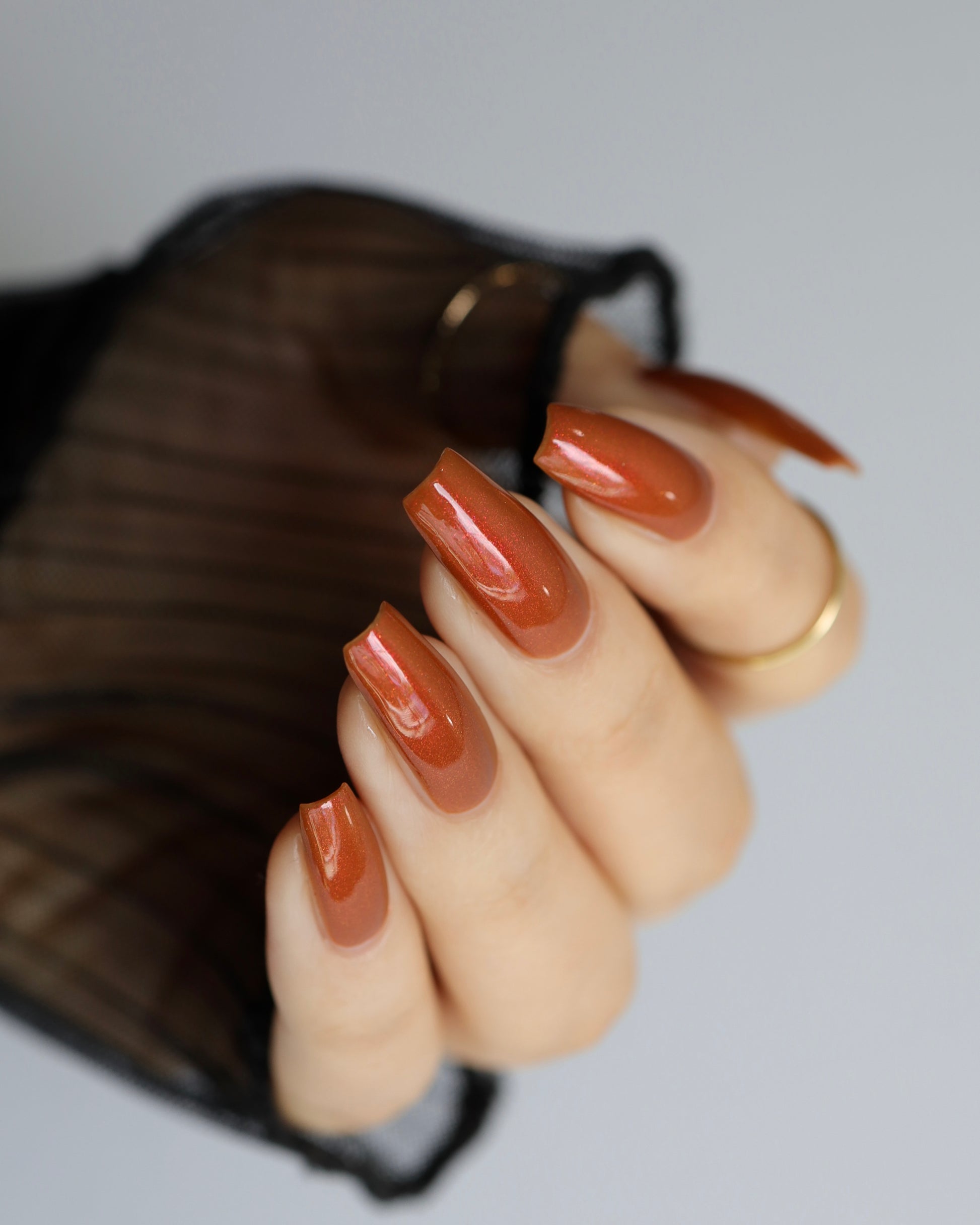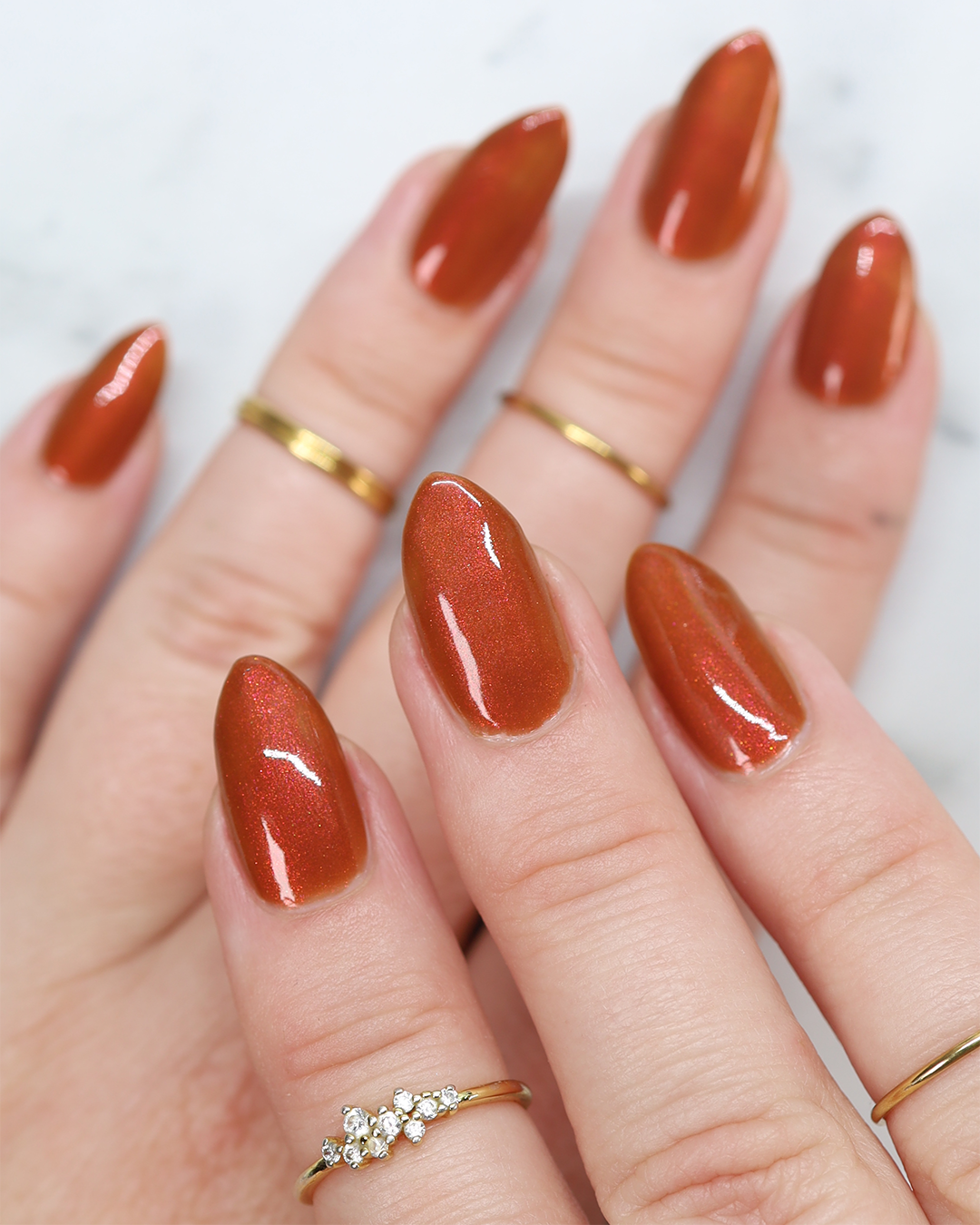 Foraged has a muted brown-orange base with red to orange shimmer.
