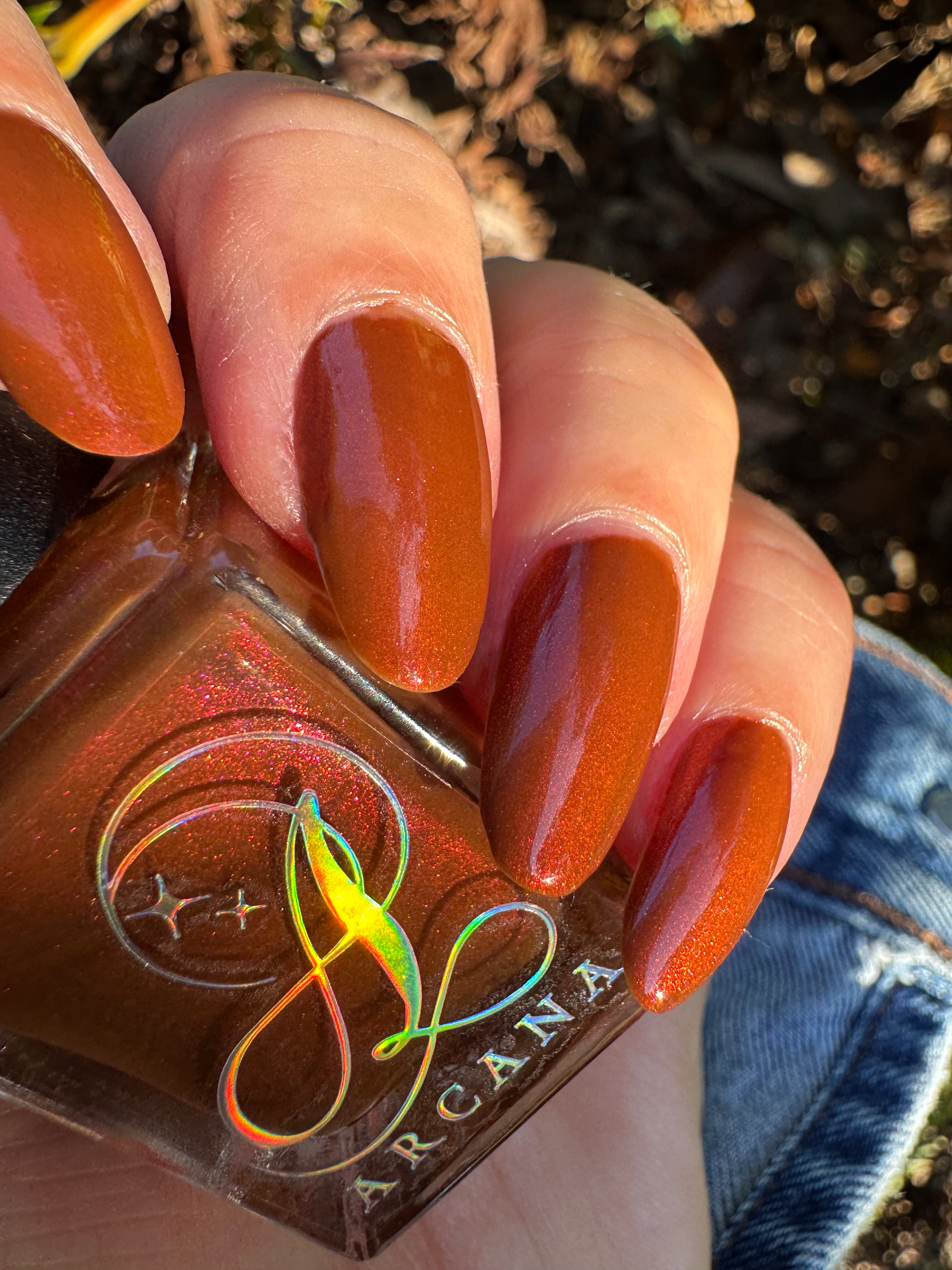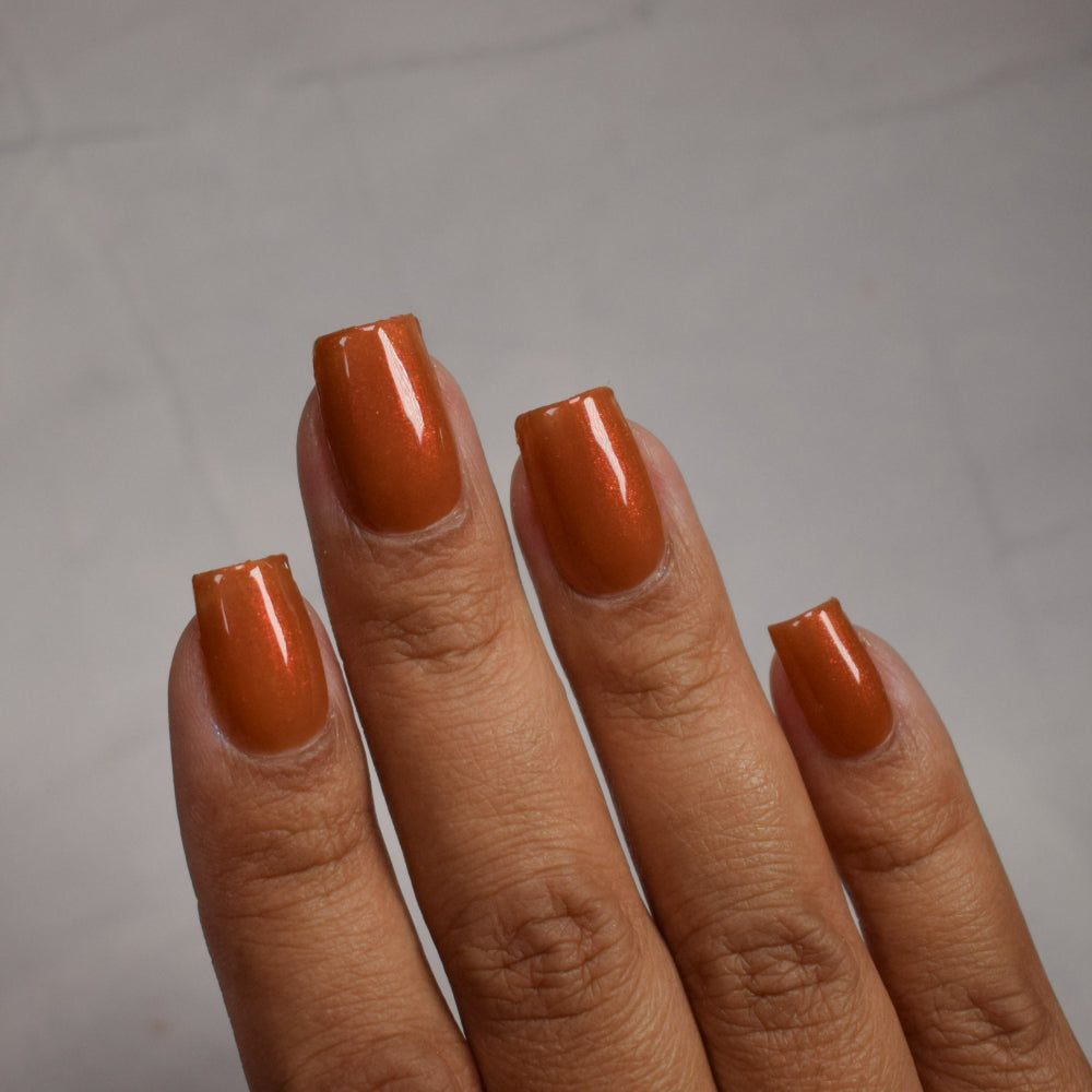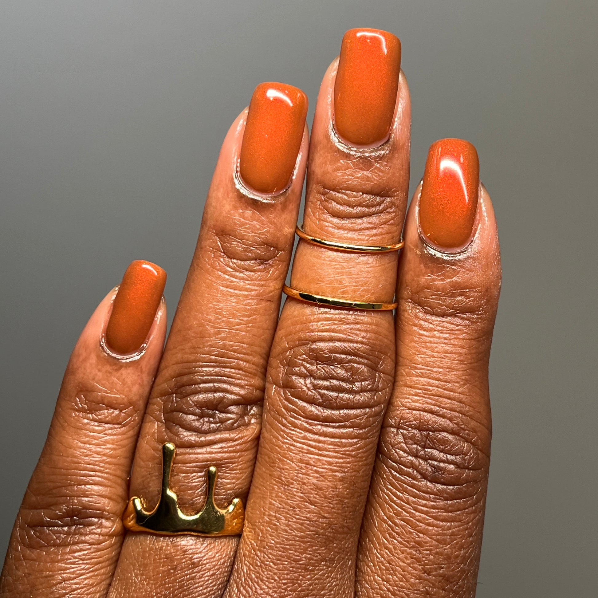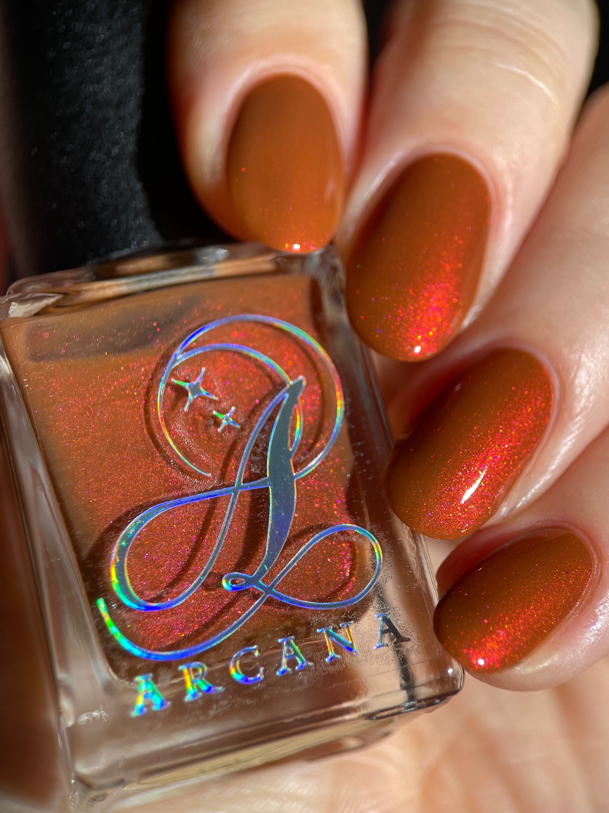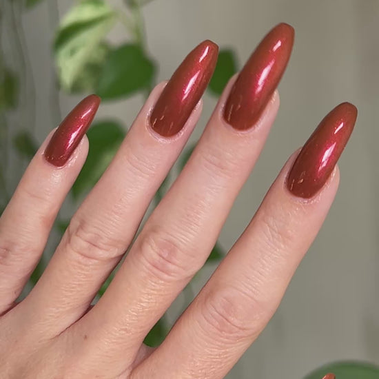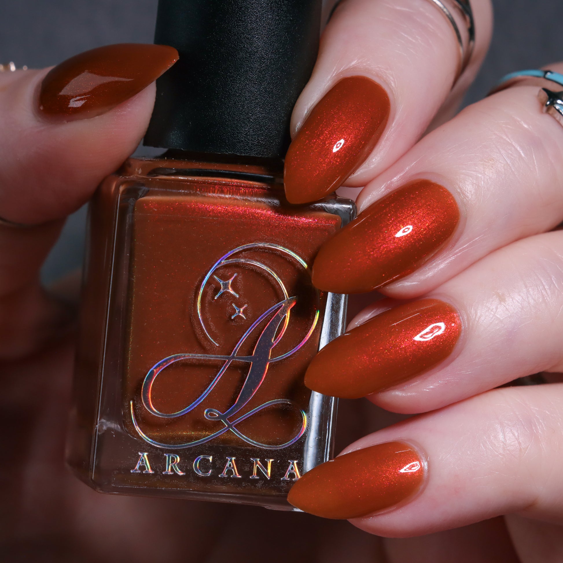 Foraged has a muted brown-orange base with red to orange shimmer.