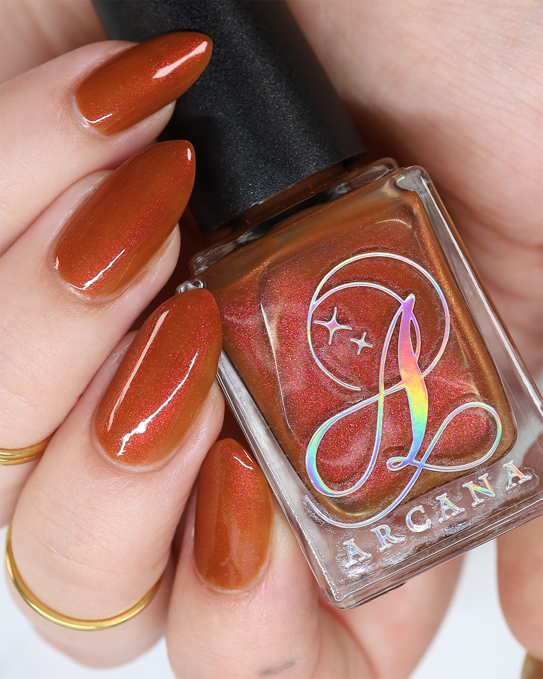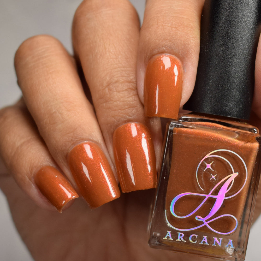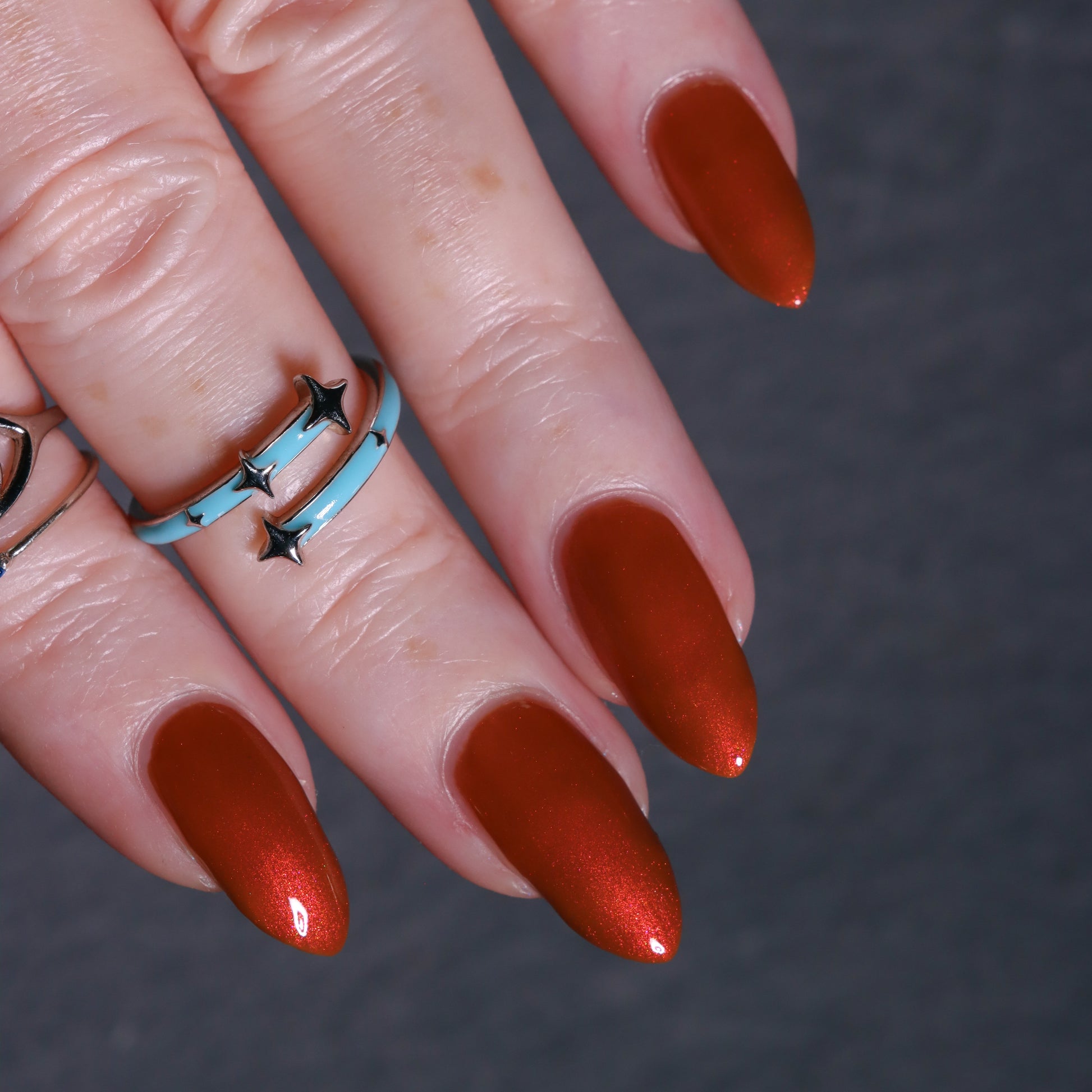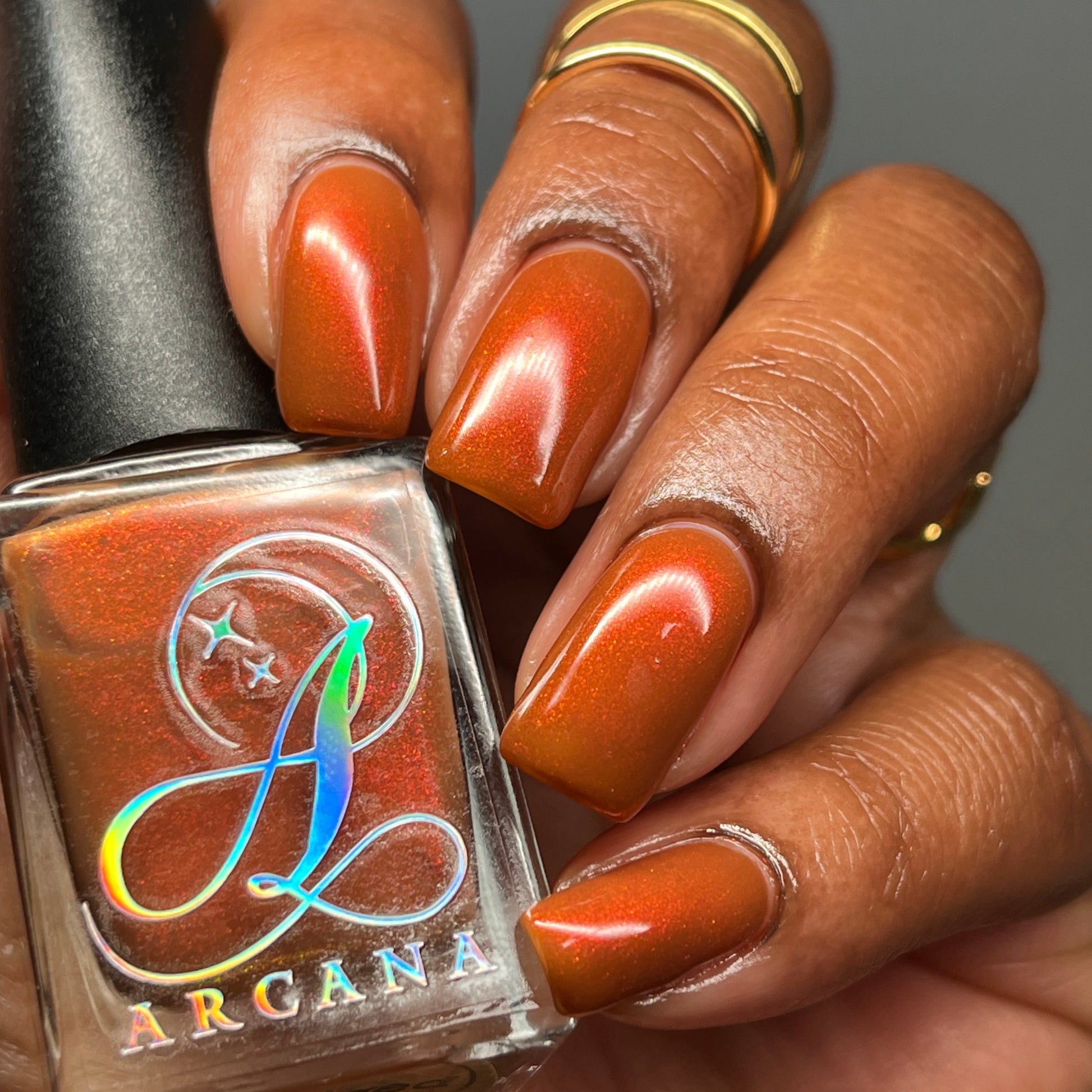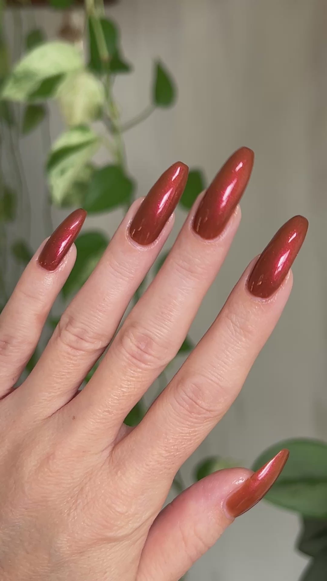 Foraged has a muted brown-orange base with red to orange shimmer.