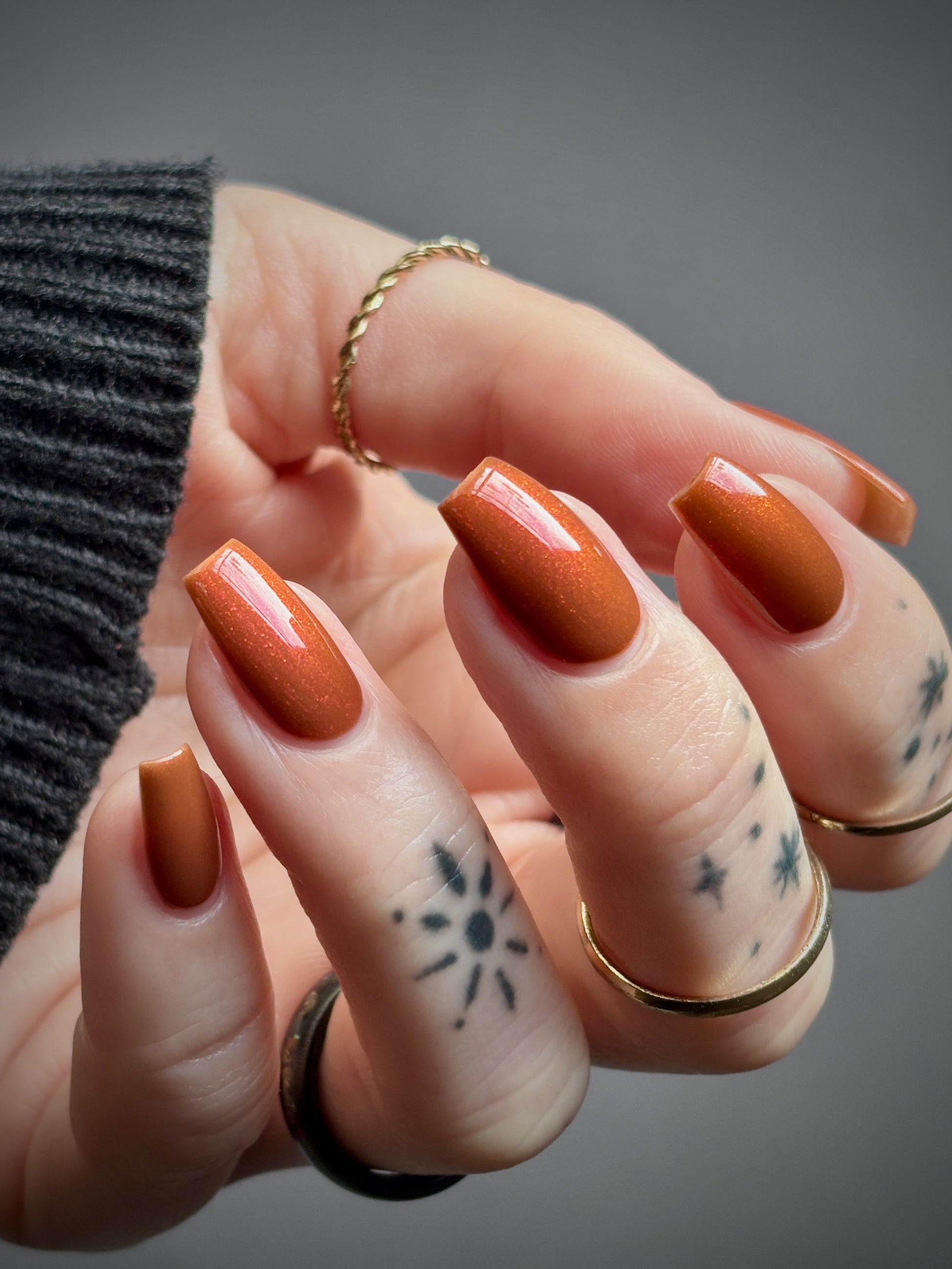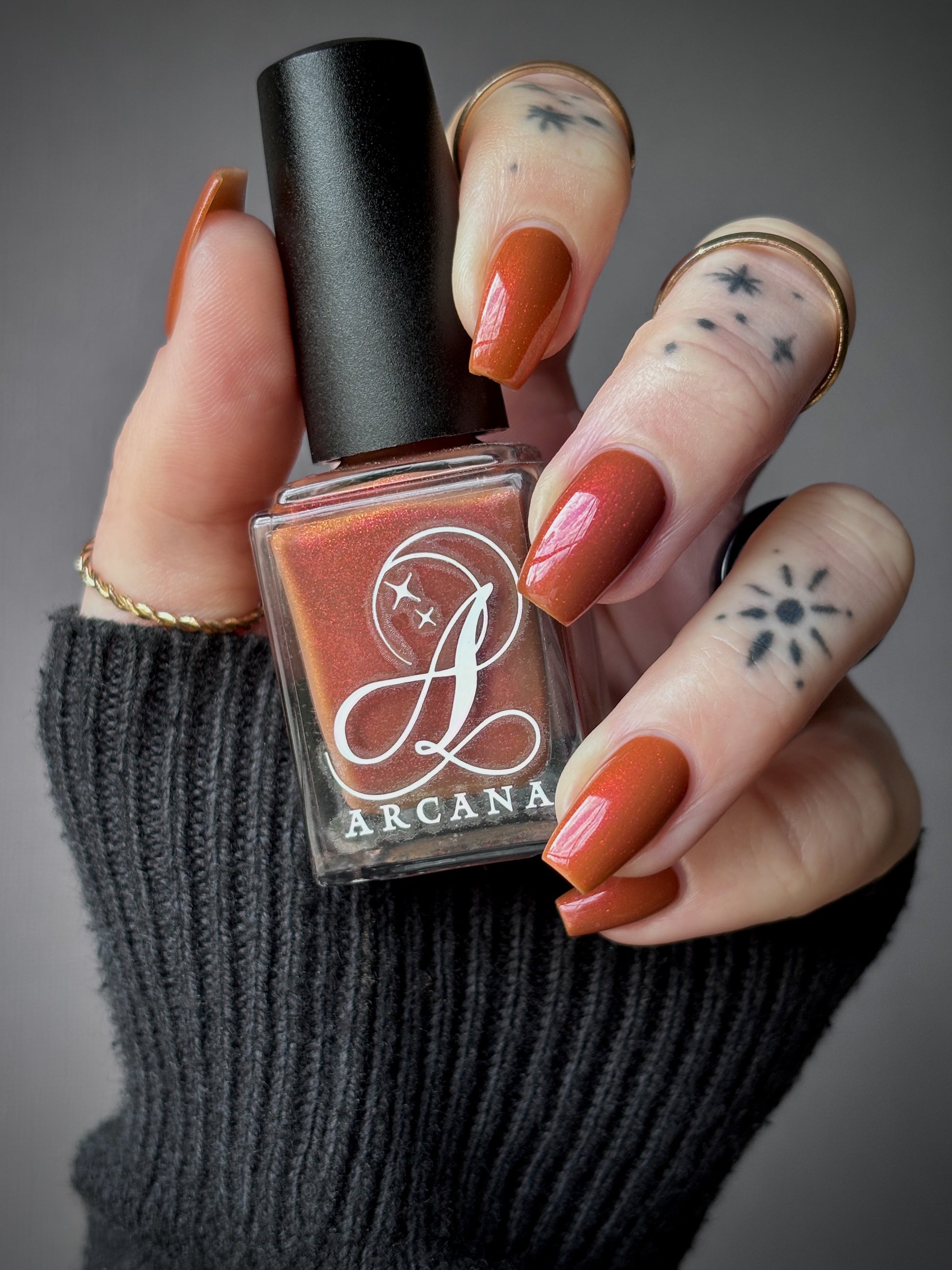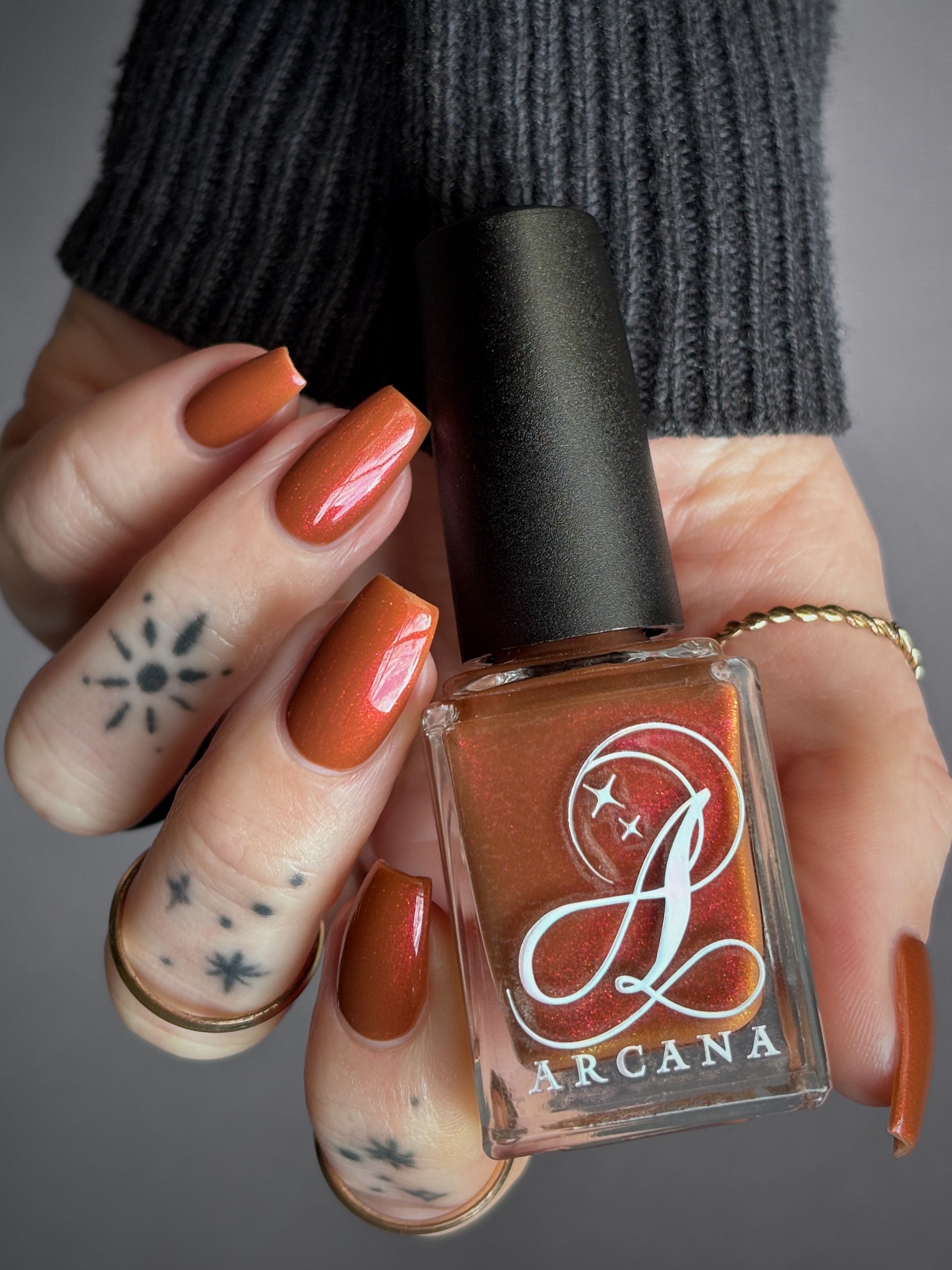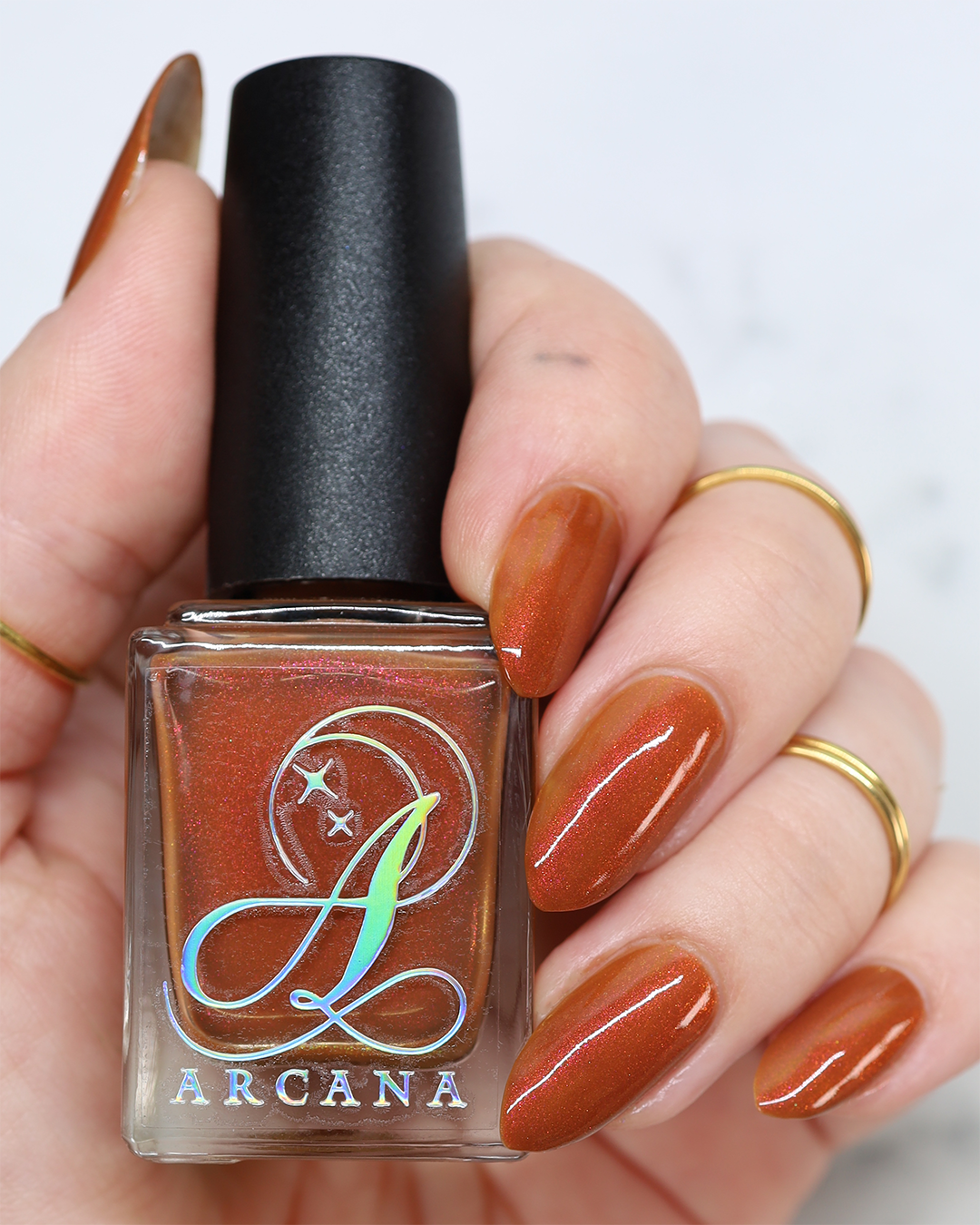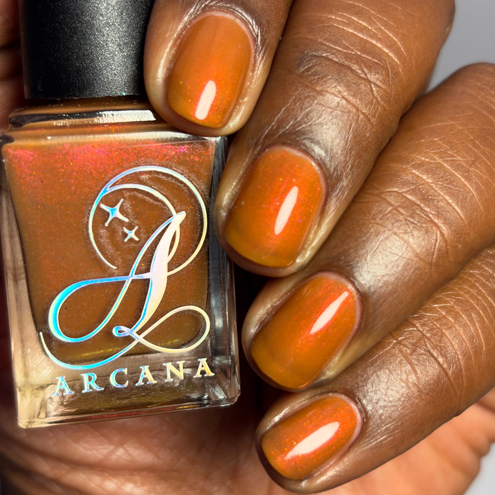 Foraged has a muted brown-orange base with red to orange shimmer.