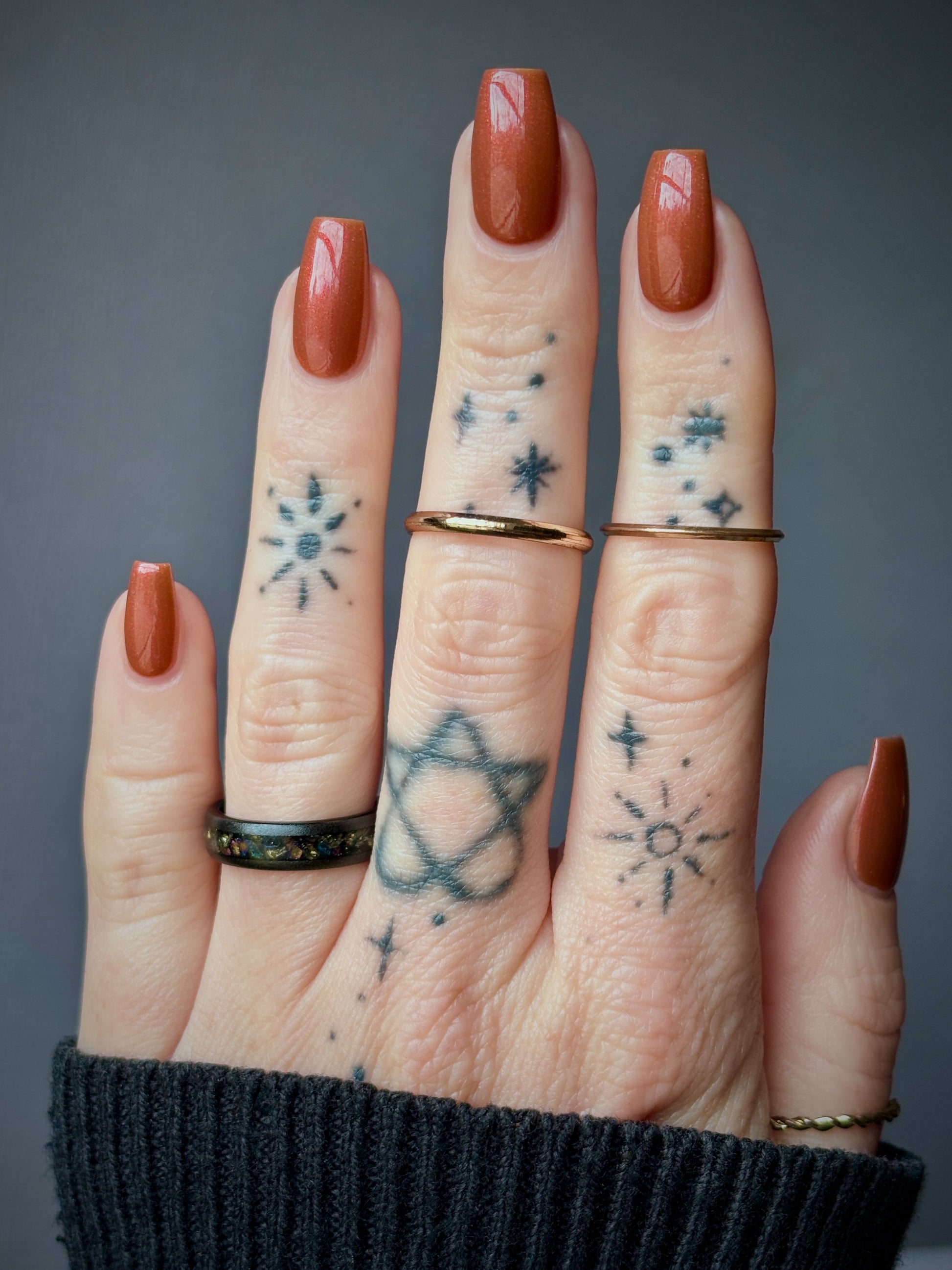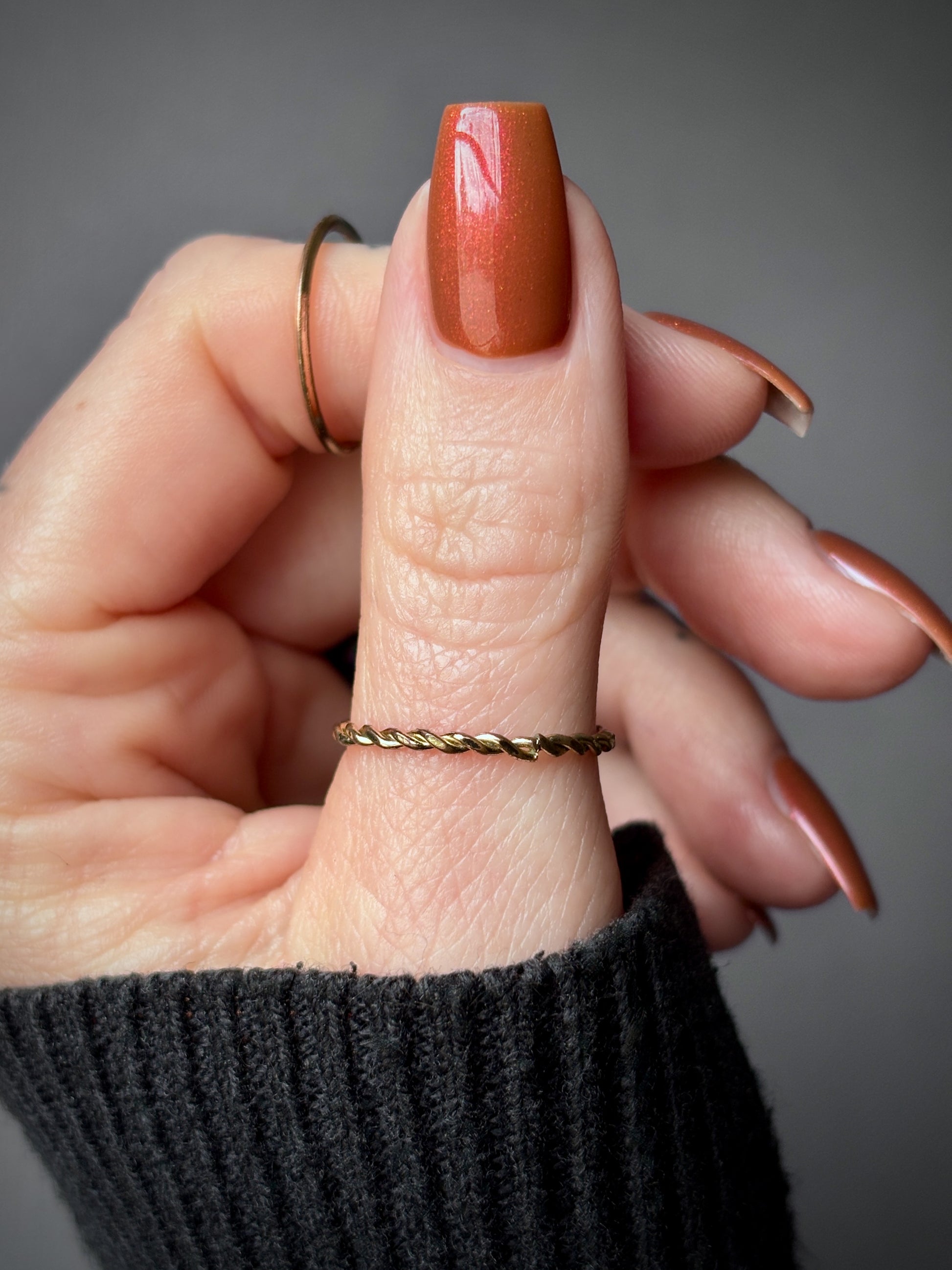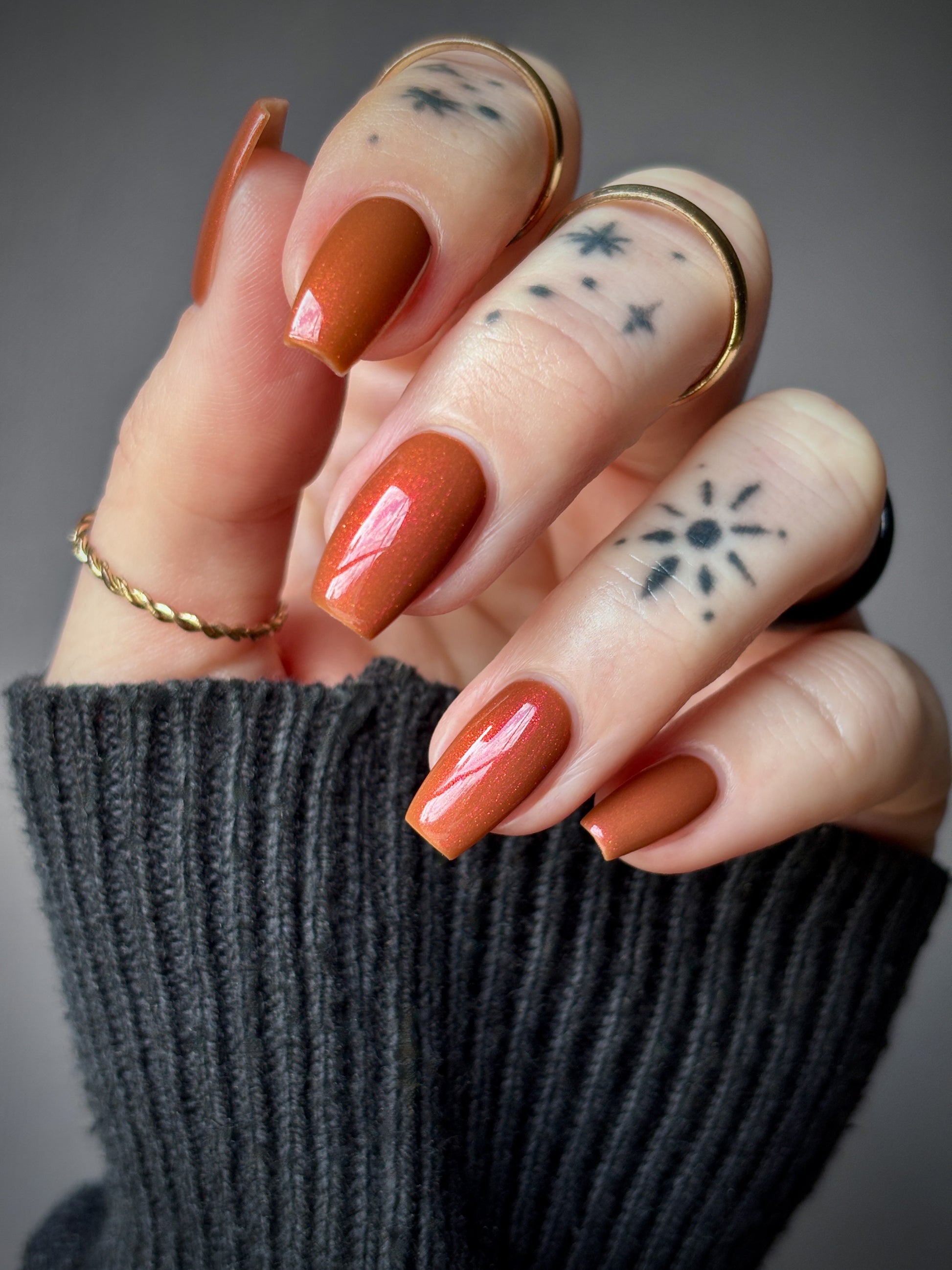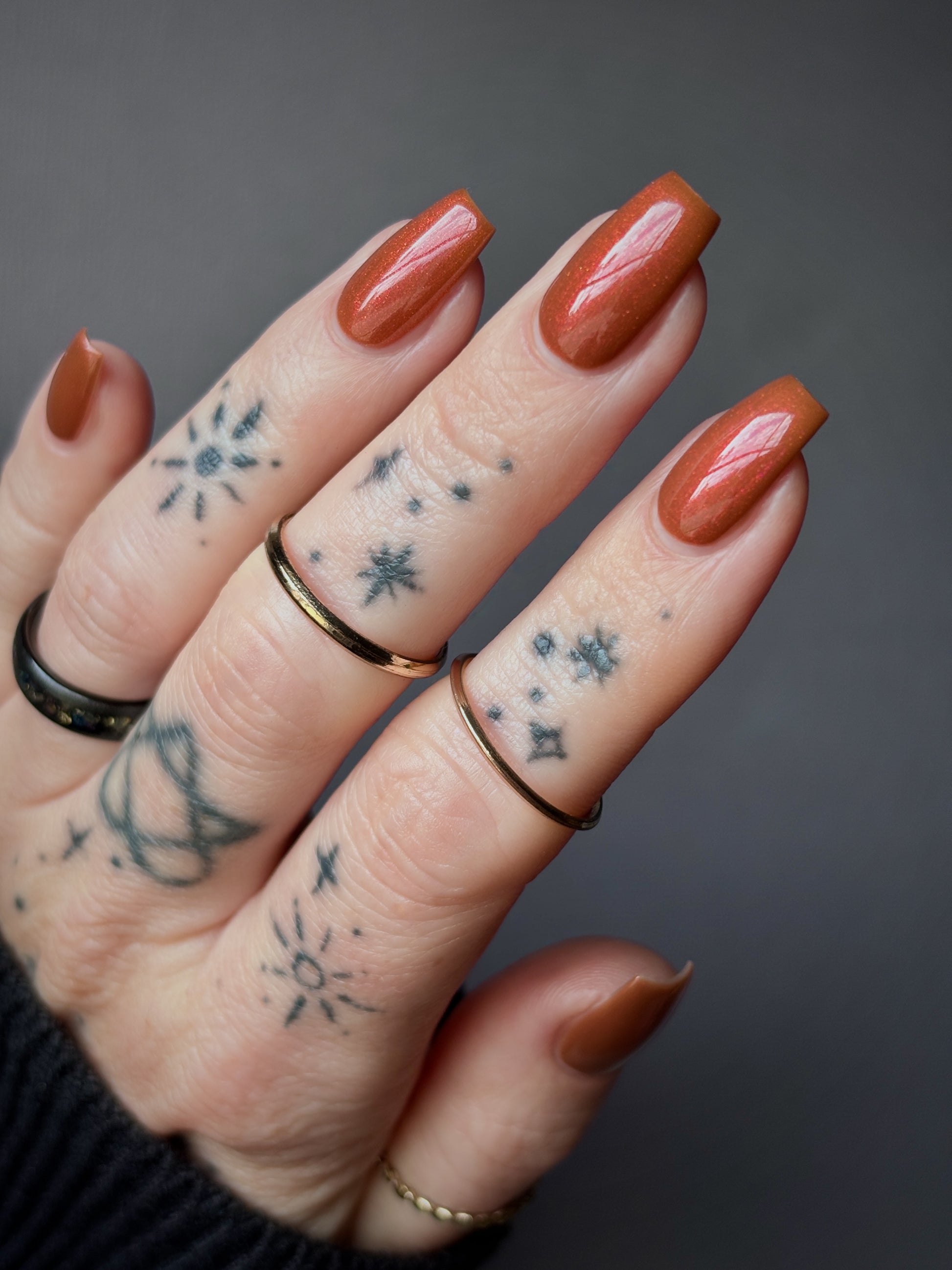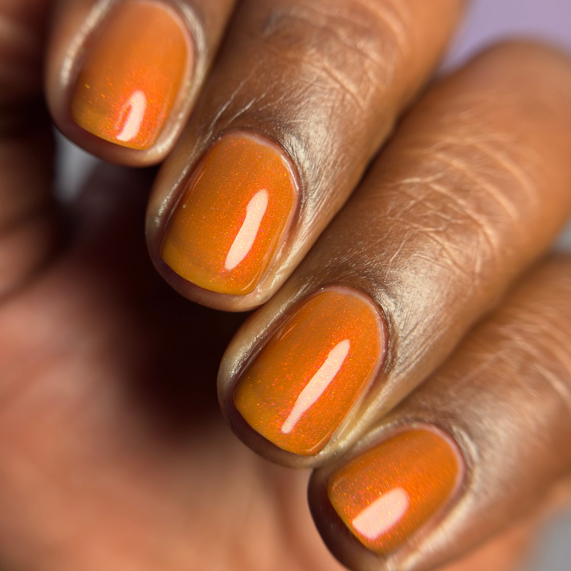 Foraged has a muted brown-orange base with red to orange shimmer.