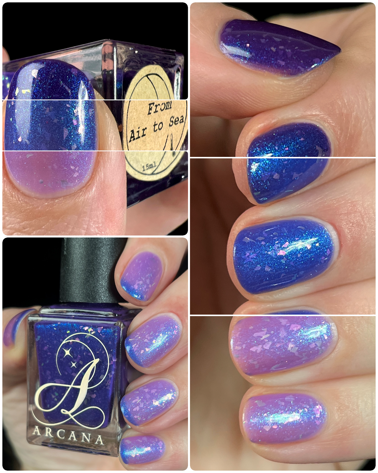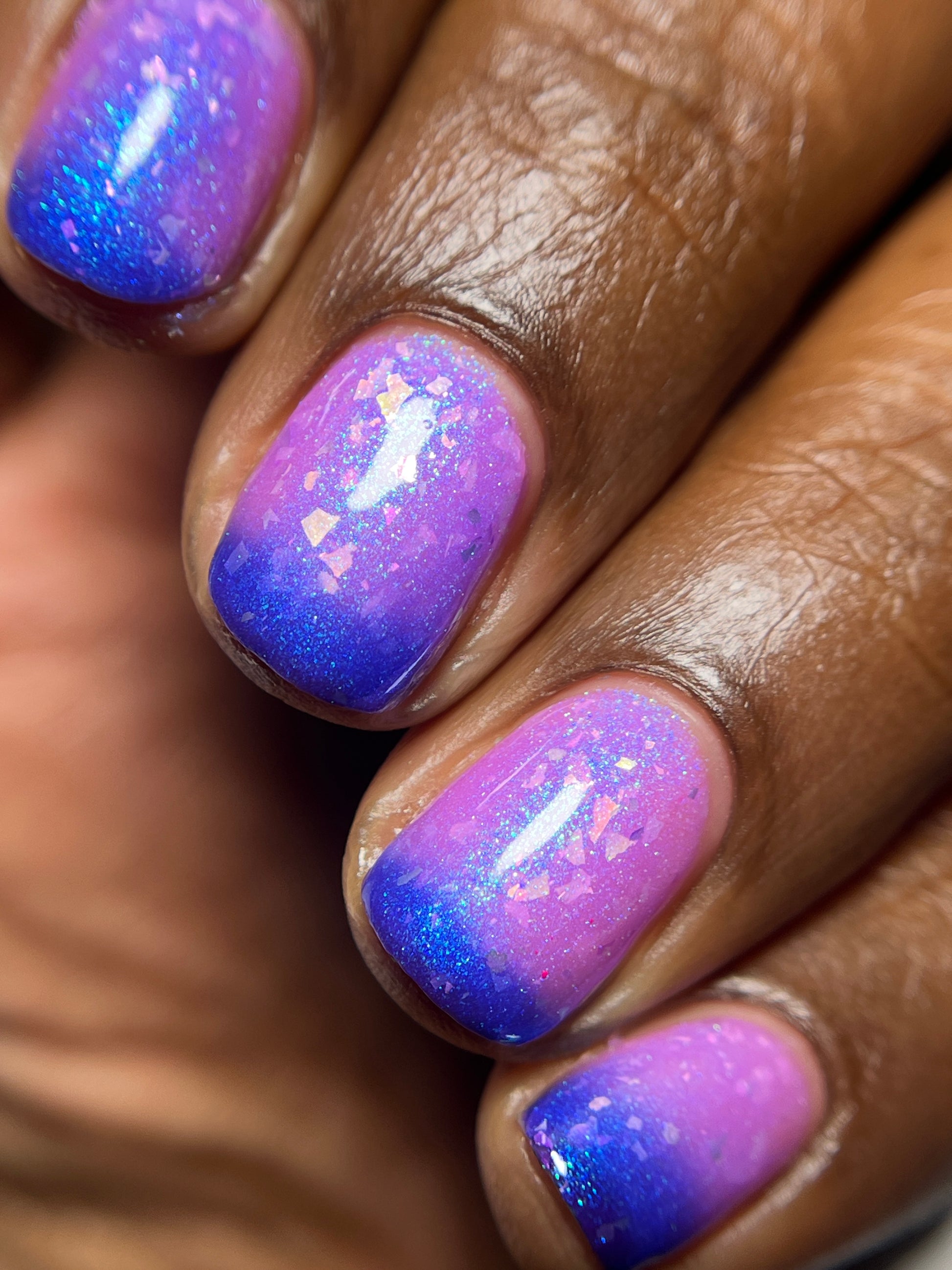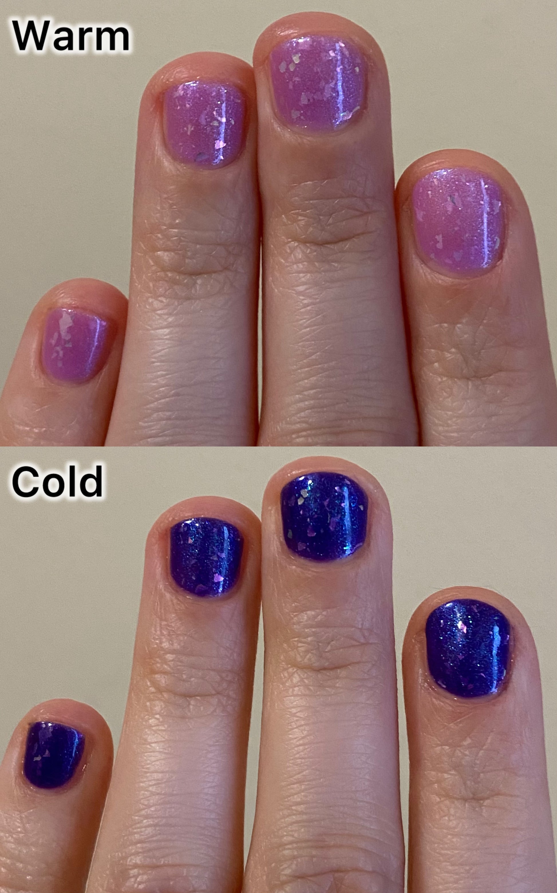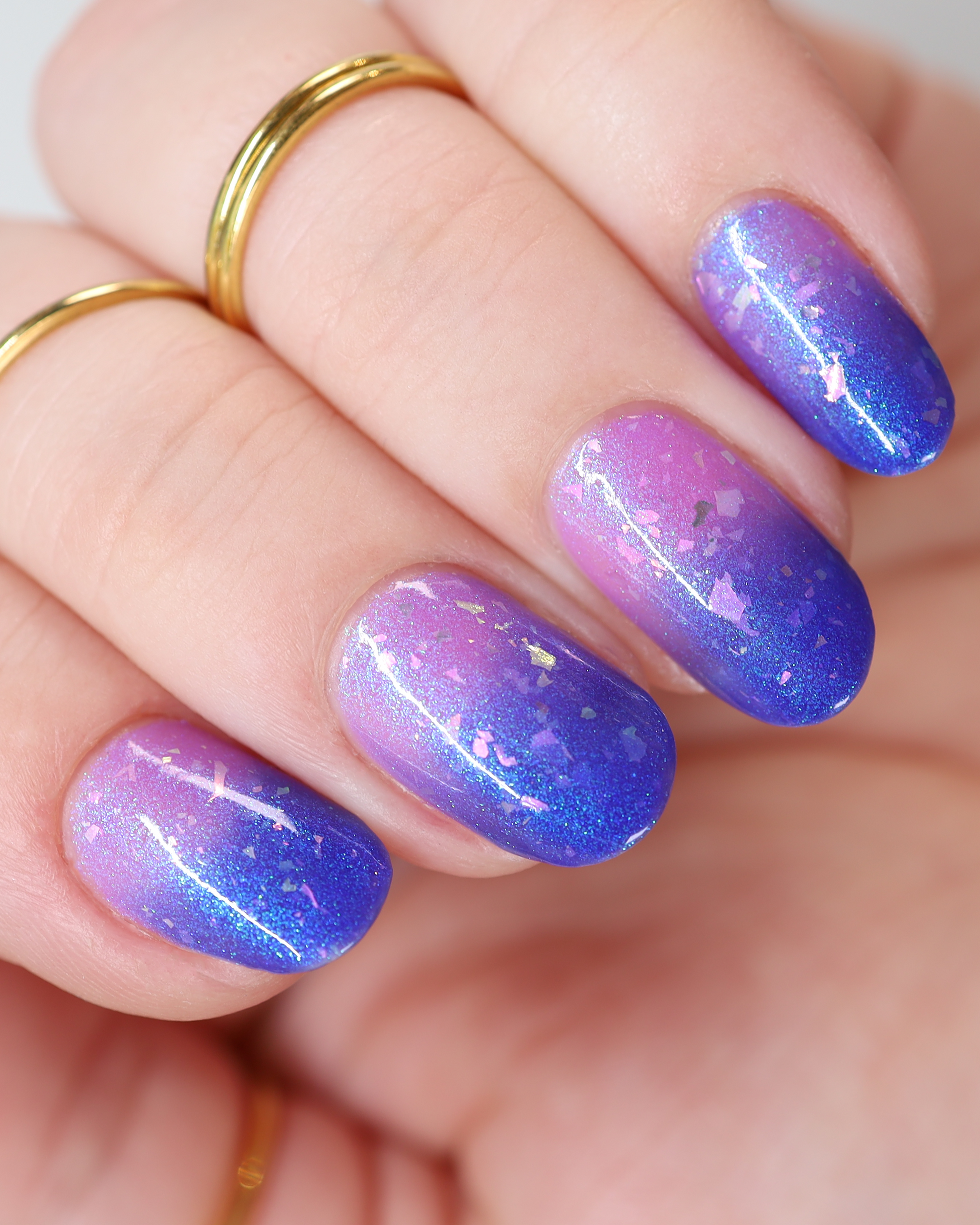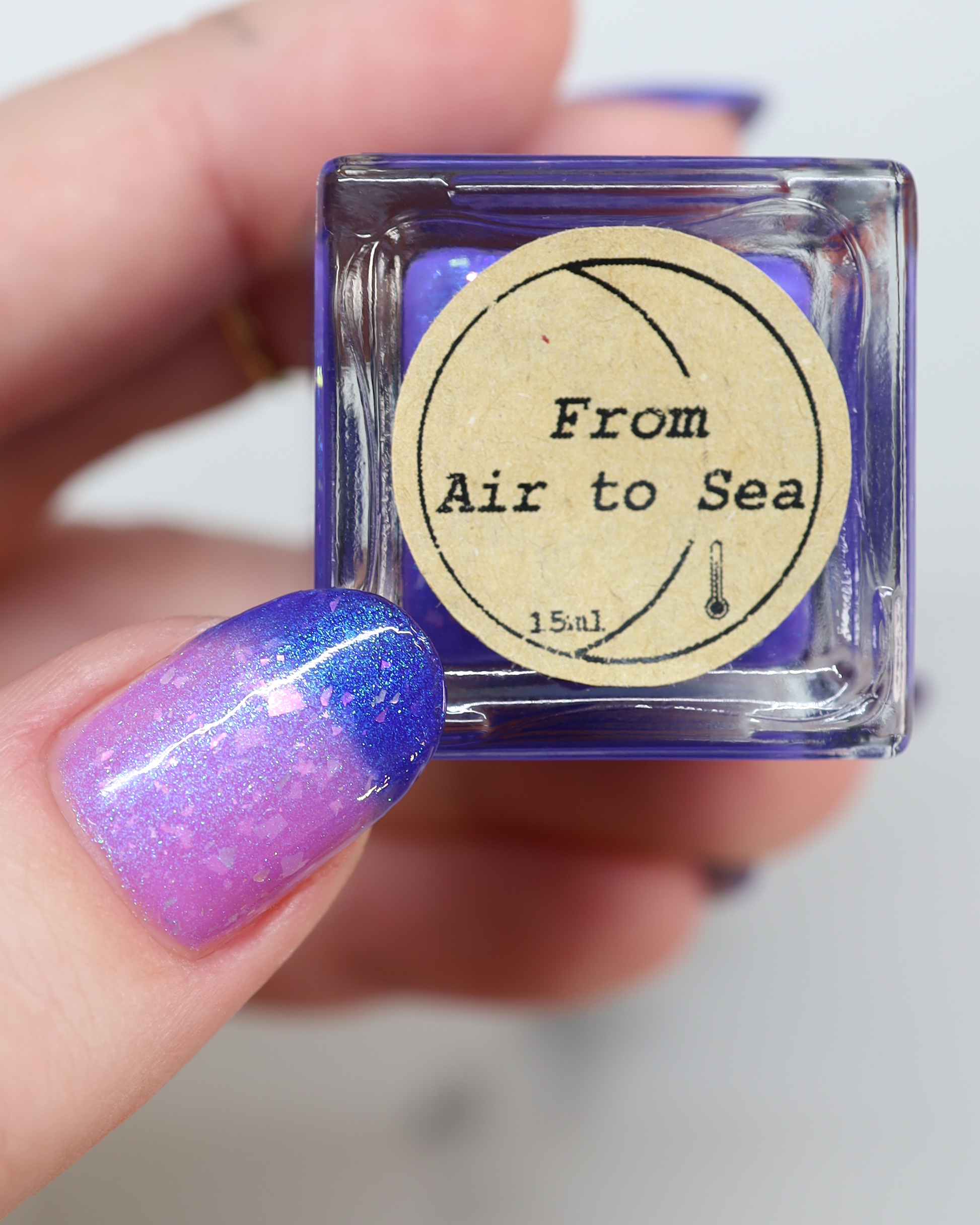 From Air to Sea is a tri-thermal polish that goes from light pink (hot) to blue (warm) to deep purple (cold) with blue to green shimmers and pink/blue/purple flakes.