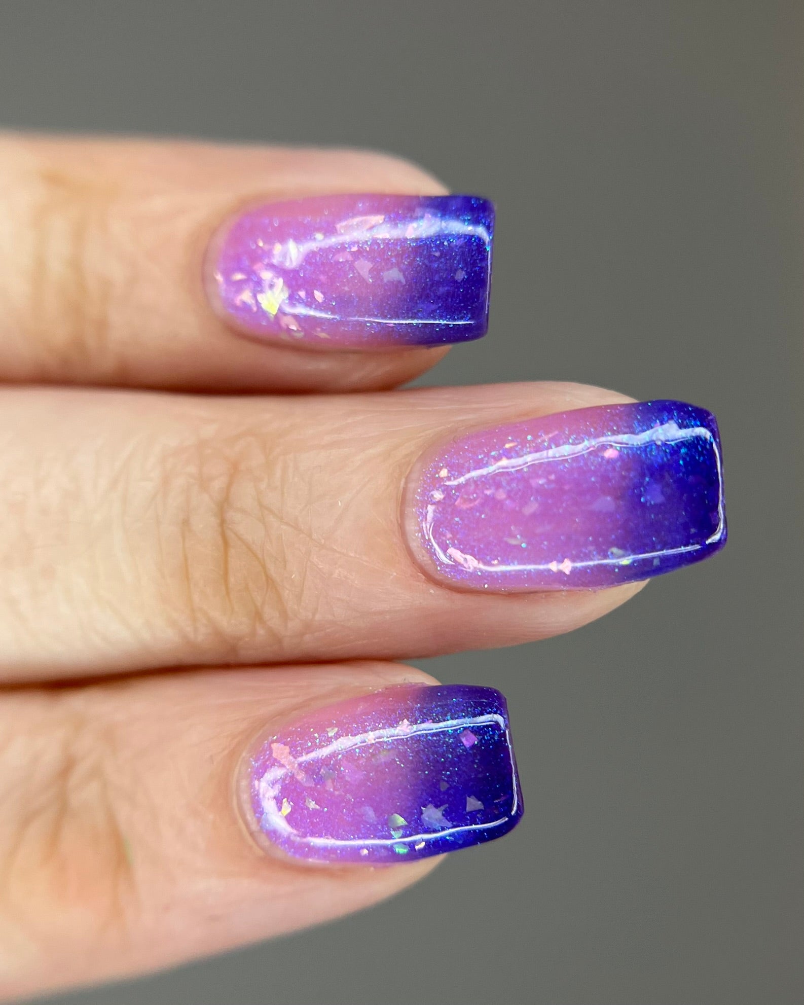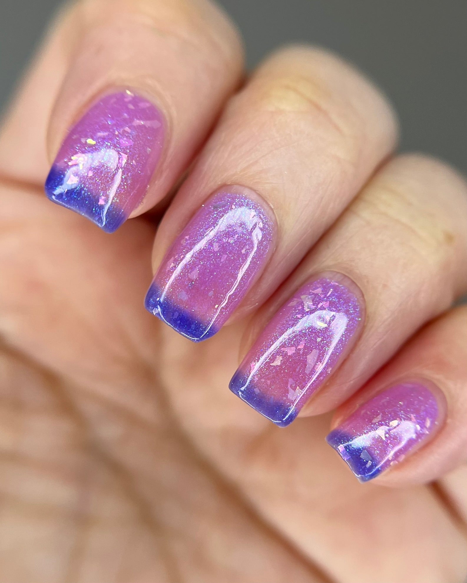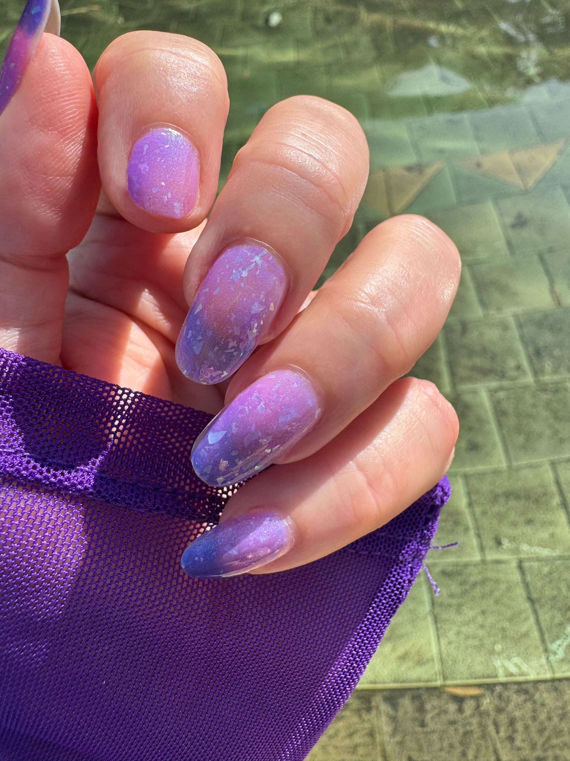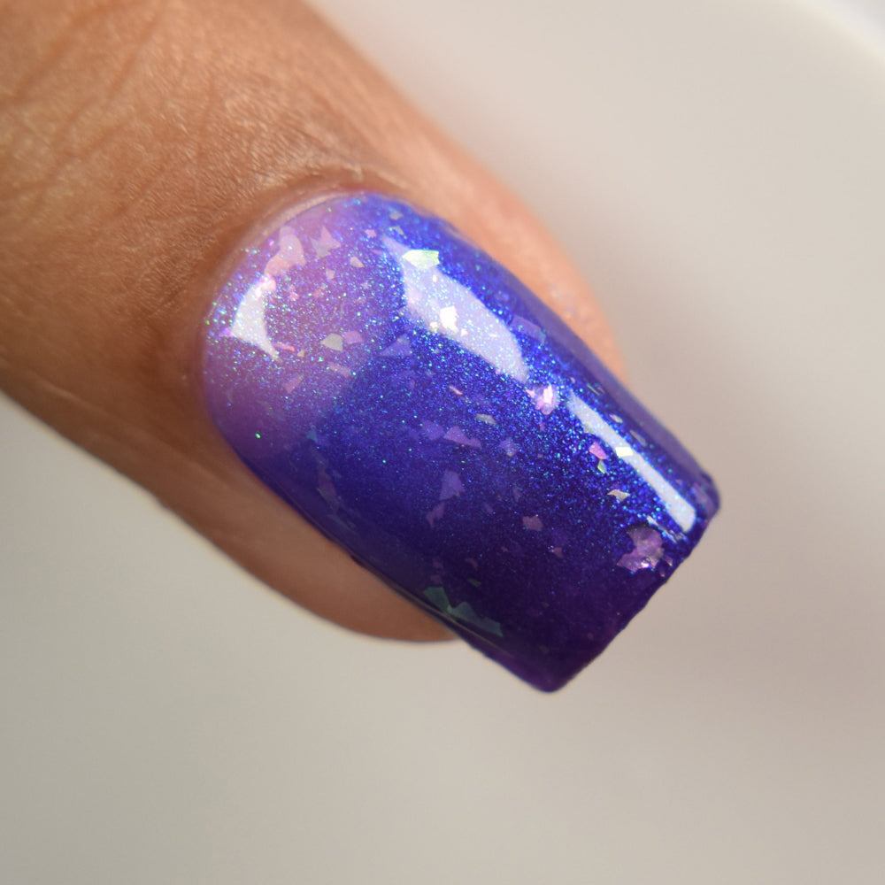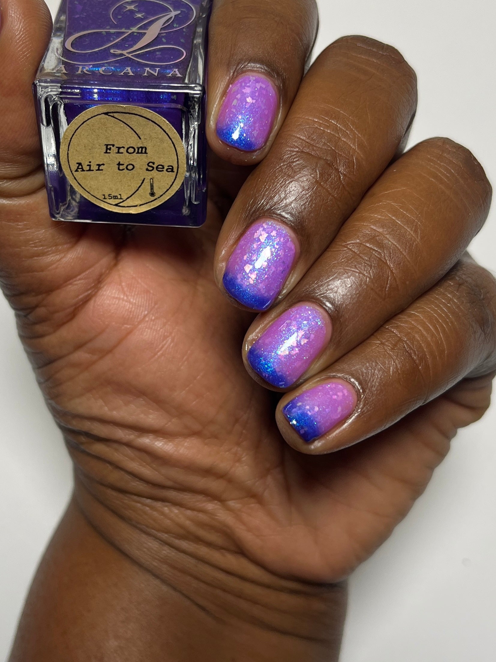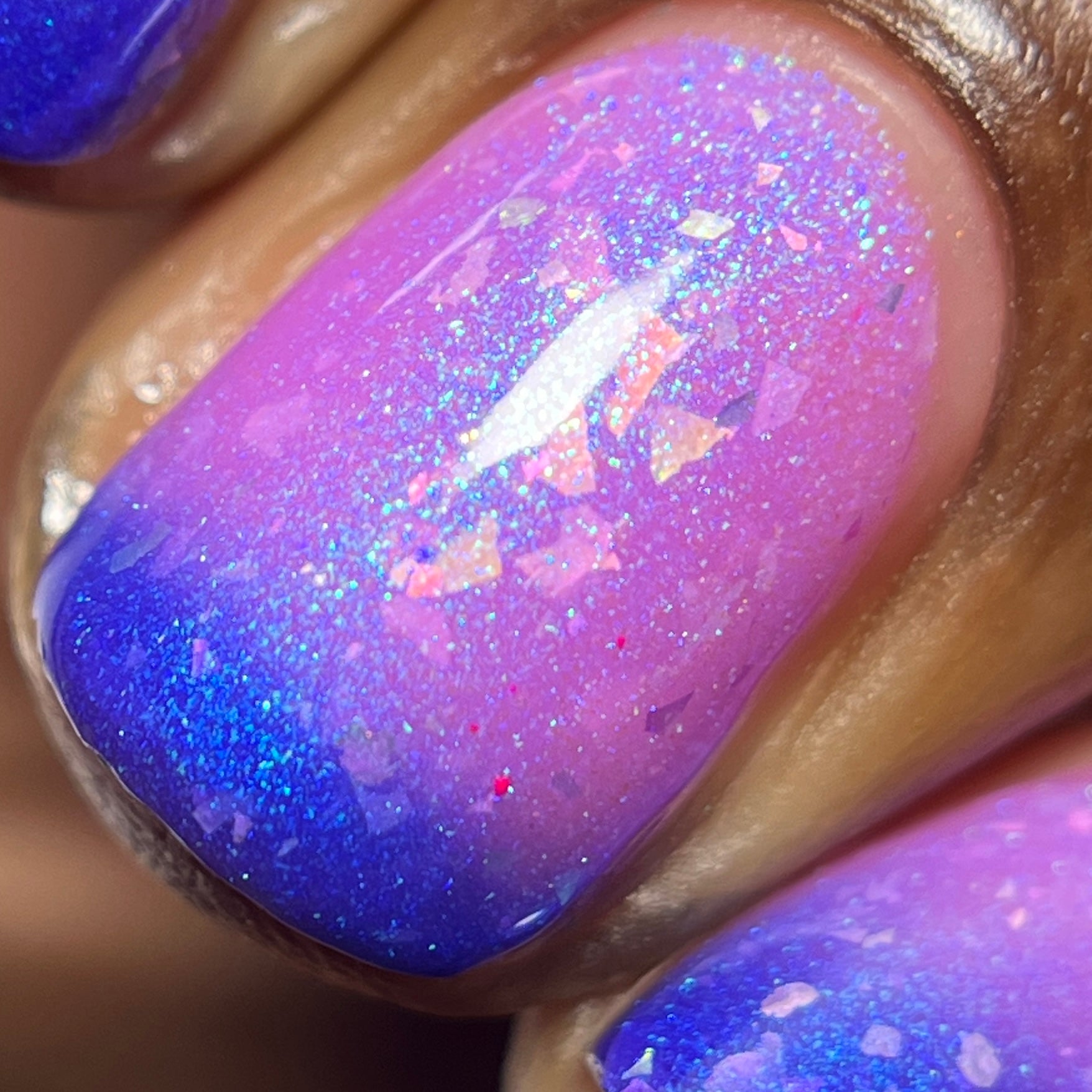From Air to Sea is a tri-thermal polish that goes from light pink (hot) to blue (warm) to deep purple (cold) with blue to green shimmers and pink/blue/purple flakes.