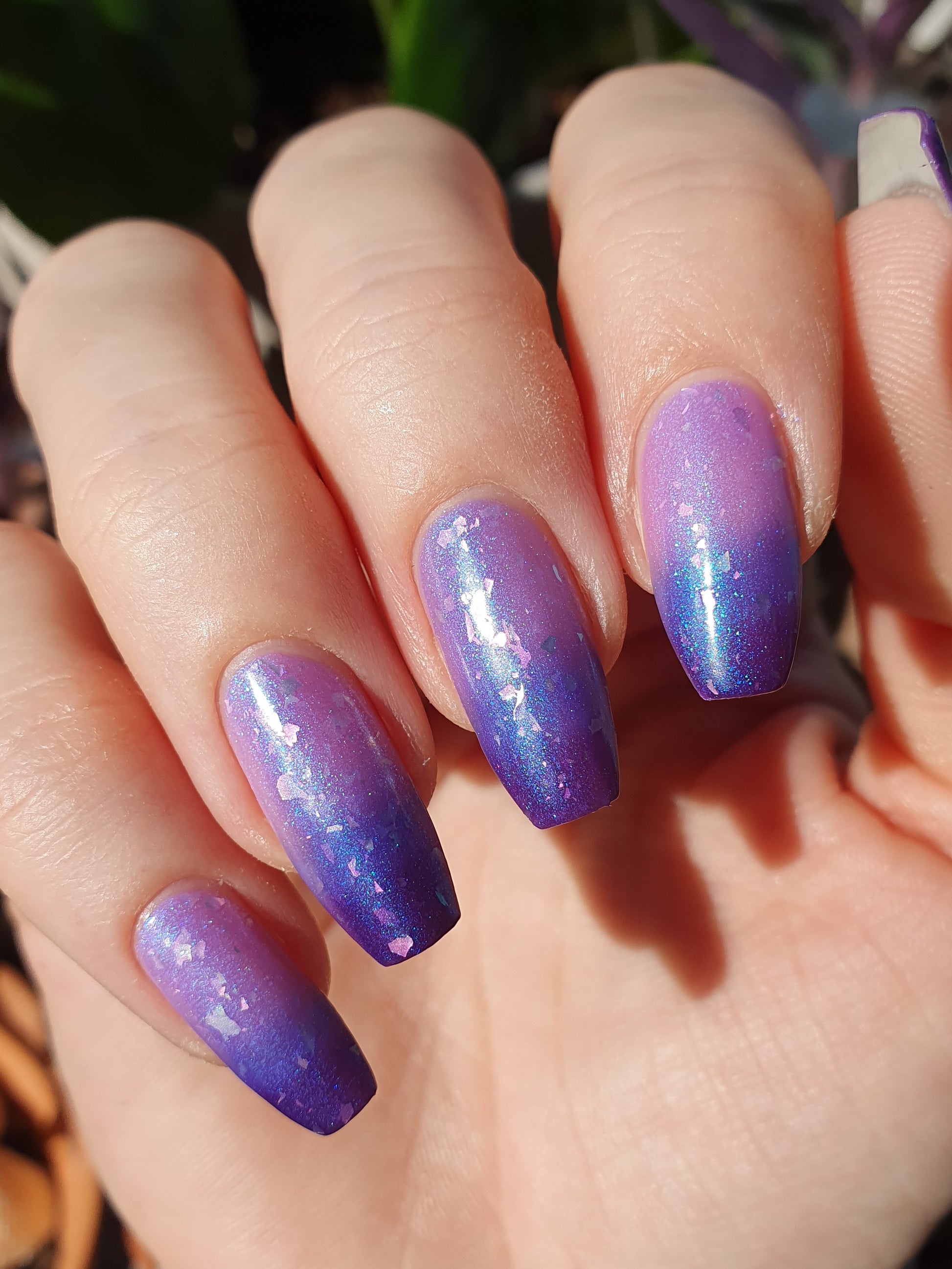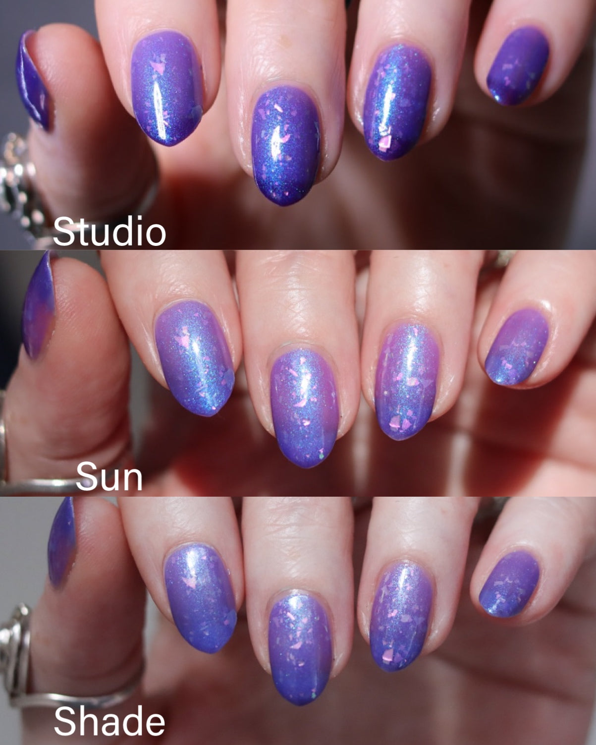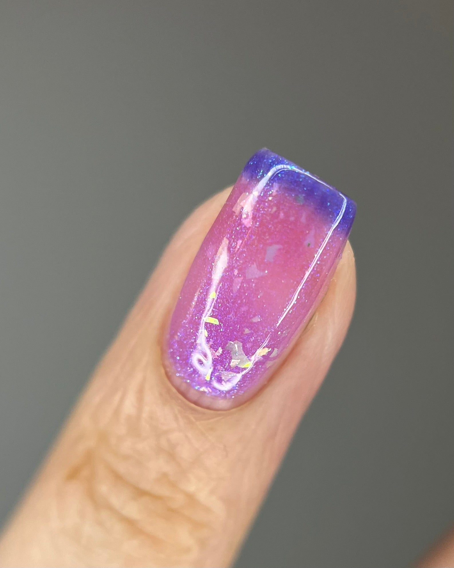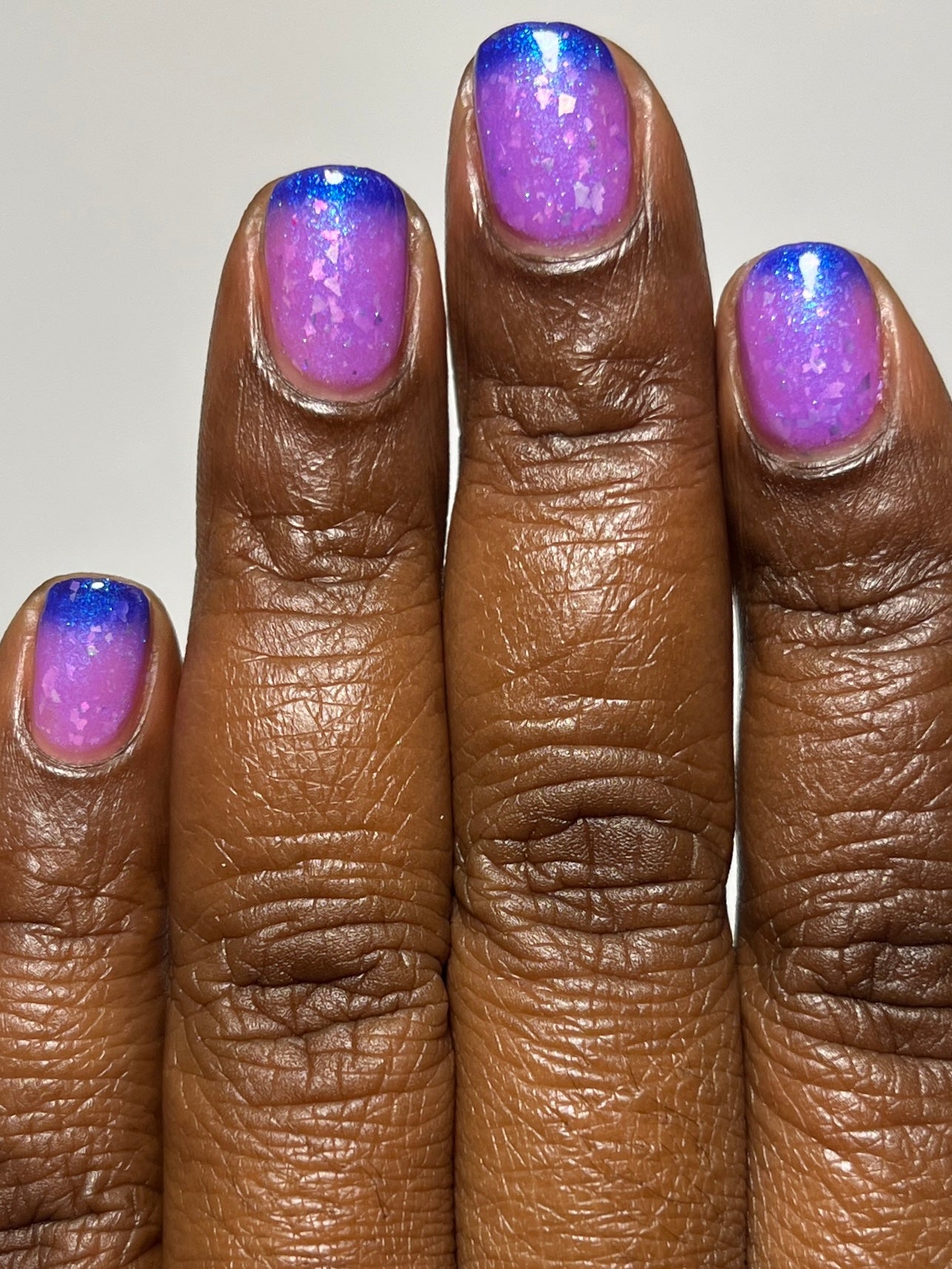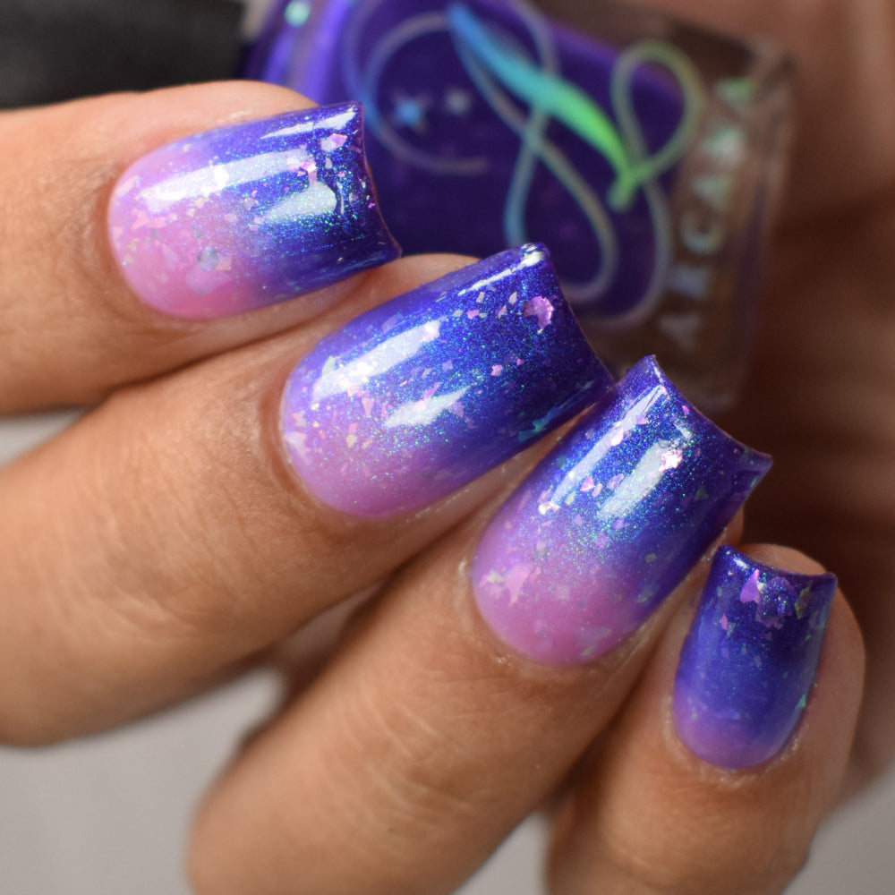 From Air to Sea is a tri-thermal polish that goes from light pink (hot) to blue (warm) to deep purple (cold) with blue to green shimmers and pink/blue/purple flakes.