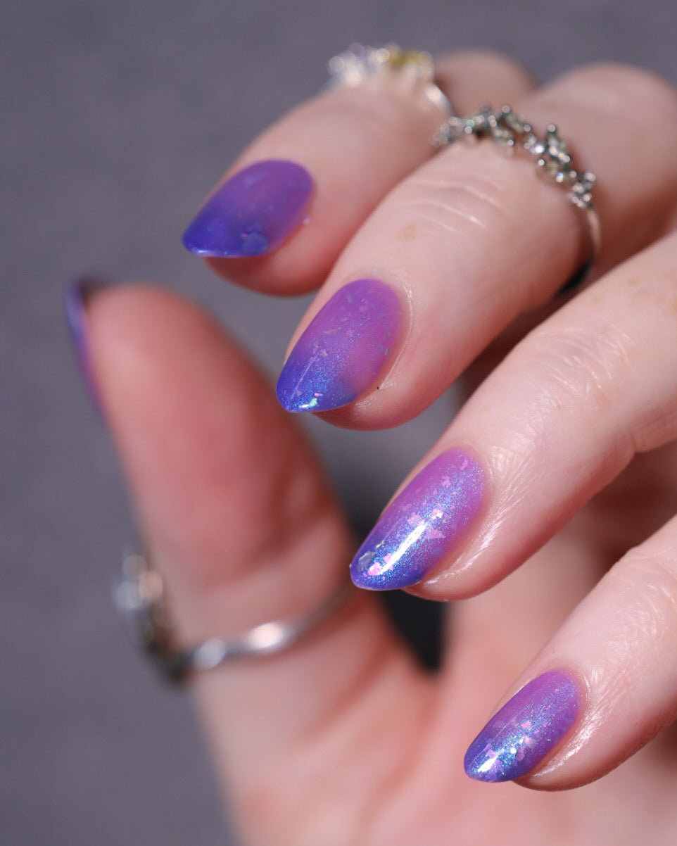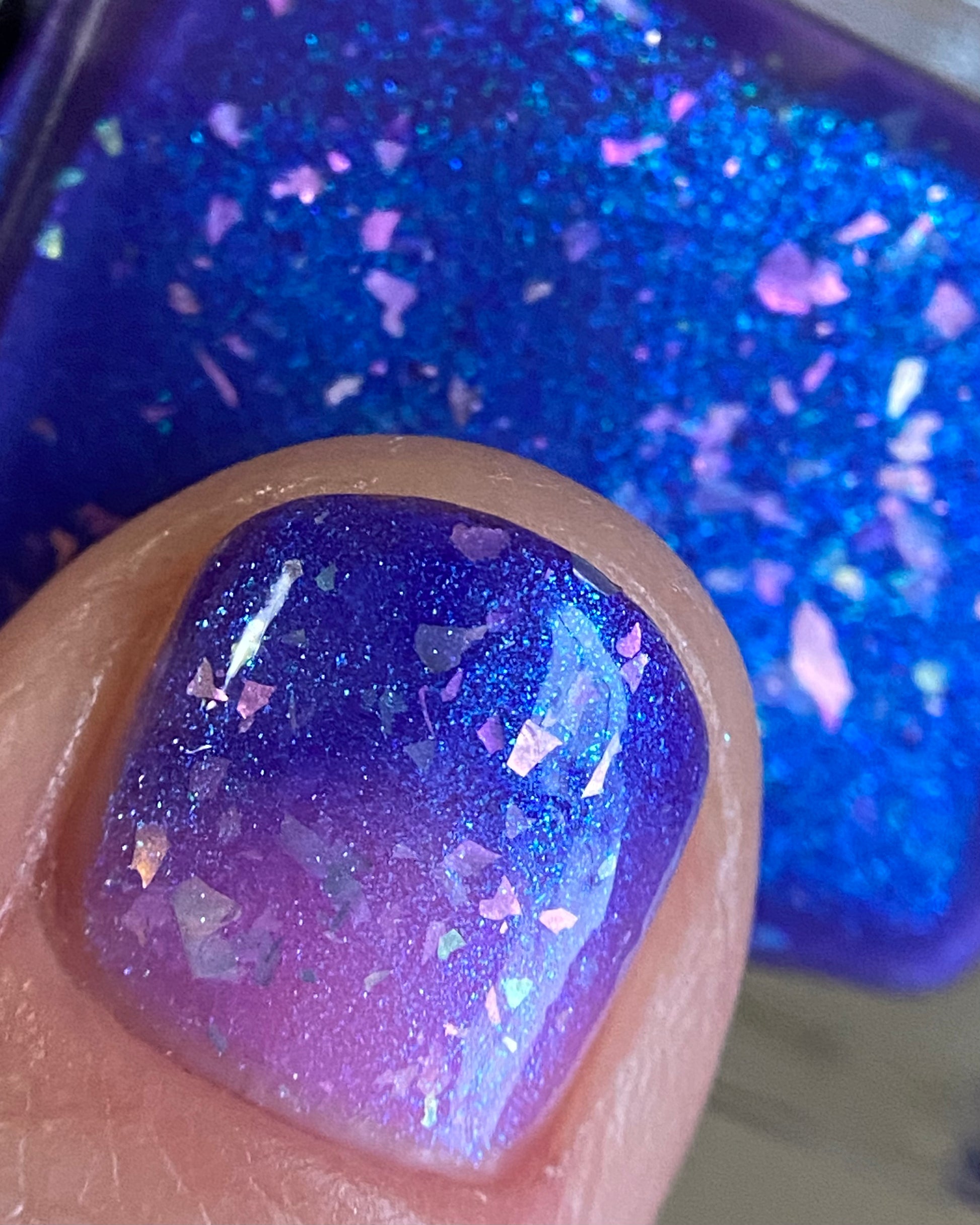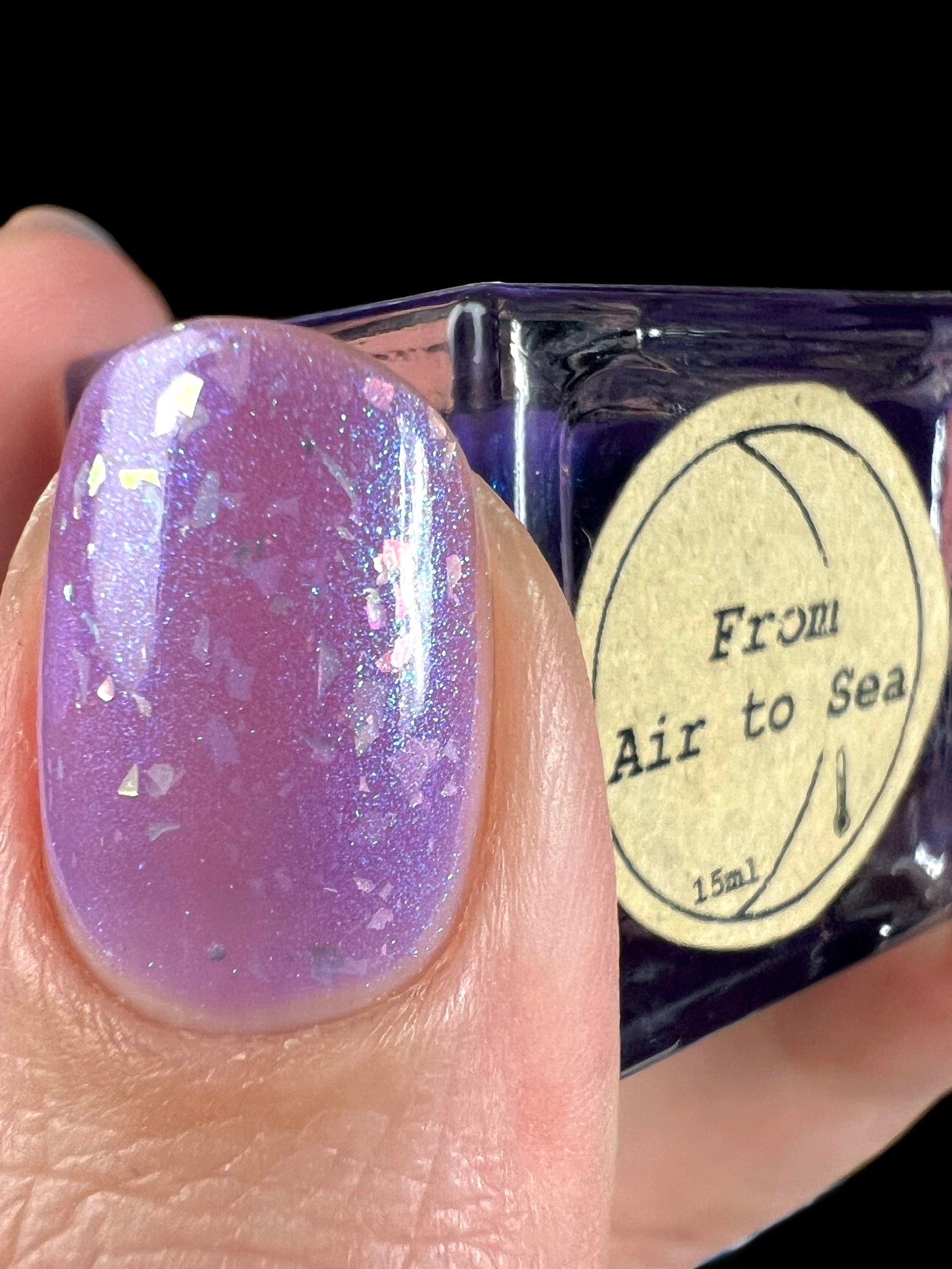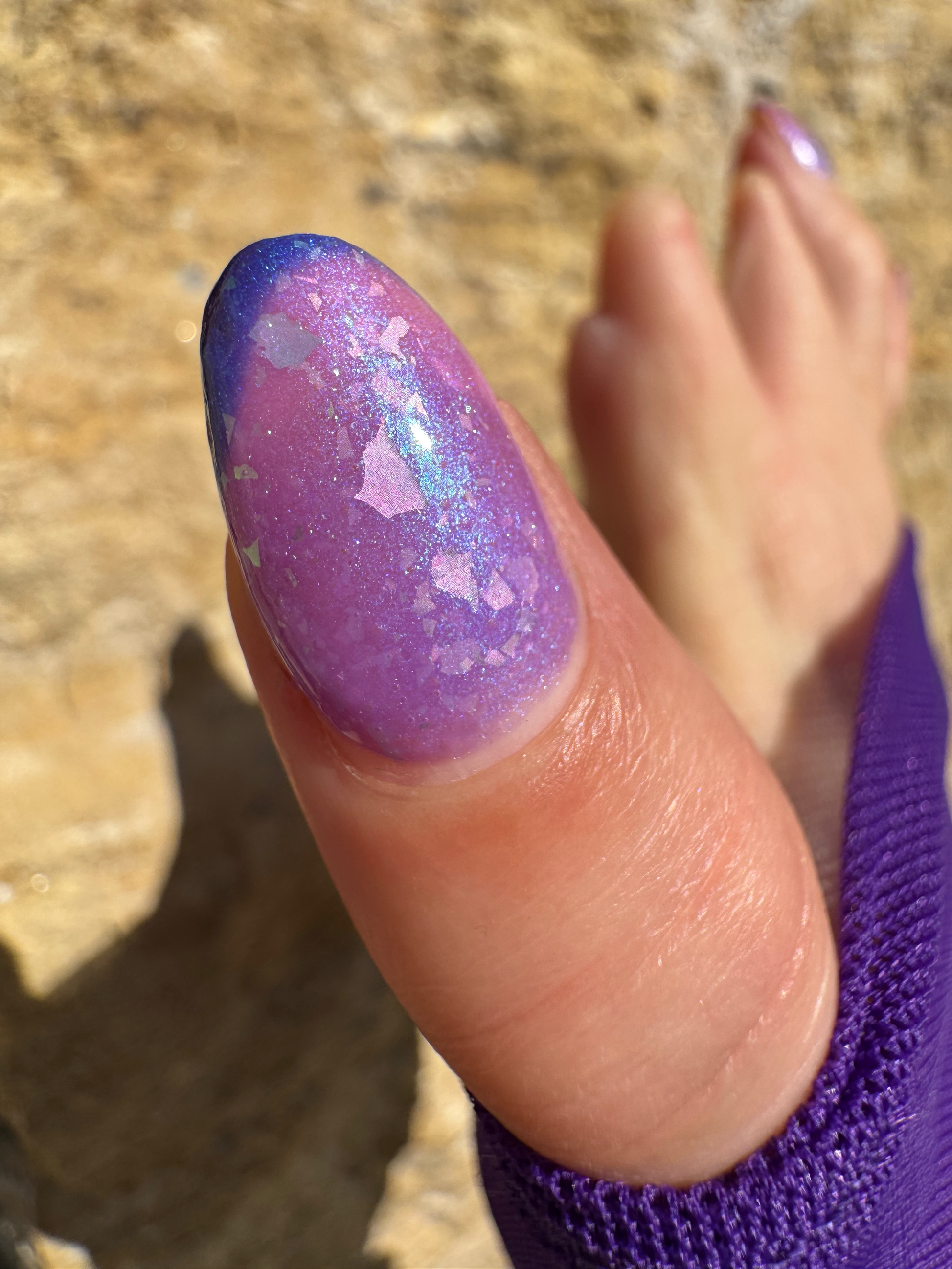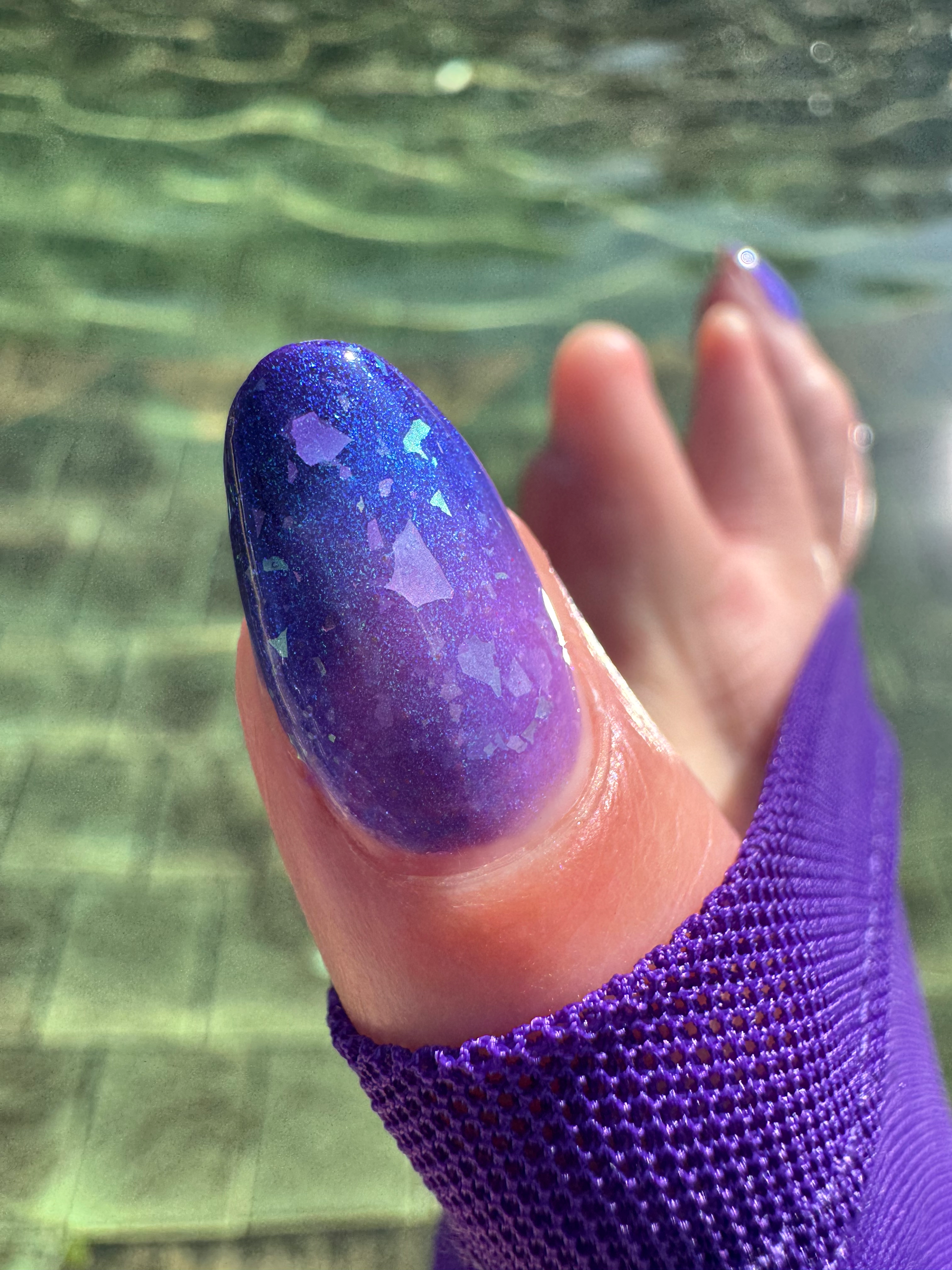 From Air to Sea is a tri-thermal polish that goes from light pink (hot) to blue (warm) to deep purple (cold) with blue to green shimmers and pink/blue/purple flakes.