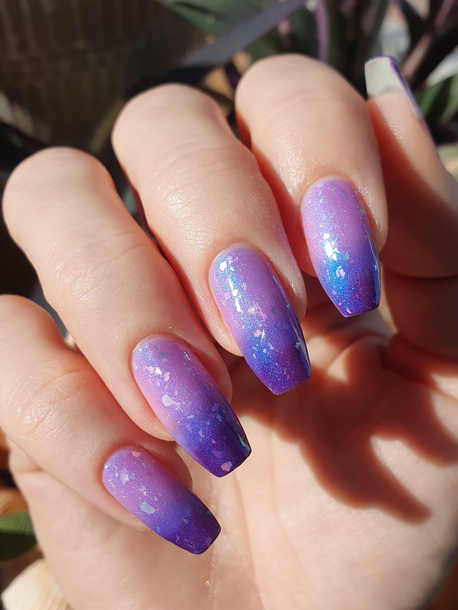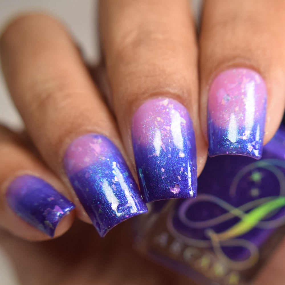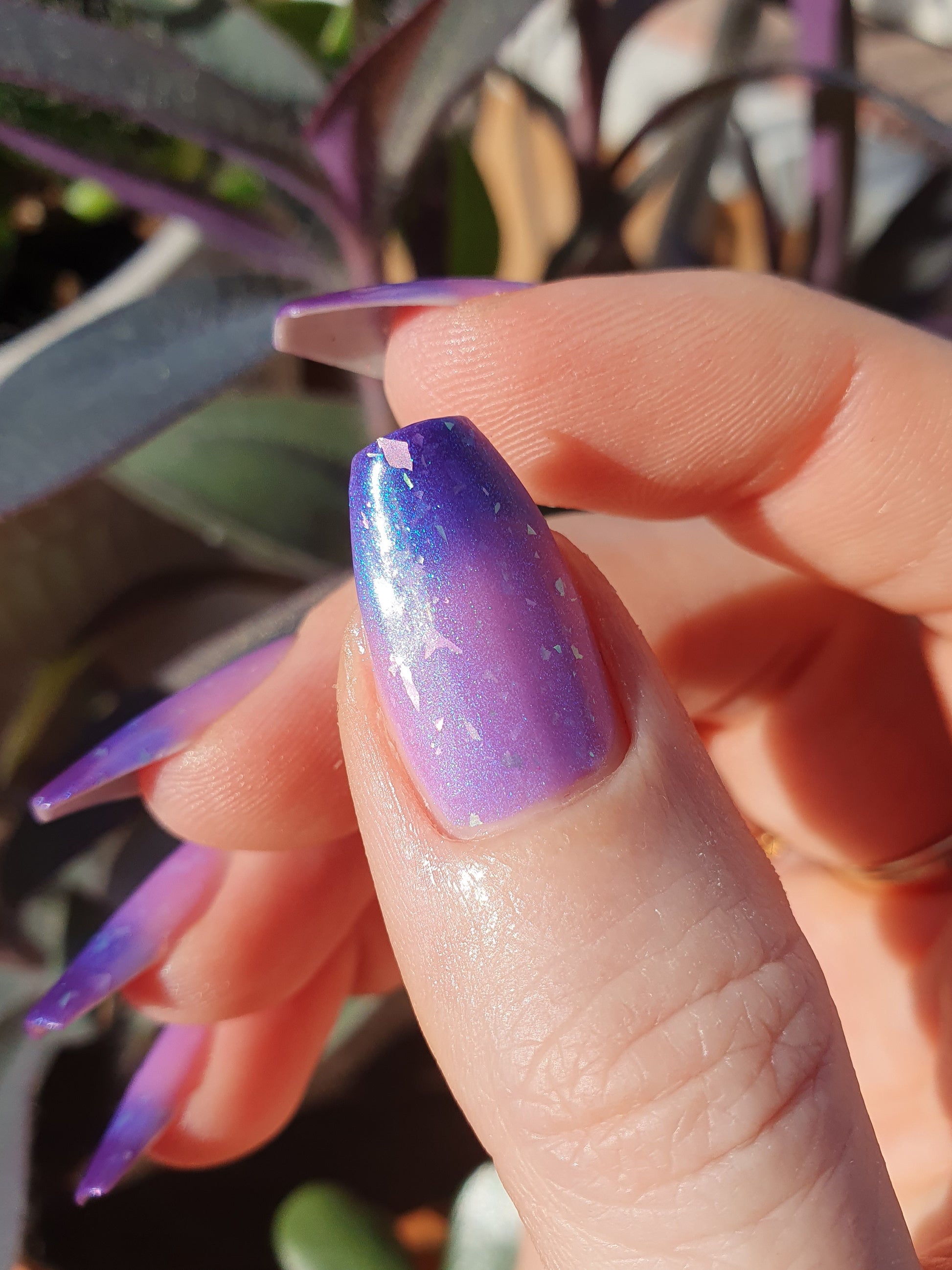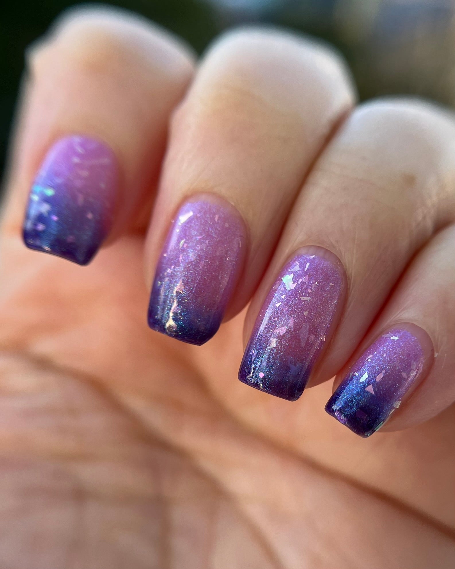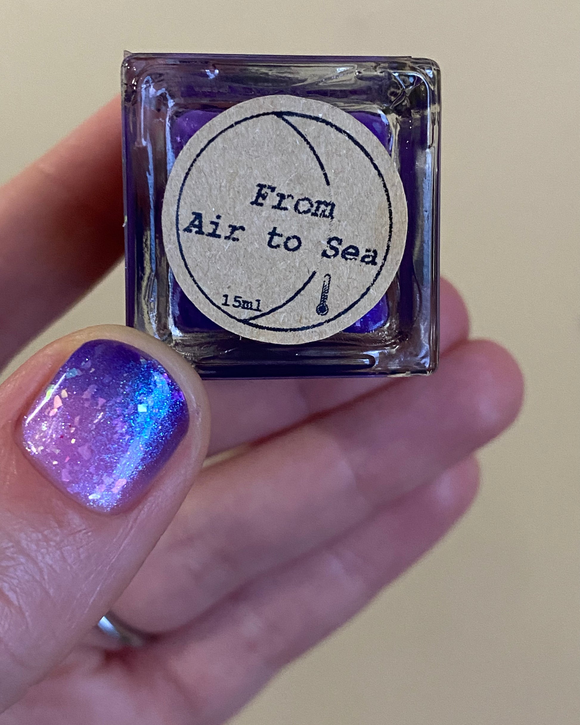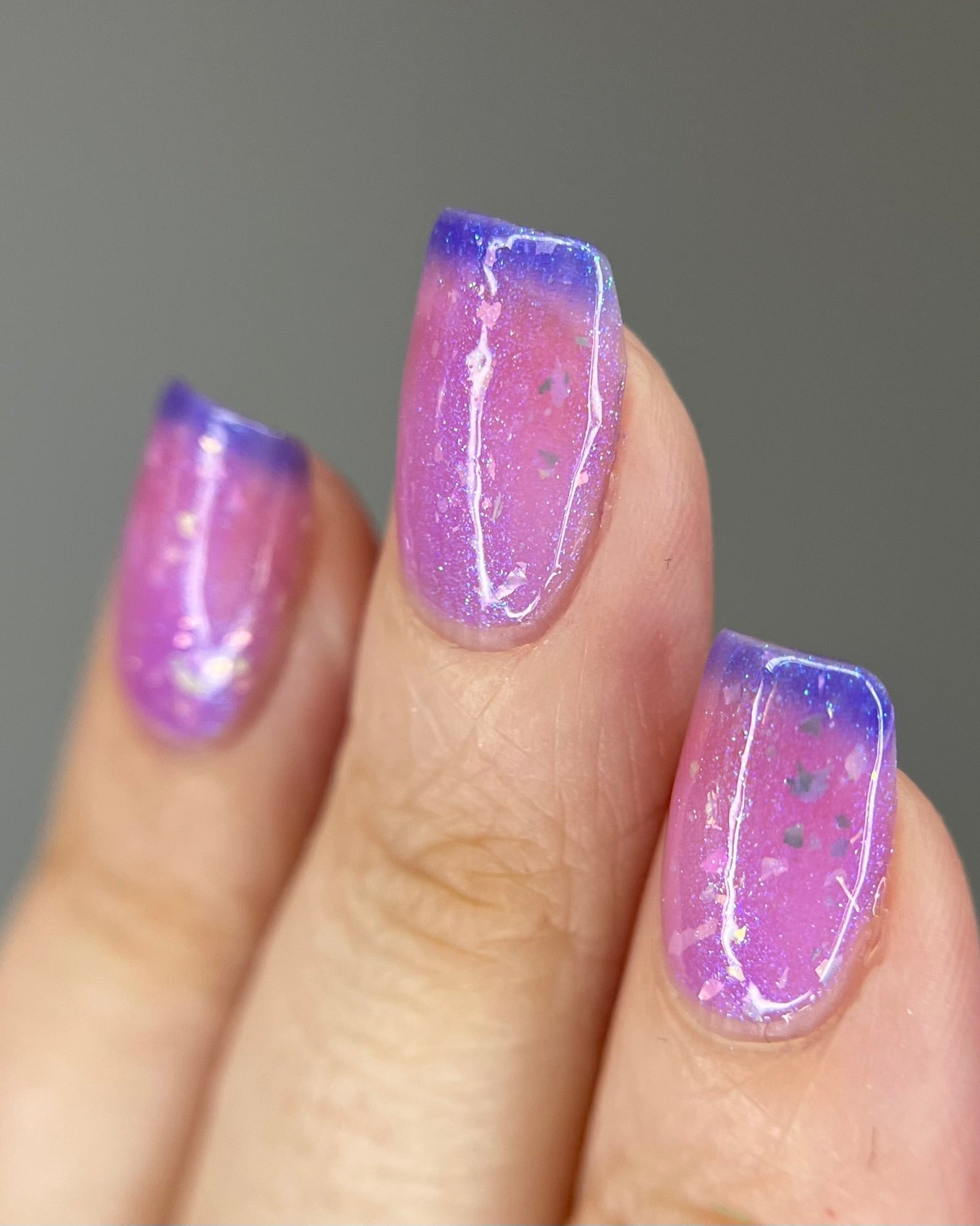 From Air to Sea is a tri-thermal polish that goes from light pink (hot) to blue (warm) to deep purple (cold) with blue to green shimmers and pink/blue/purple flakes.