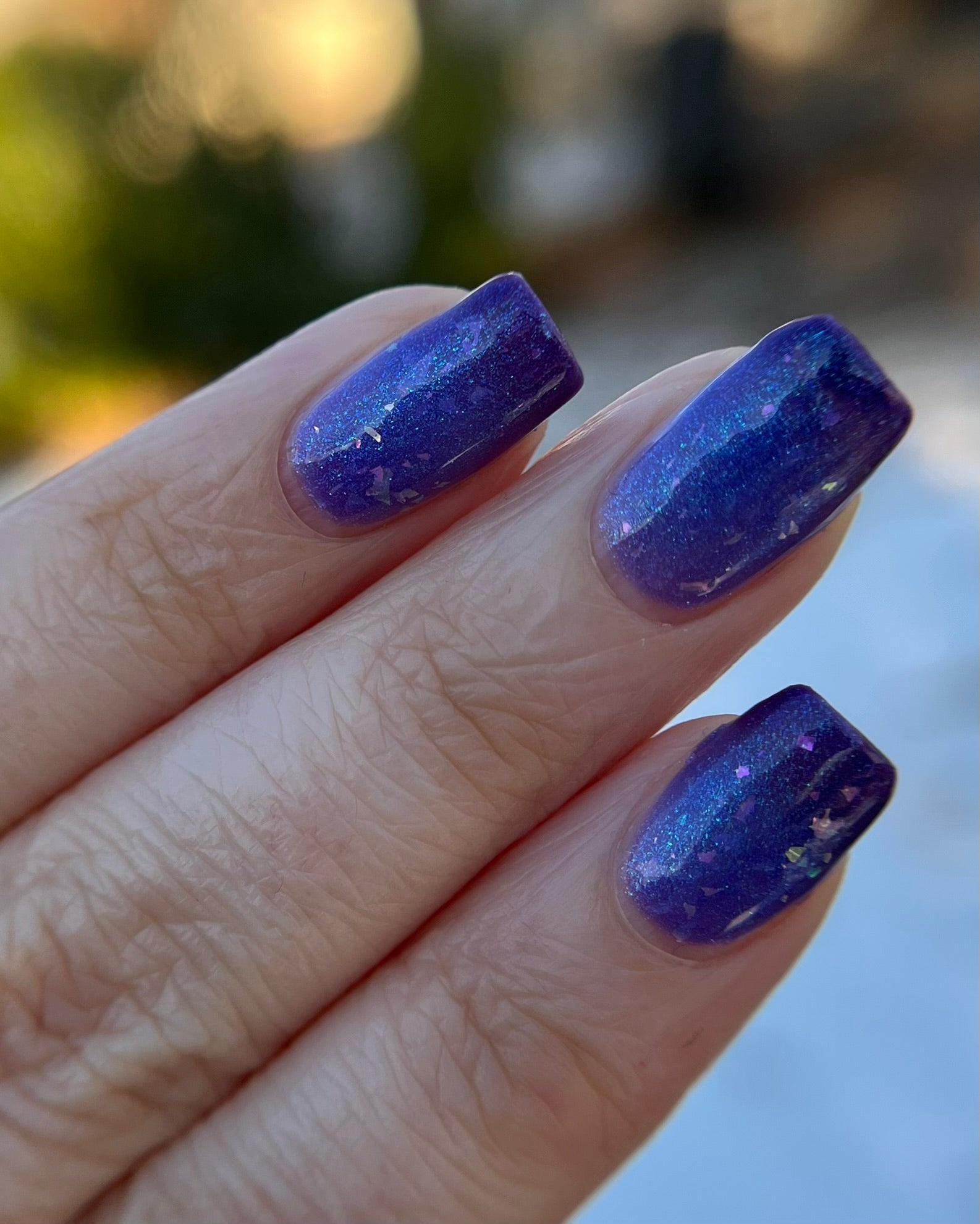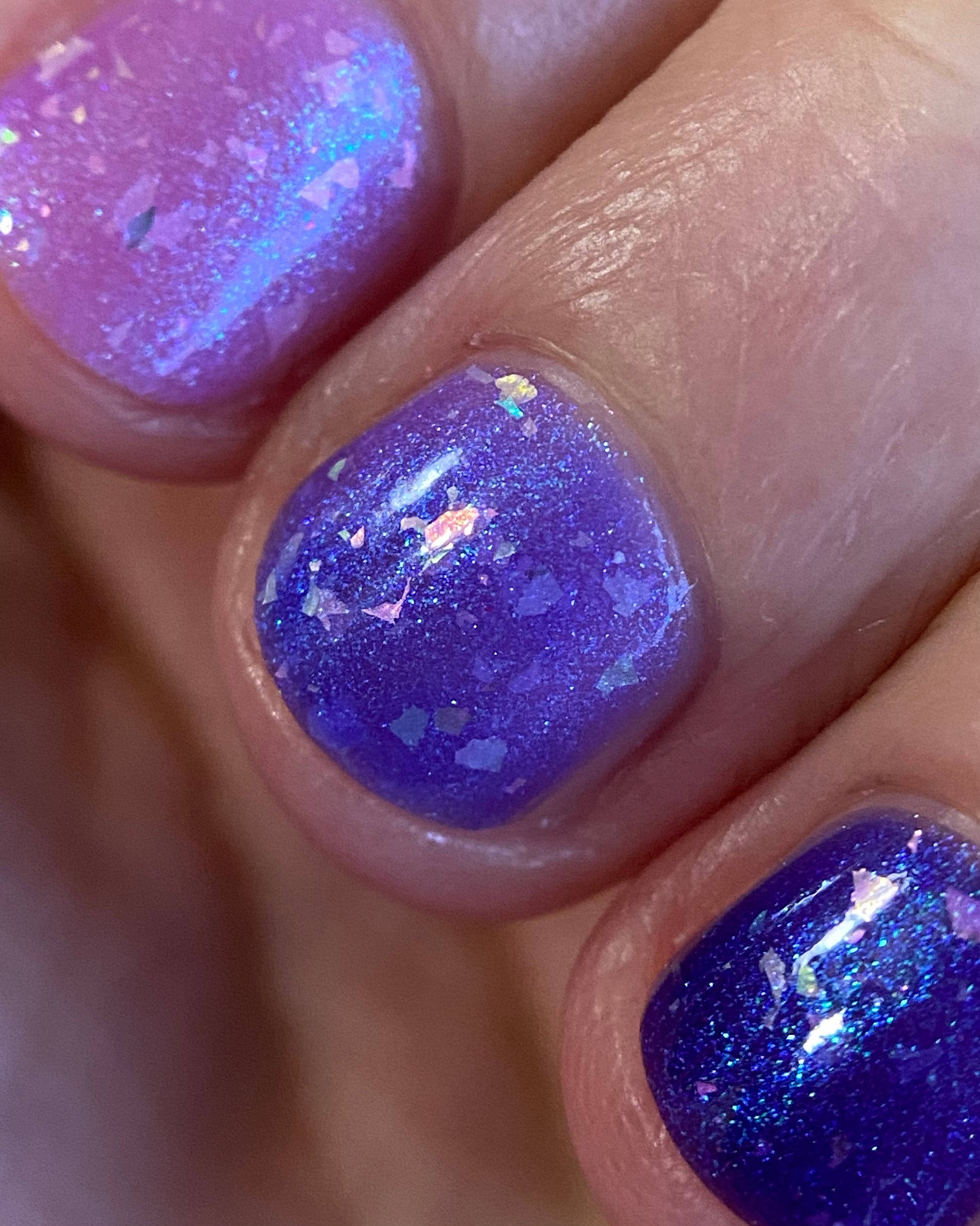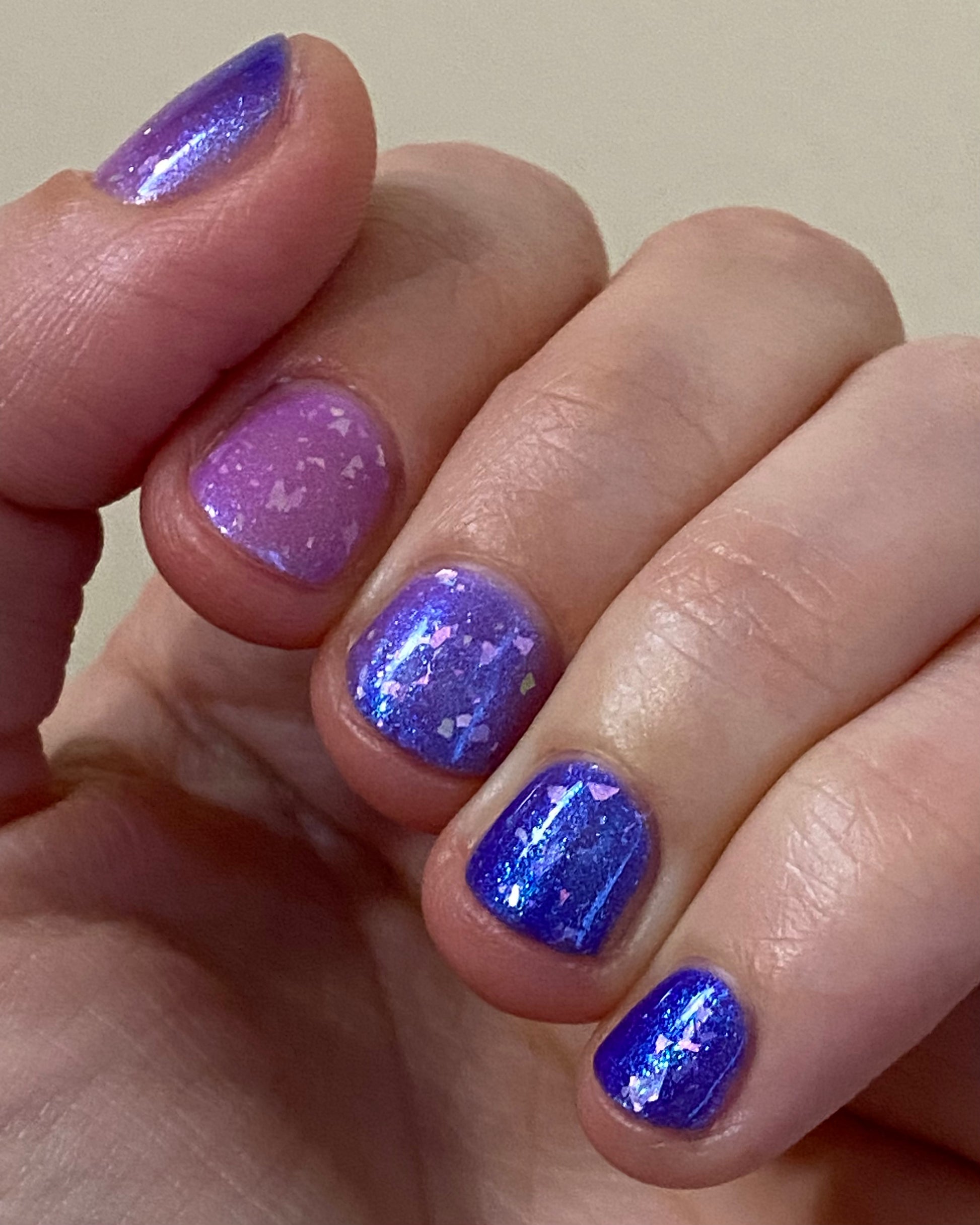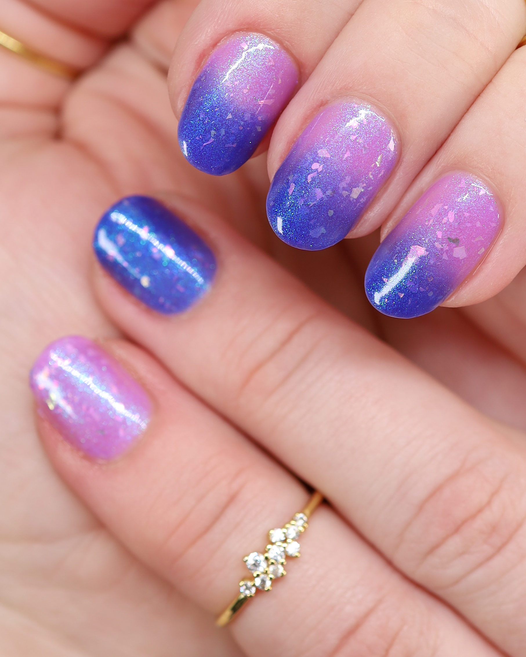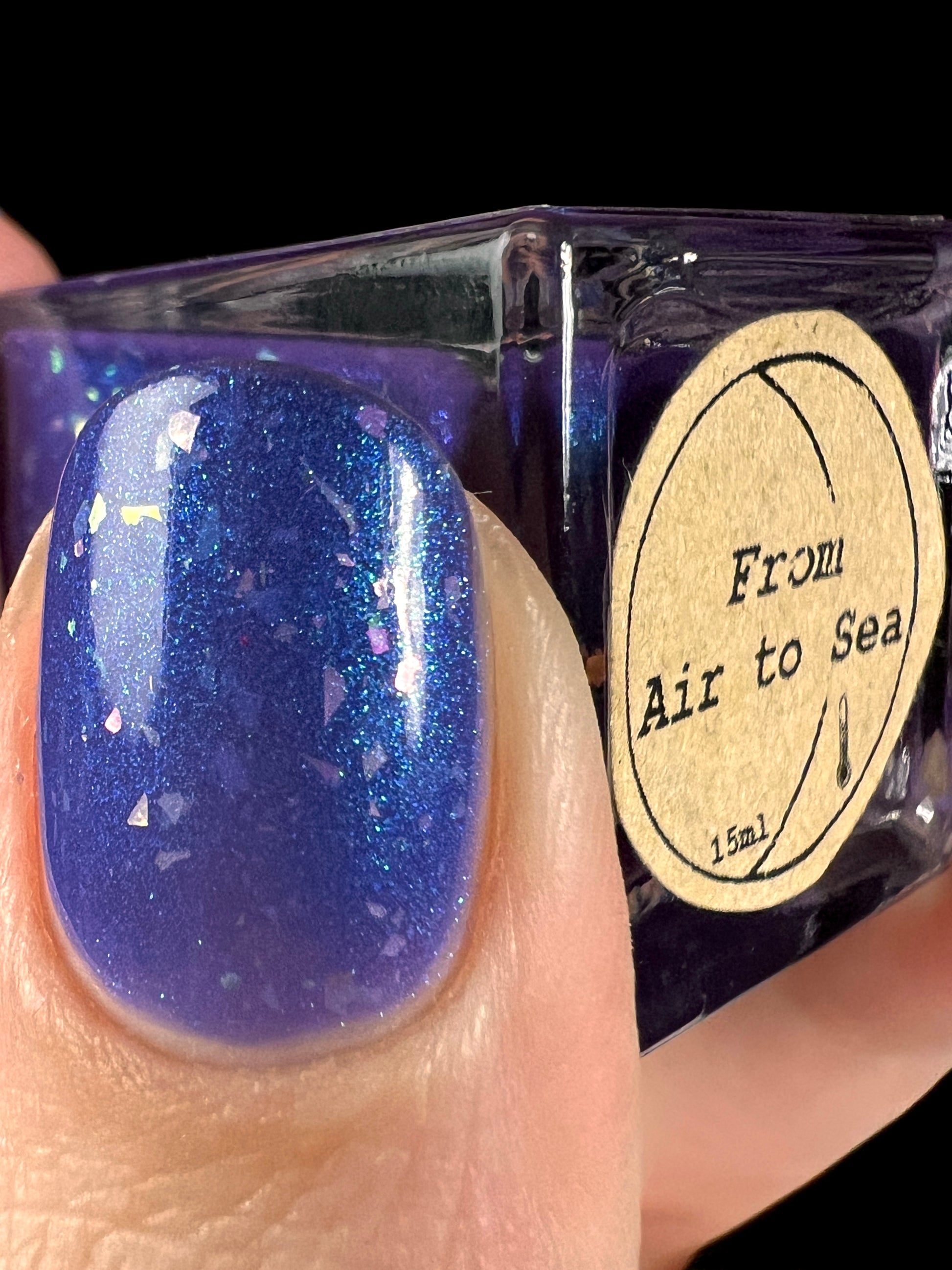 From Air to Sea is a tri-thermal polish that goes from light pink (hot) to blue (warm) to deep purple (cold) with blue to green shimmers and pink/blue/purple flakes.