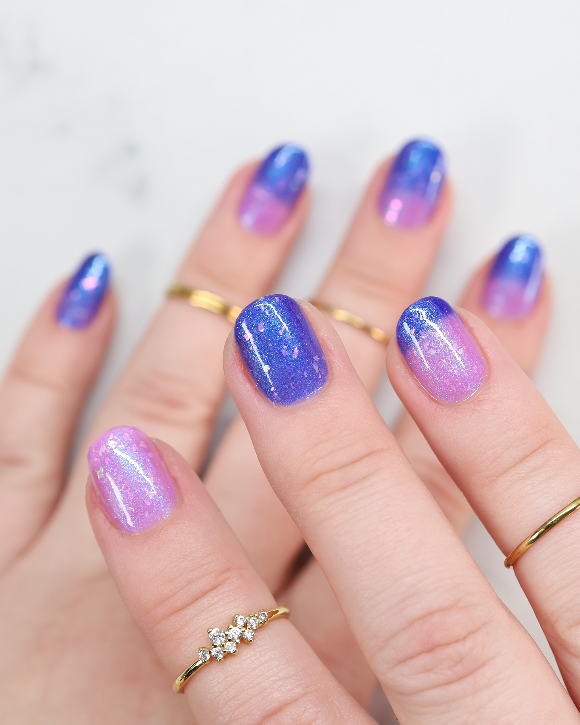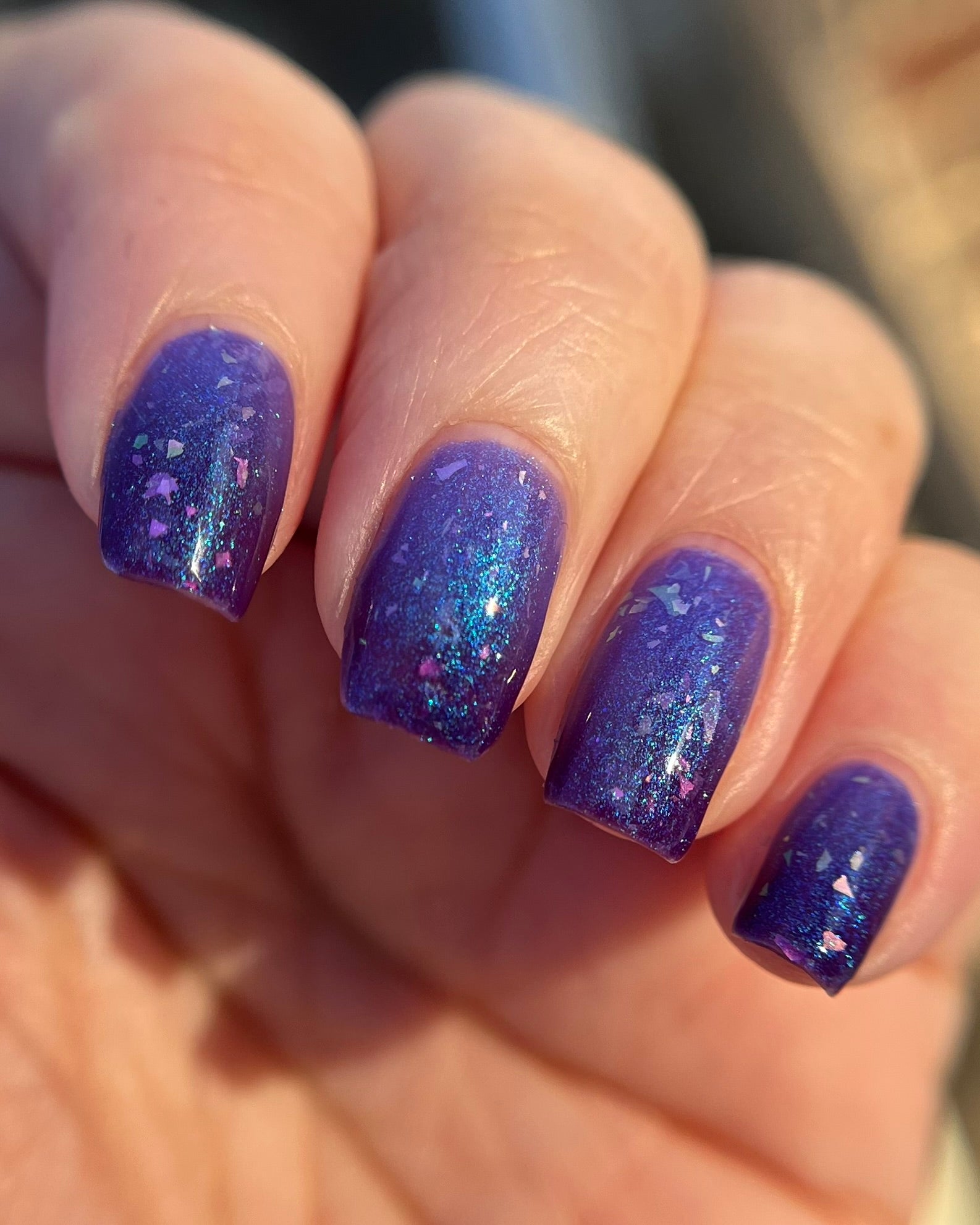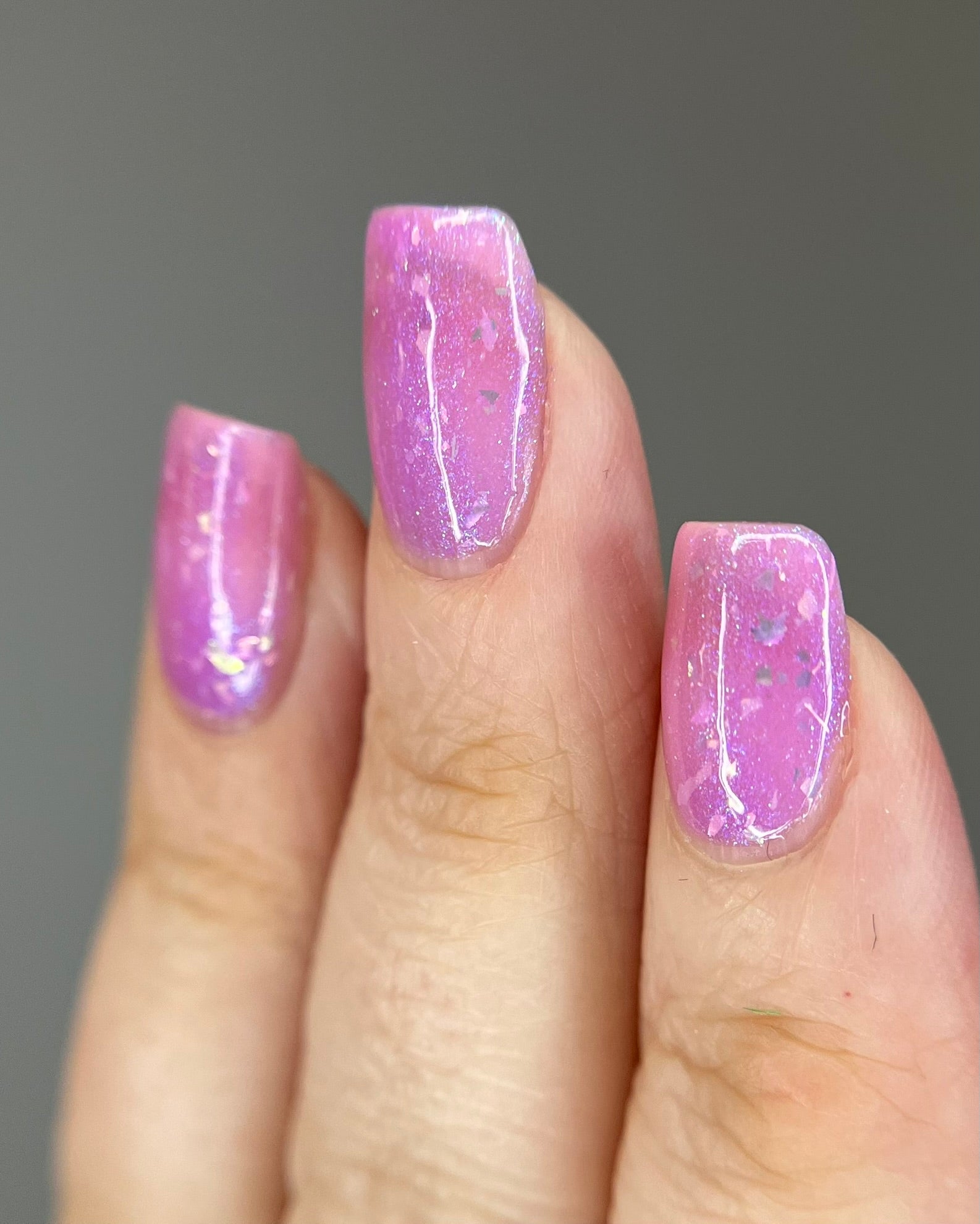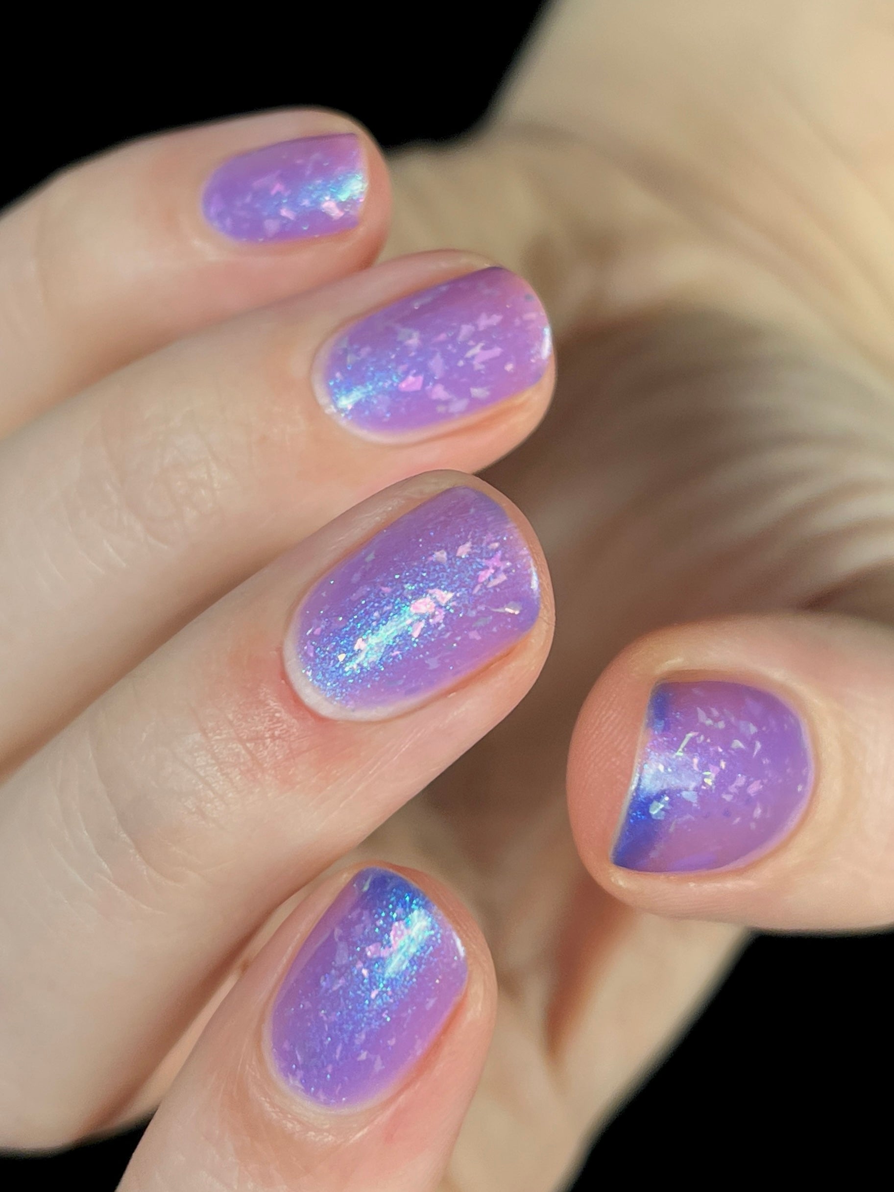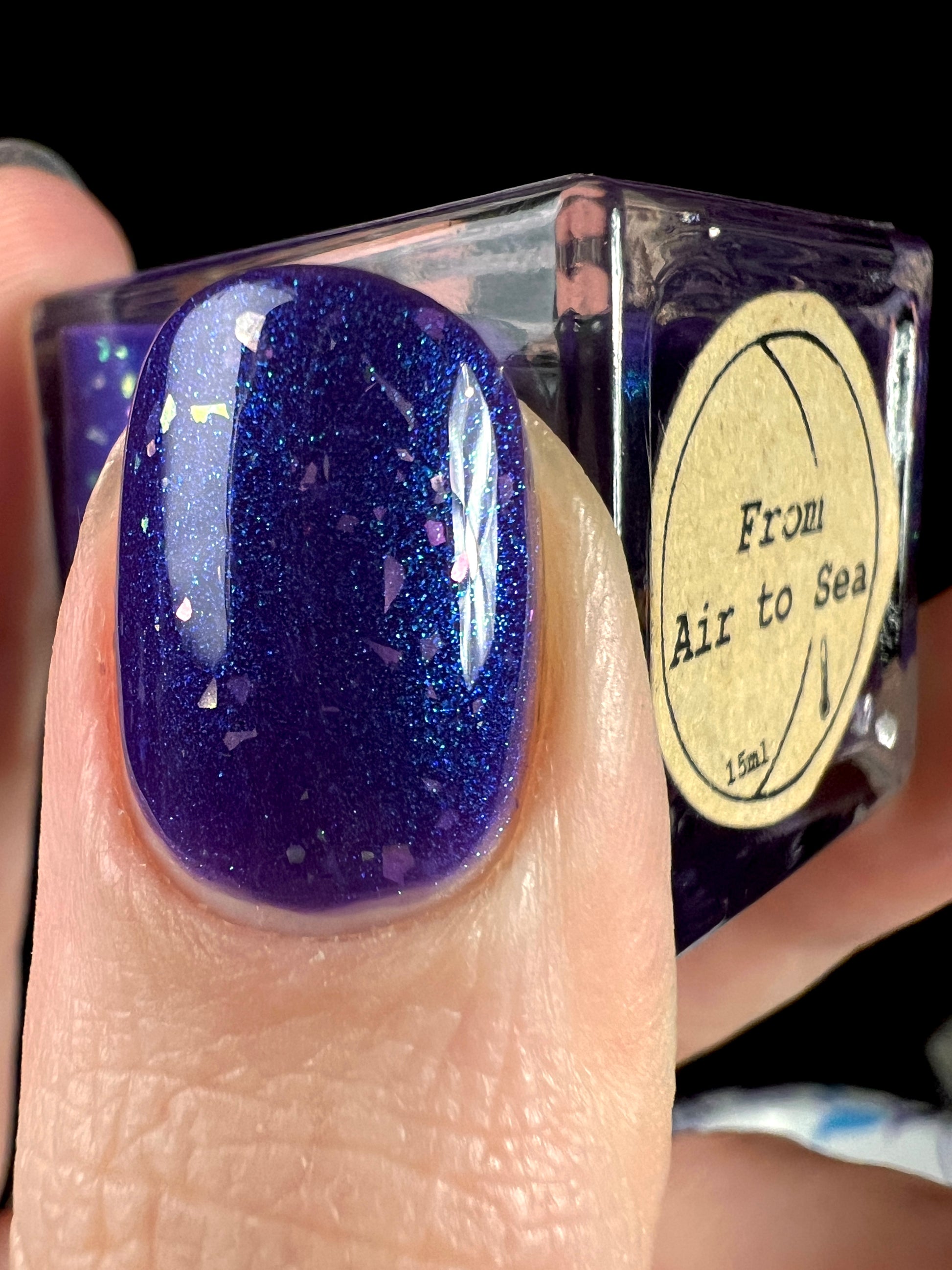 From Air to Sea is a tri-thermal polish that goes from light pink (hot) to blue (warm) to deep purple (cold) with blue to green shimmers and pink/blue/purple flakes.