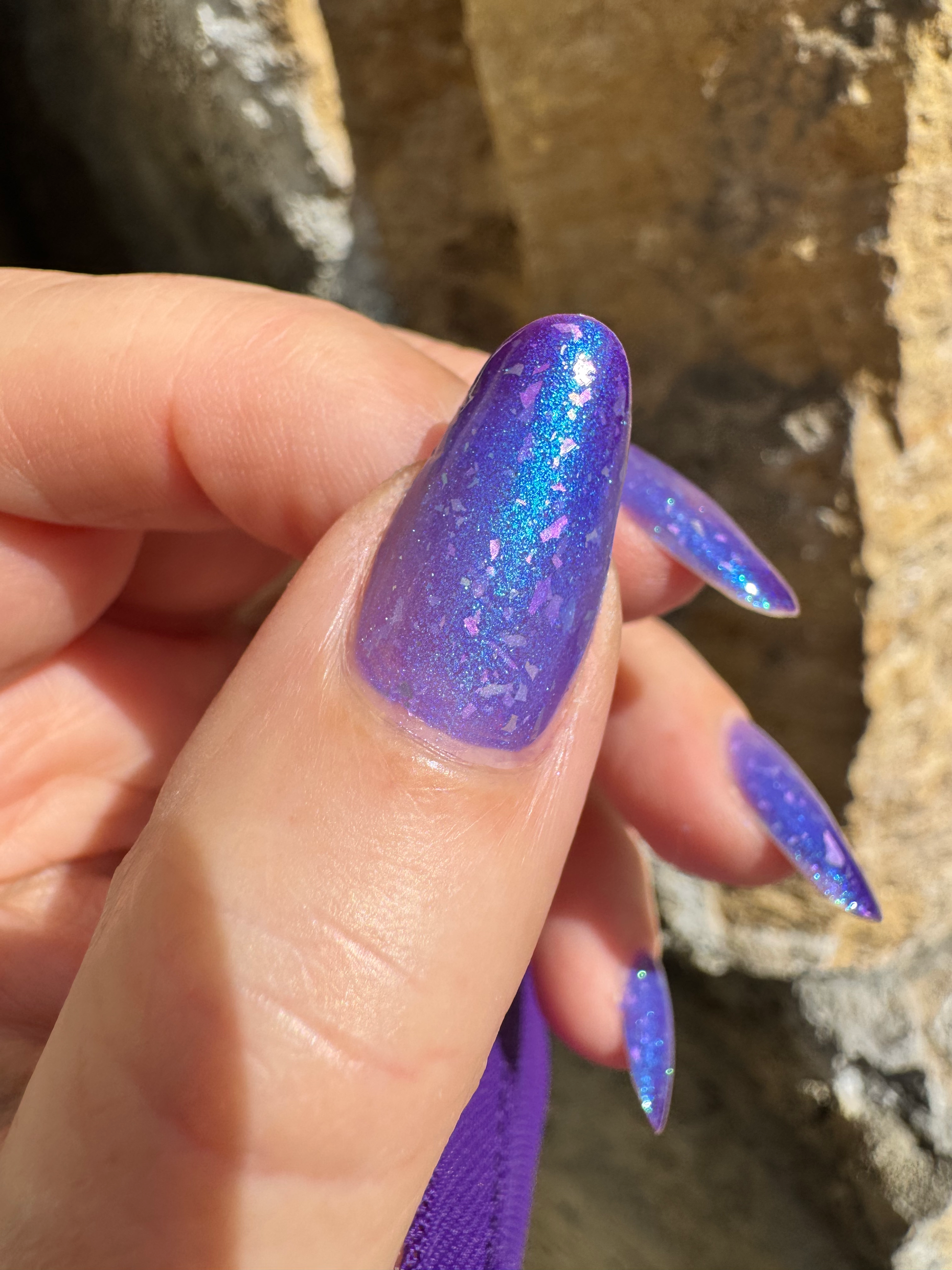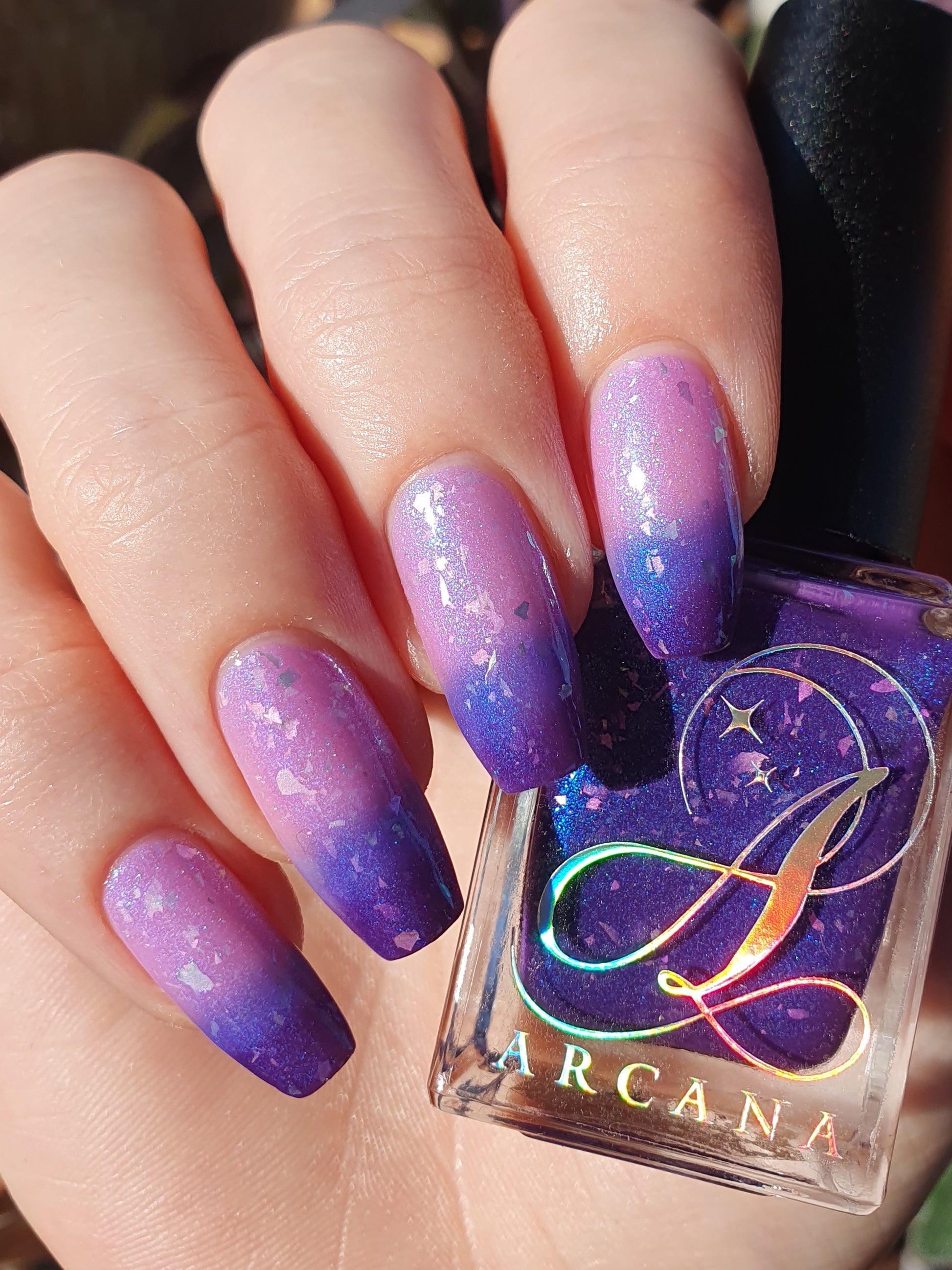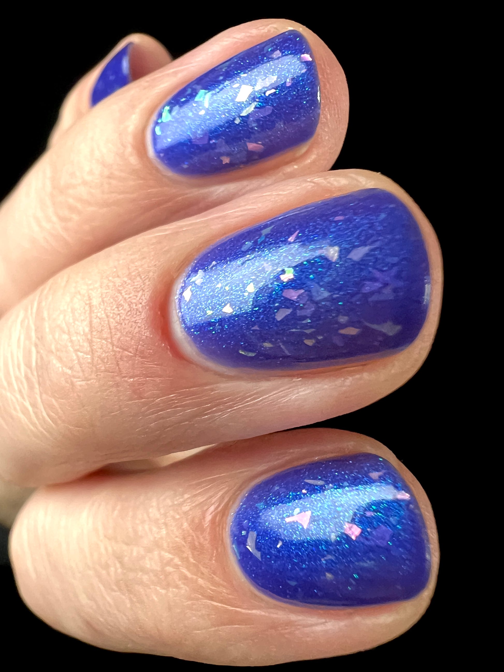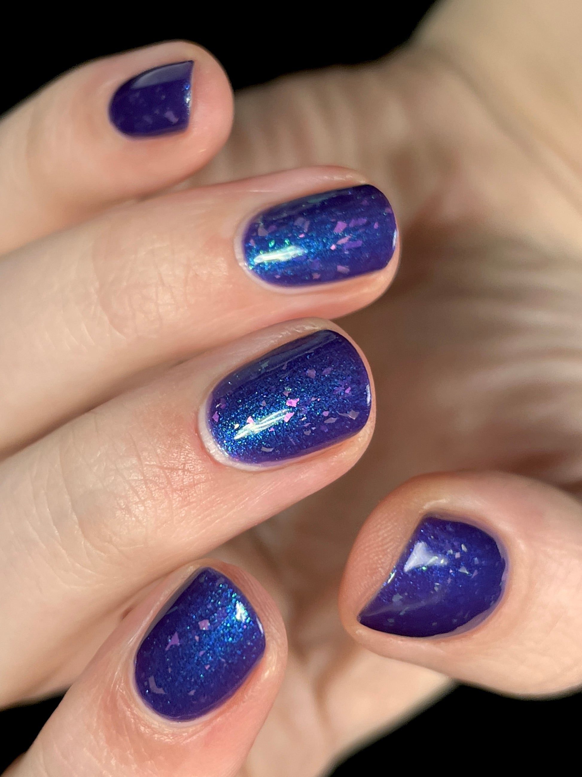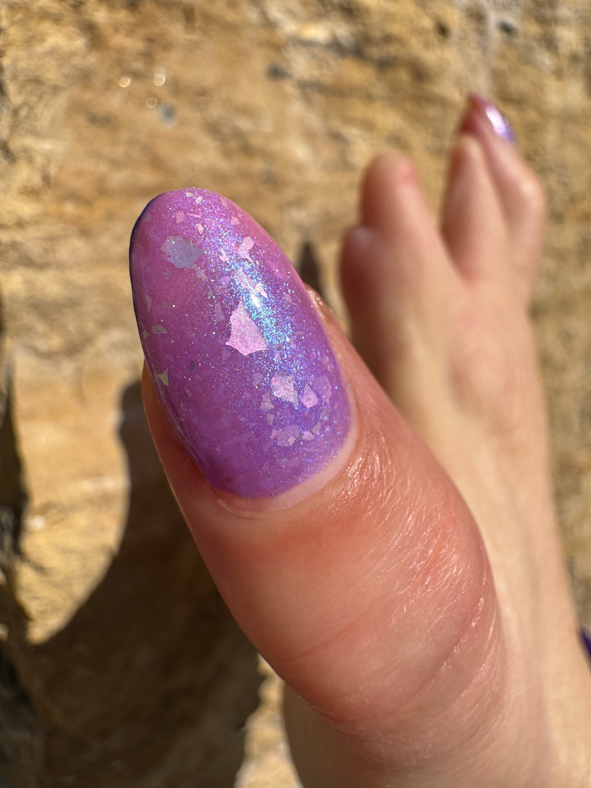 From Air to Sea is a tri-thermal polish that goes from light pink (hot) to blue (warm) to deep purple (cold) with blue to green shimmers and pink/blue/purple flakes.