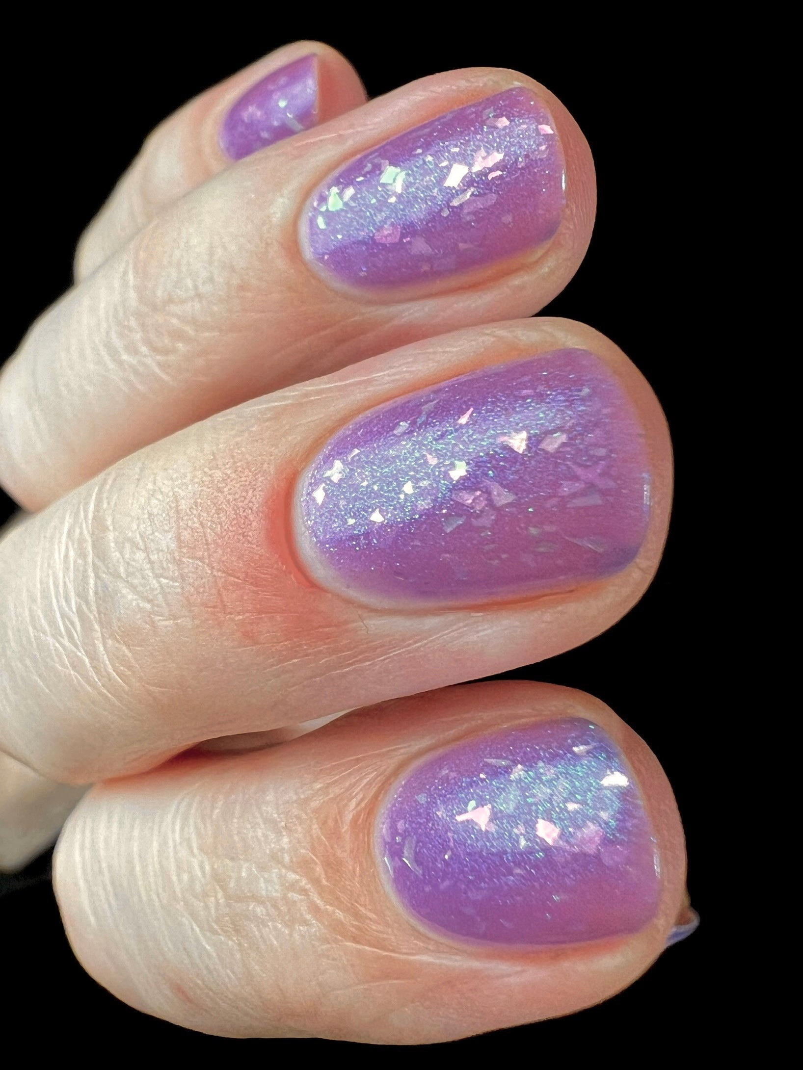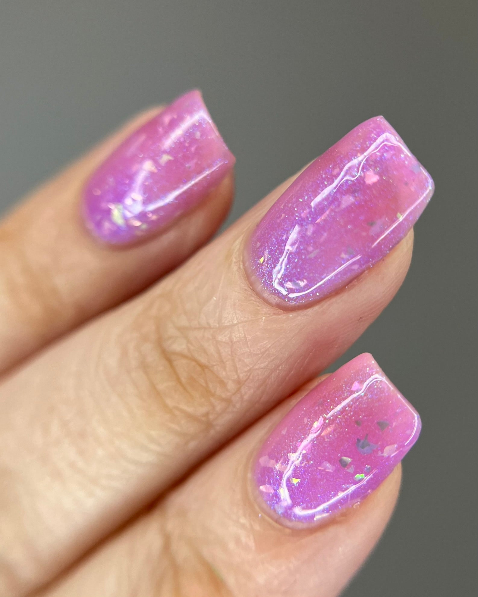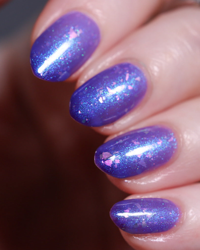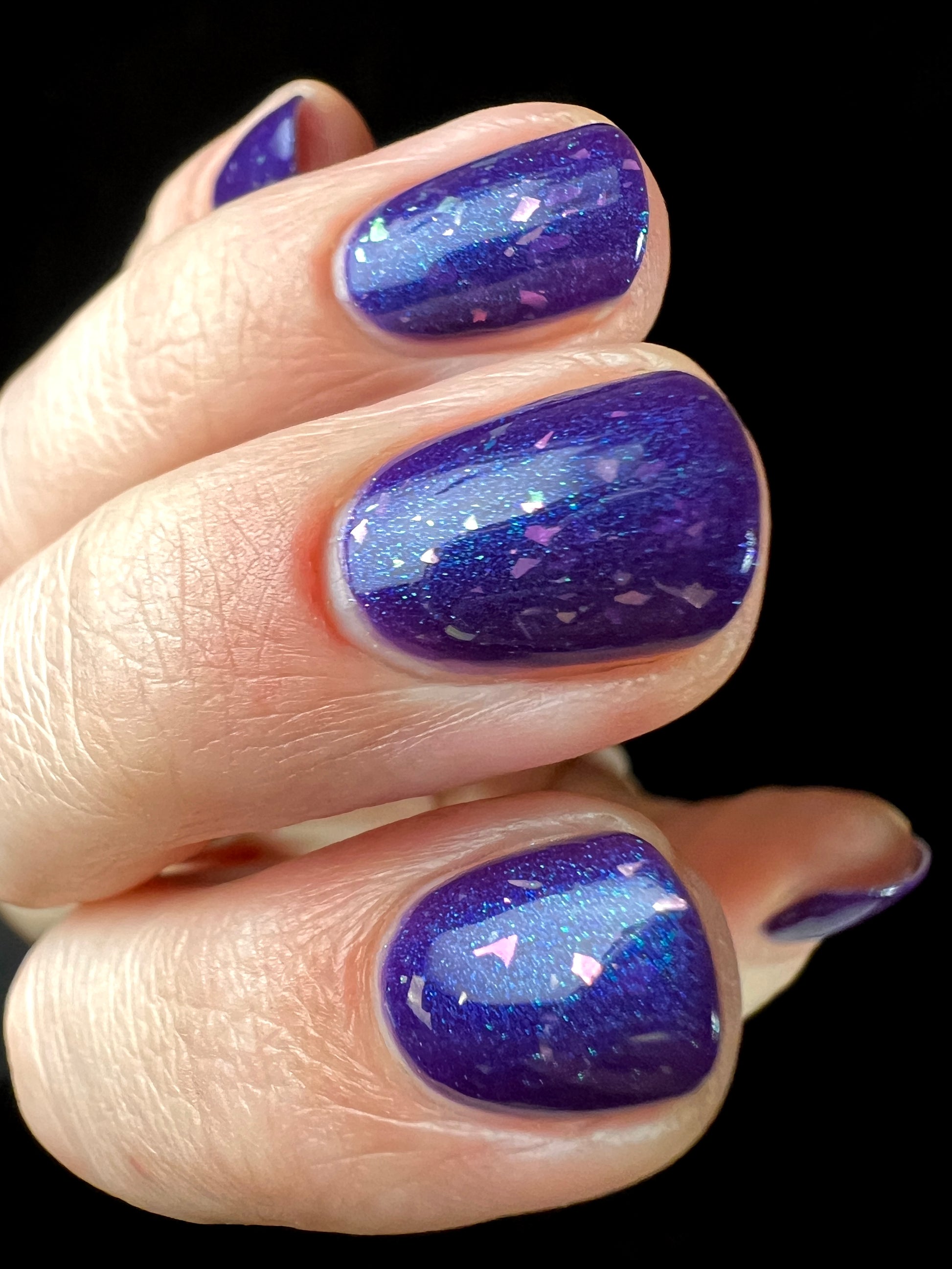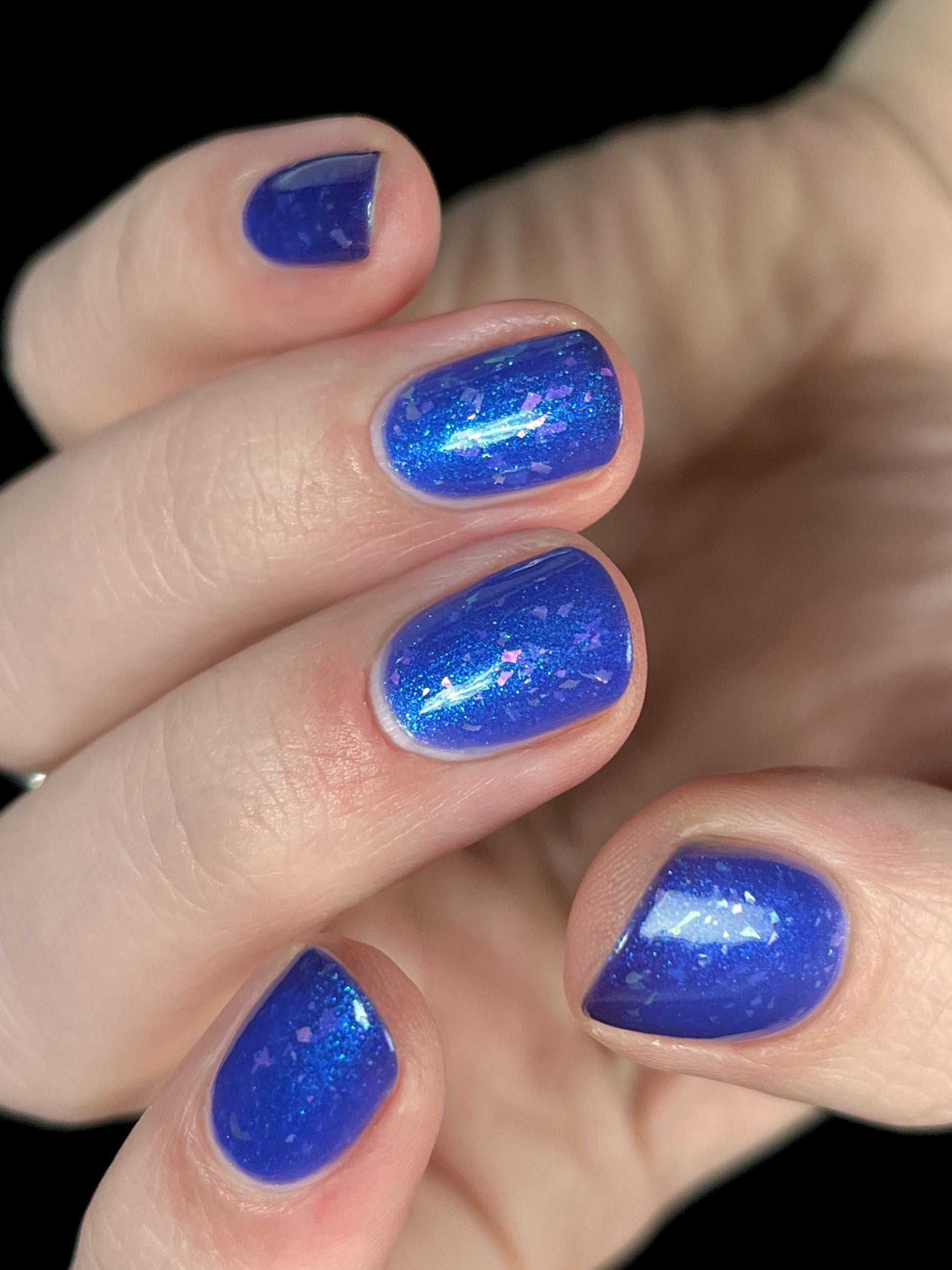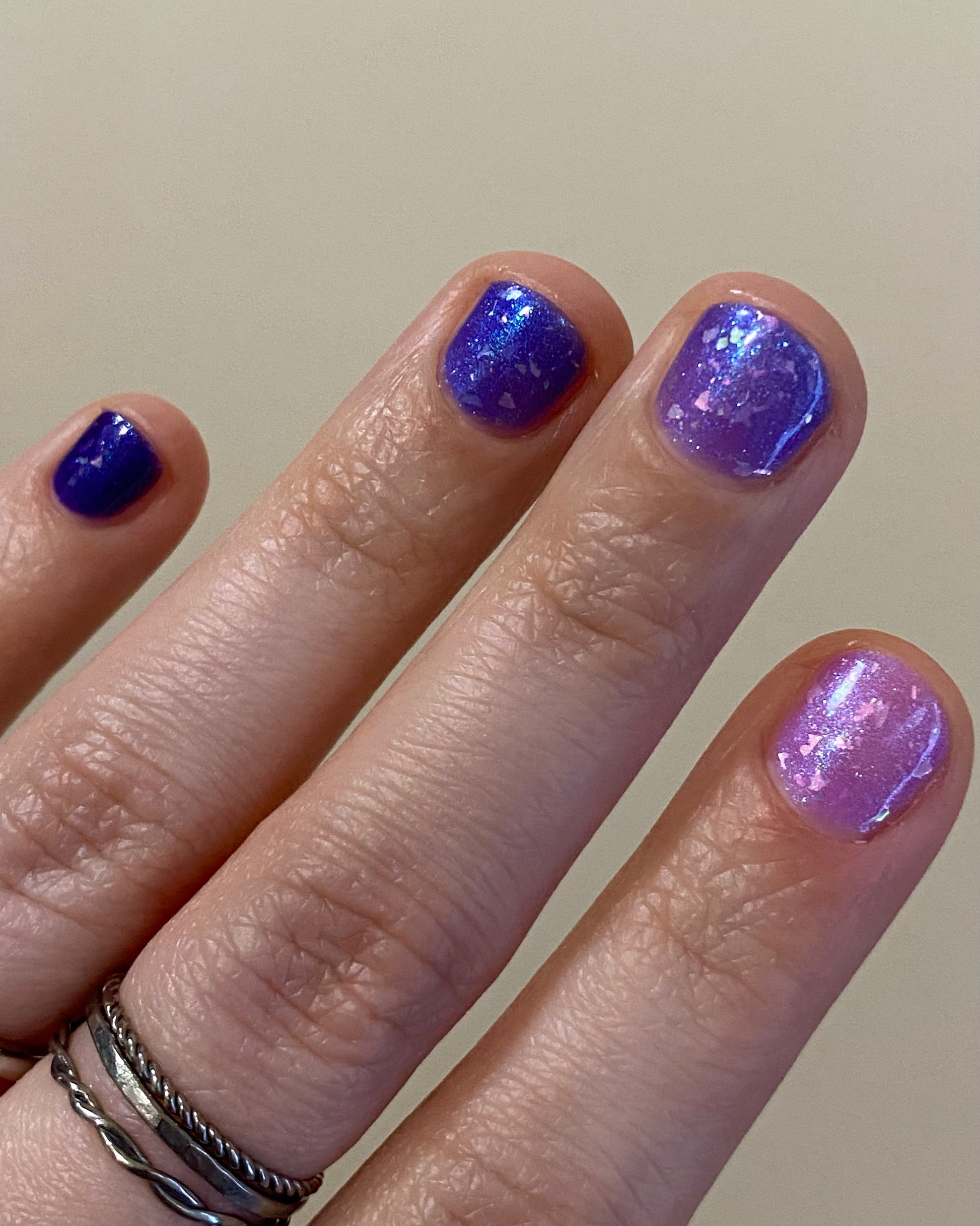 From Air to Sea is a tri-thermal polish that goes from light pink (hot) to blue (warm) to deep purple (cold) with blue to green shimmers and pink/blue/purple flakes.