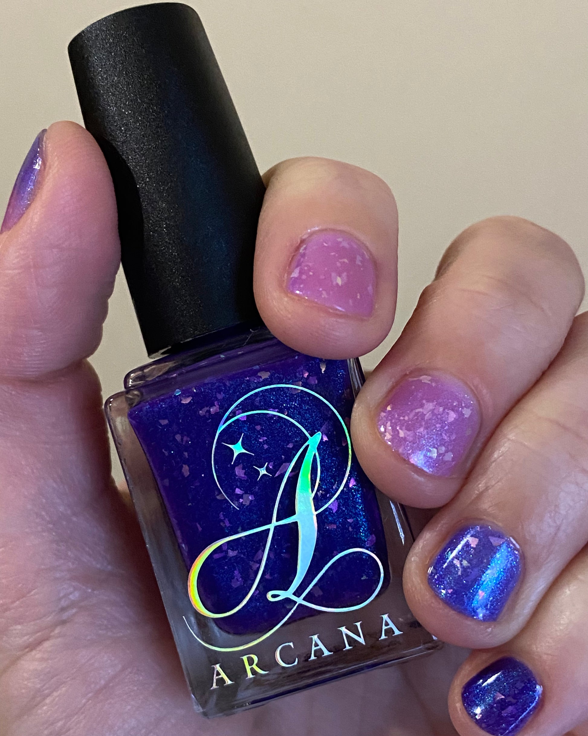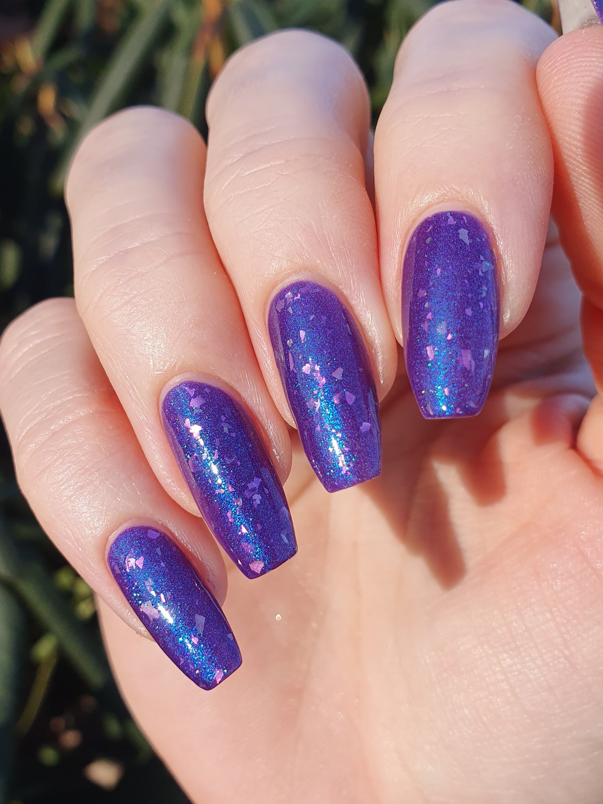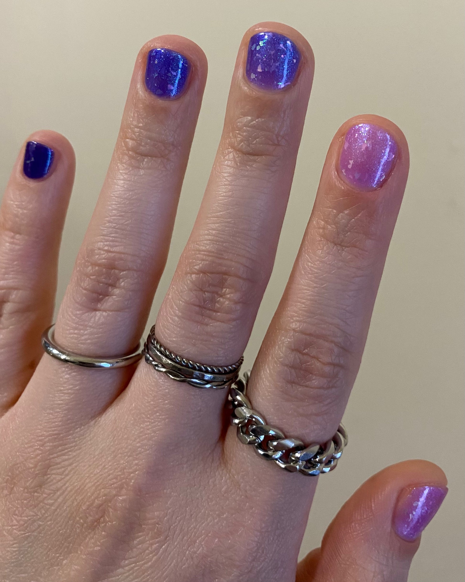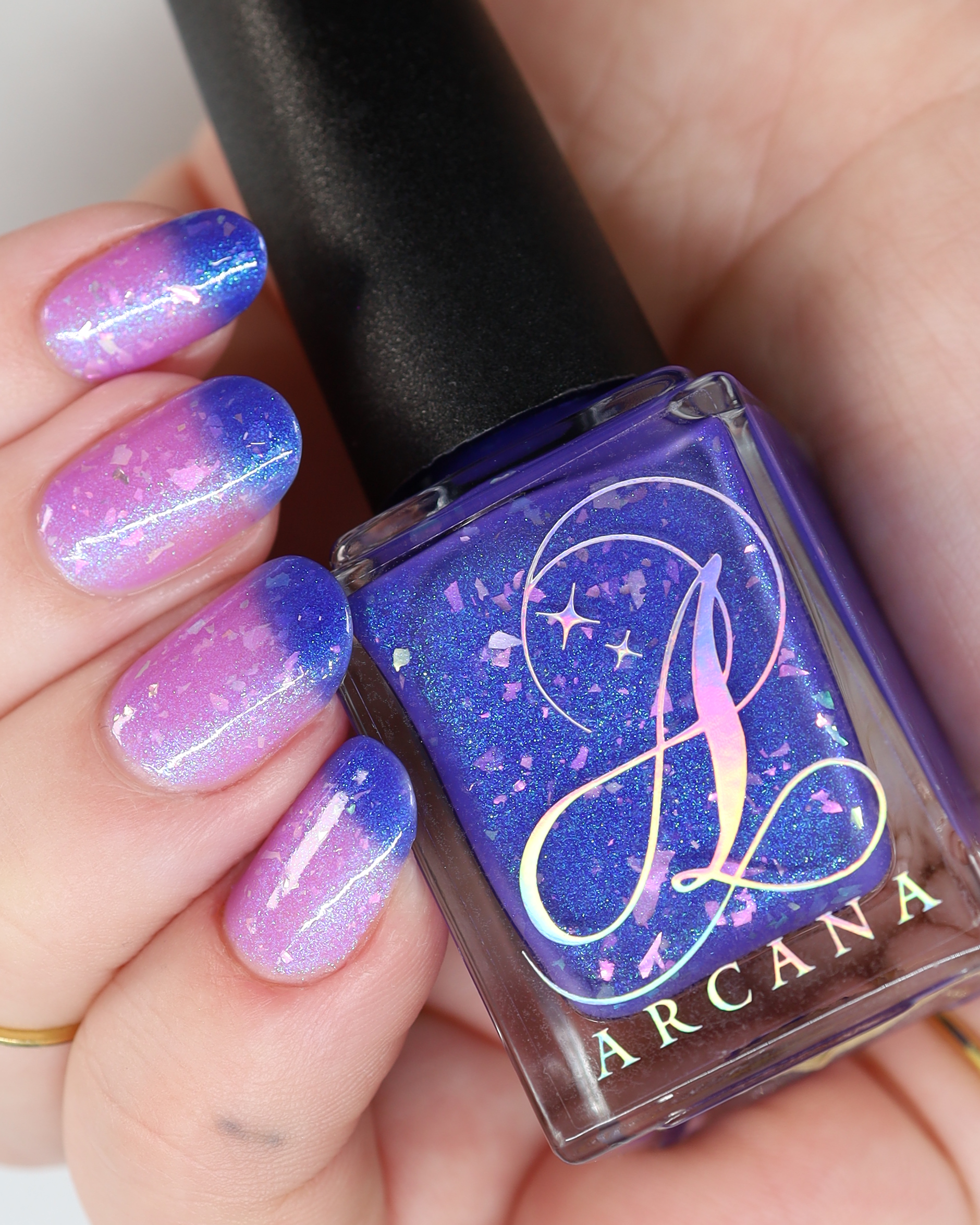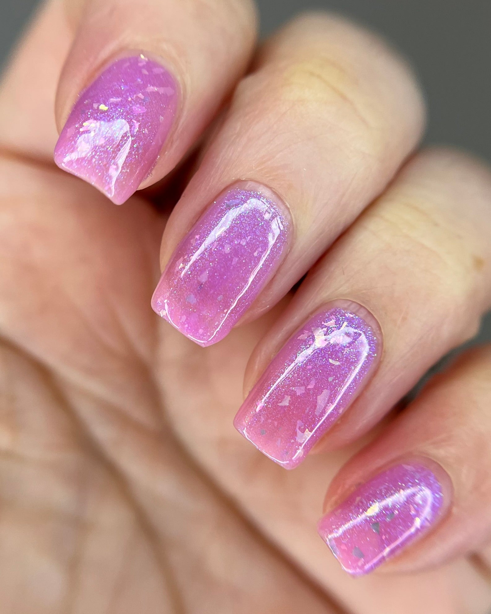 From Air to Sea is a tri-thermal polish that goes from light pink (hot) to blue (warm) to deep purple (cold) with blue to green shimmers and pink/blue/purple flakes.