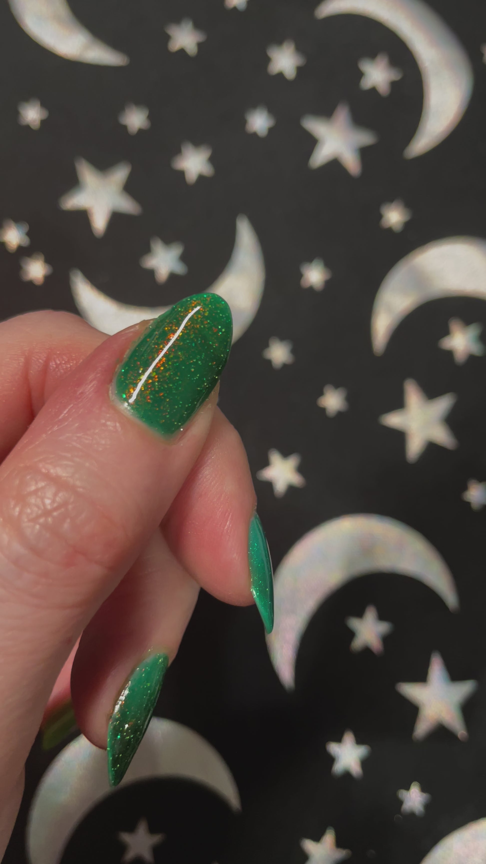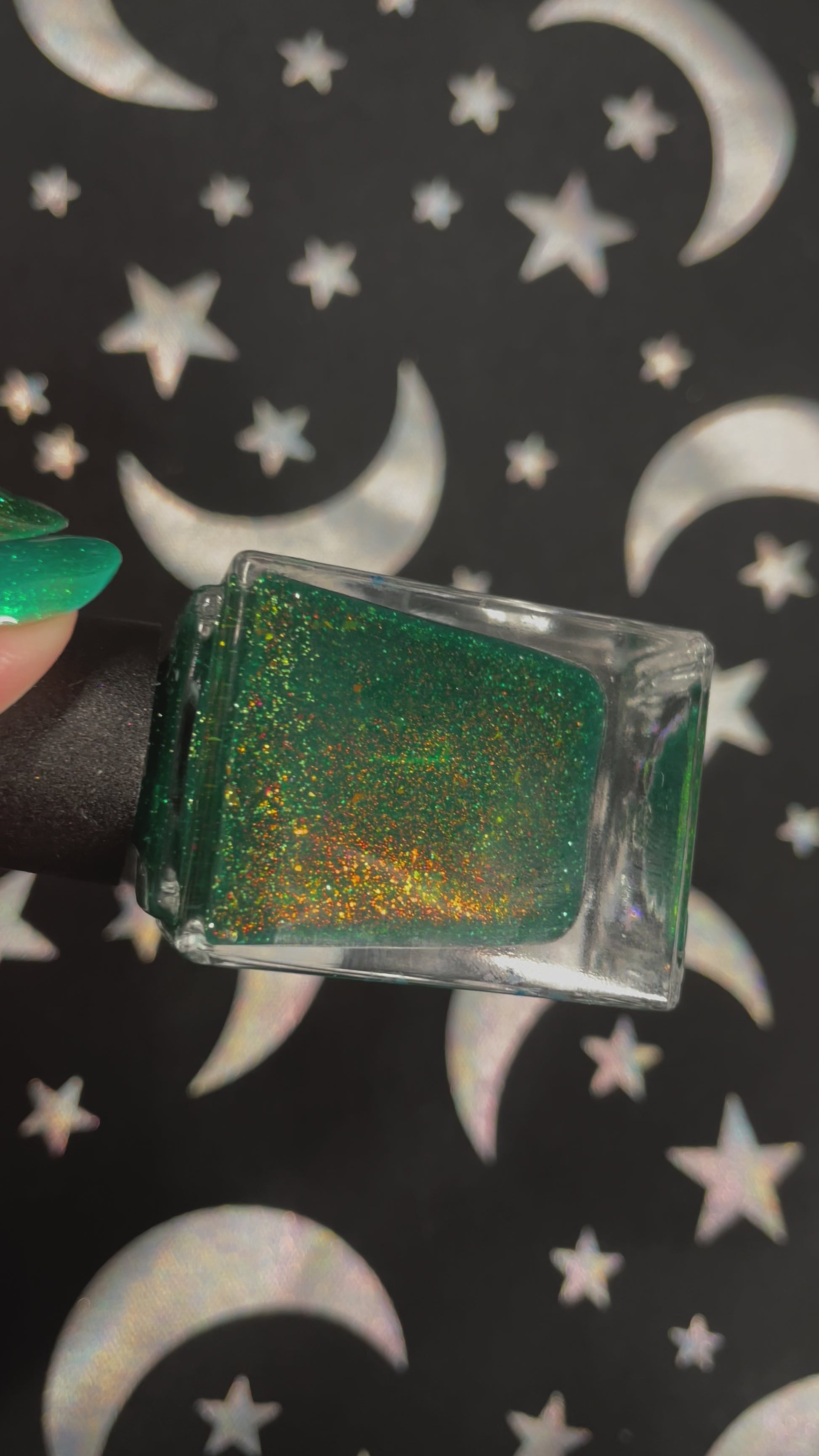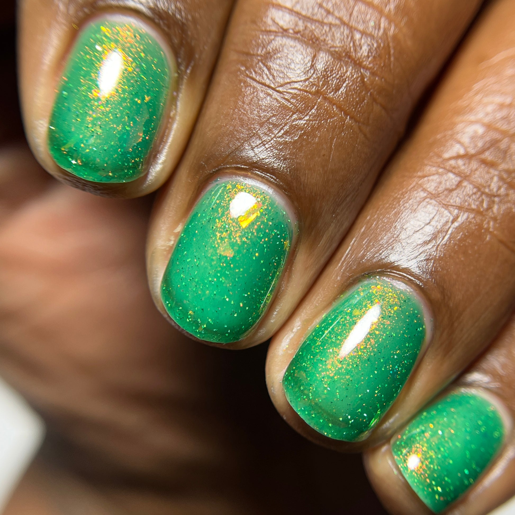 A green jelly base with orange to yellow shimmer, orange to yellow flakes in a variety of sizes, and green reflective glitter.
