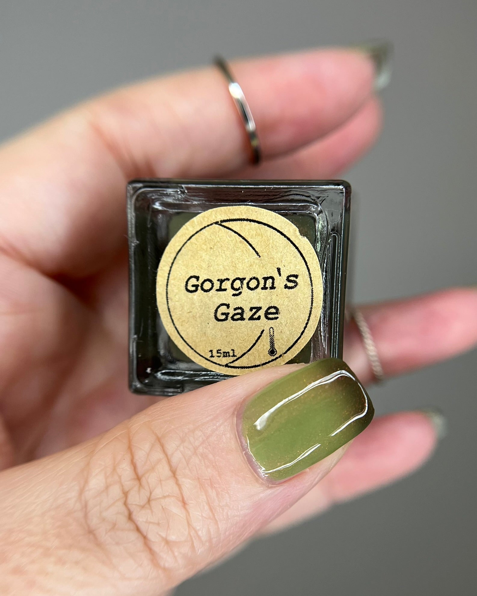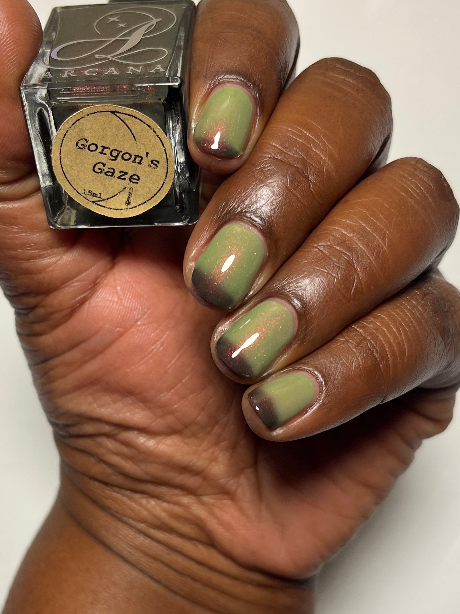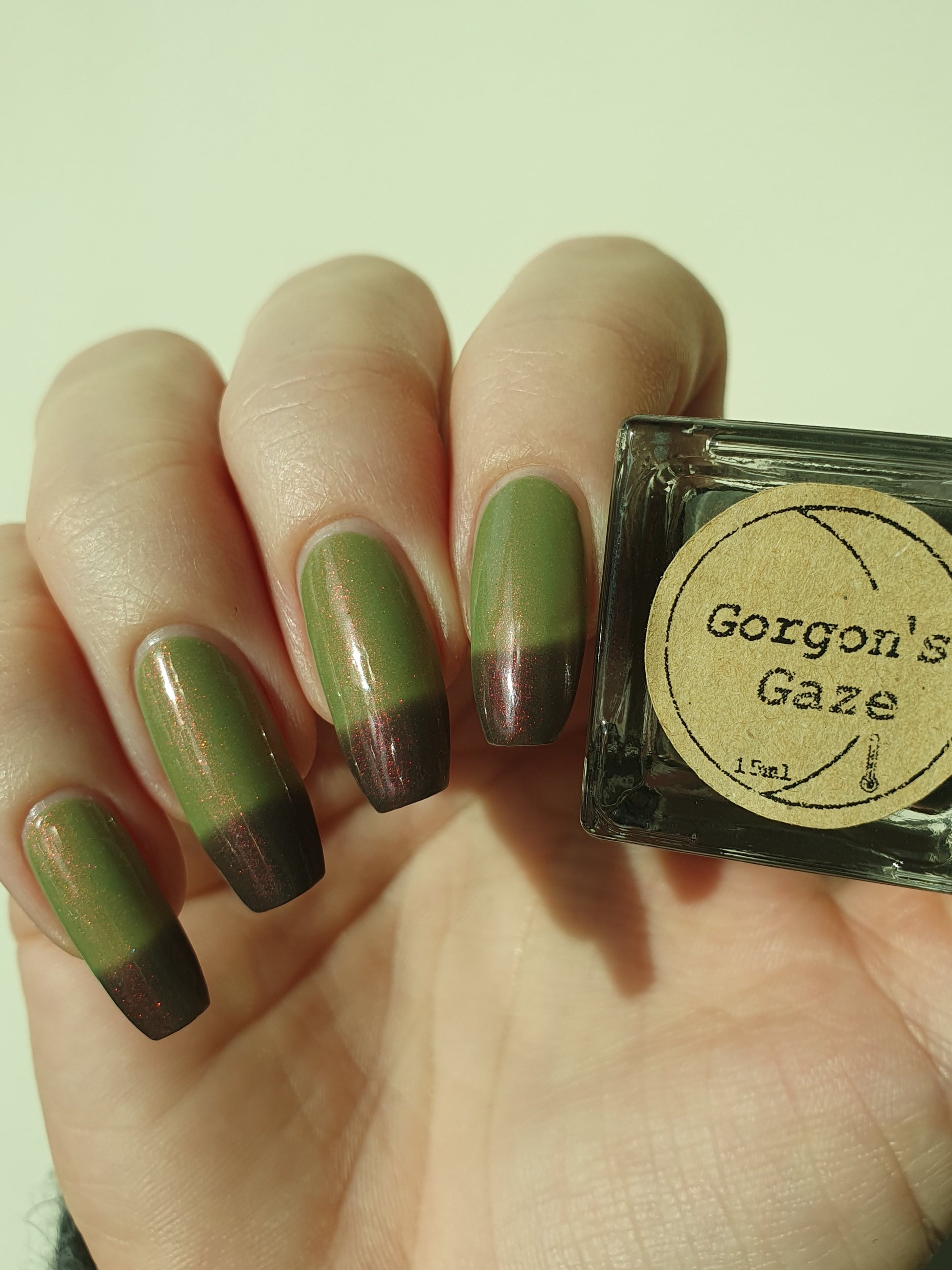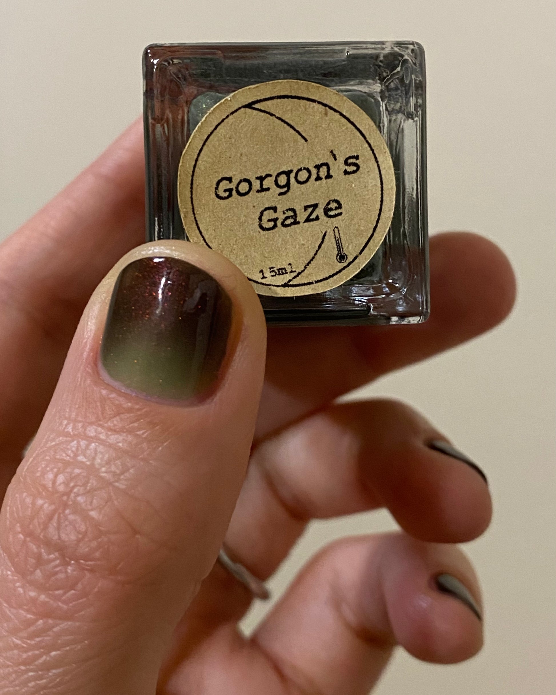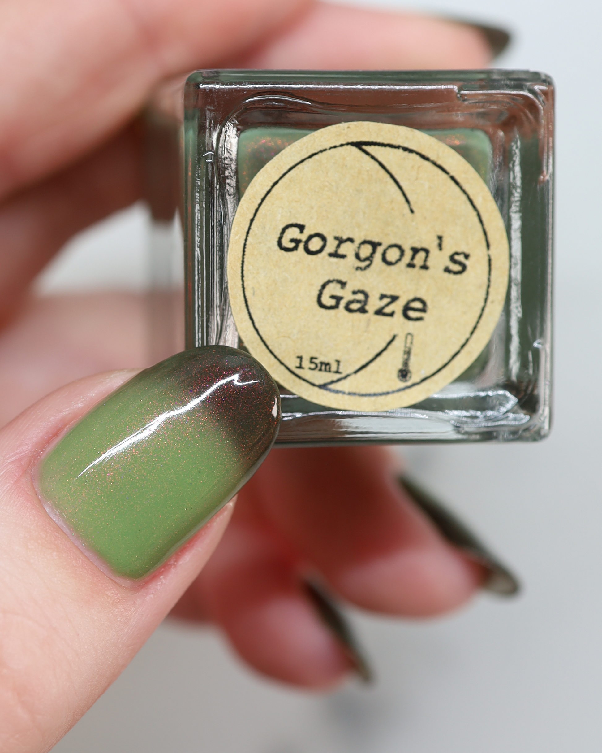 Gorgon's Gaze is a thermal polish that goes from a dark, gray-green (cold) to muted ivy green (warm) with a small particle red to yellow shimmer.
