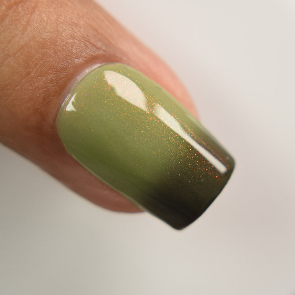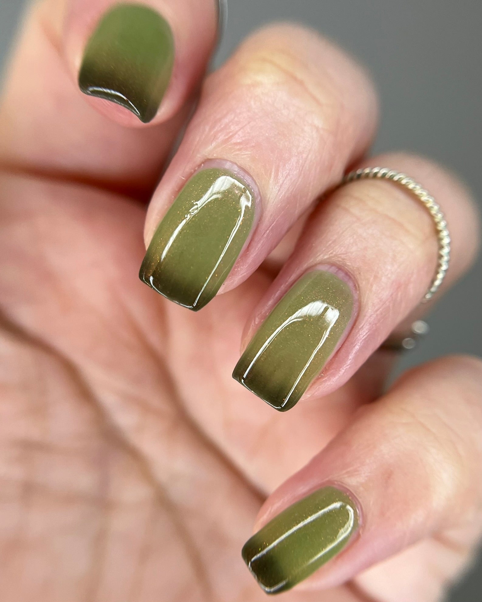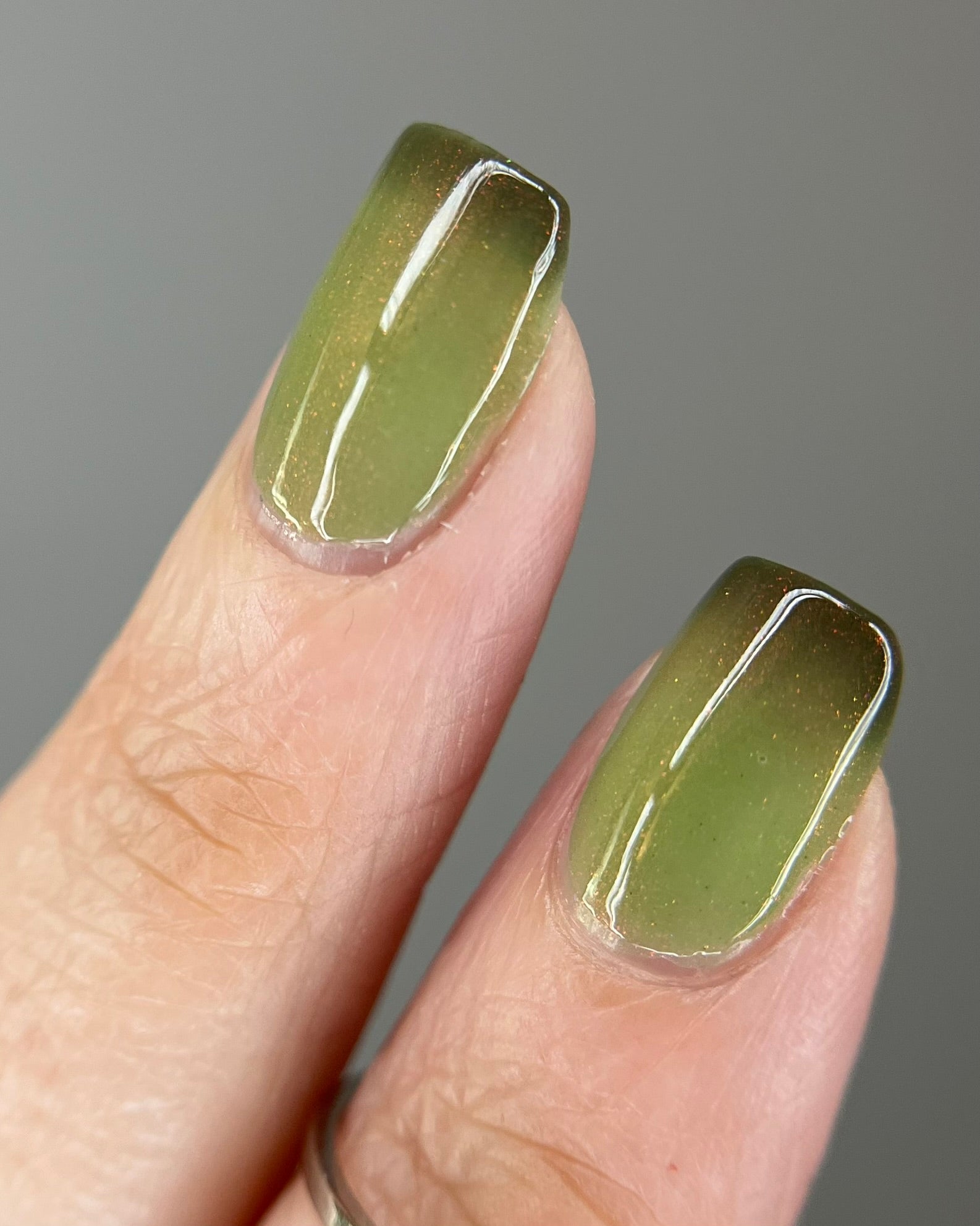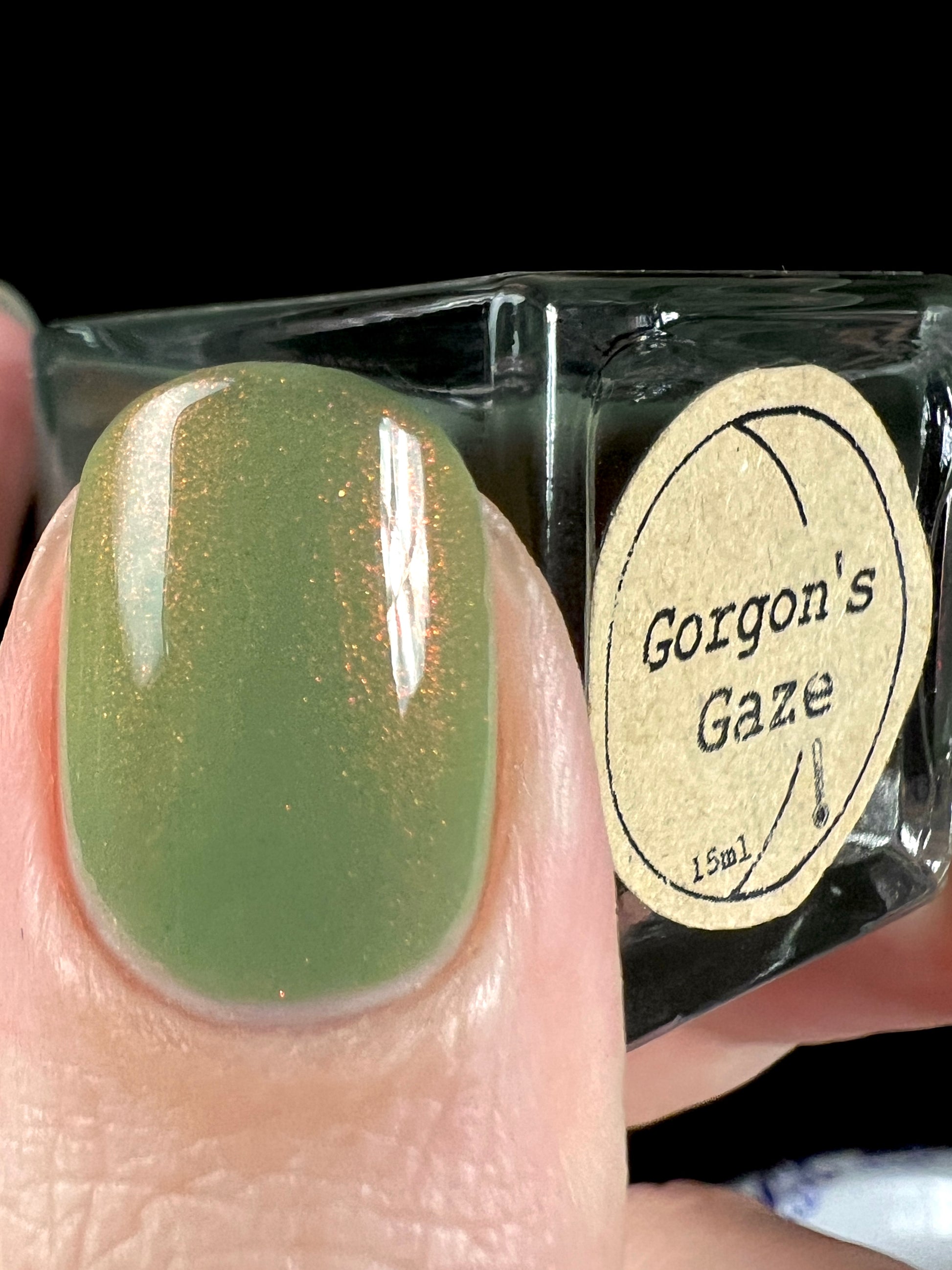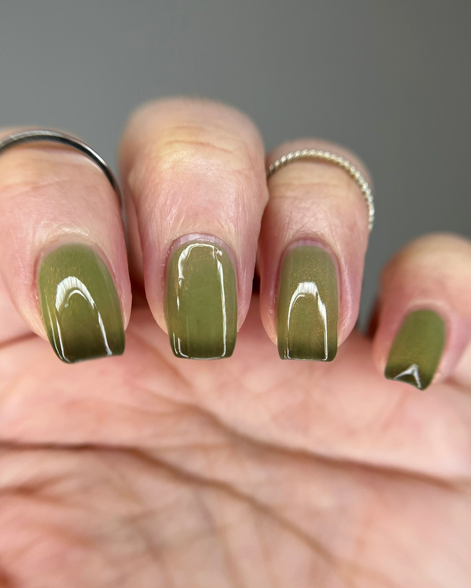 Gorgon's Gaze is a thermal polish that goes from a dark, gray-green (cold) to muted ivy green (warm) with a small particle red to yellow shimmer.