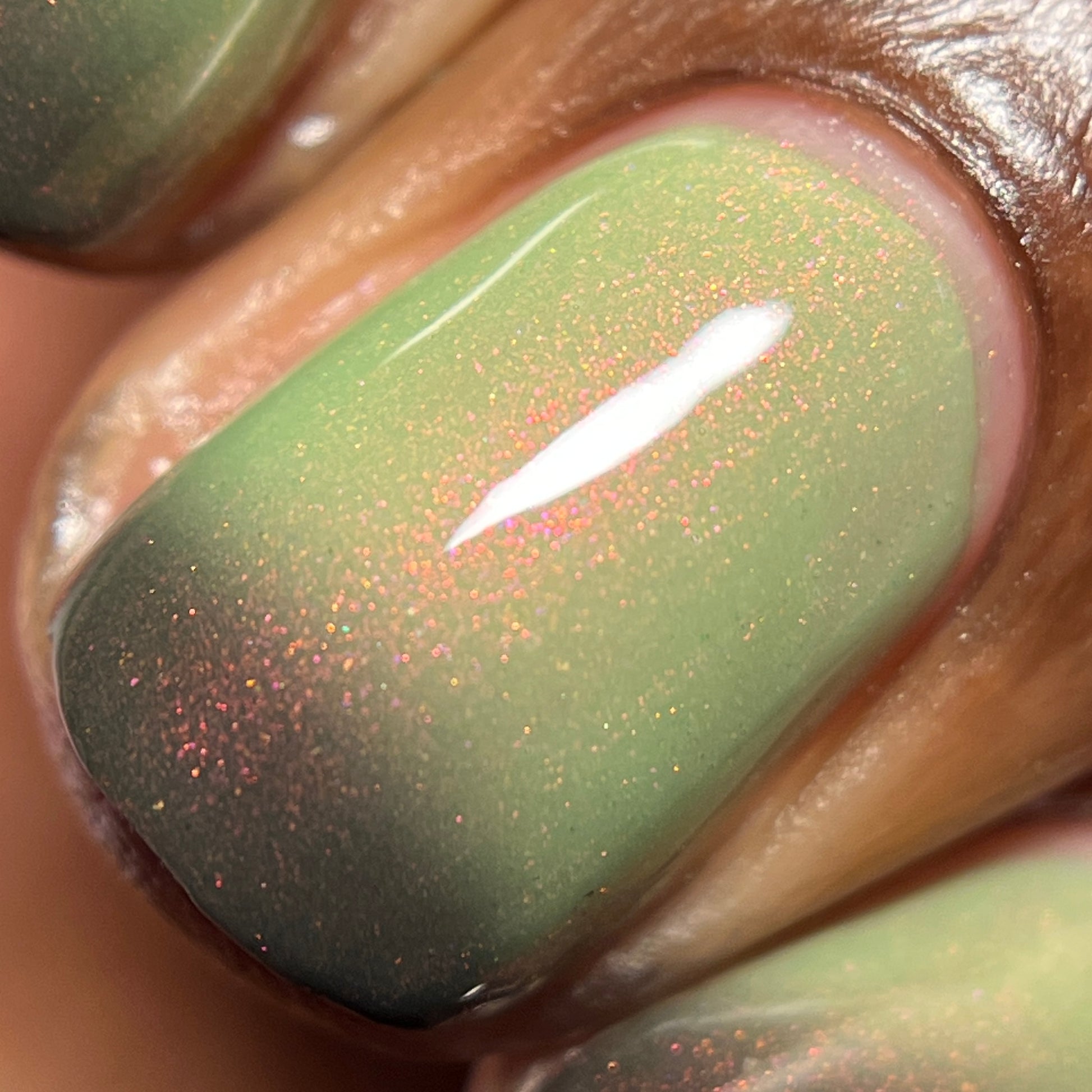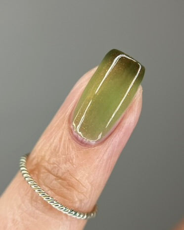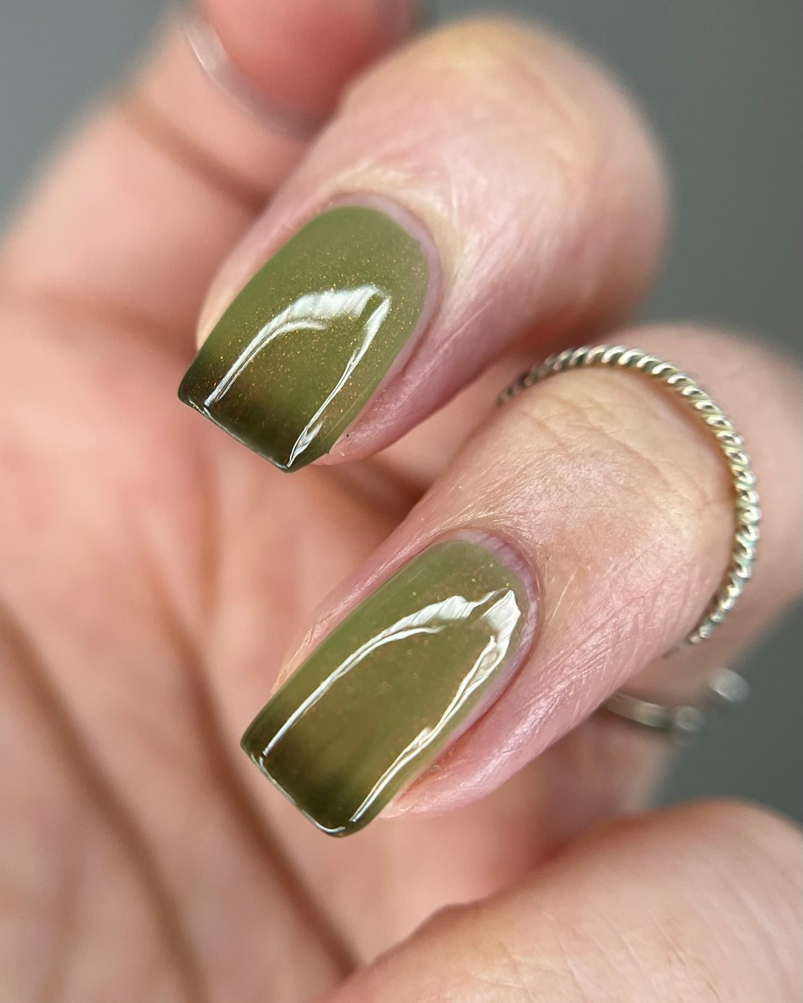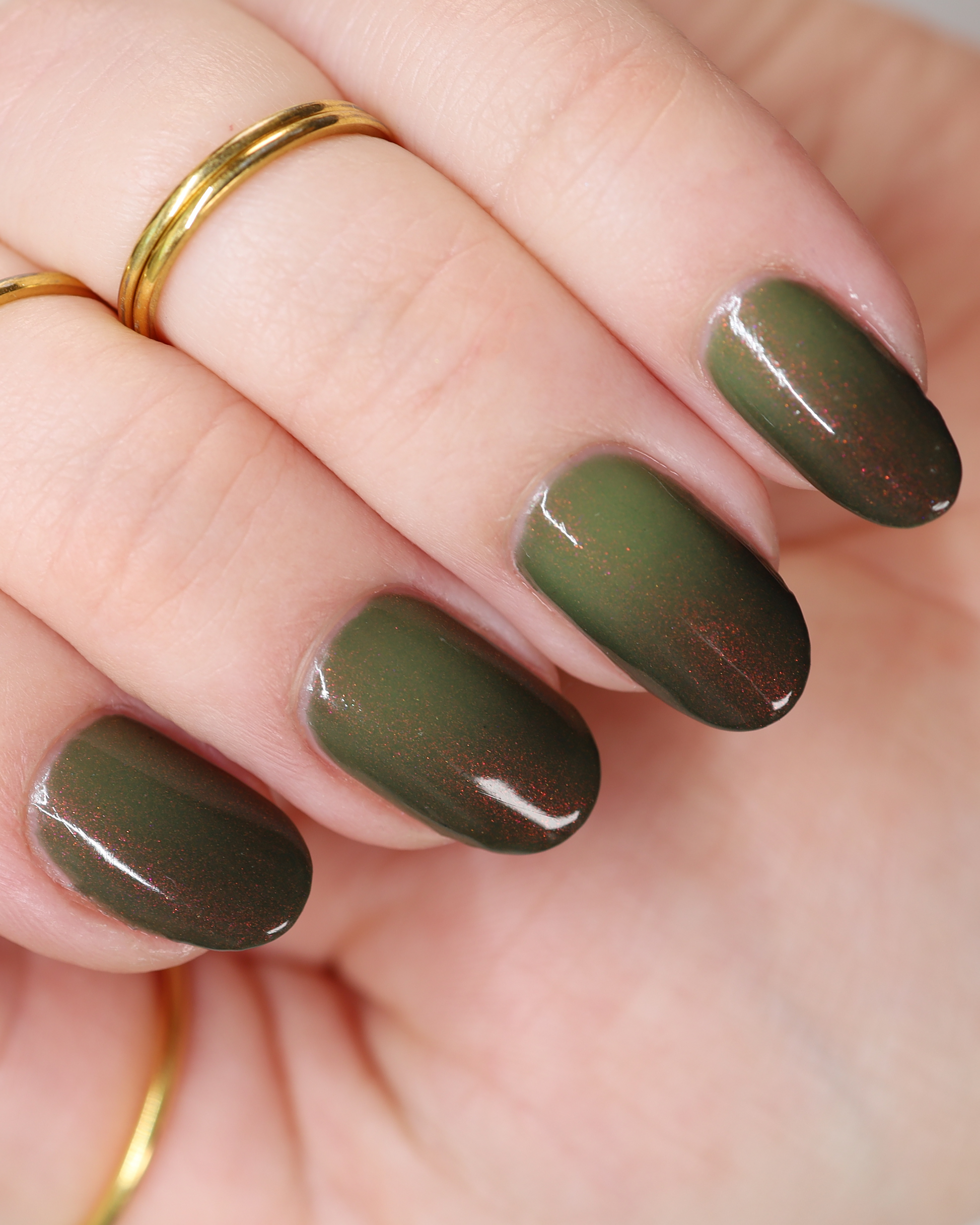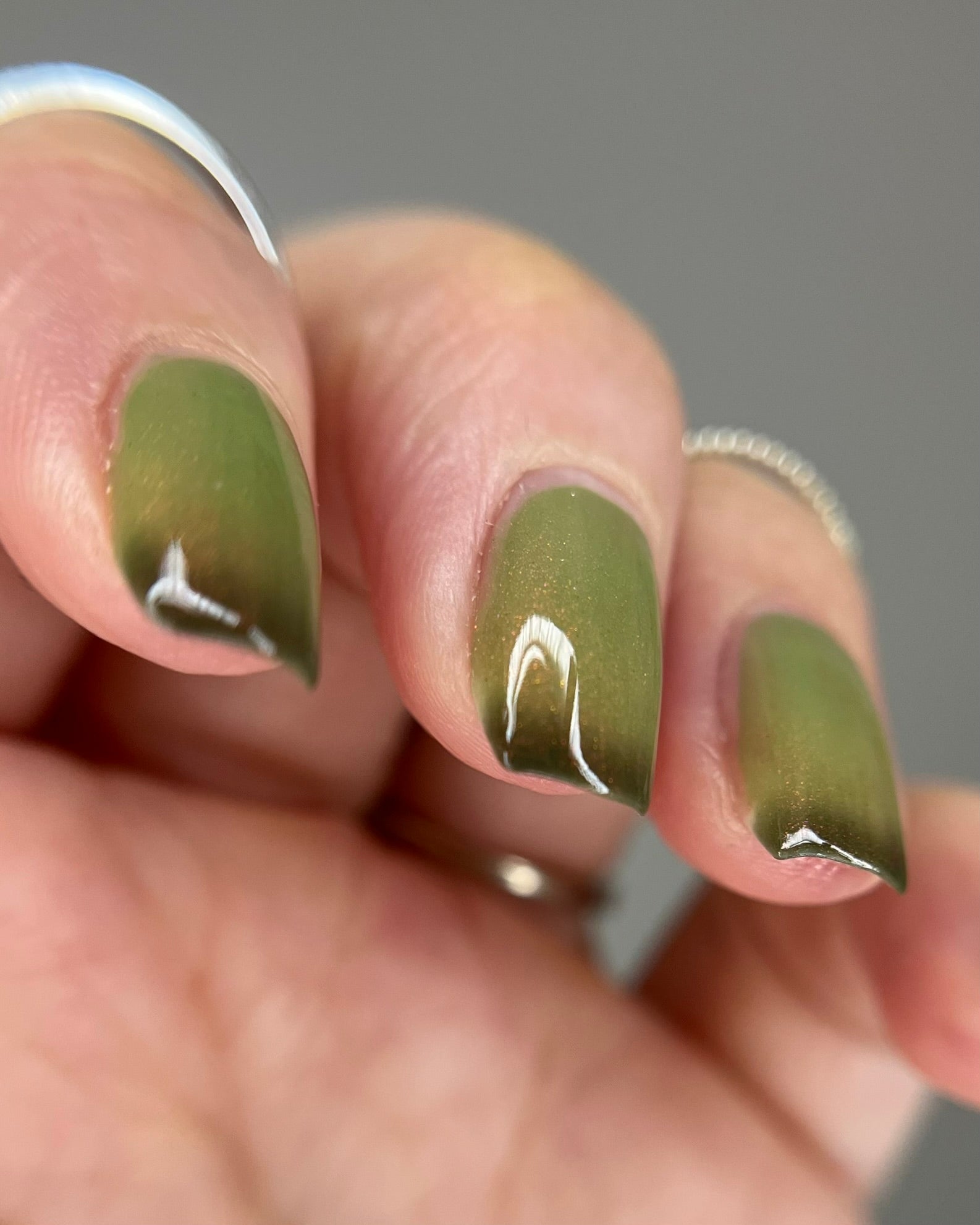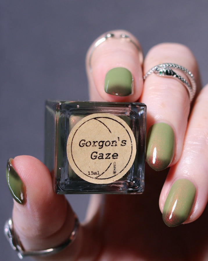 Gorgon's Gaze is a thermal polish that goes from a dark, gray-green (cold) to muted ivy green (warm) with a small particle red to yellow shimmer.