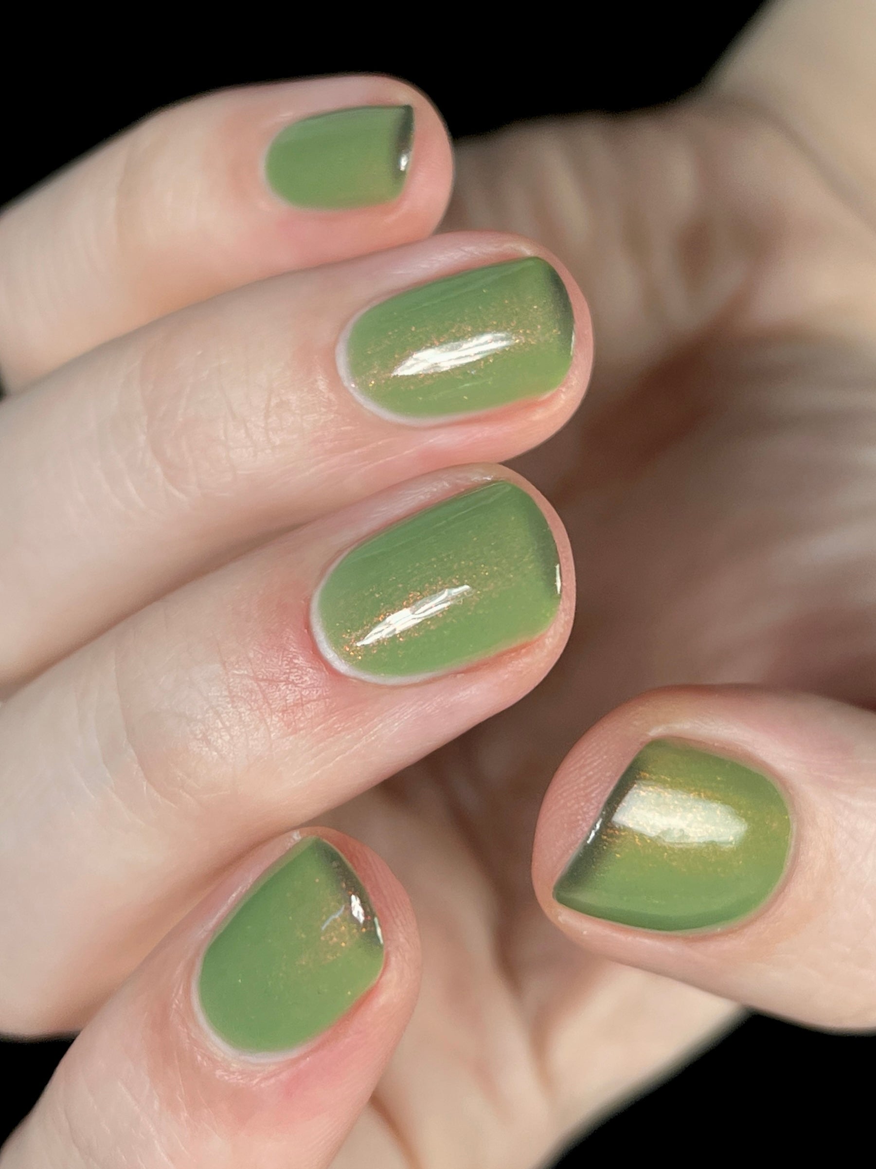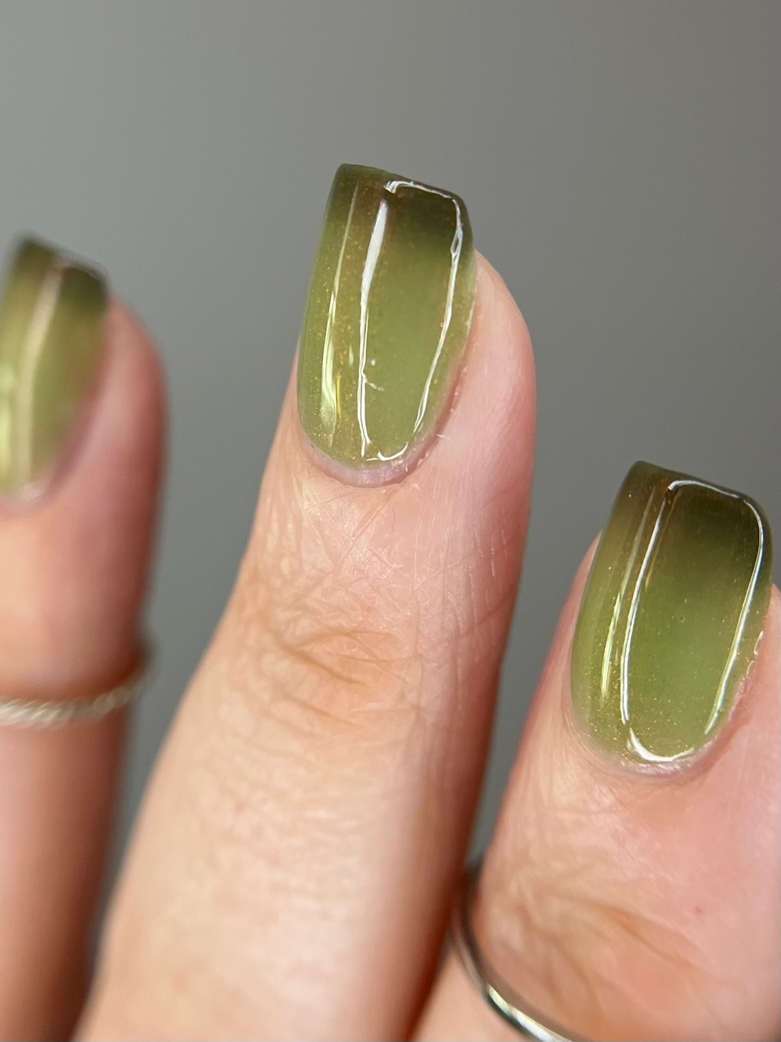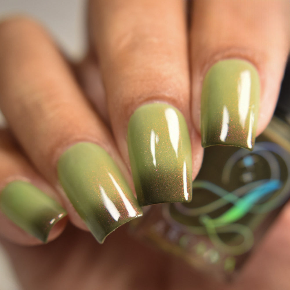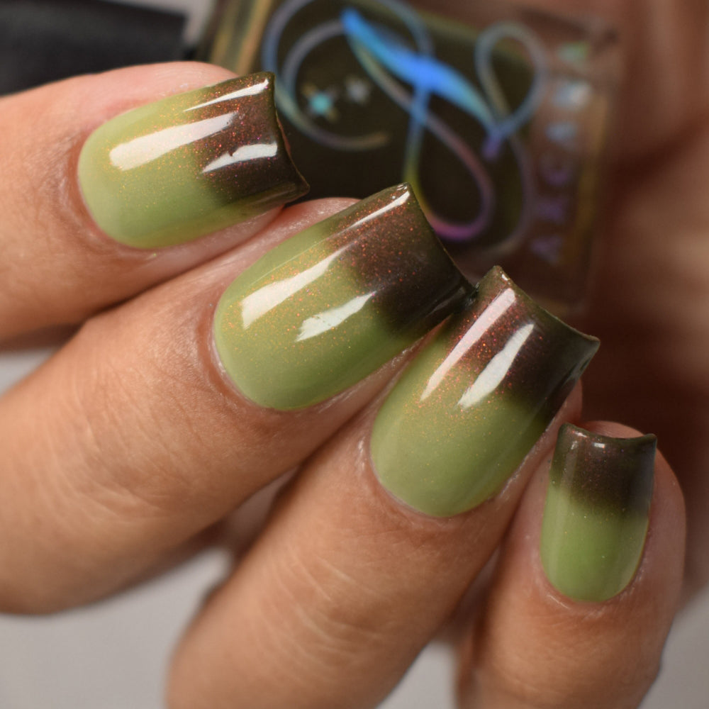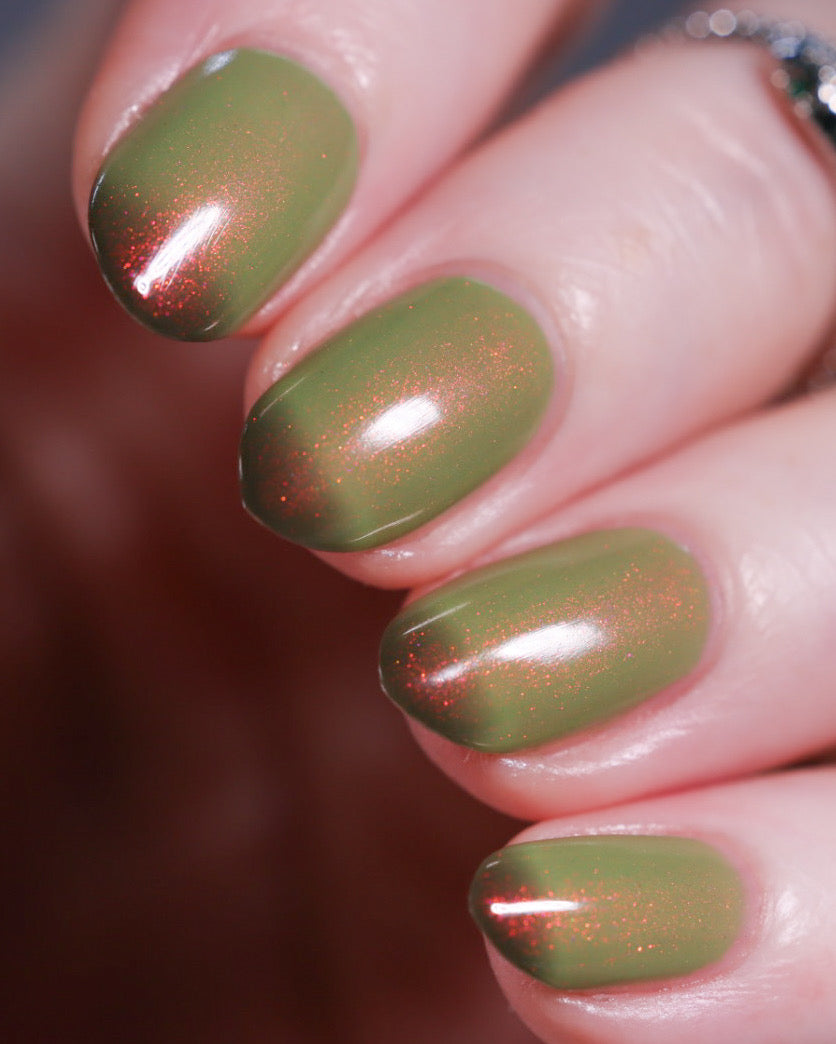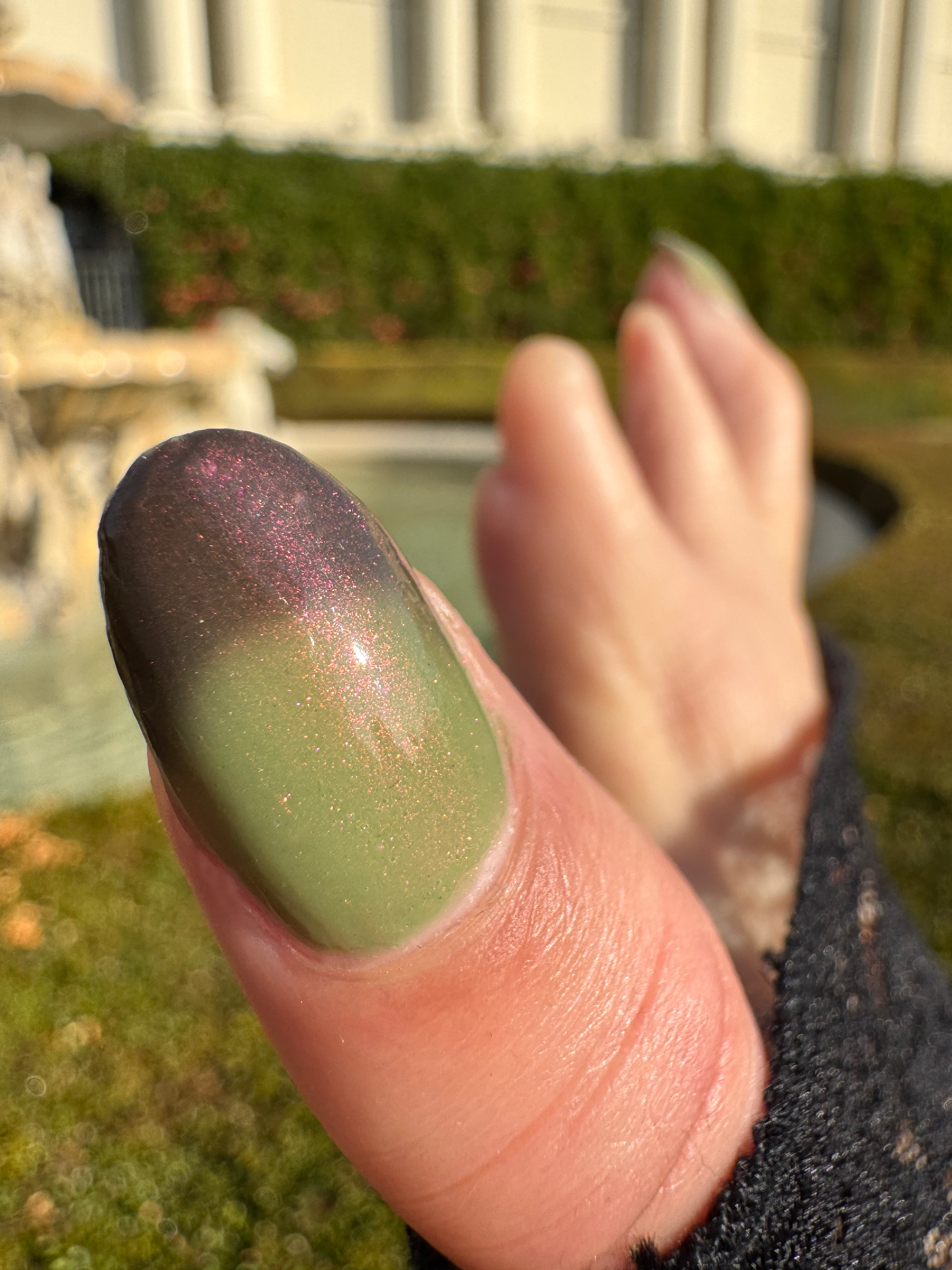 Gorgon's Gaze is a thermal polish that goes from a dark, gray-green (cold) to muted ivy green (warm) with a small particle red to yellow shimmer.