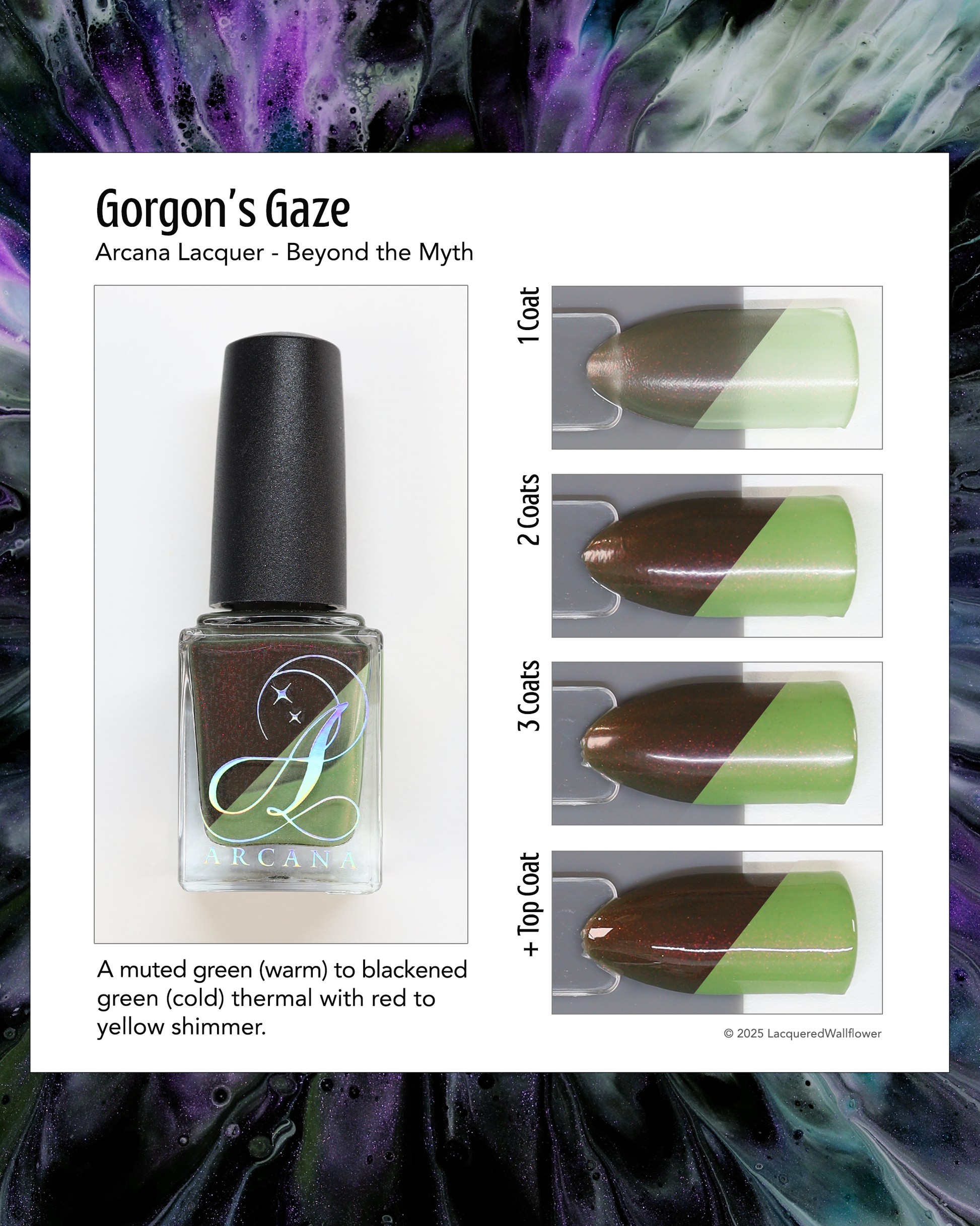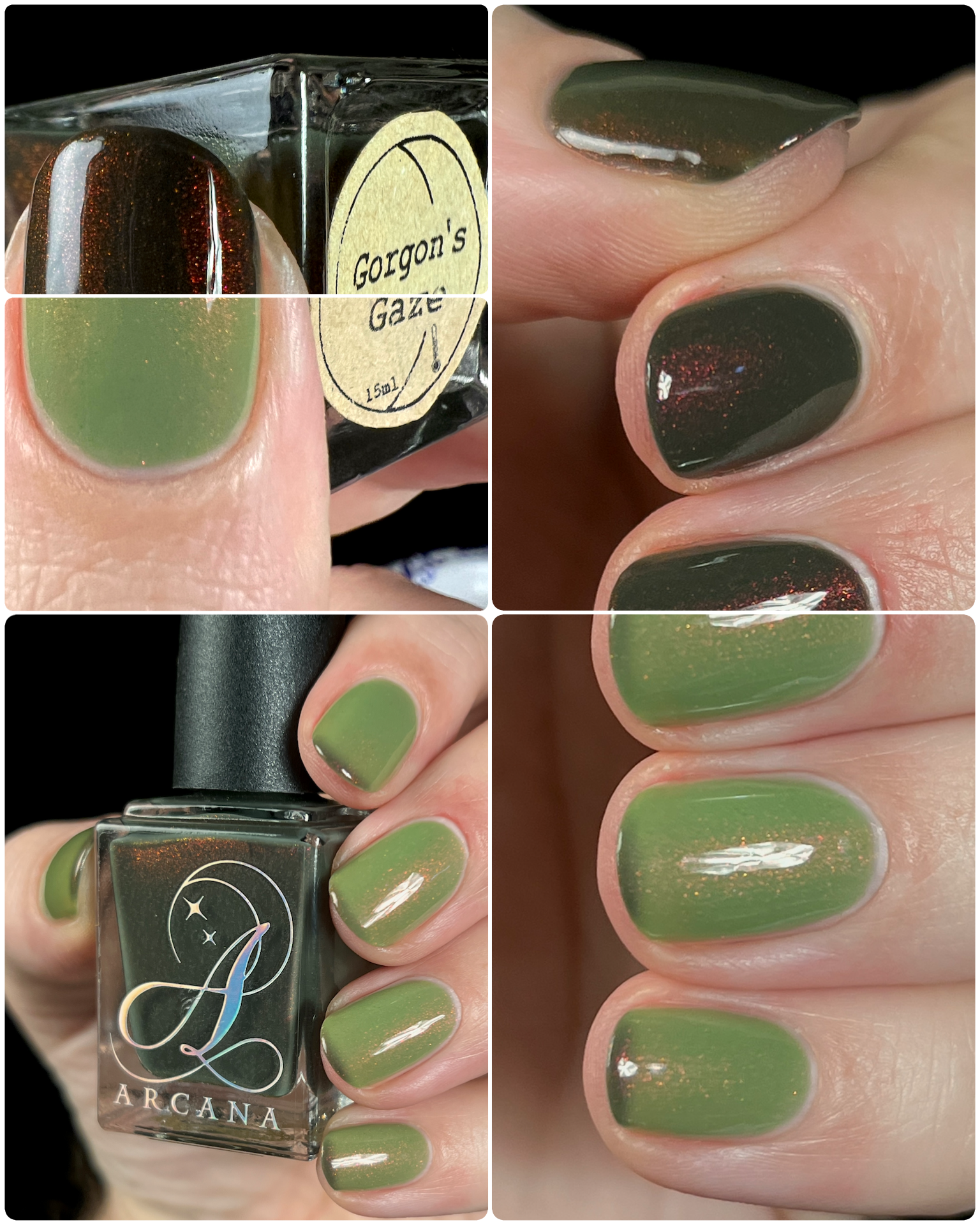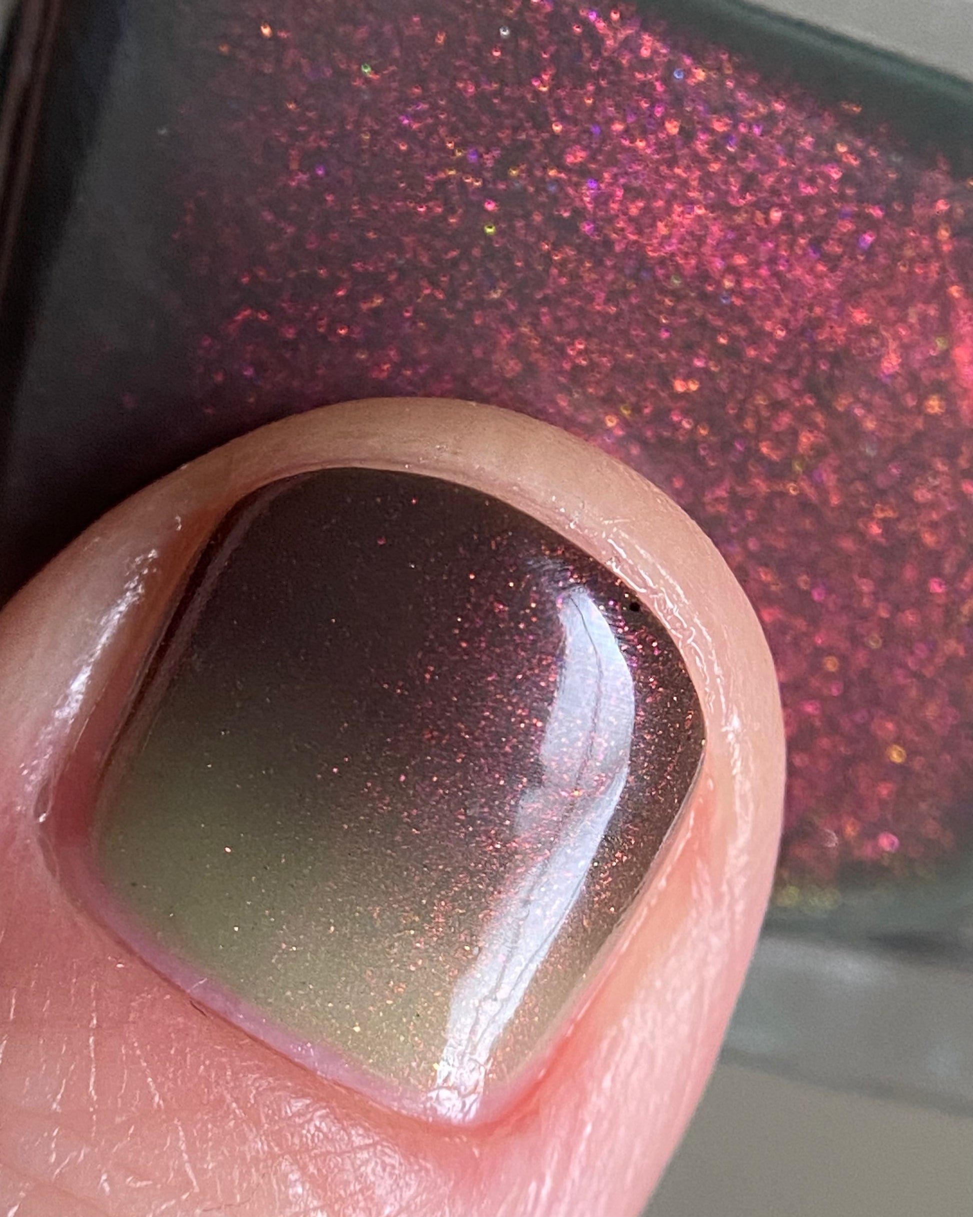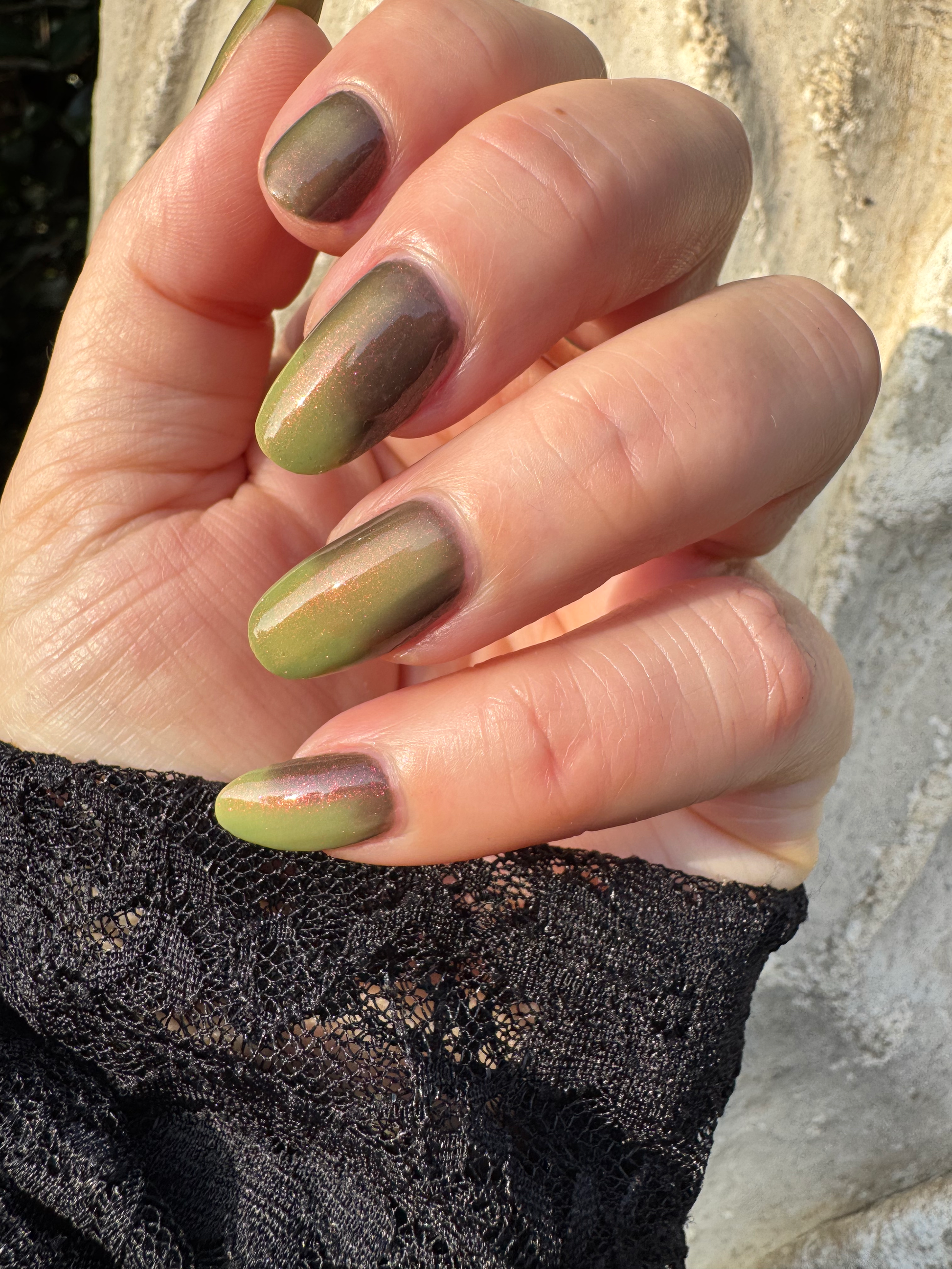 Gorgon's Gaze is a thermal polish that goes from a dark, gray-green (cold) to muted ivy green (warm) with a small particle red to yellow shimmer.