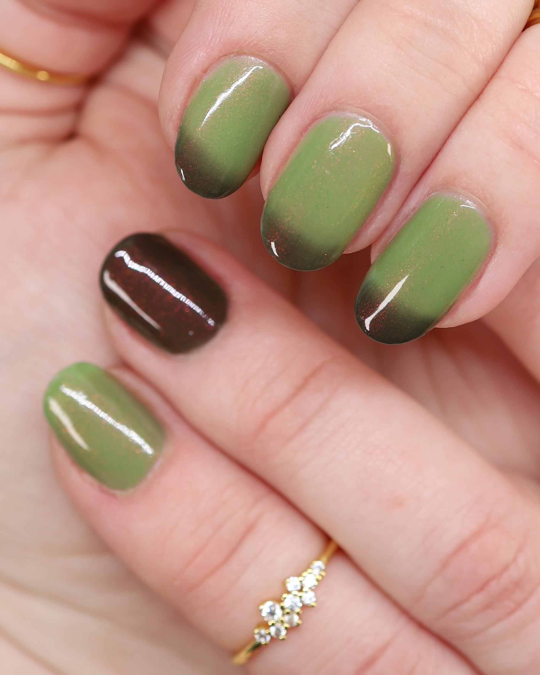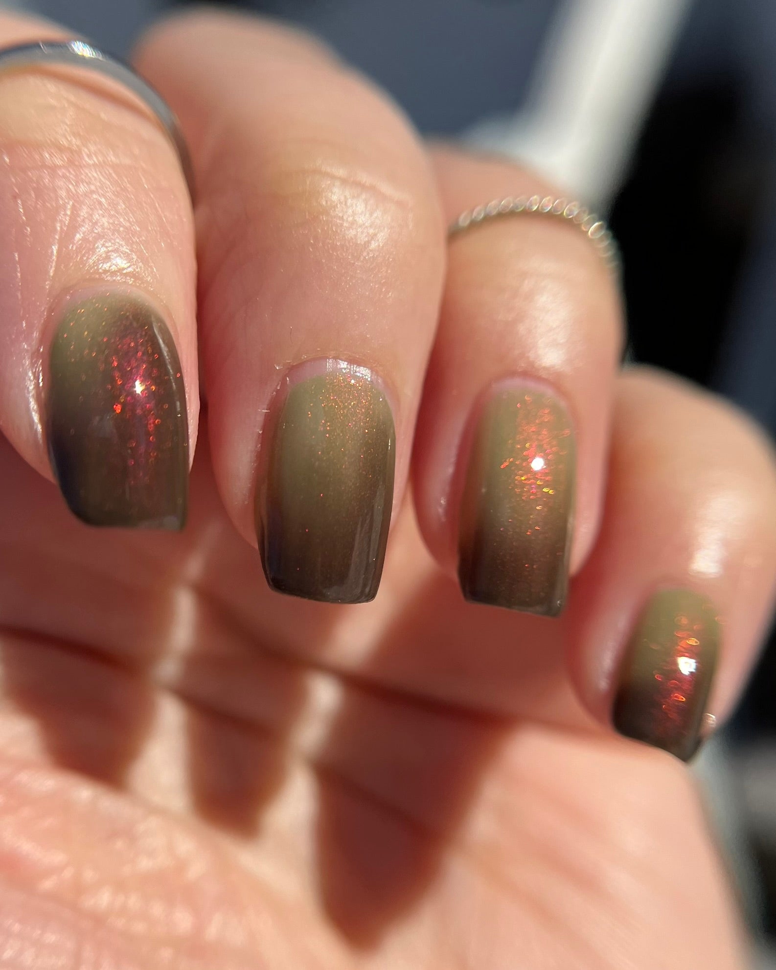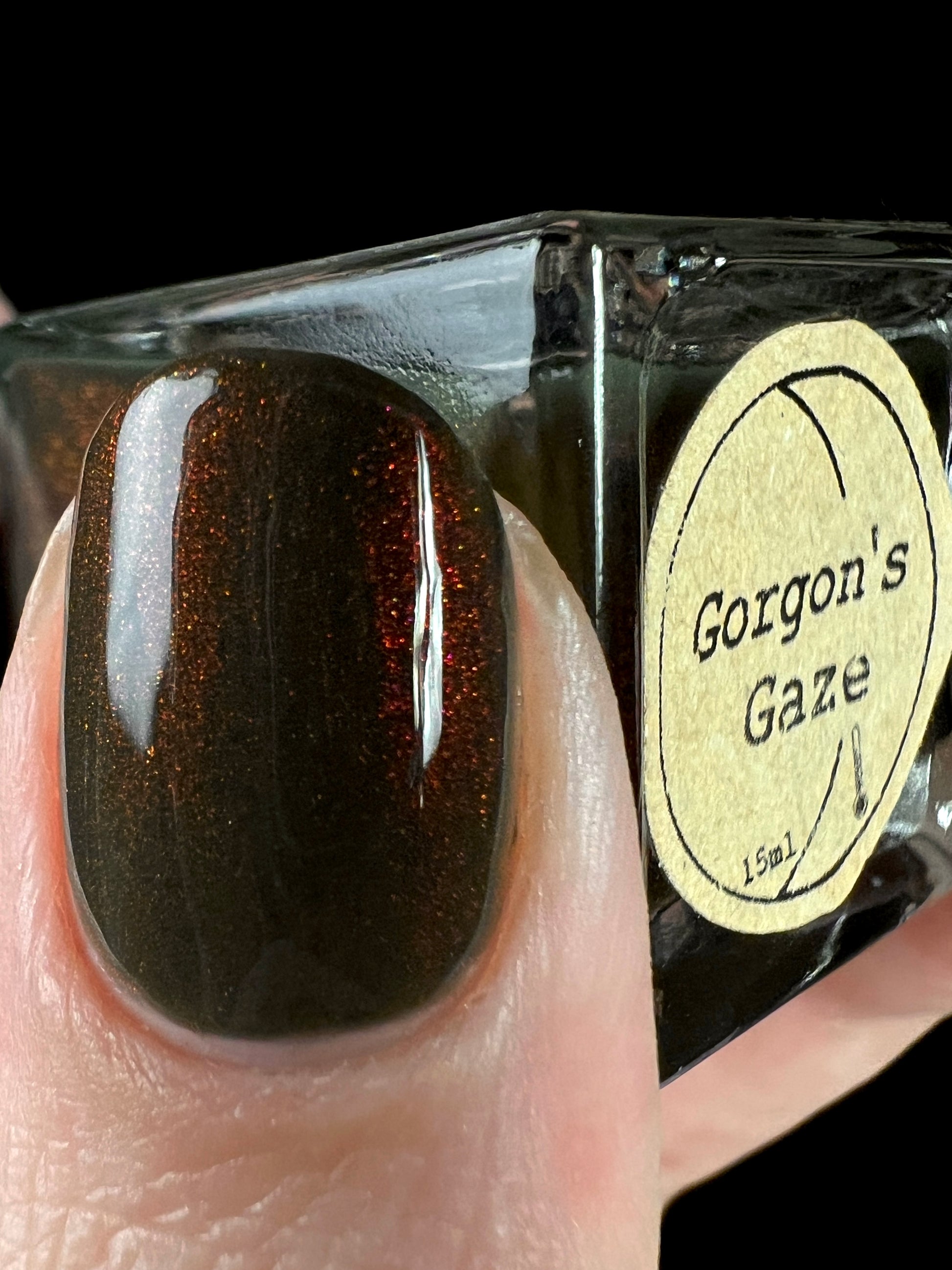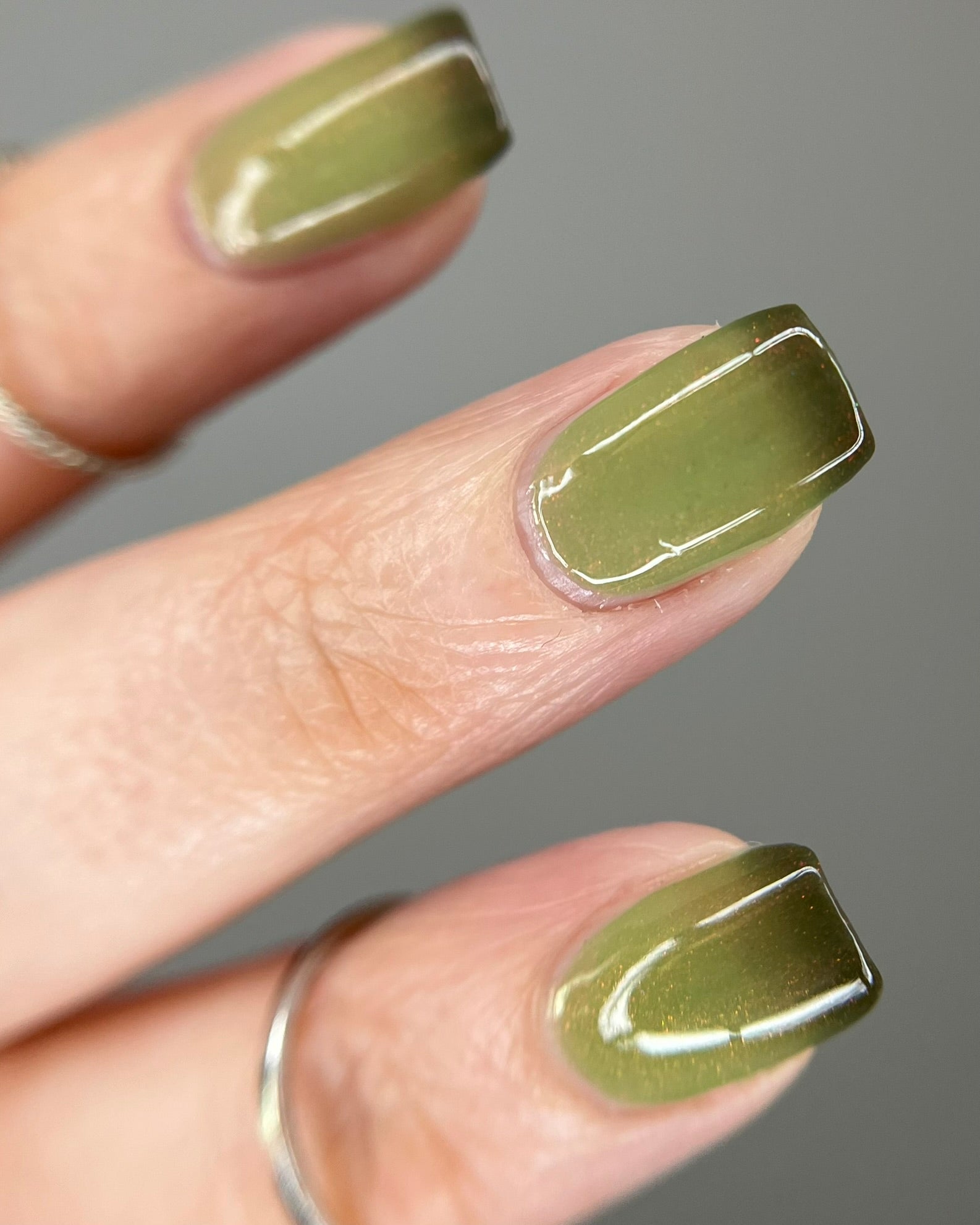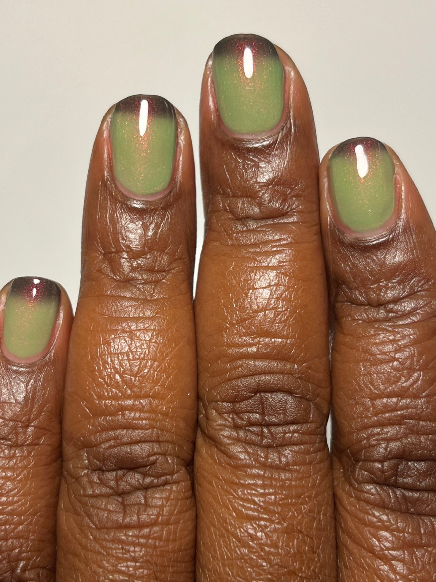 Gorgon's Gaze is a thermal polish that goes from a dark, gray-green (cold) to muted ivy green (warm) with a small particle red to yellow shimmer.