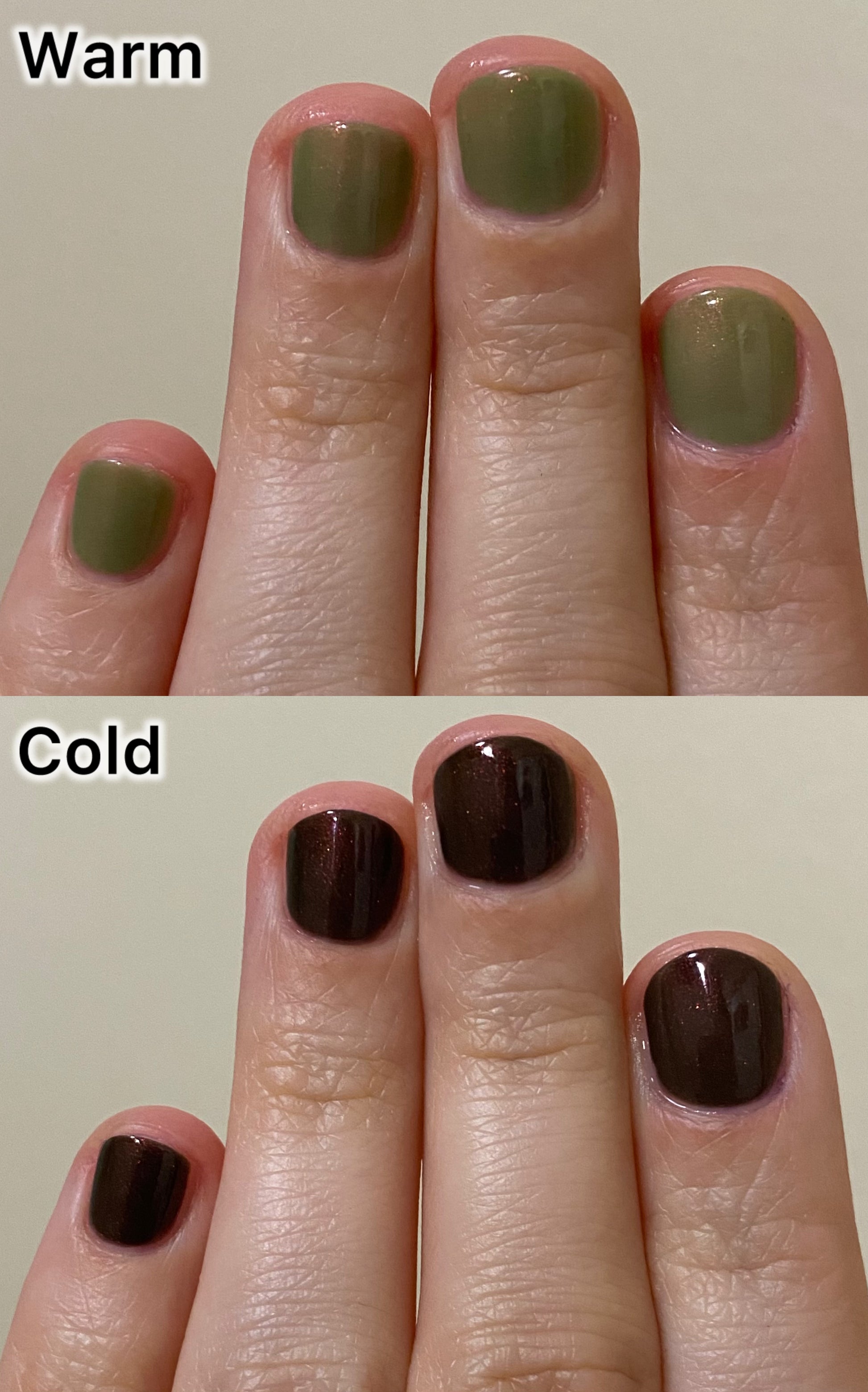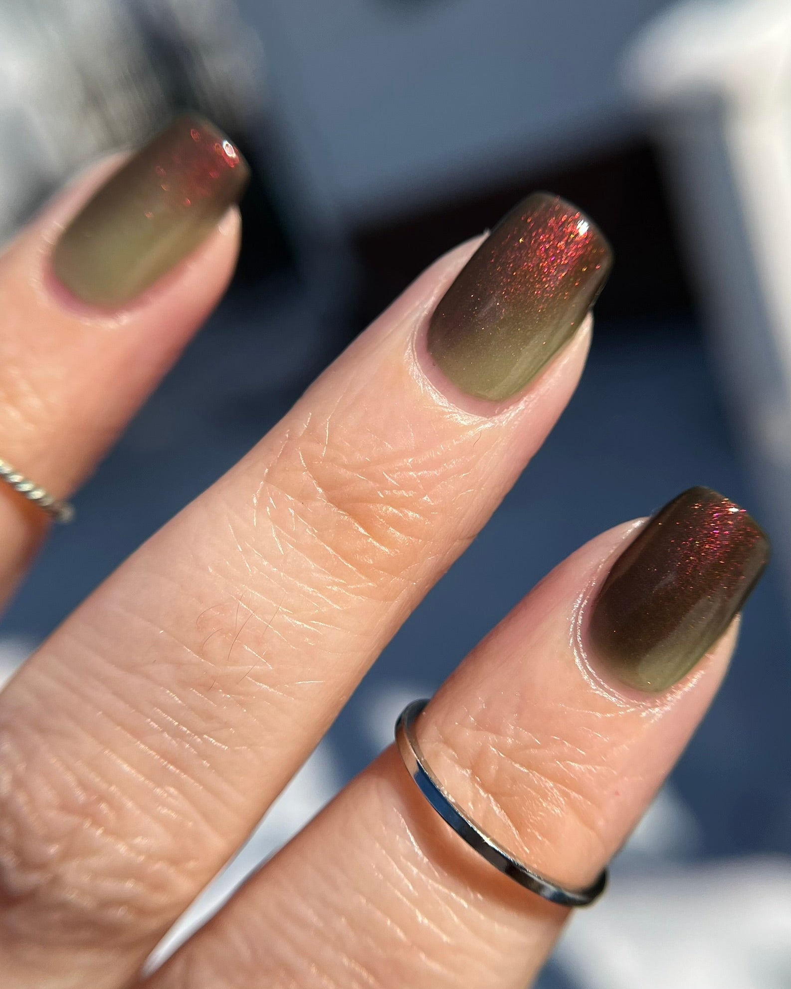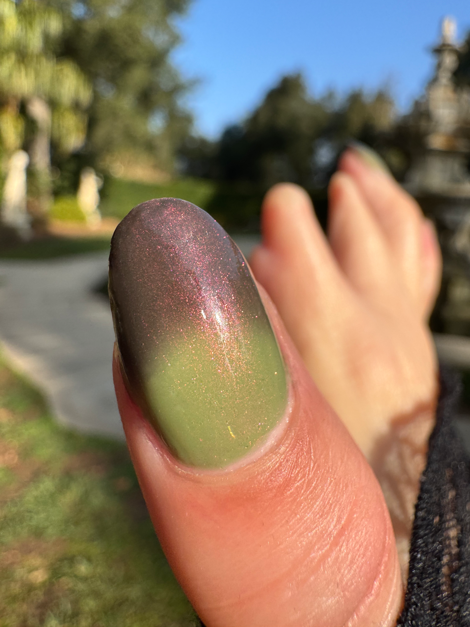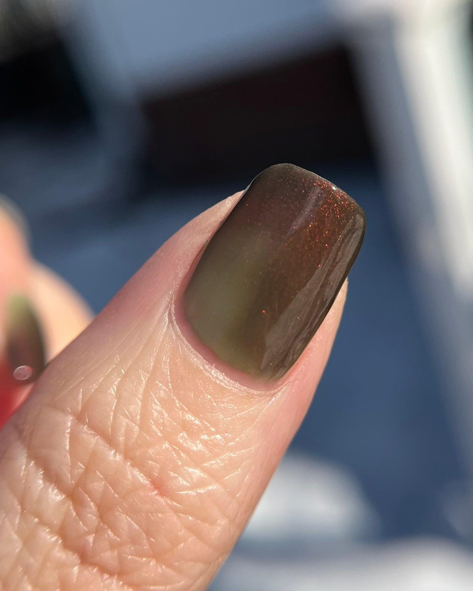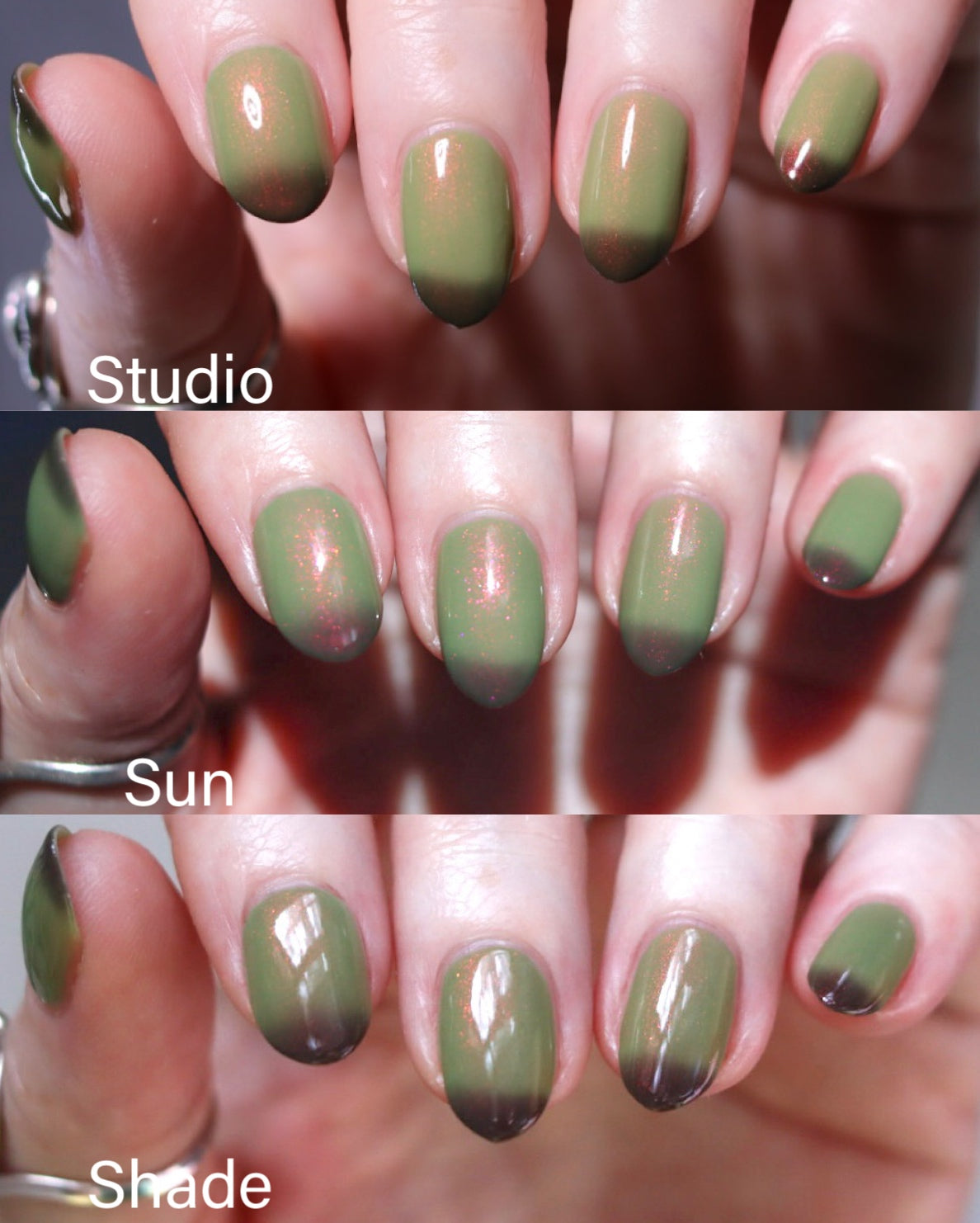 Gorgon's Gaze is a thermal polish that goes from a dark, gray-green (cold) to muted ivy green (warm) with a small particle red to yellow shimmer.