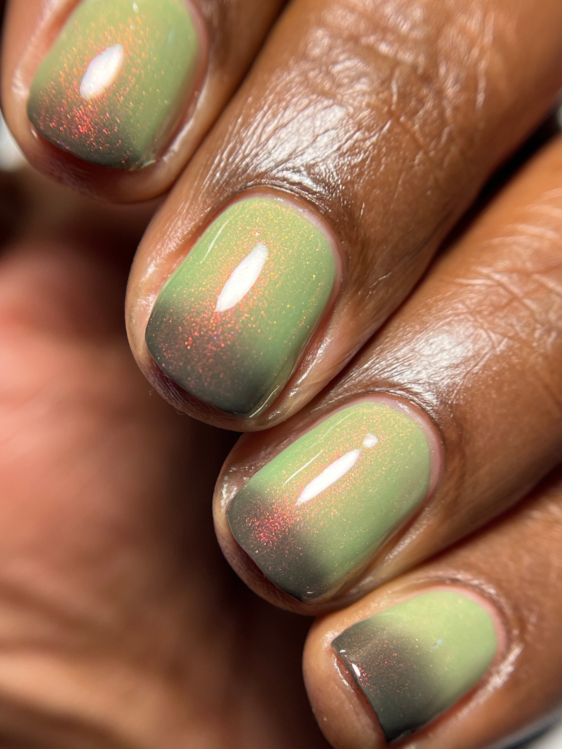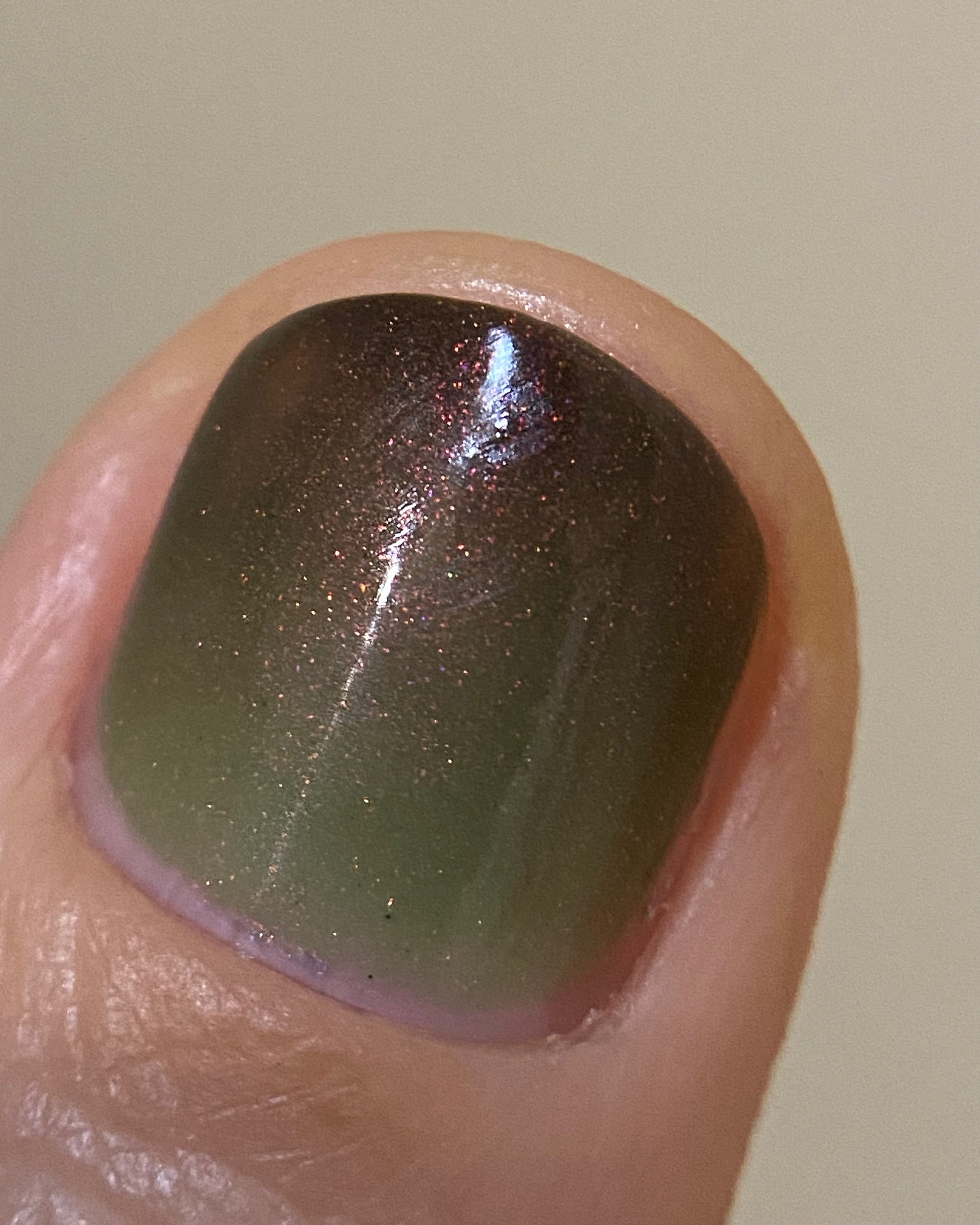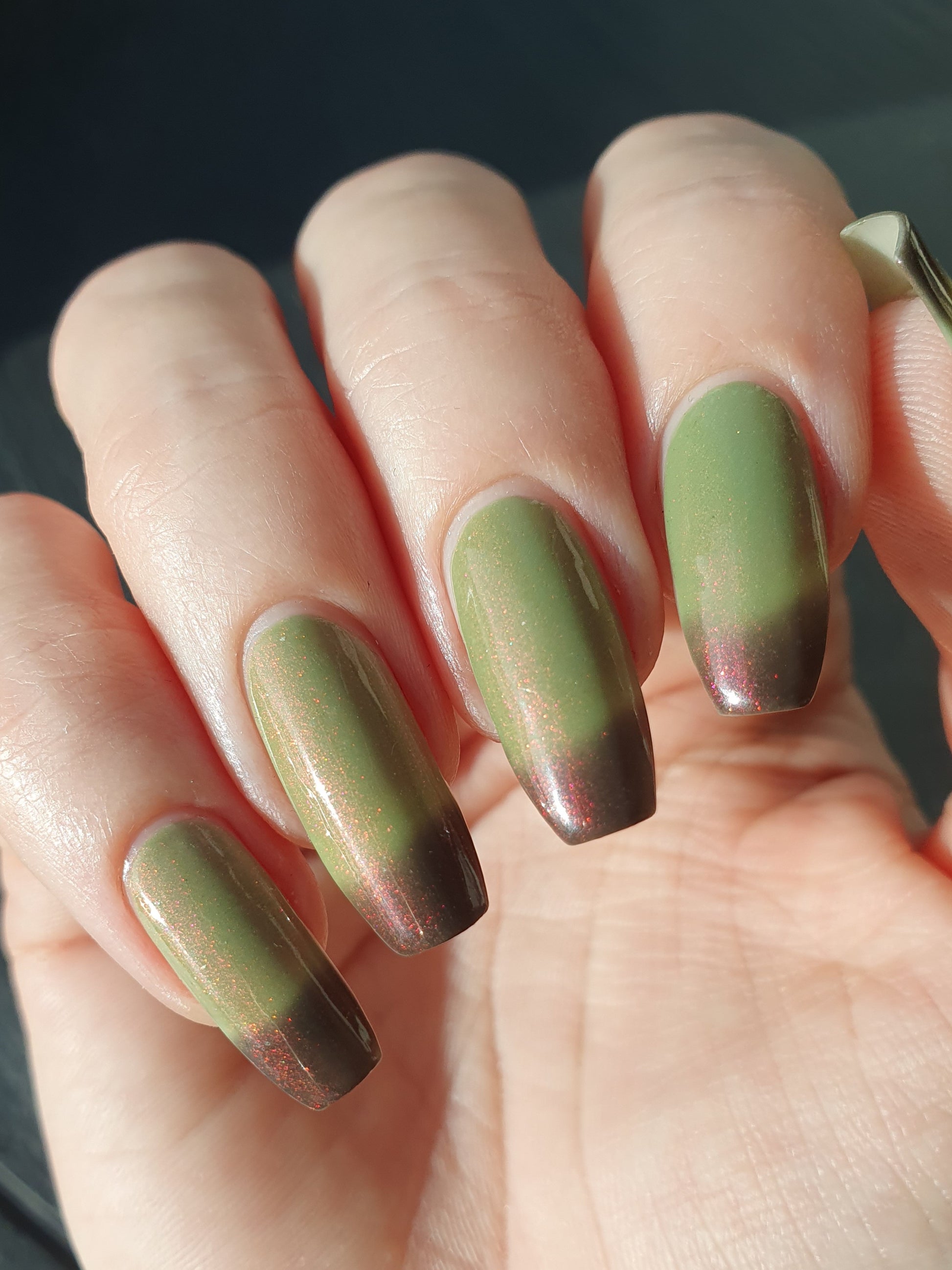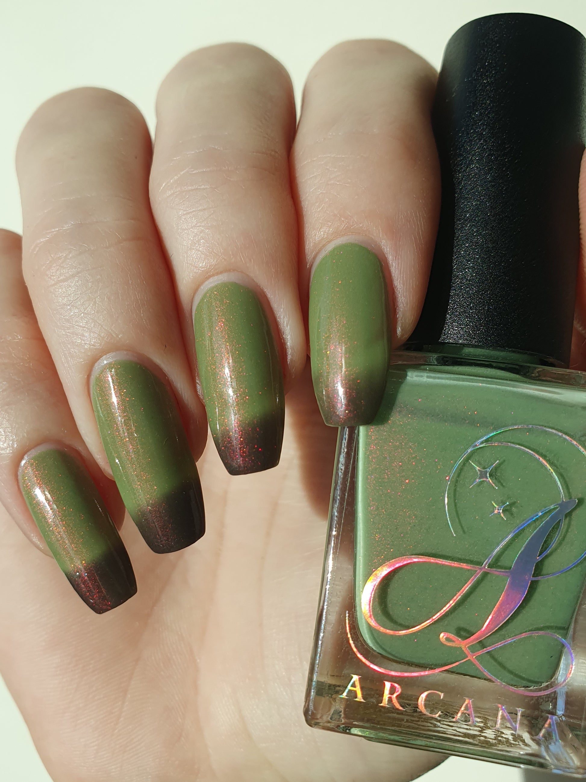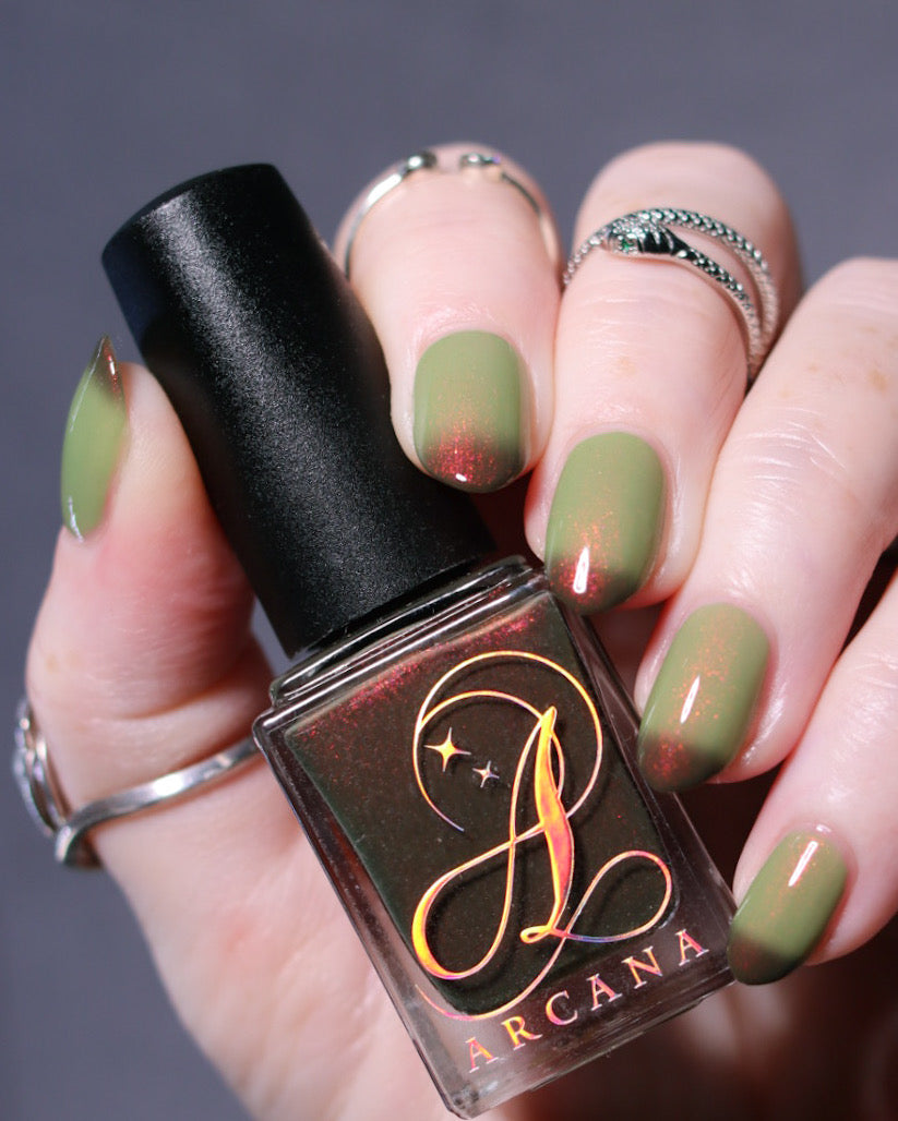 Gorgon's Gaze is a thermal polish that goes from a dark, gray-green (cold) to muted ivy green (warm) with a small particle red to yellow shimmer.