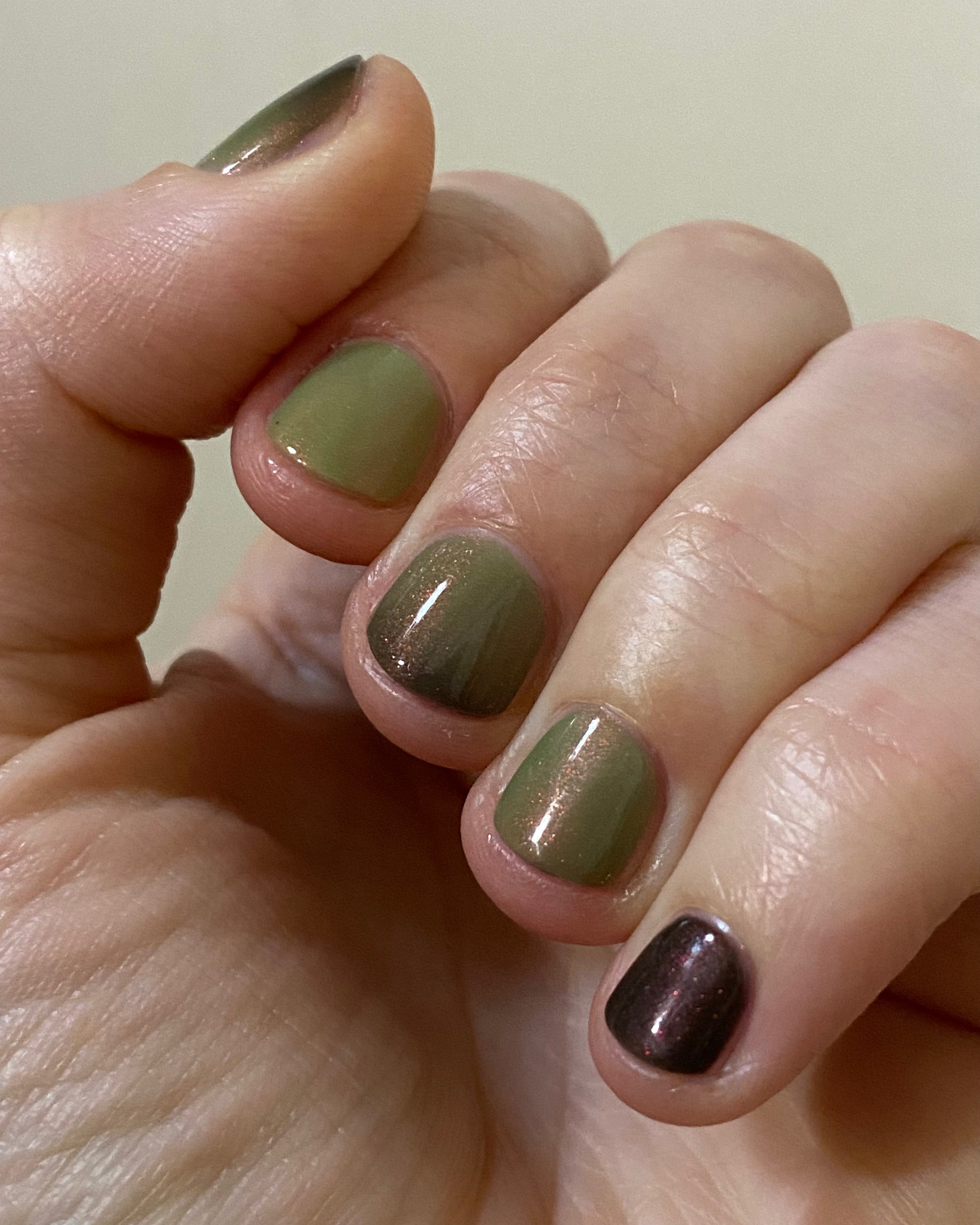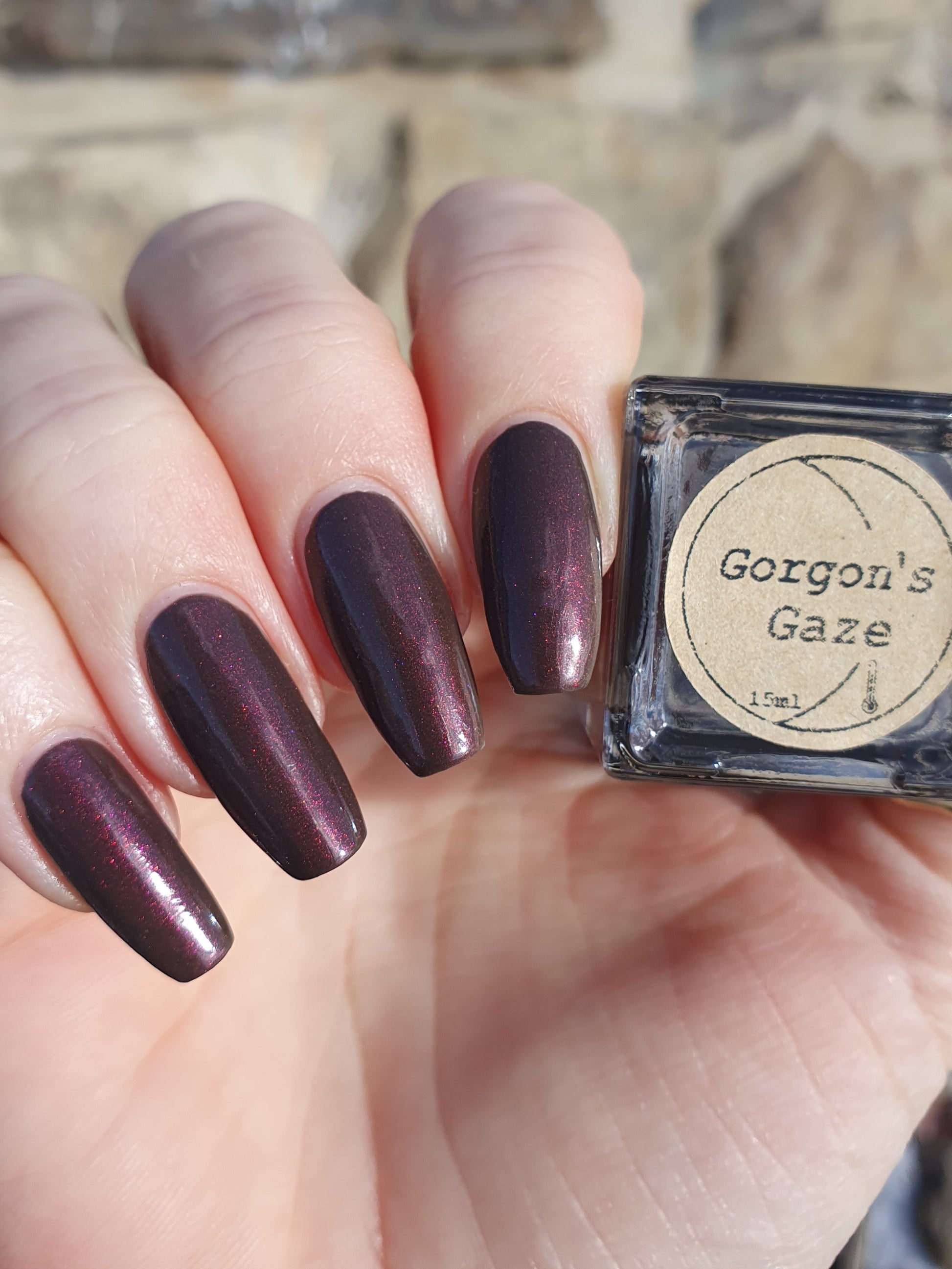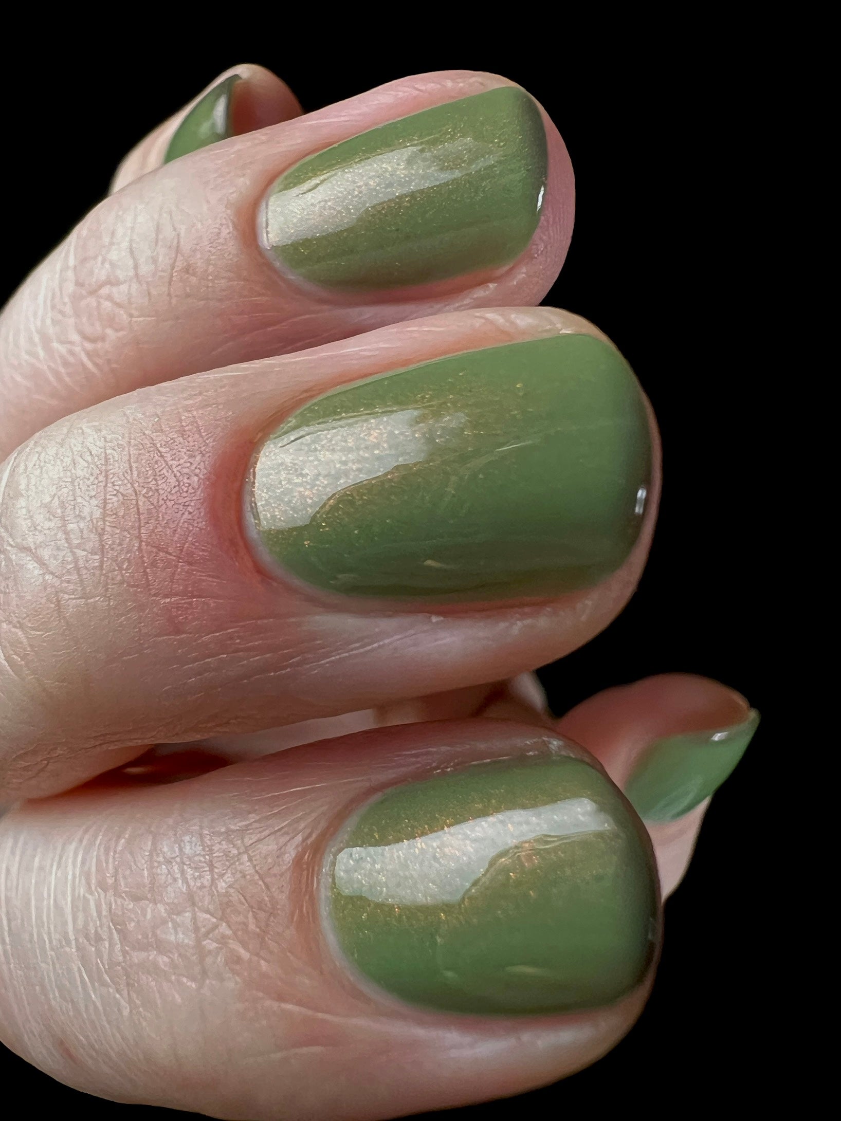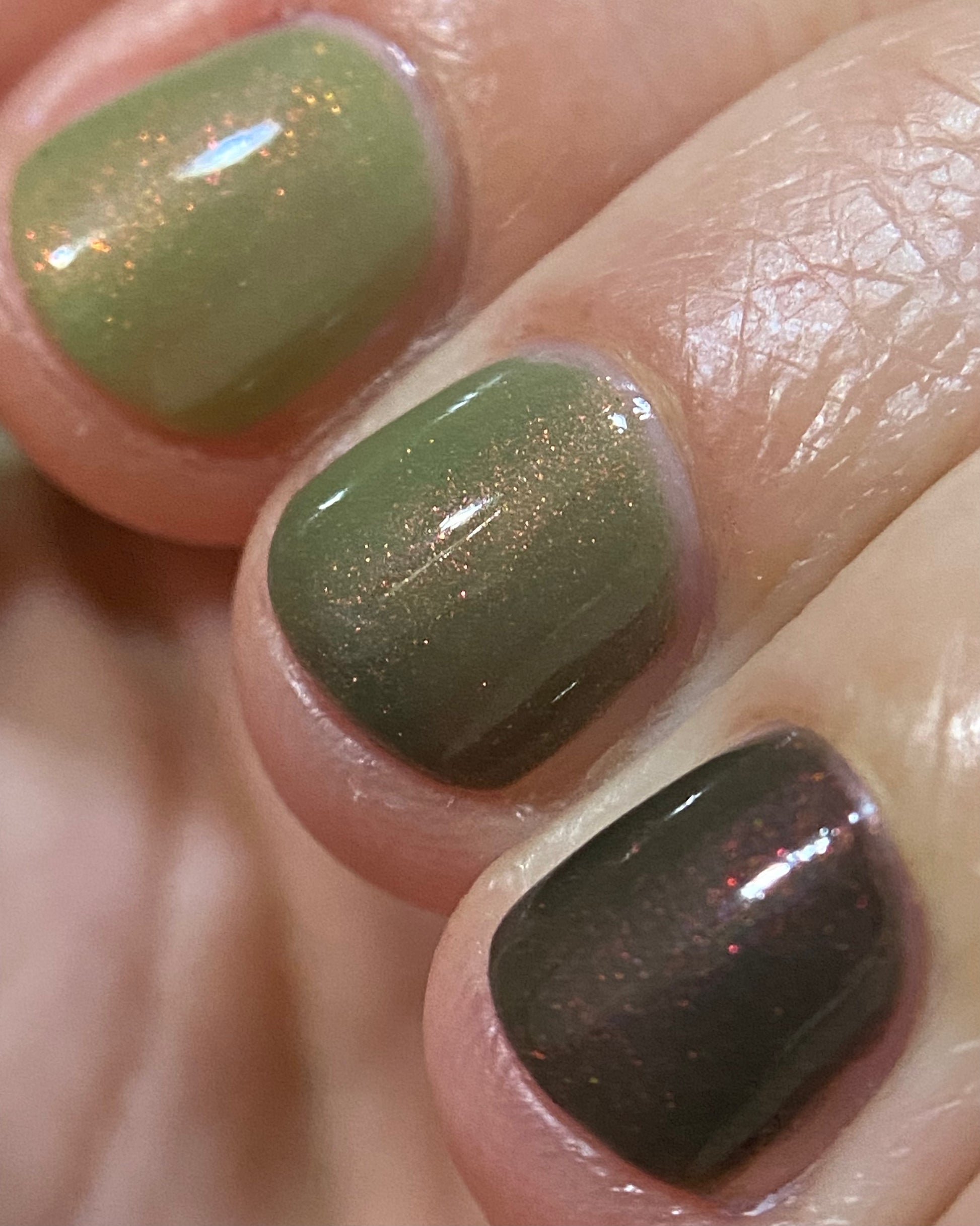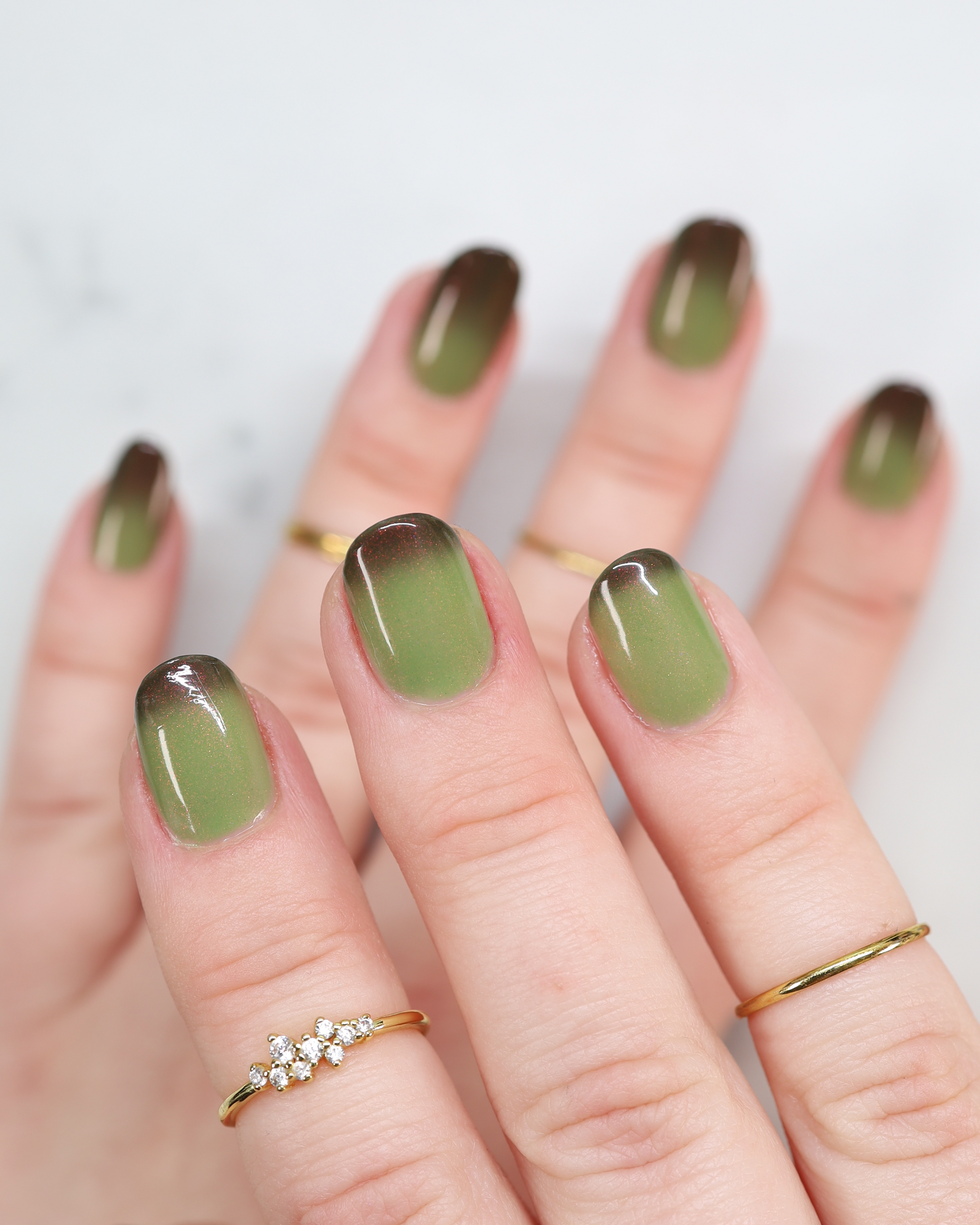 Gorgon's Gaze is a thermal polish that goes from a dark, gray-green (cold) to muted ivy green (warm) with a small particle red to yellow shimmer.