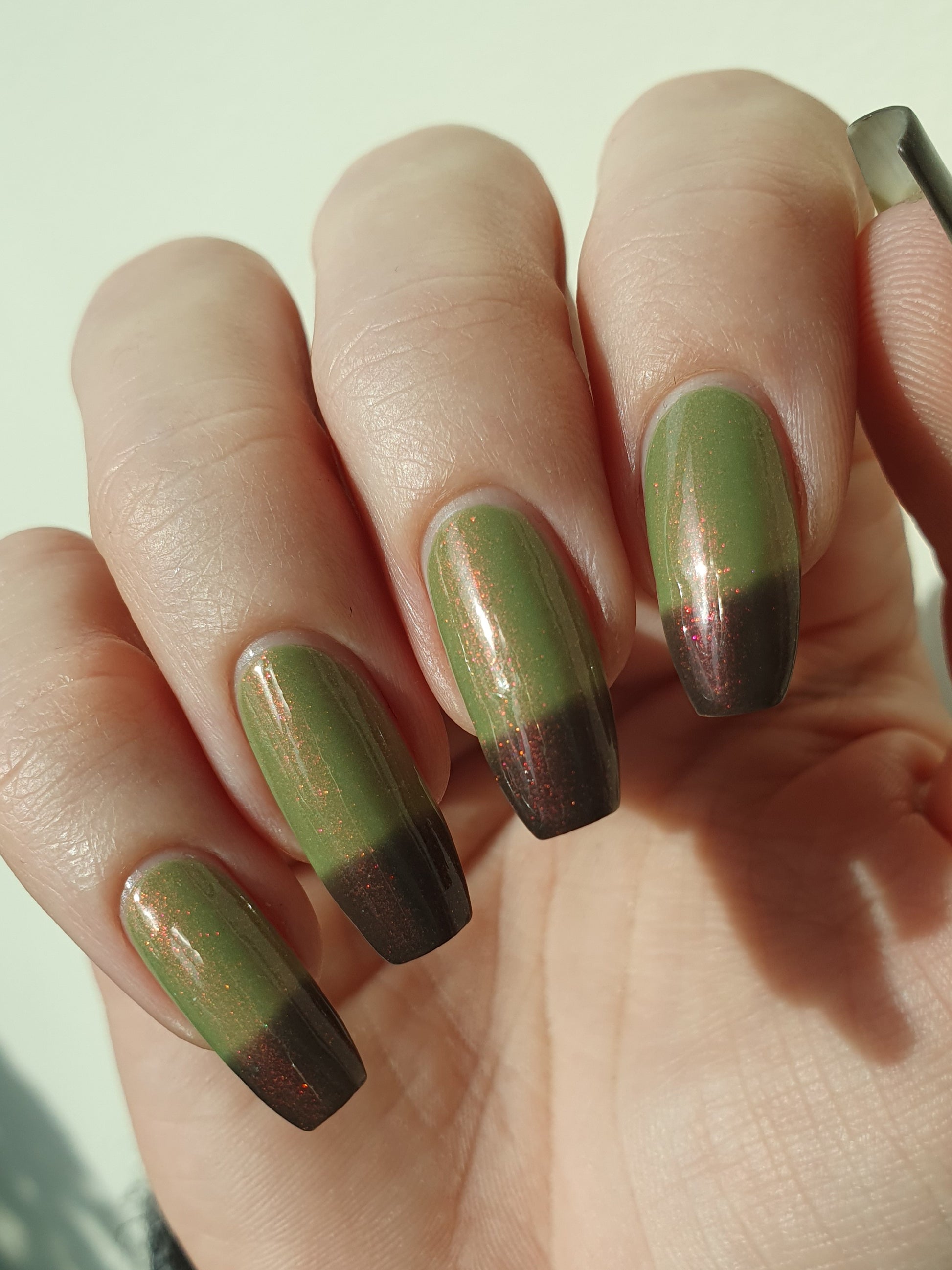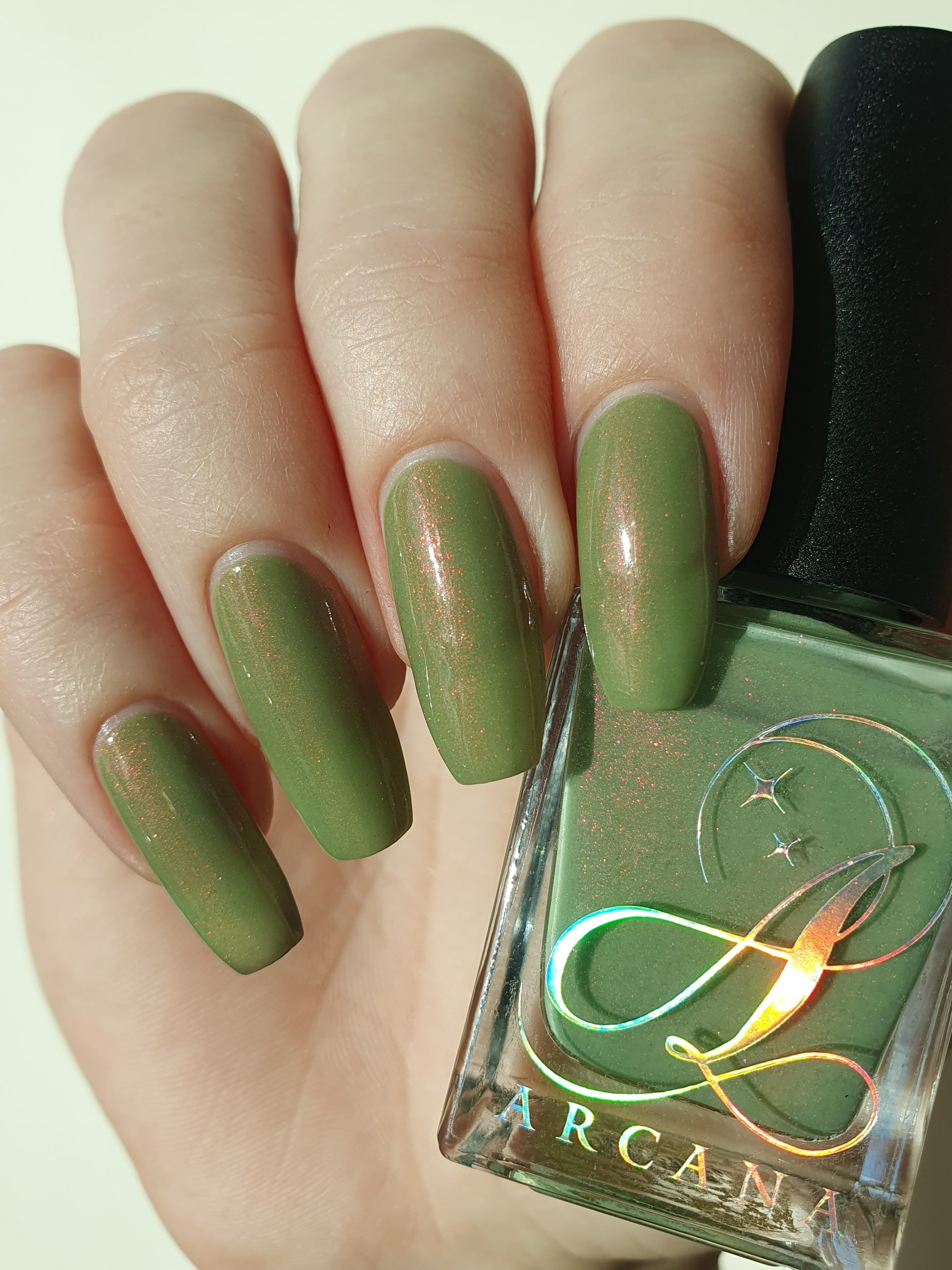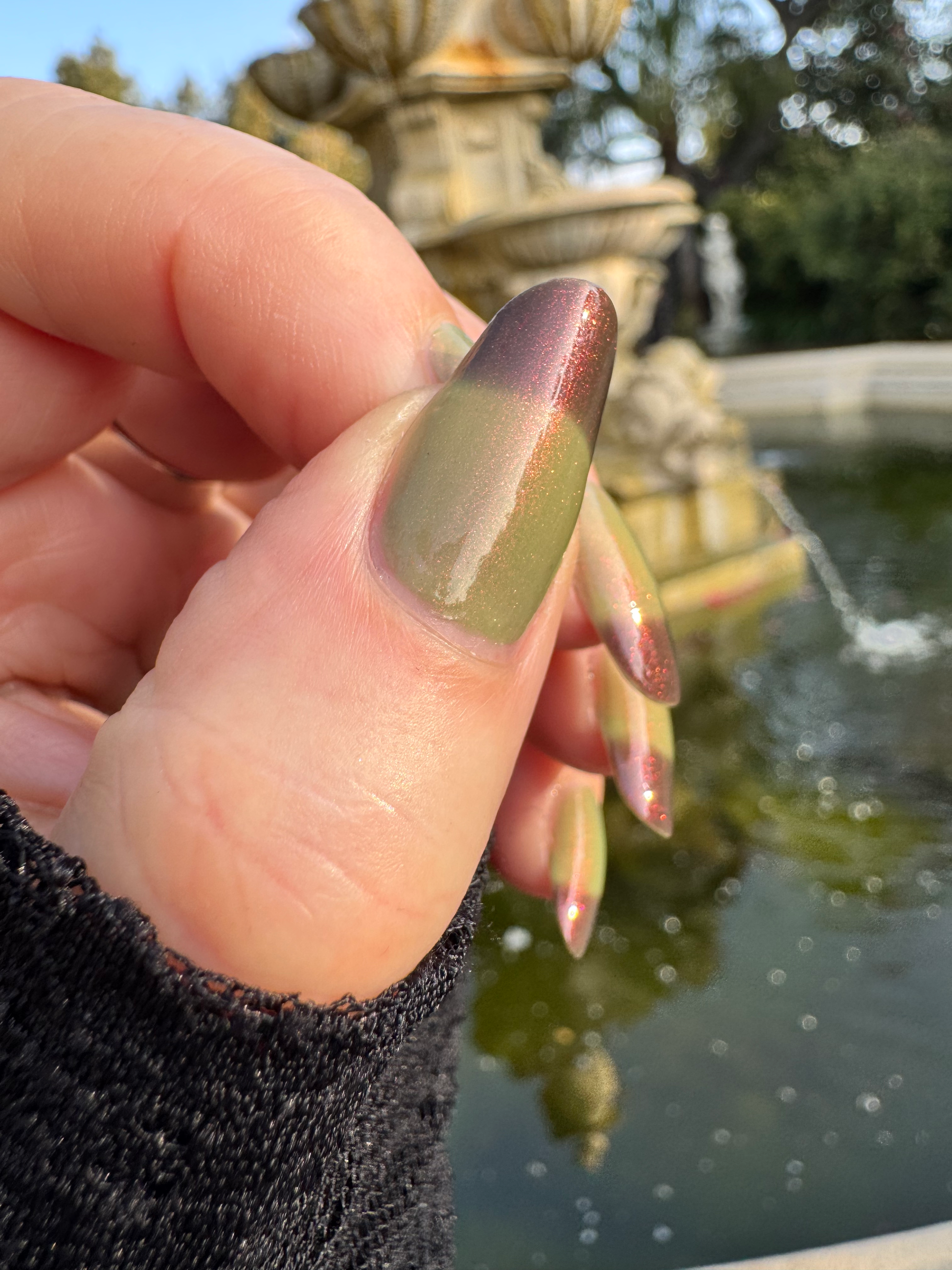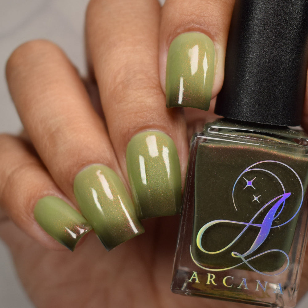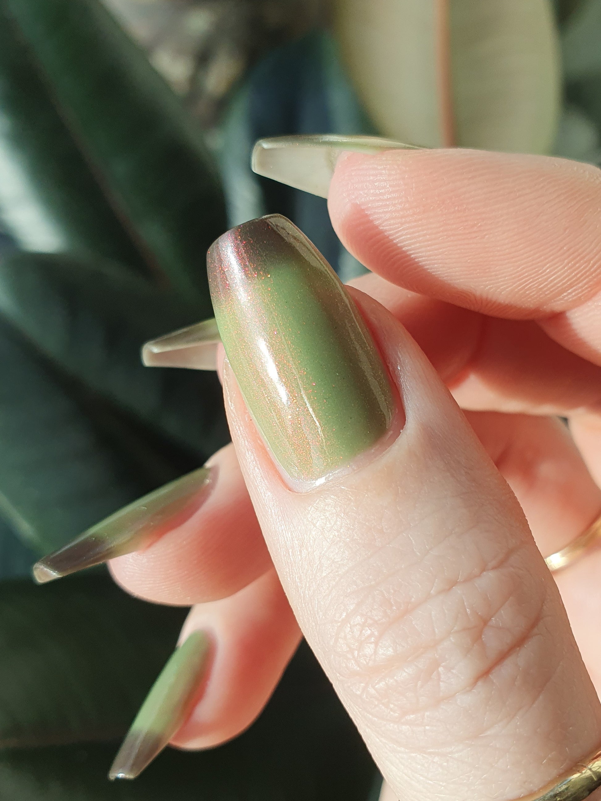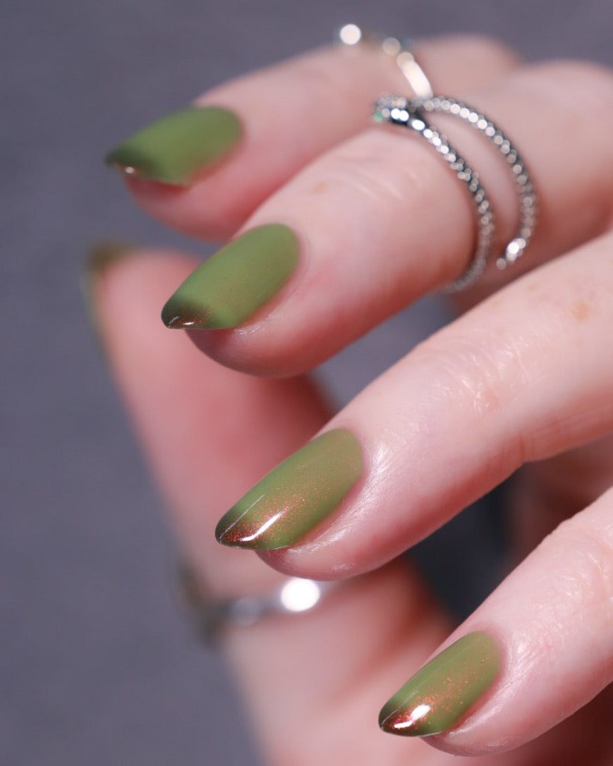 Gorgon's Gaze is a thermal polish that goes from a dark, gray-green (cold) to muted ivy green (warm) with a small particle red to yellow shimmer.