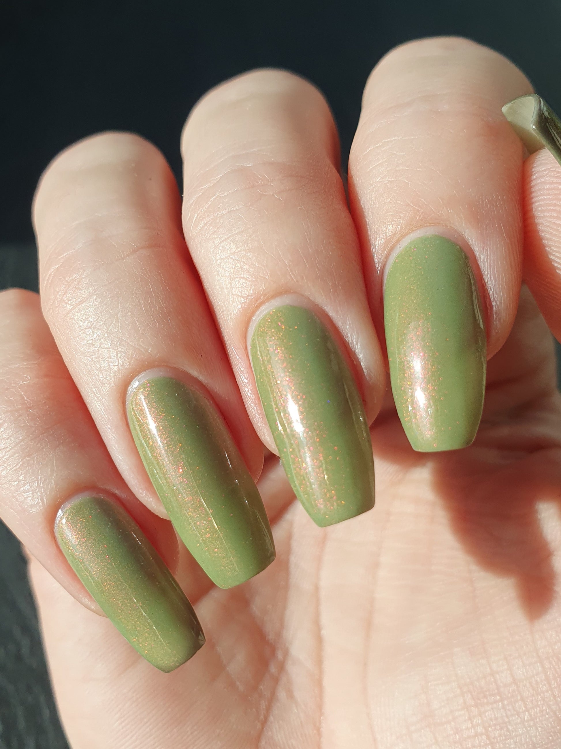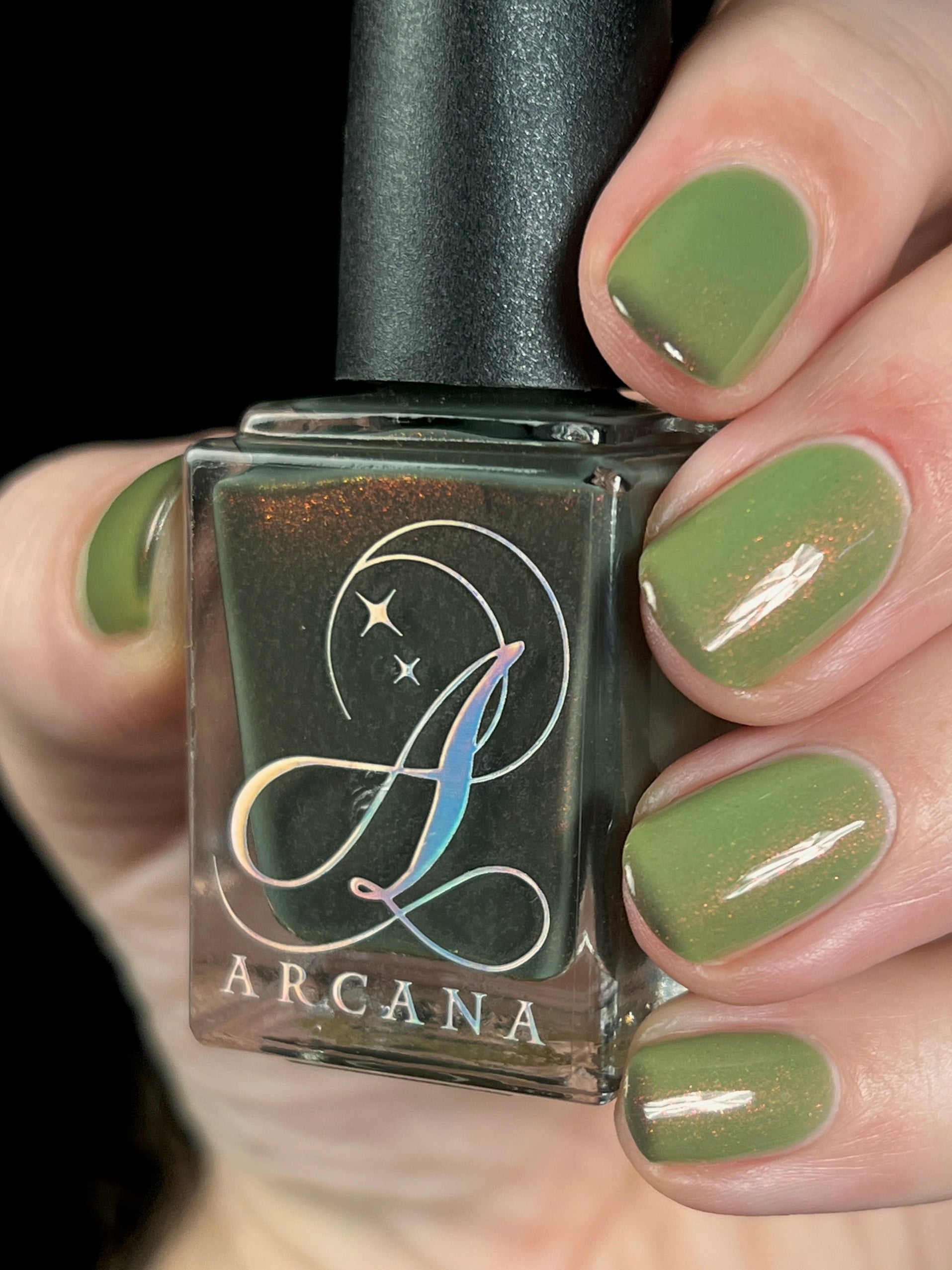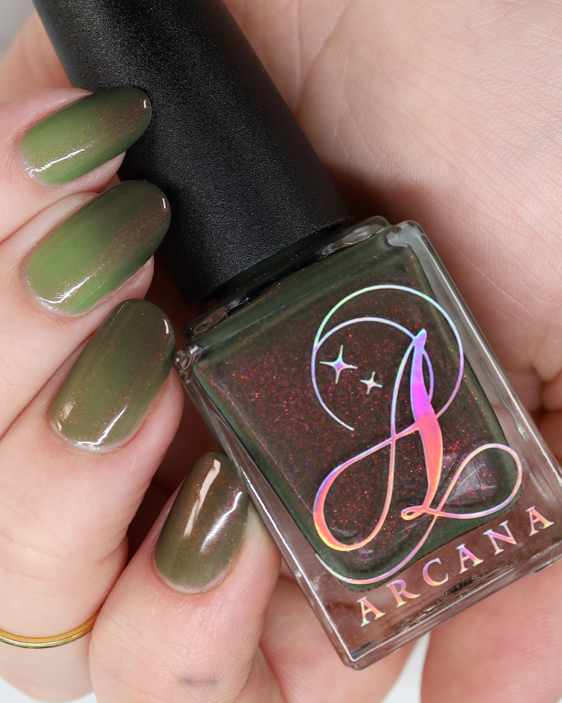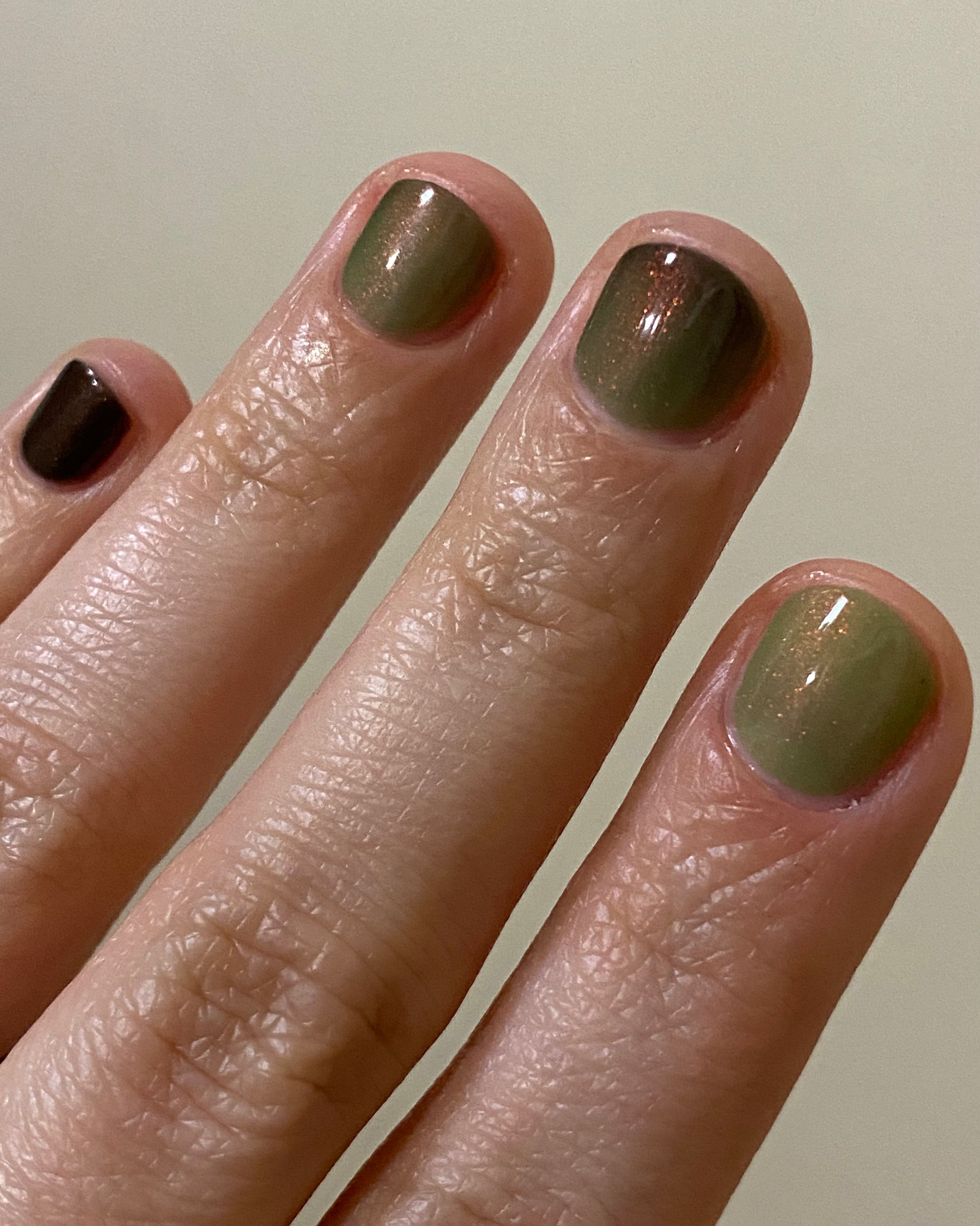 Gorgon's Gaze is a thermal polish that goes from a dark, gray-green (cold) to muted ivy green (warm) with a small particle red to yellow shimmer.