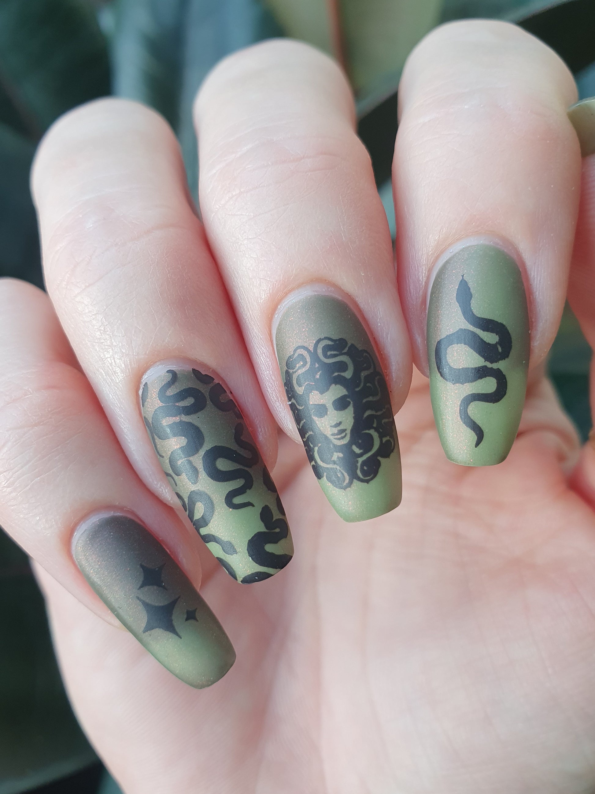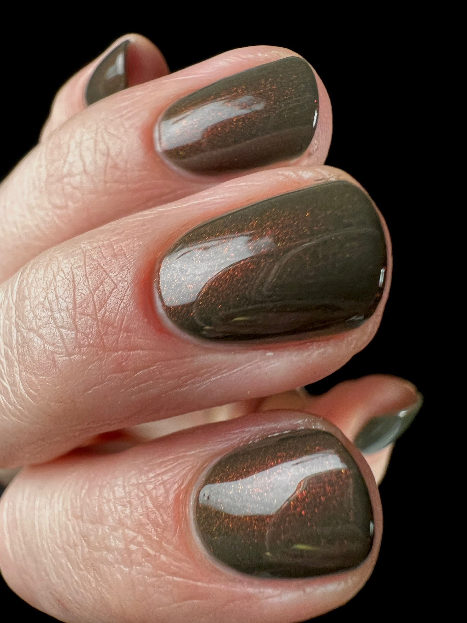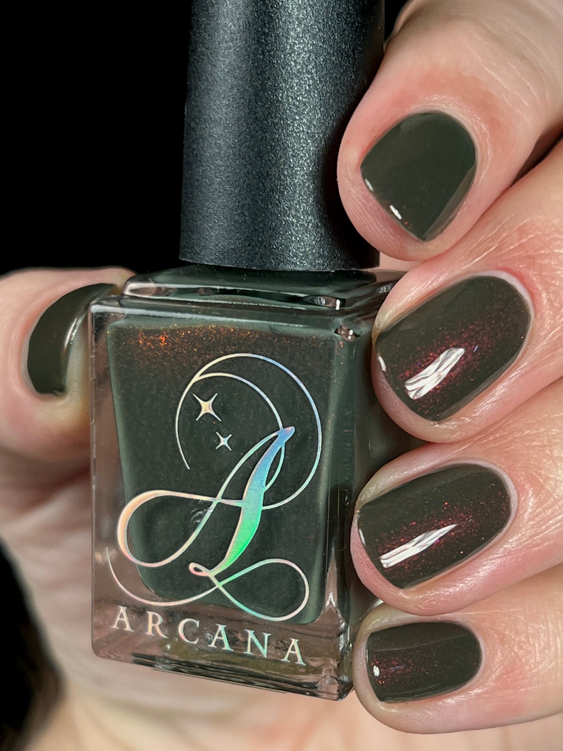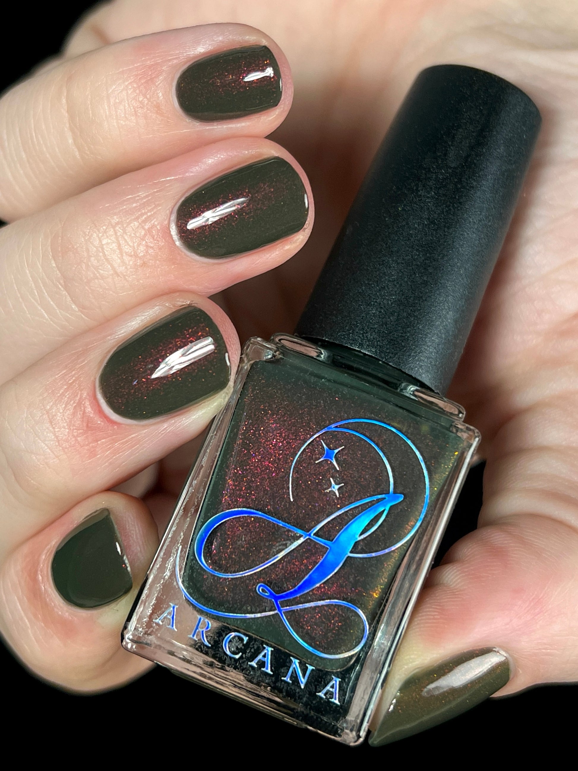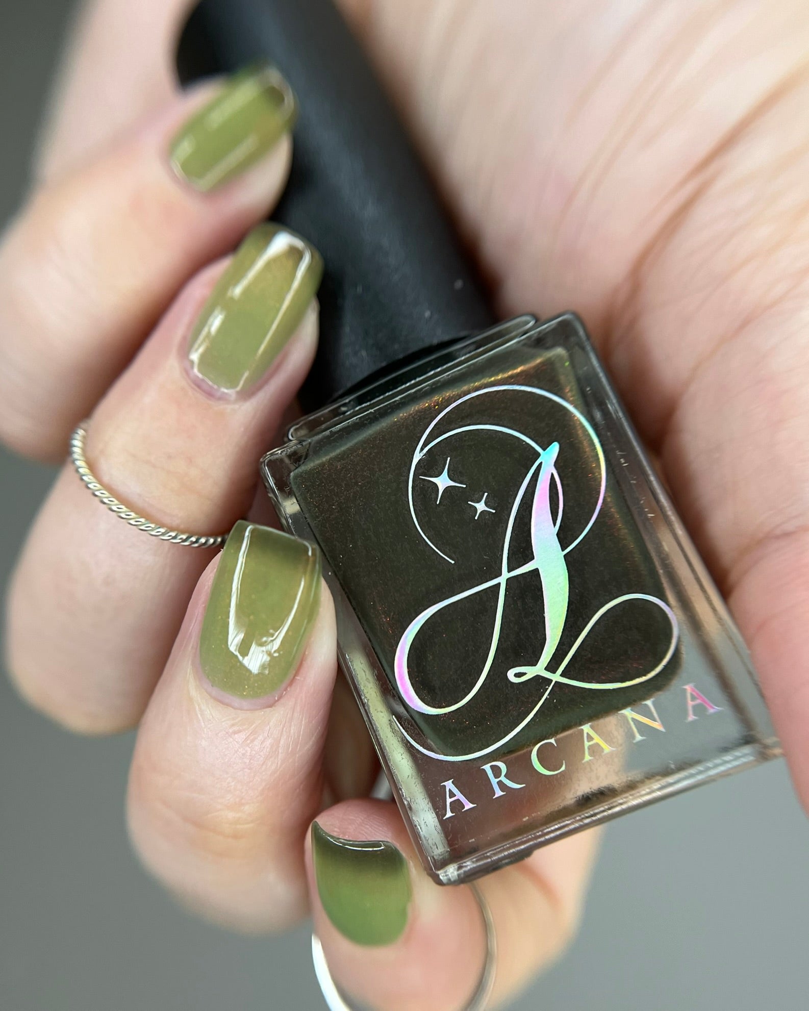 Gorgon's Gaze is a thermal polish that goes from a dark, gray-green (cold) to muted ivy green (warm) with a small particle red to yellow shimmer.