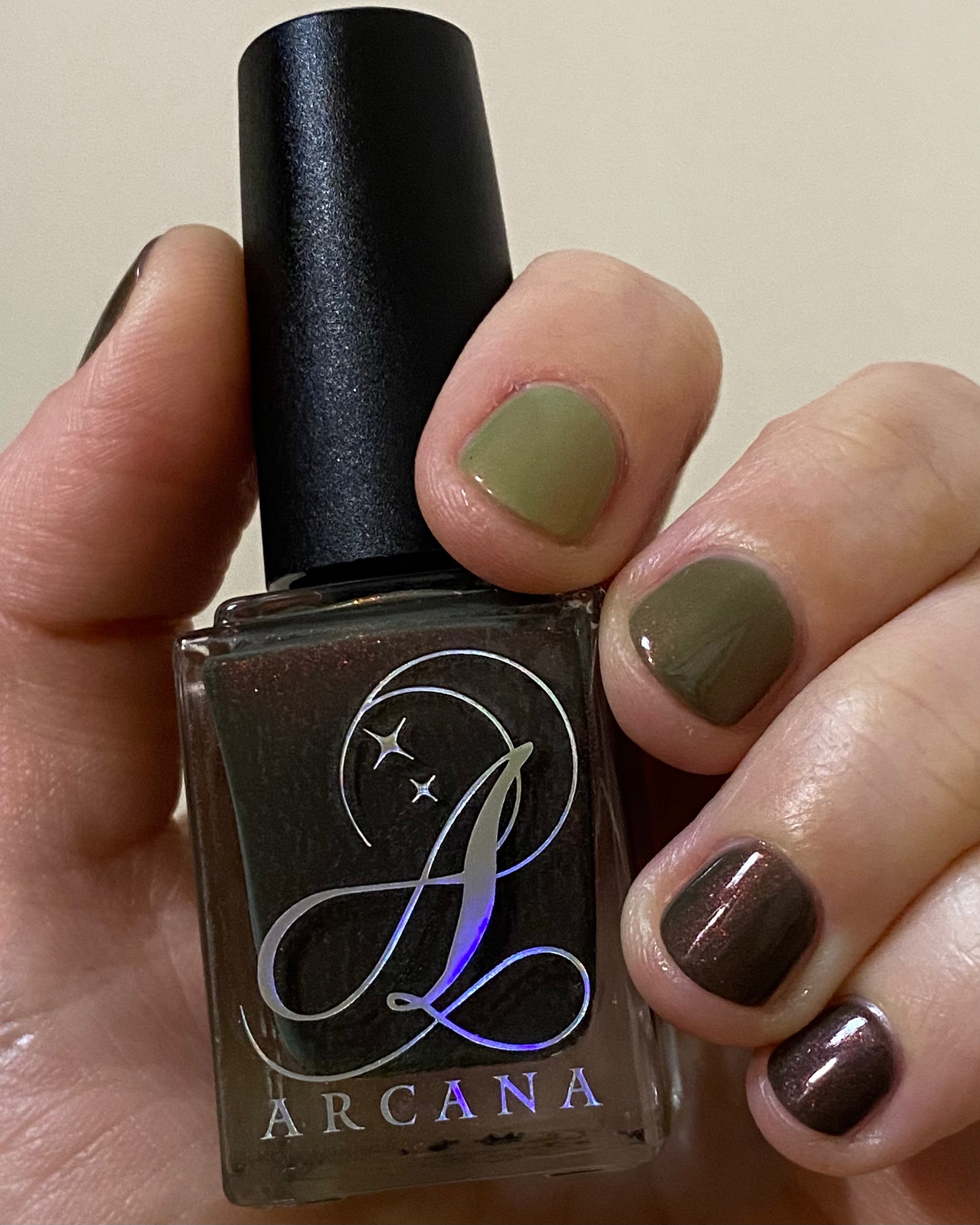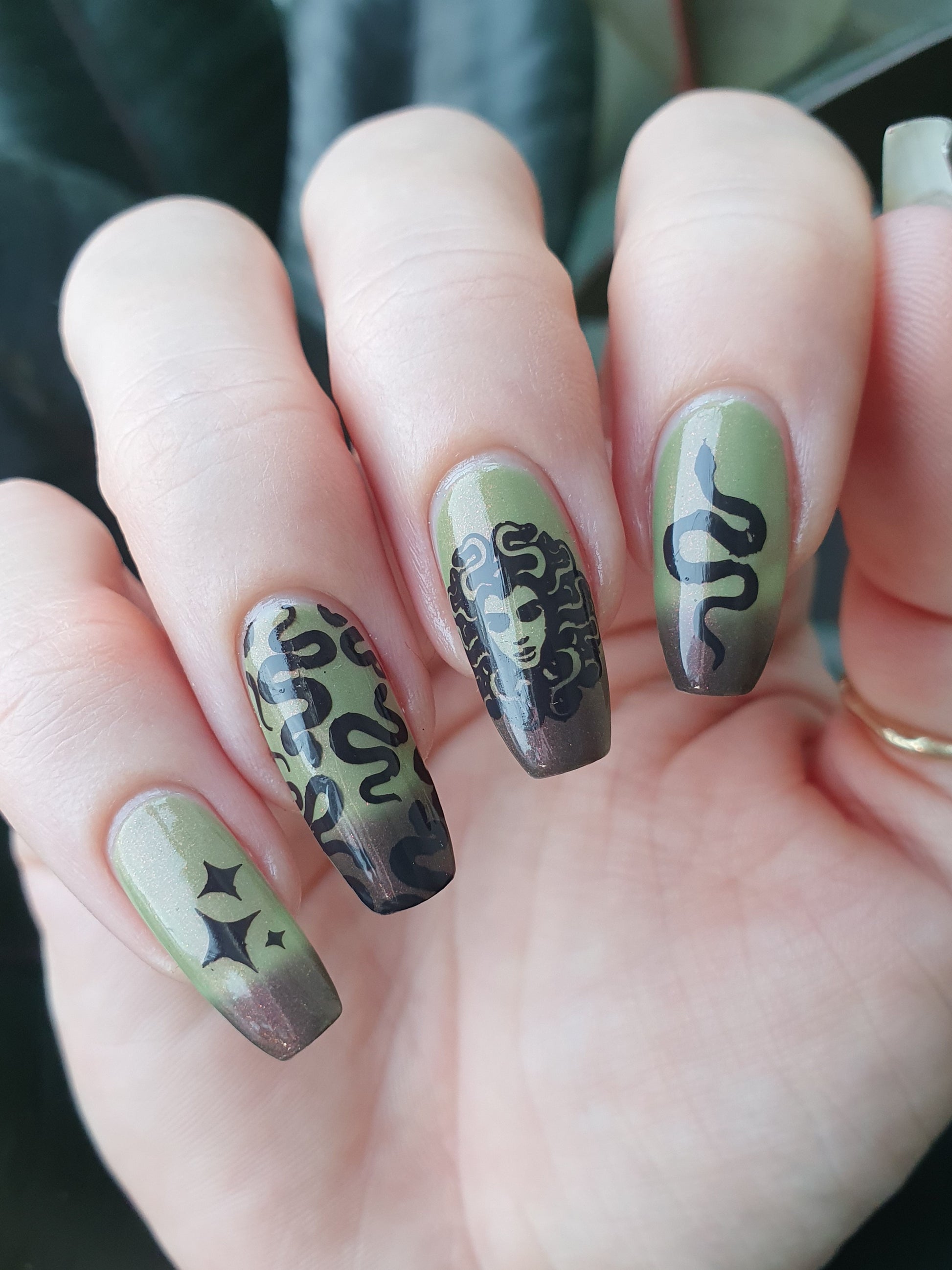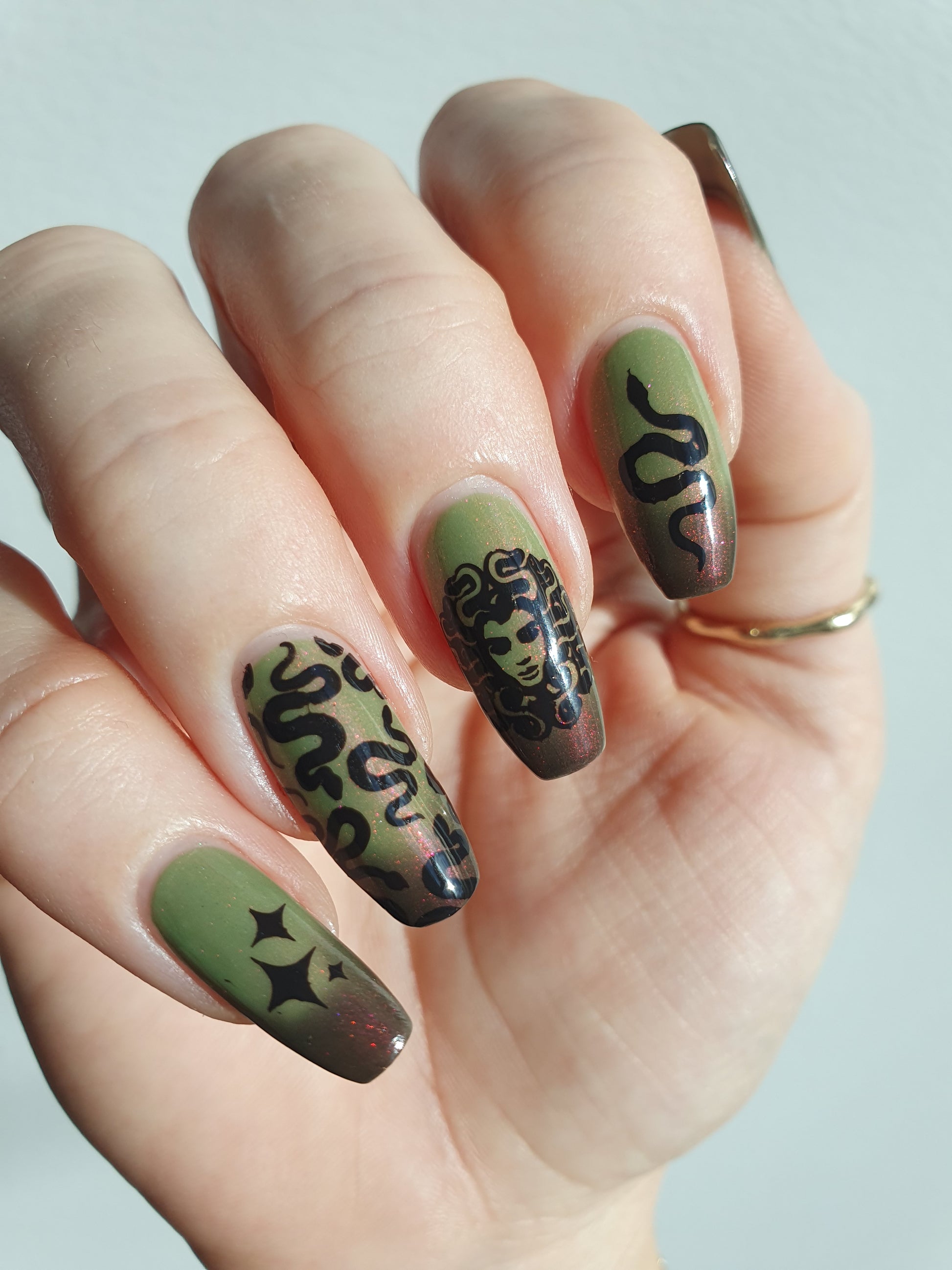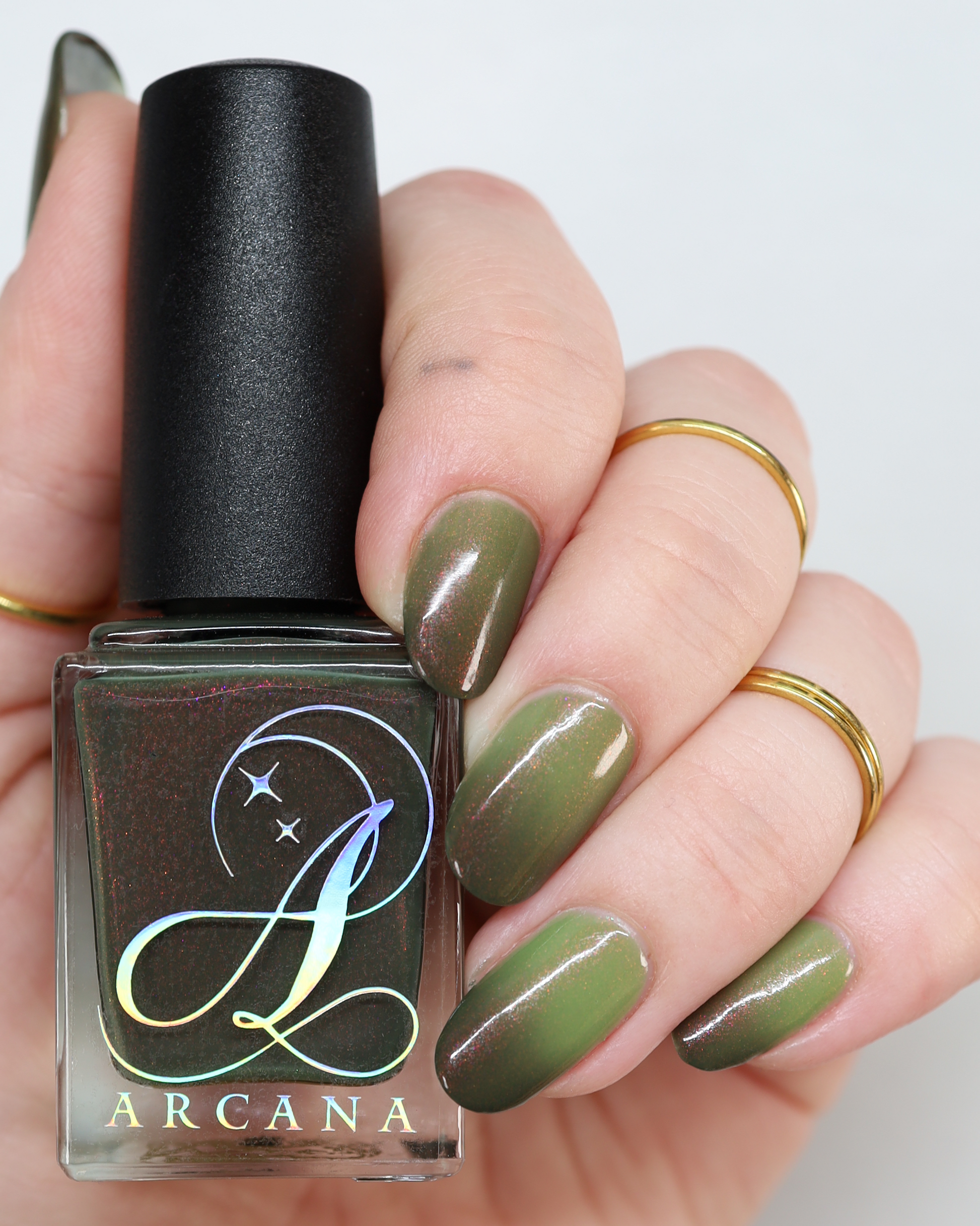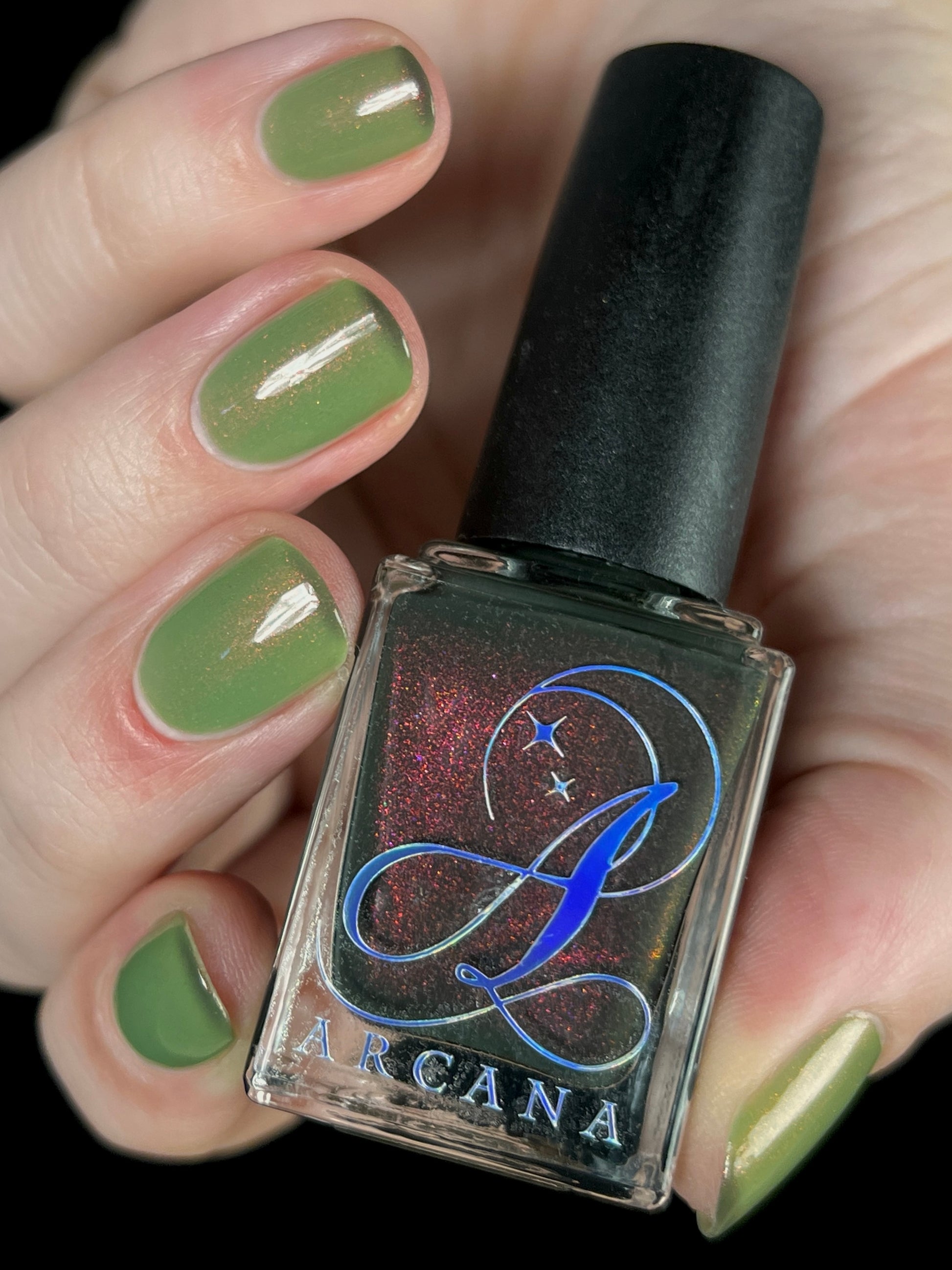 Gorgon's Gaze is a thermal polish that goes from a dark, gray-green (cold) to muted ivy green (warm) with a small particle red to yellow shimmer.