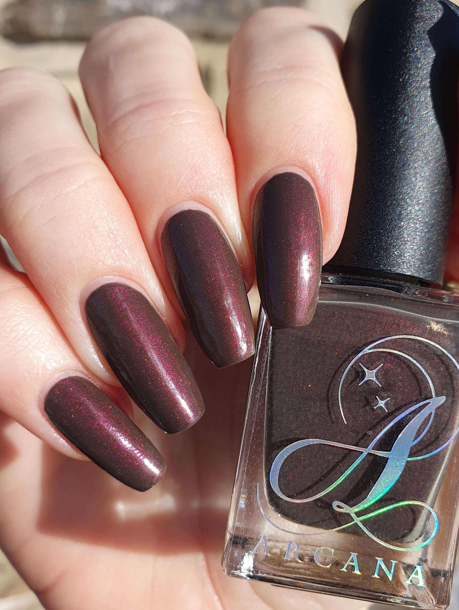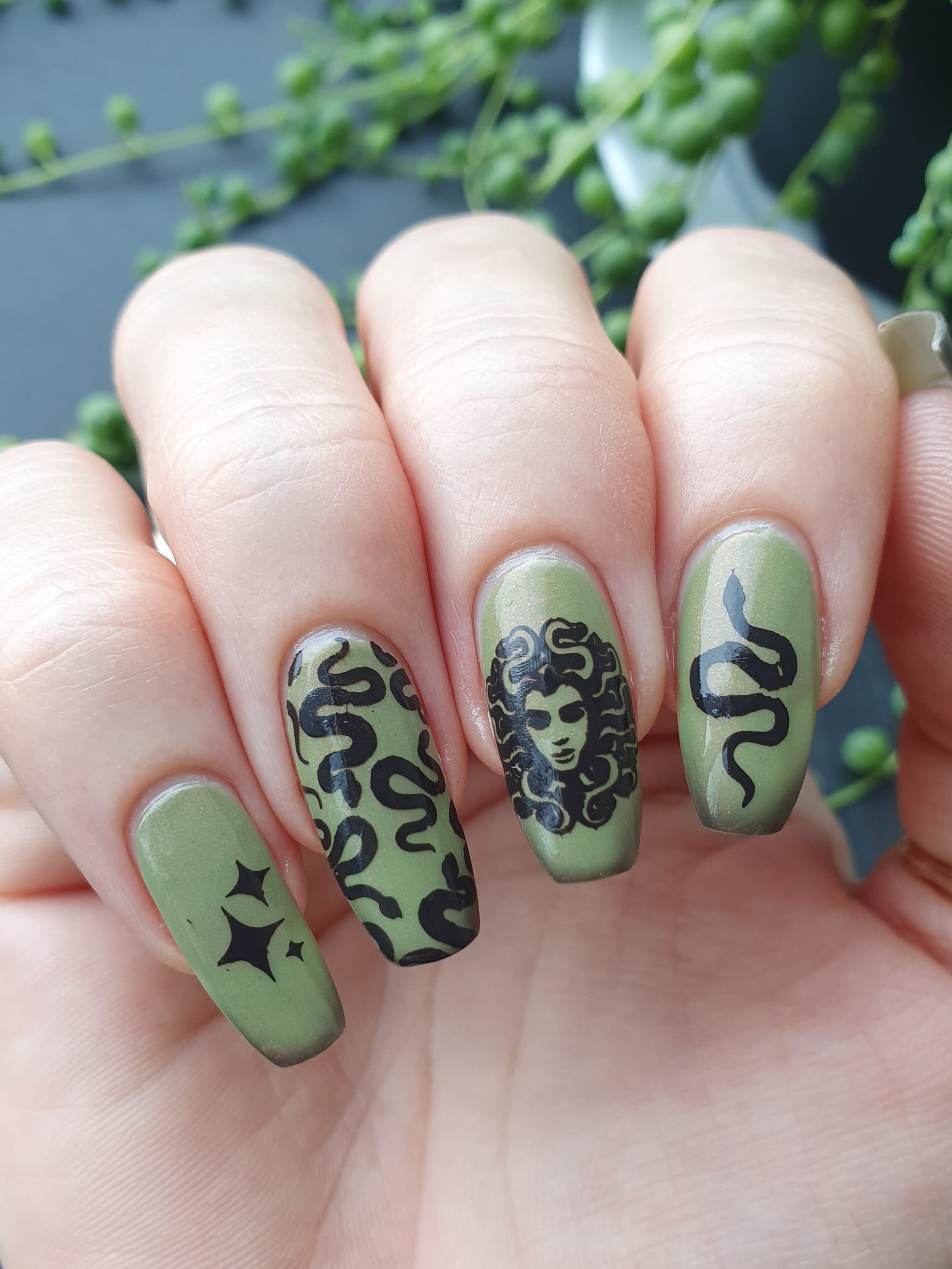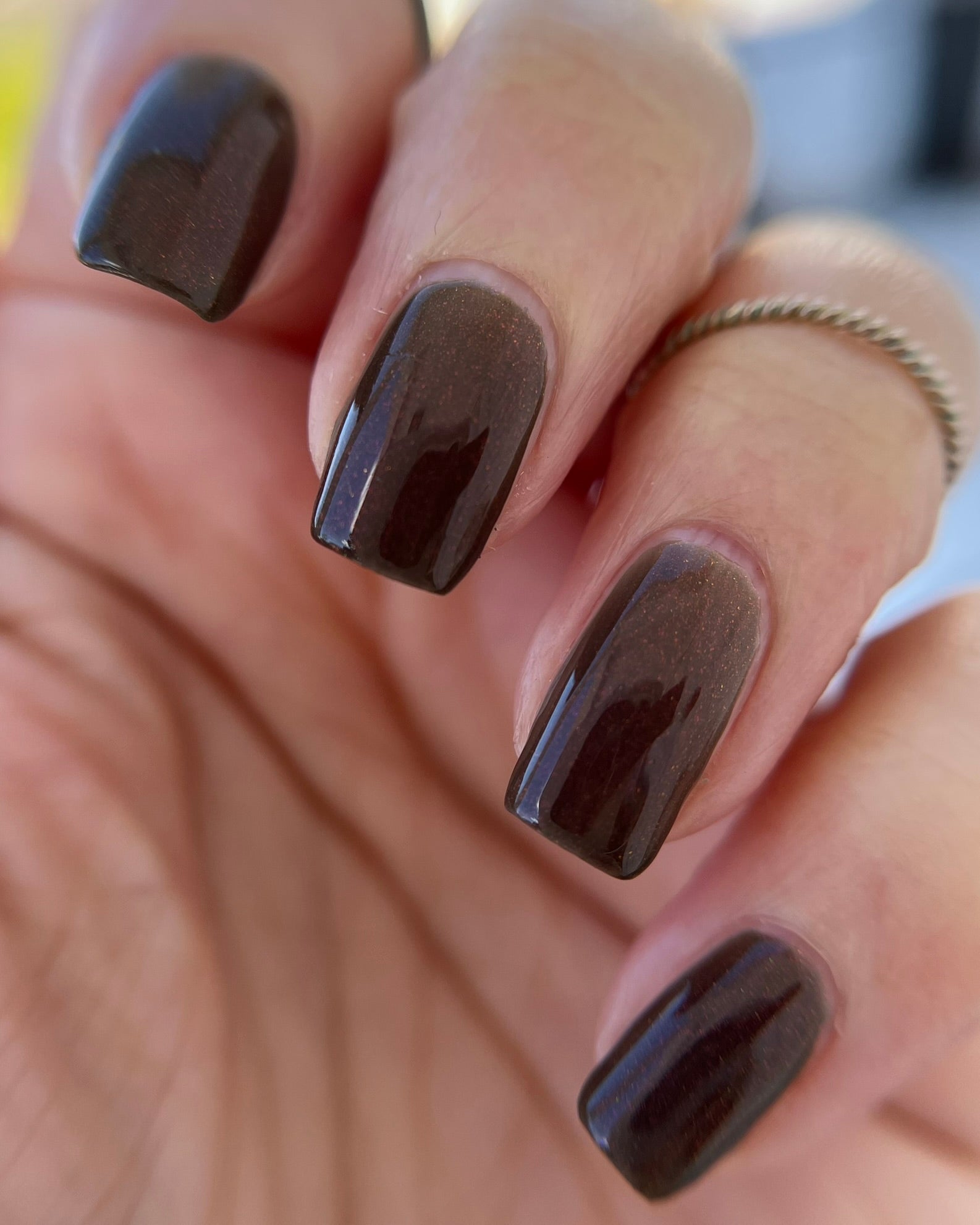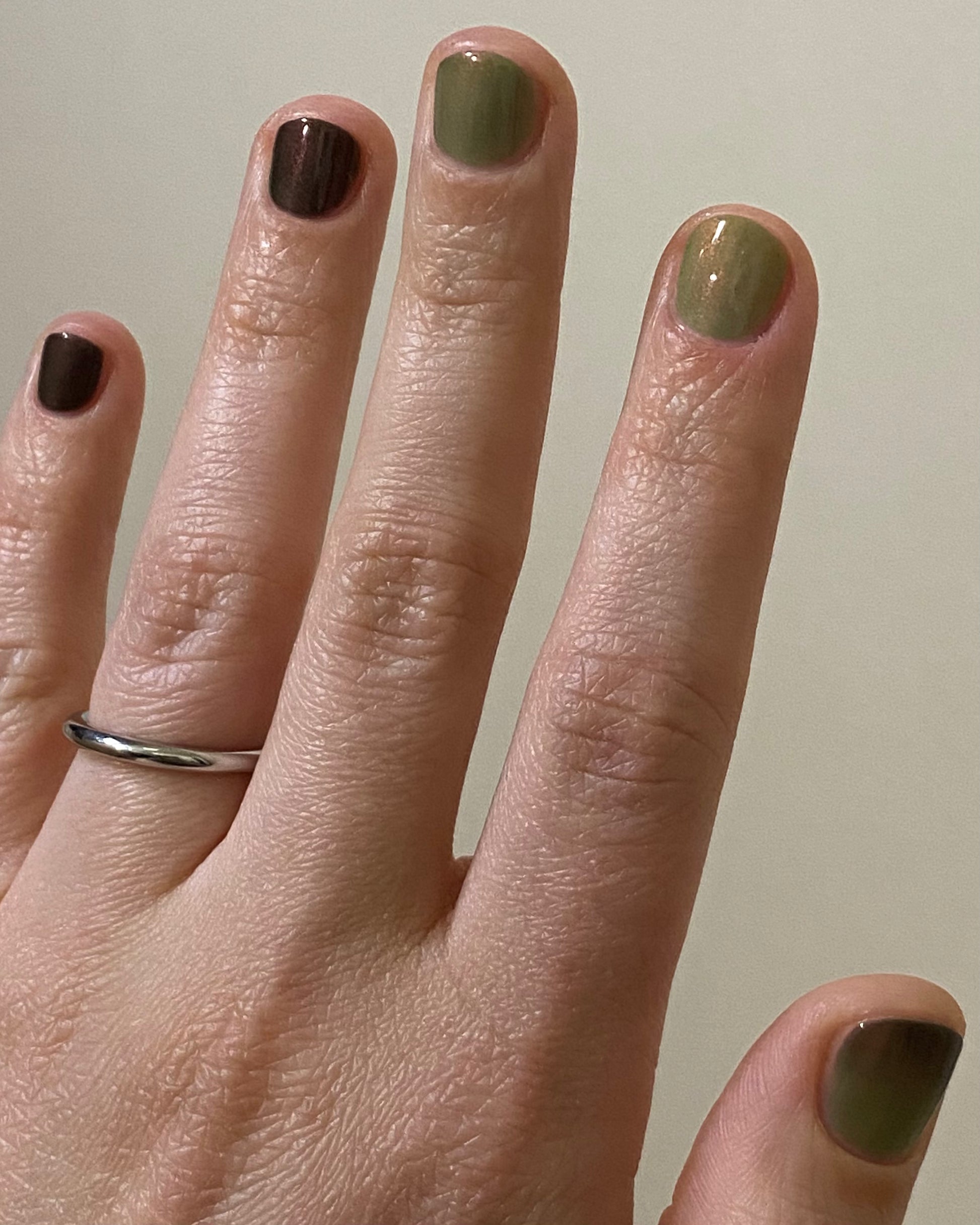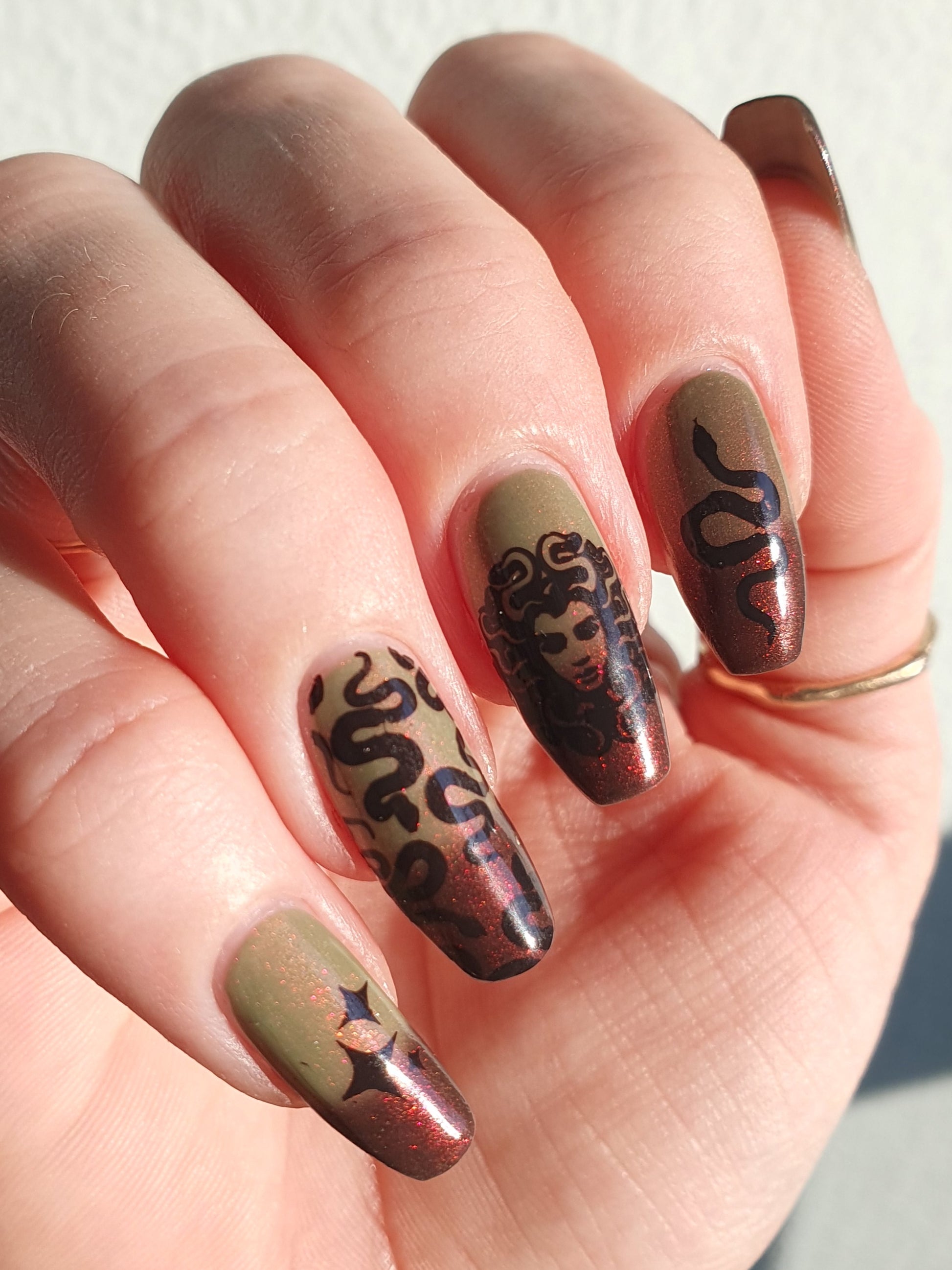 Gorgon's Gaze is a thermal polish that goes from a dark, gray-green (cold) to muted ivy green (warm) with a small particle red to yellow shimmer.