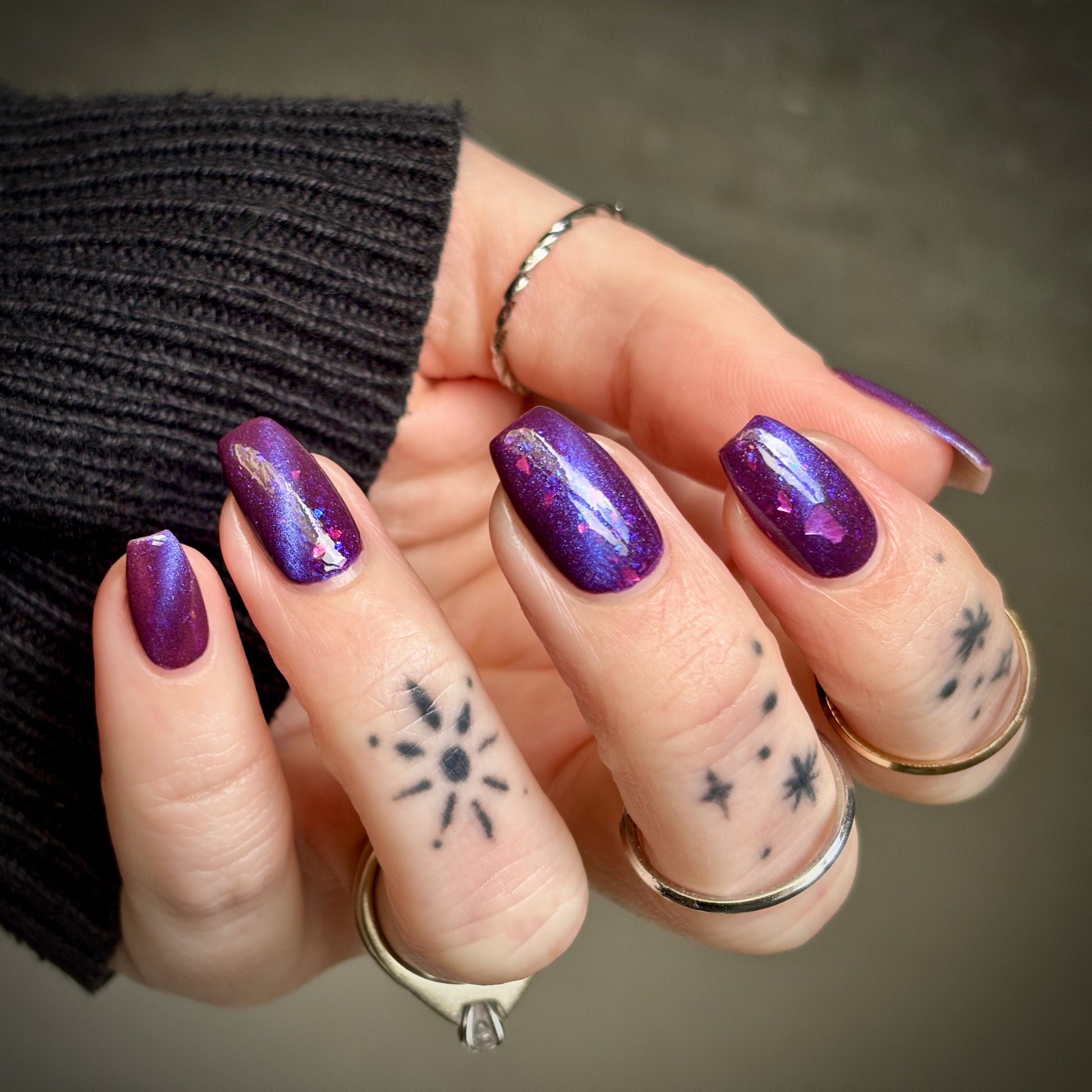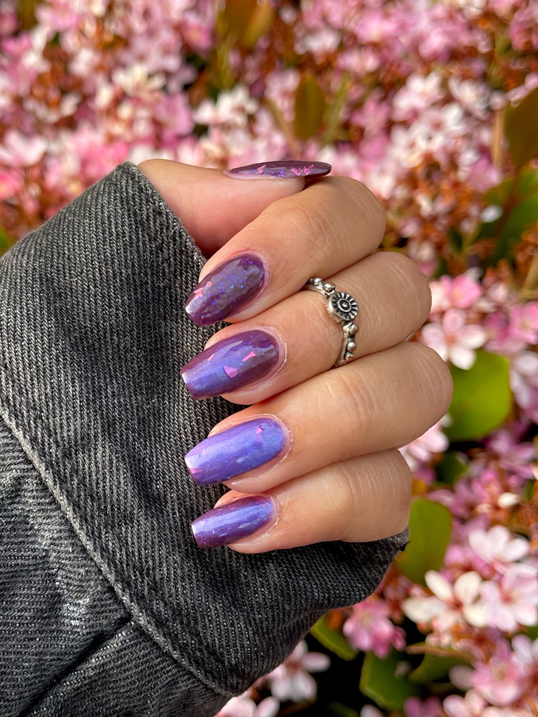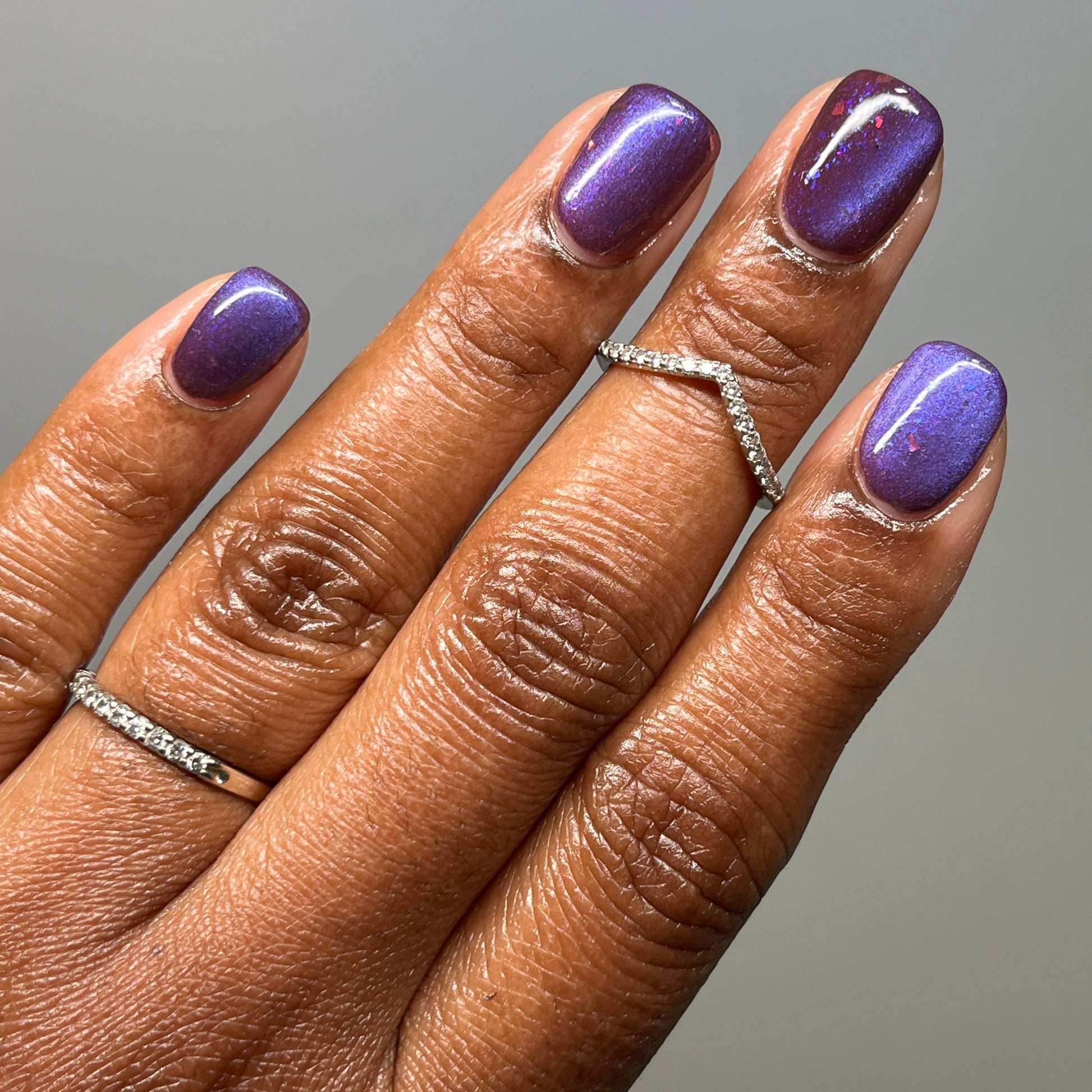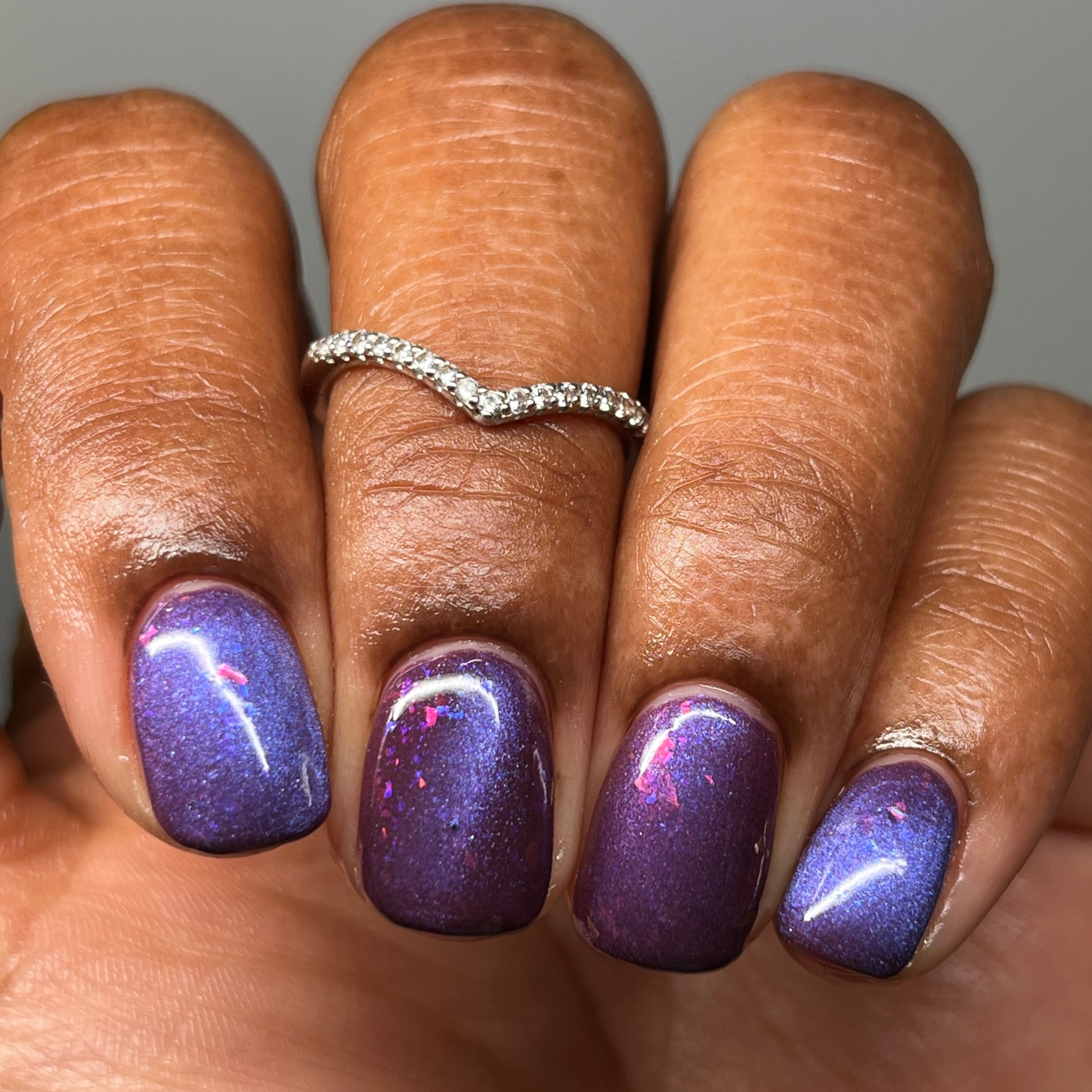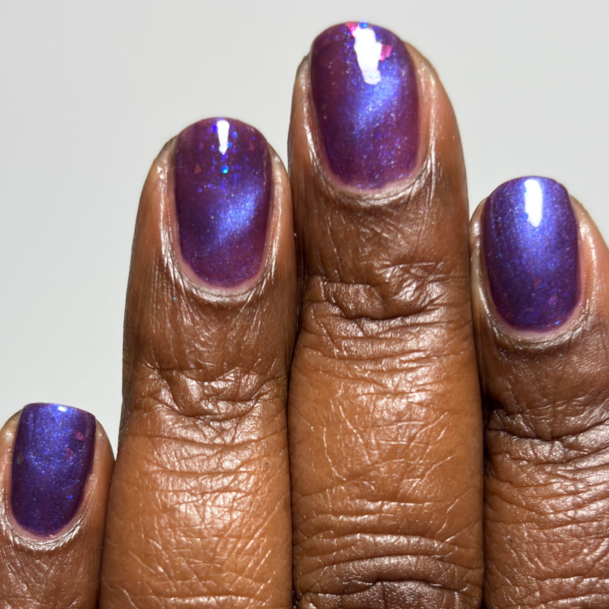 This polish is a dark reddish purple with bright pink to green flakes, ghostly purple to blue flakes, and aqua to blue to purple magnetic pigment.