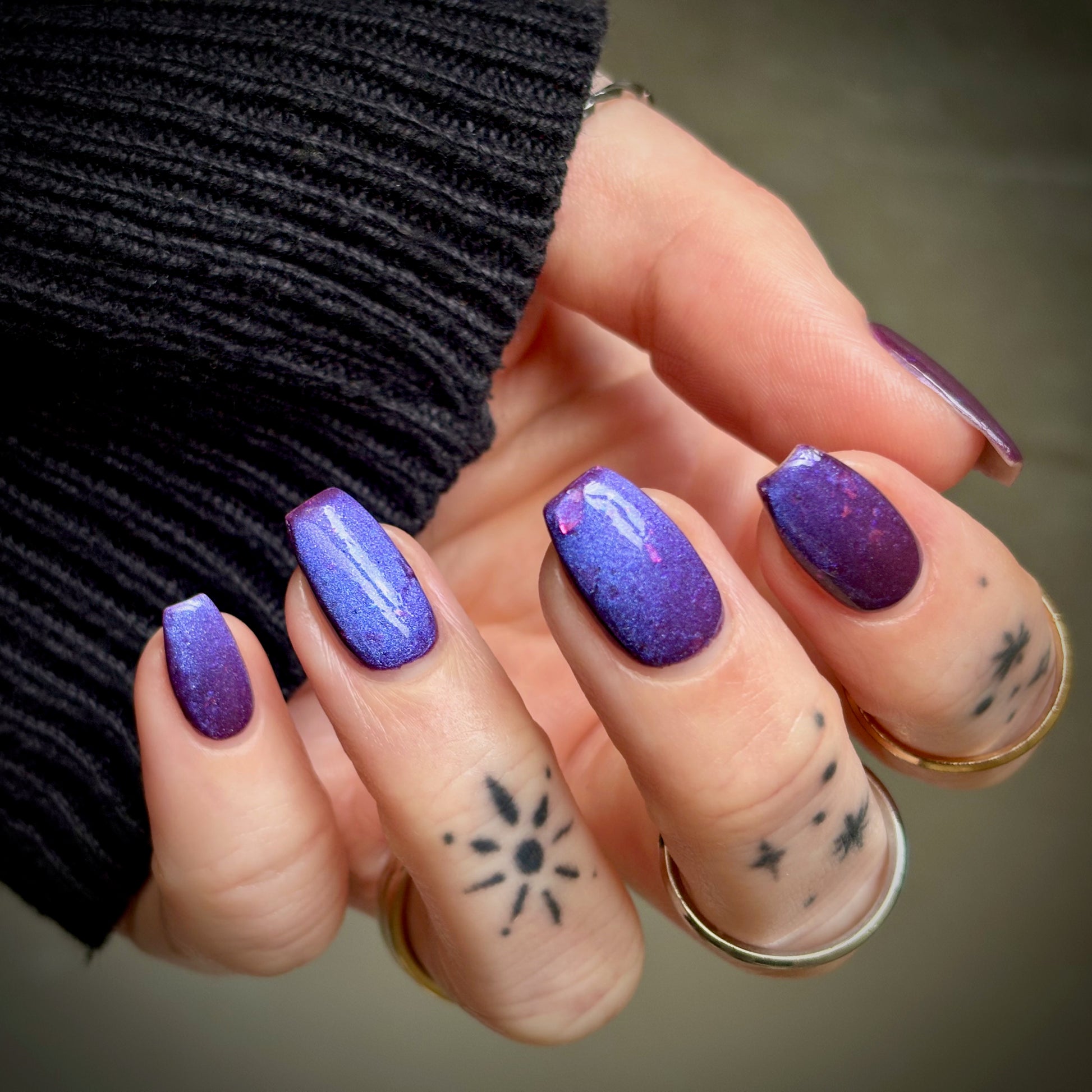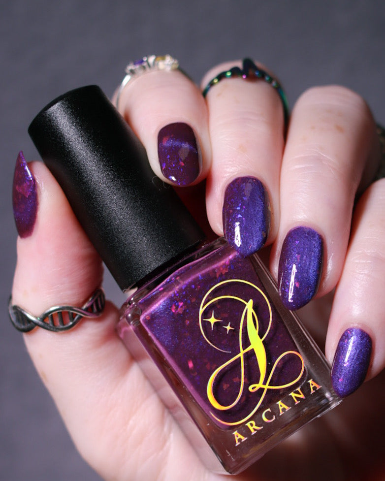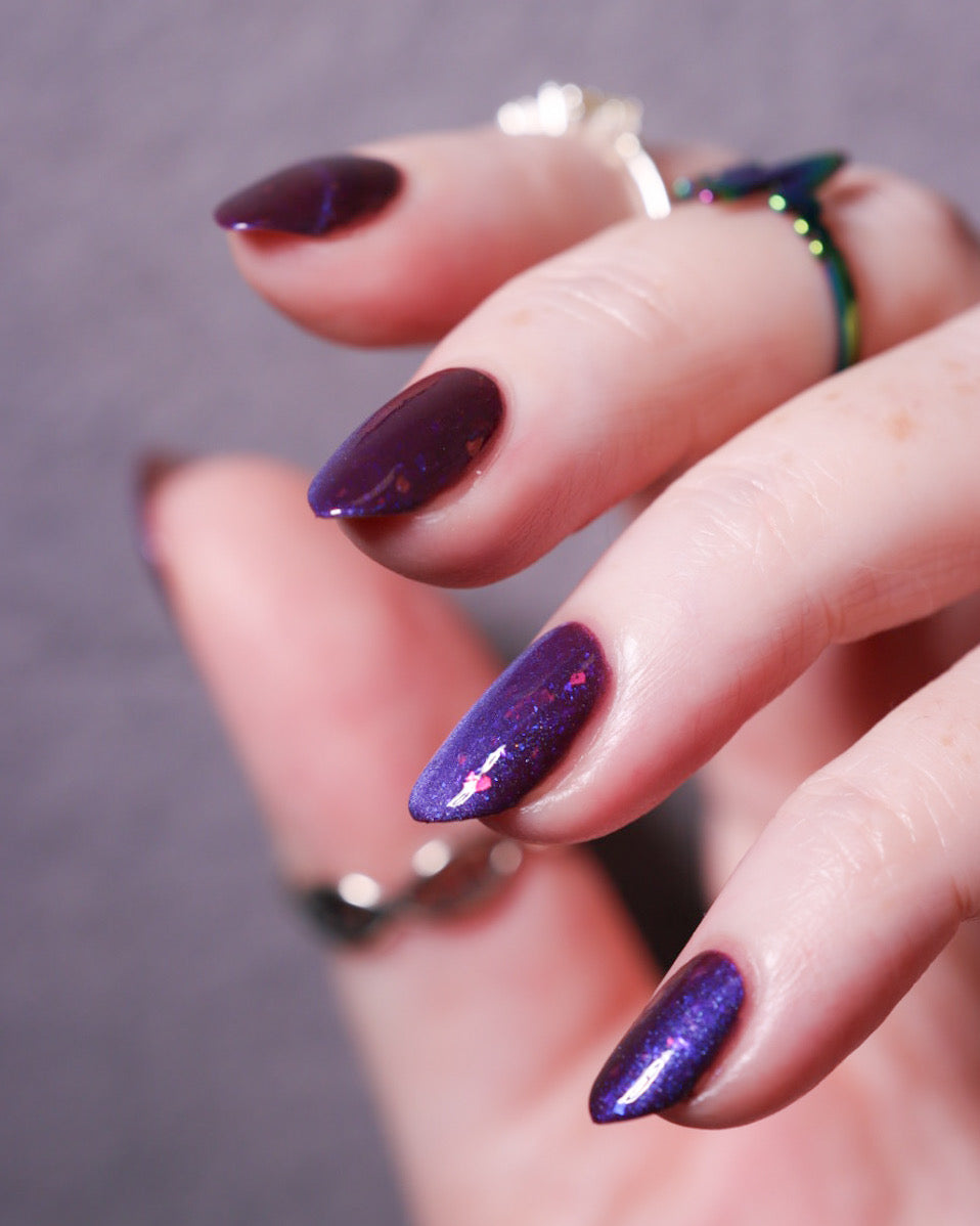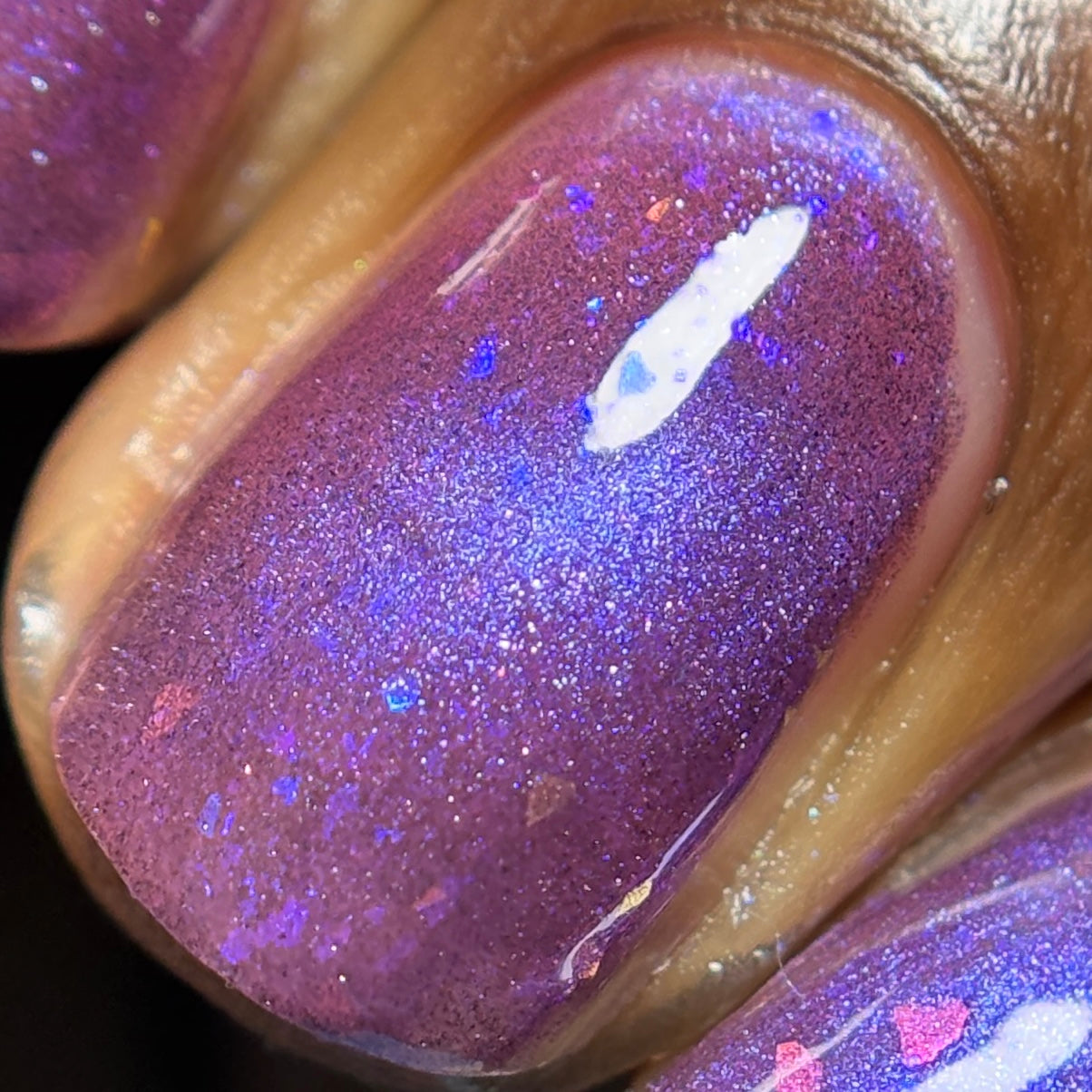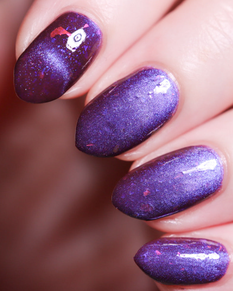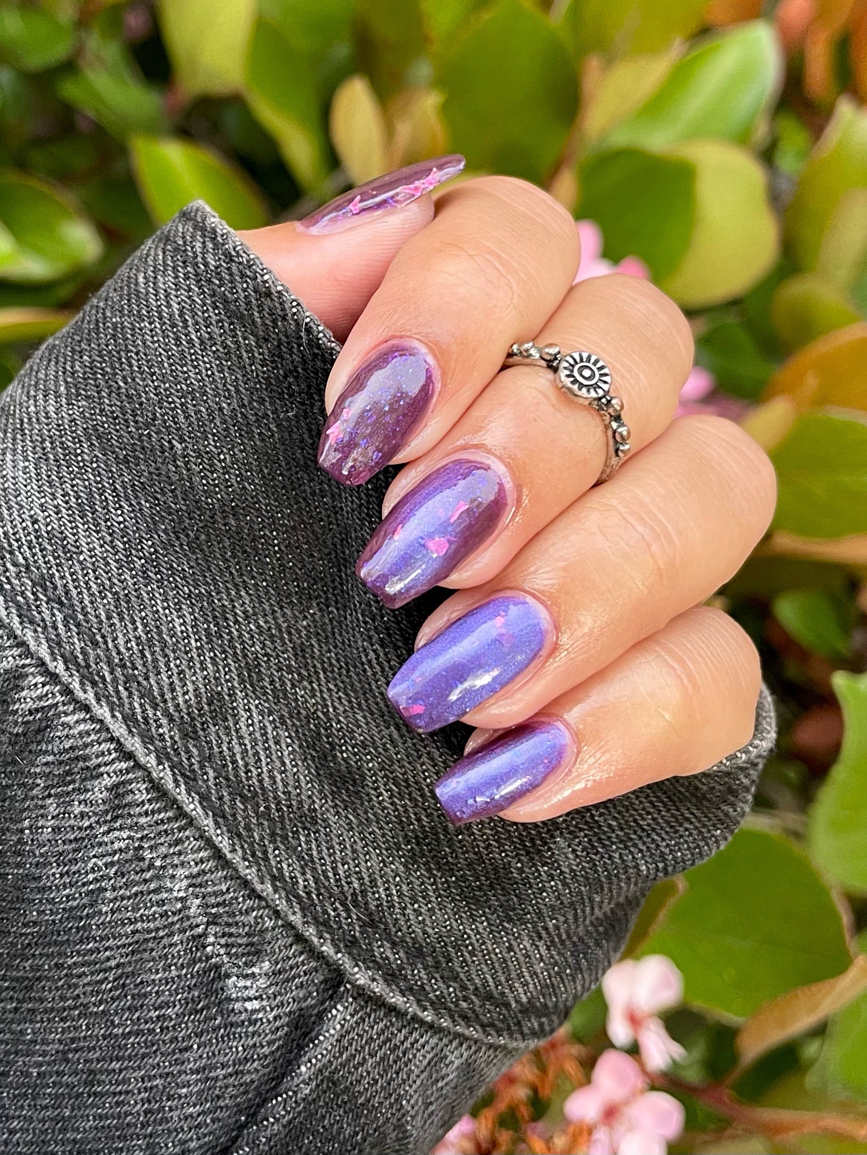 This polish is a dark reddish purple with bright pink to green flakes, ghostly purple to blue flakes, and aqua to blue to purple magnetic pigment.