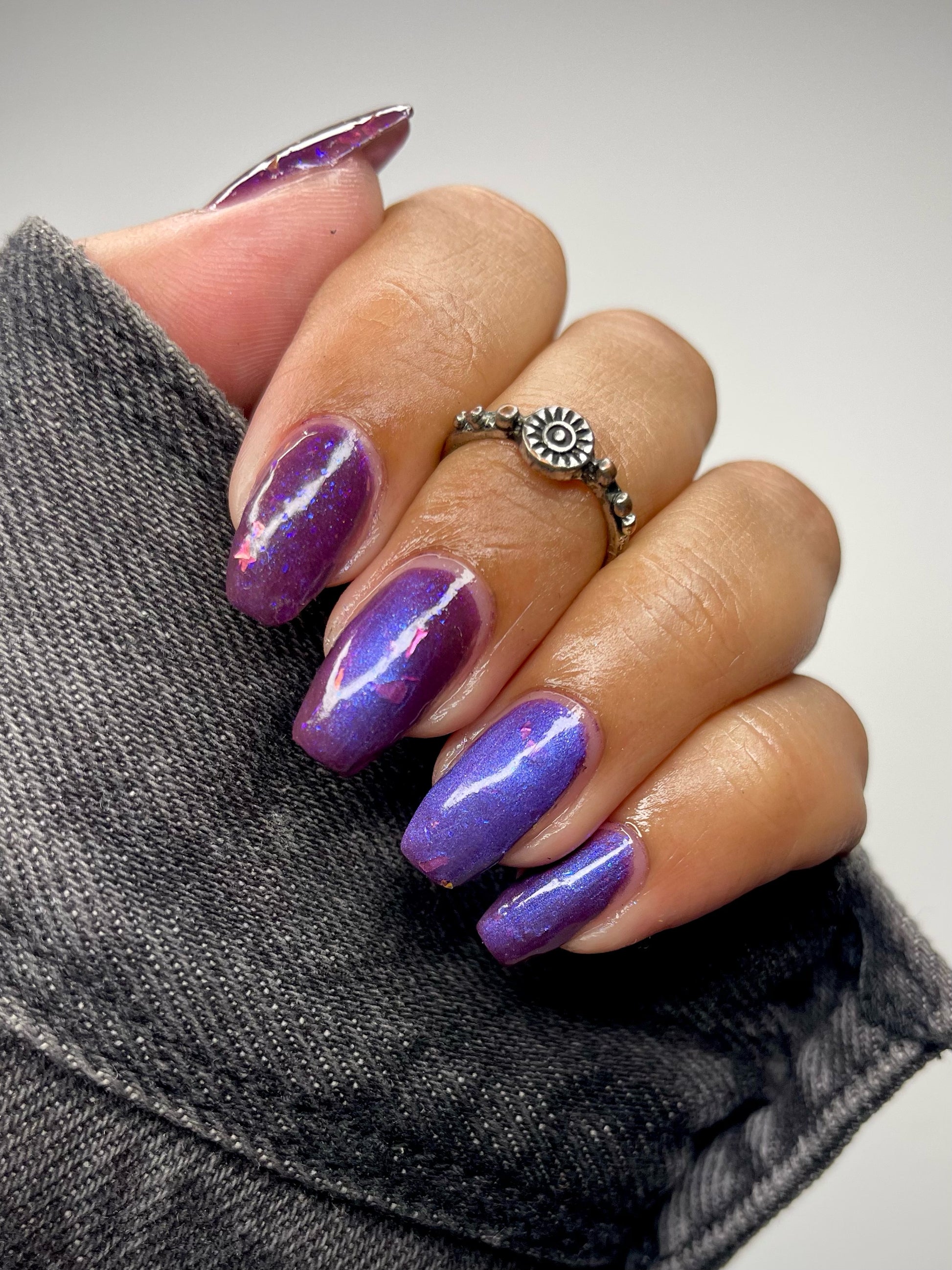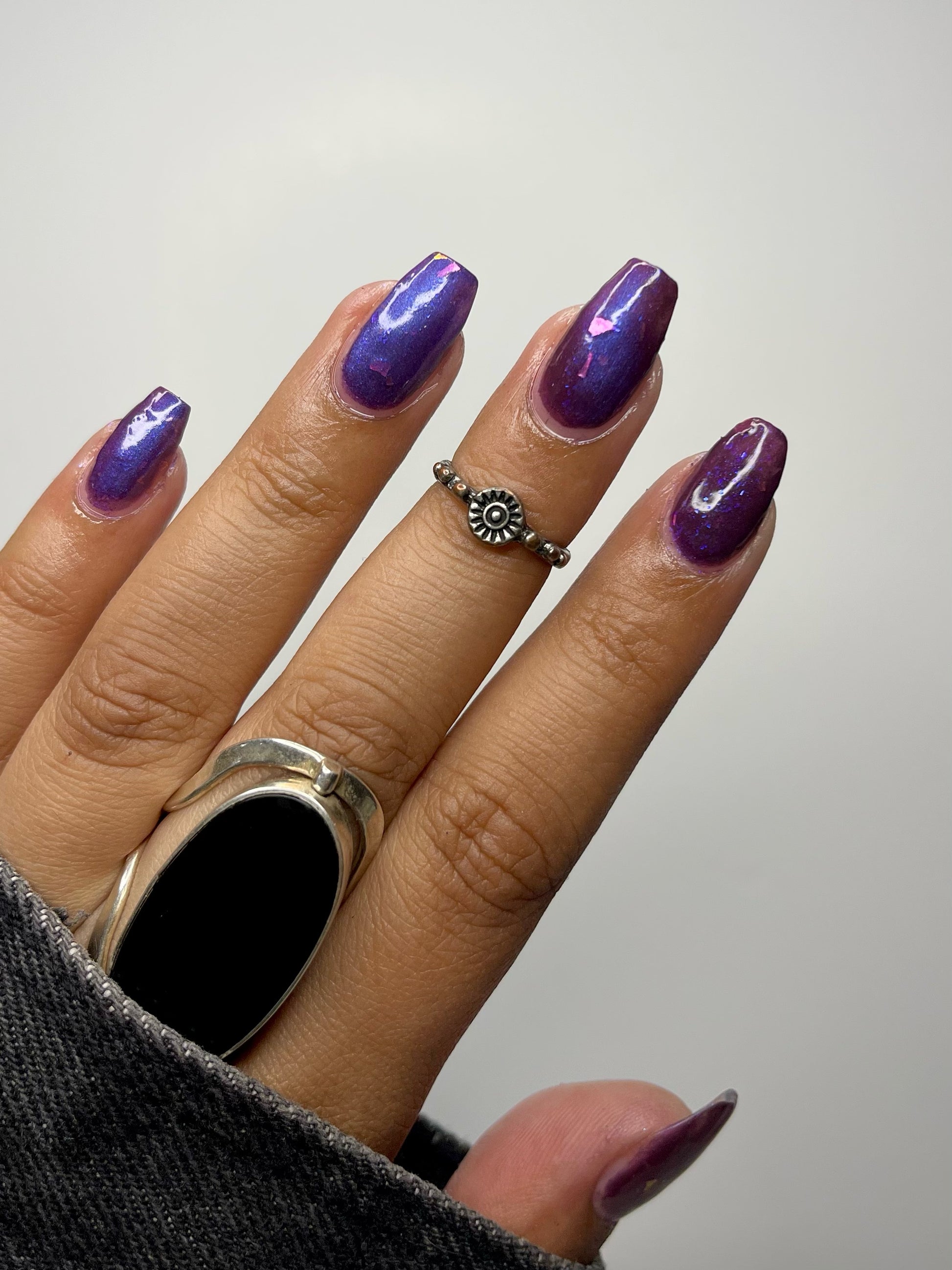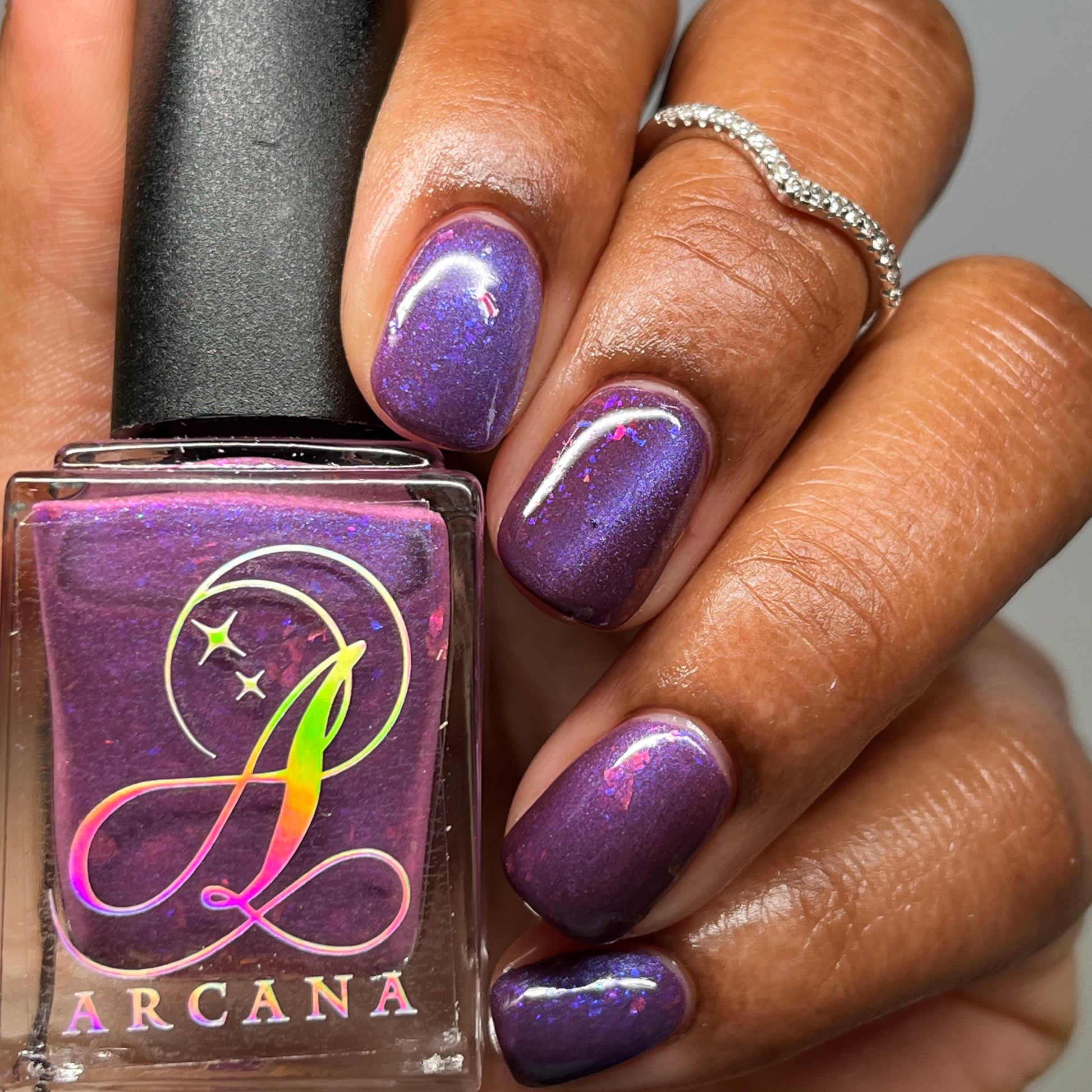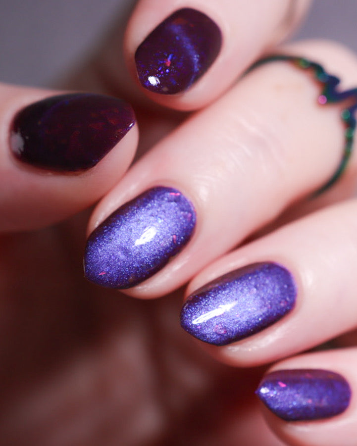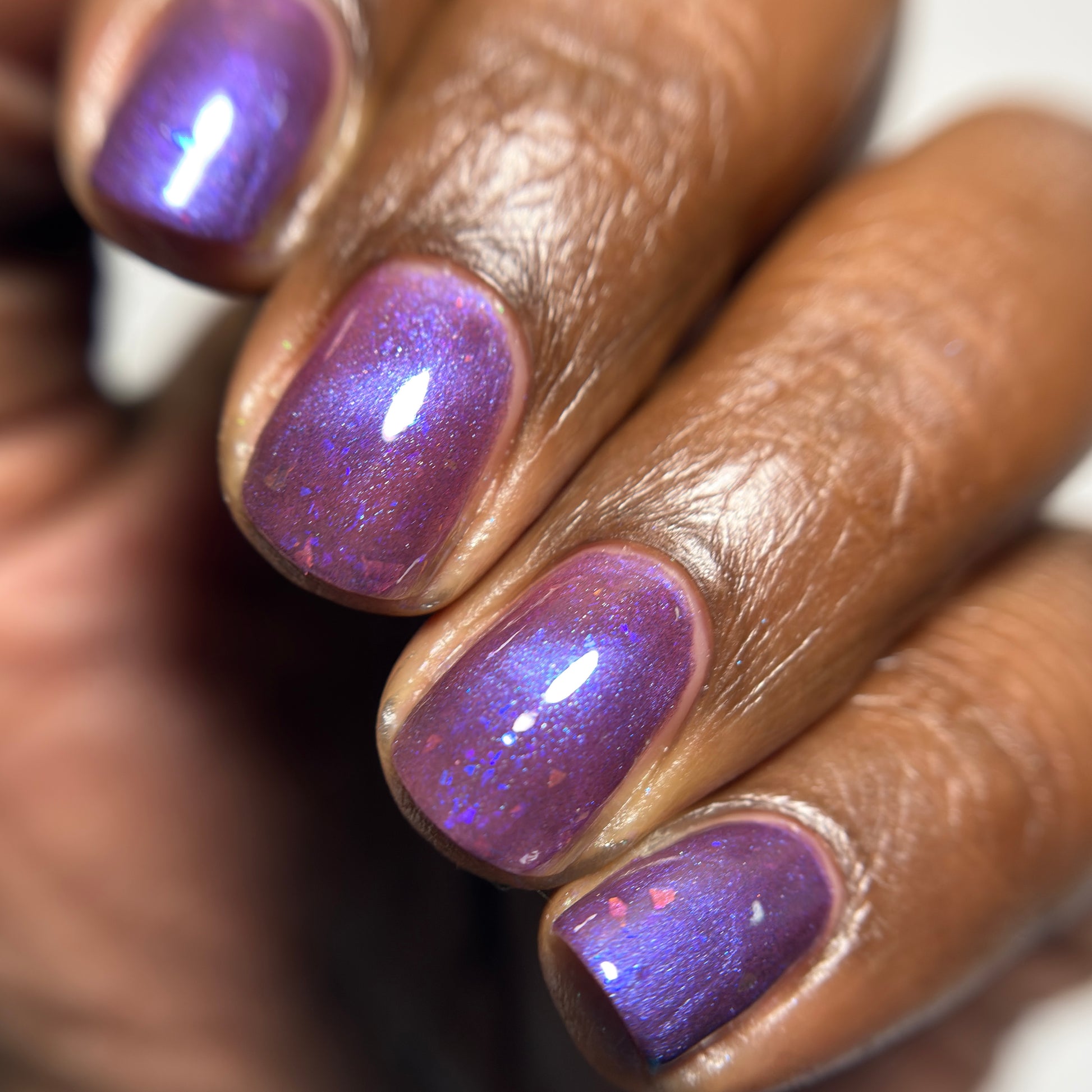 This polish is a dark reddish purple with bright pink to green flakes, ghostly purple to blue flakes, and aqua to blue to purple magnetic pigment.