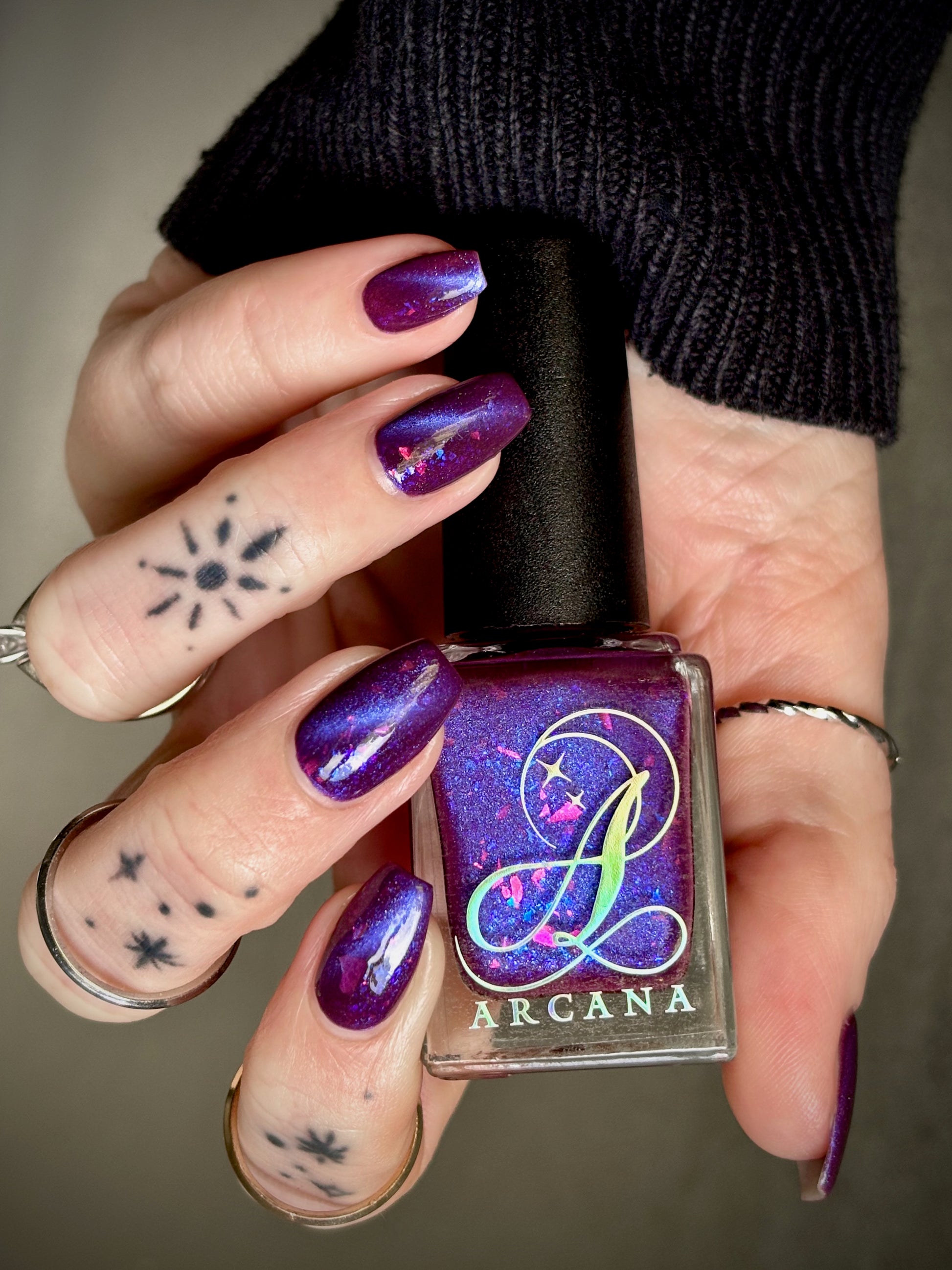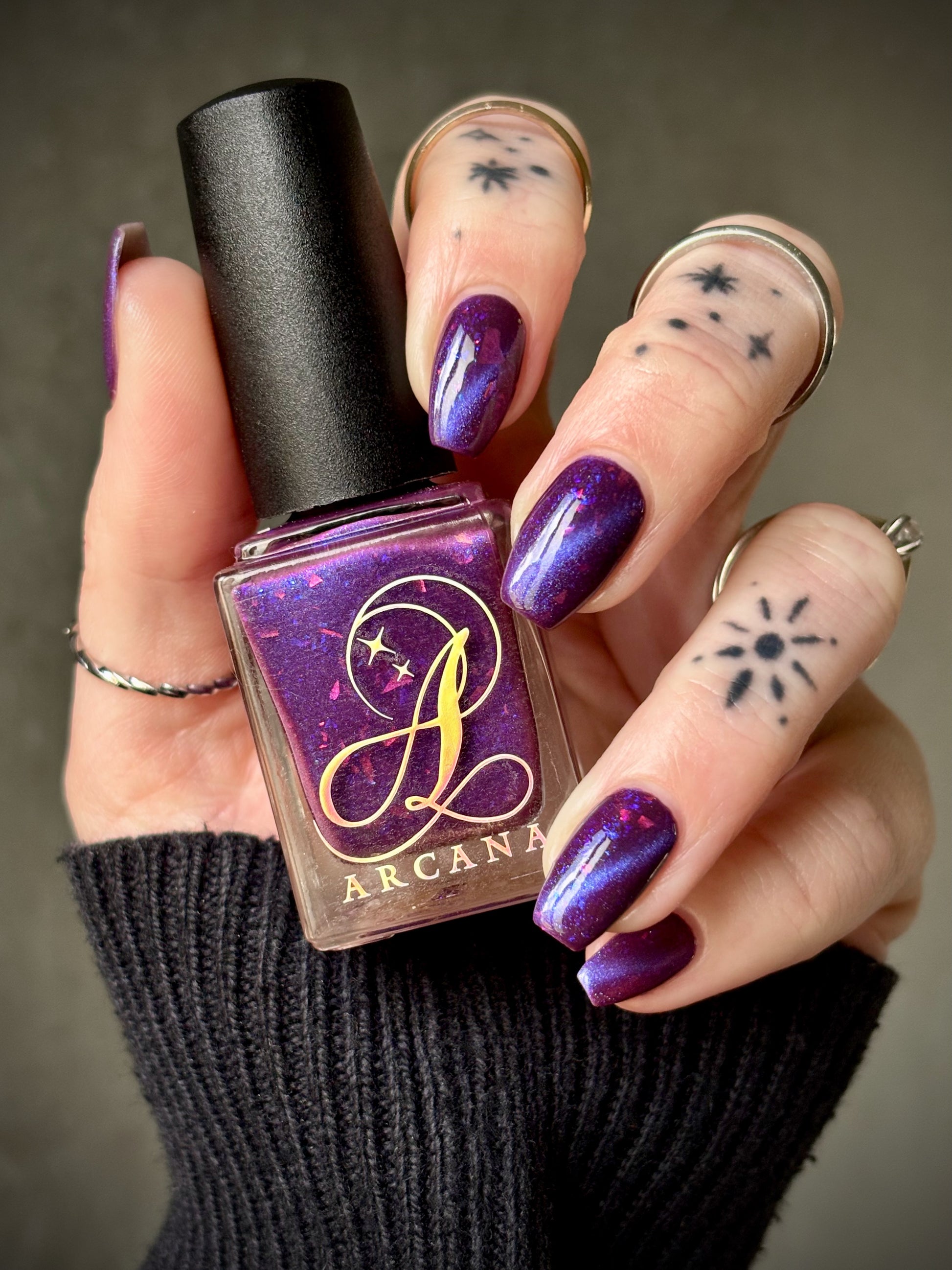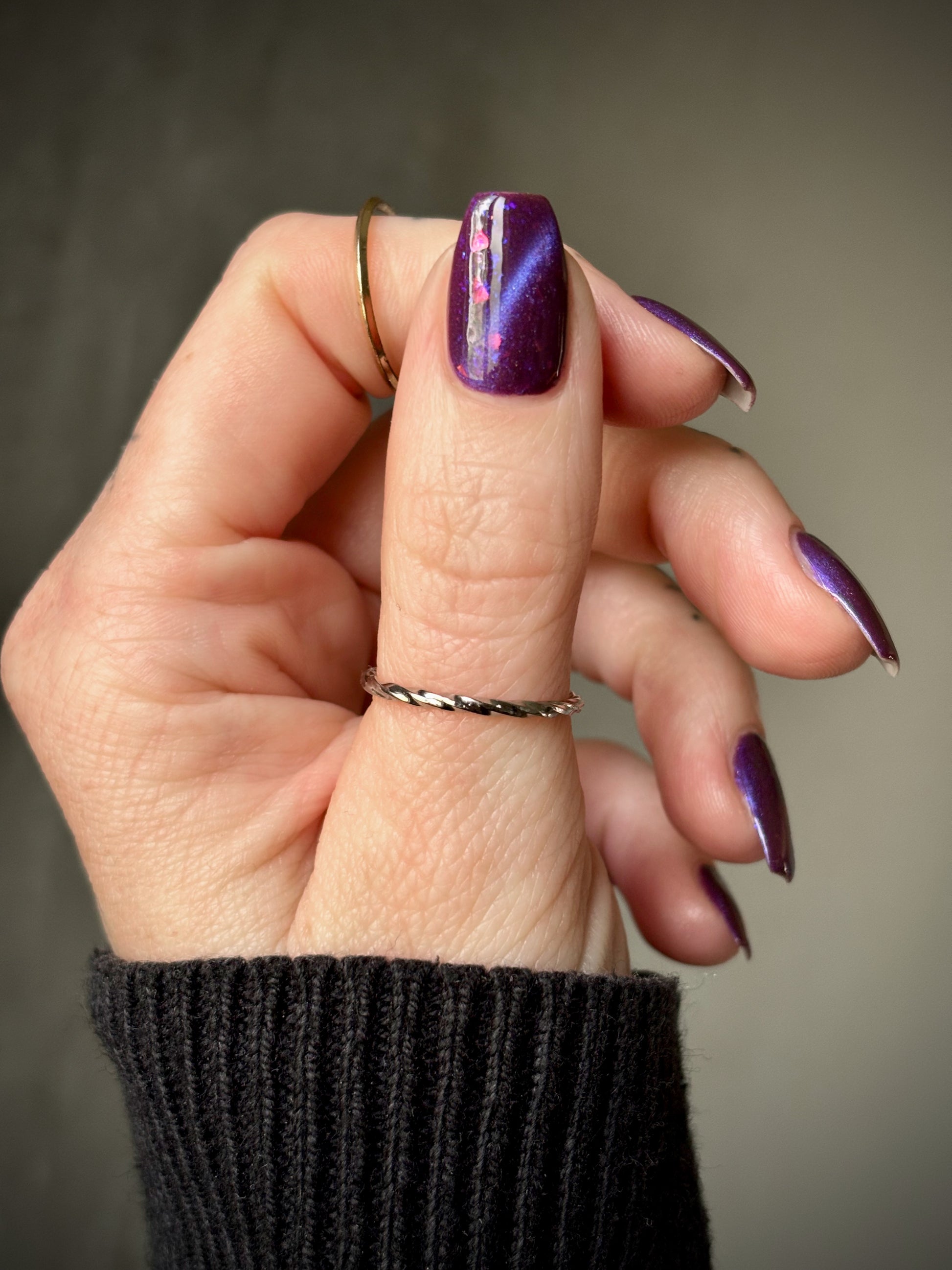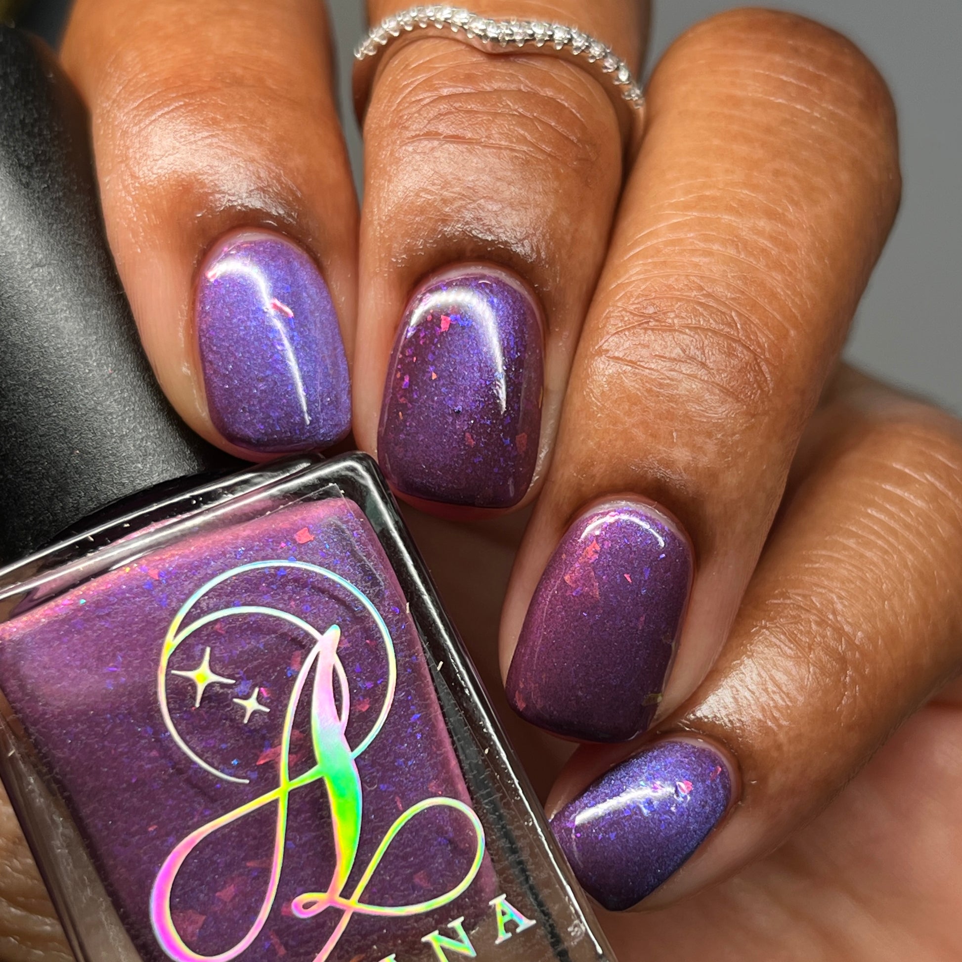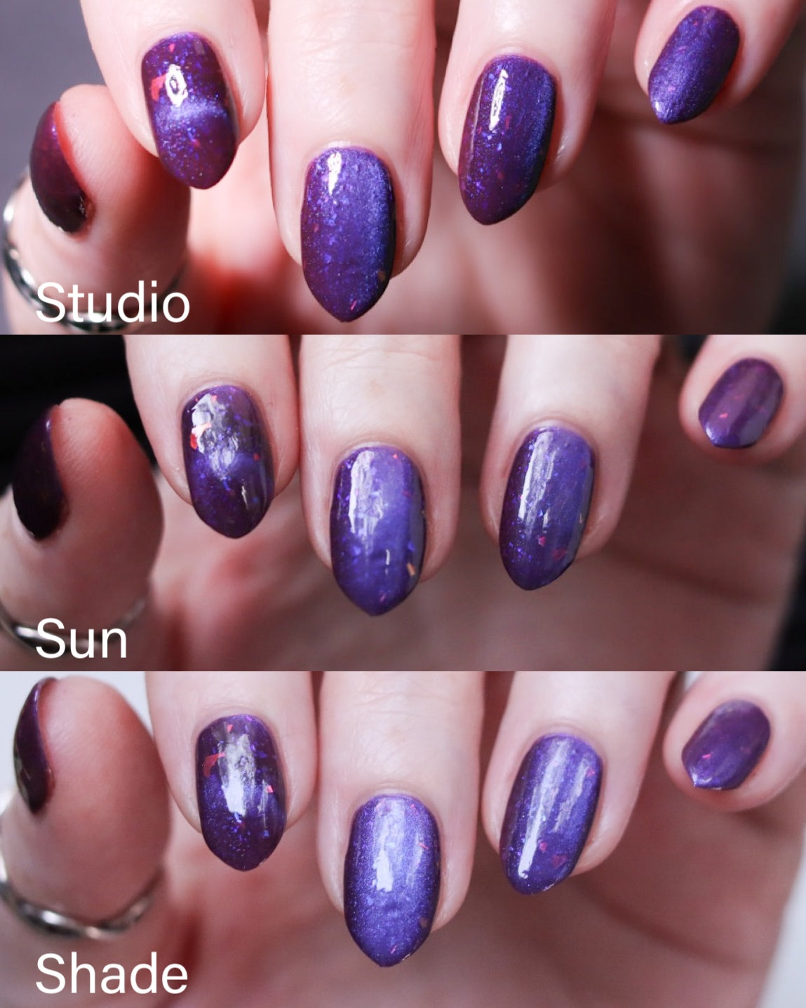 This polish is a dark reddish purple with bright pink to green flakes, ghostly purple to blue flakes, and aqua to blue to purple magnetic pigment.