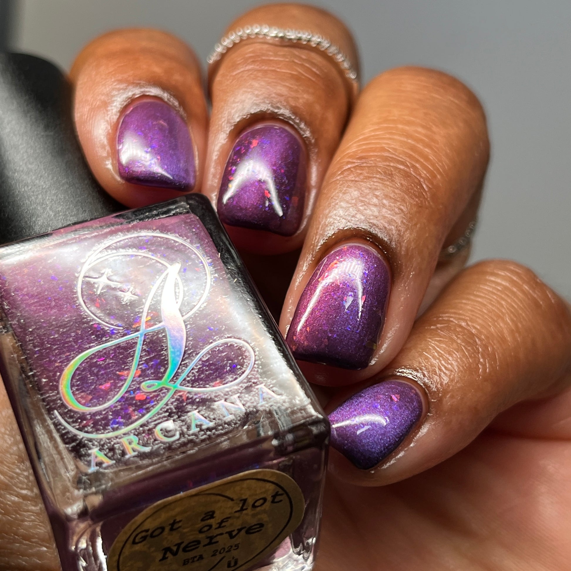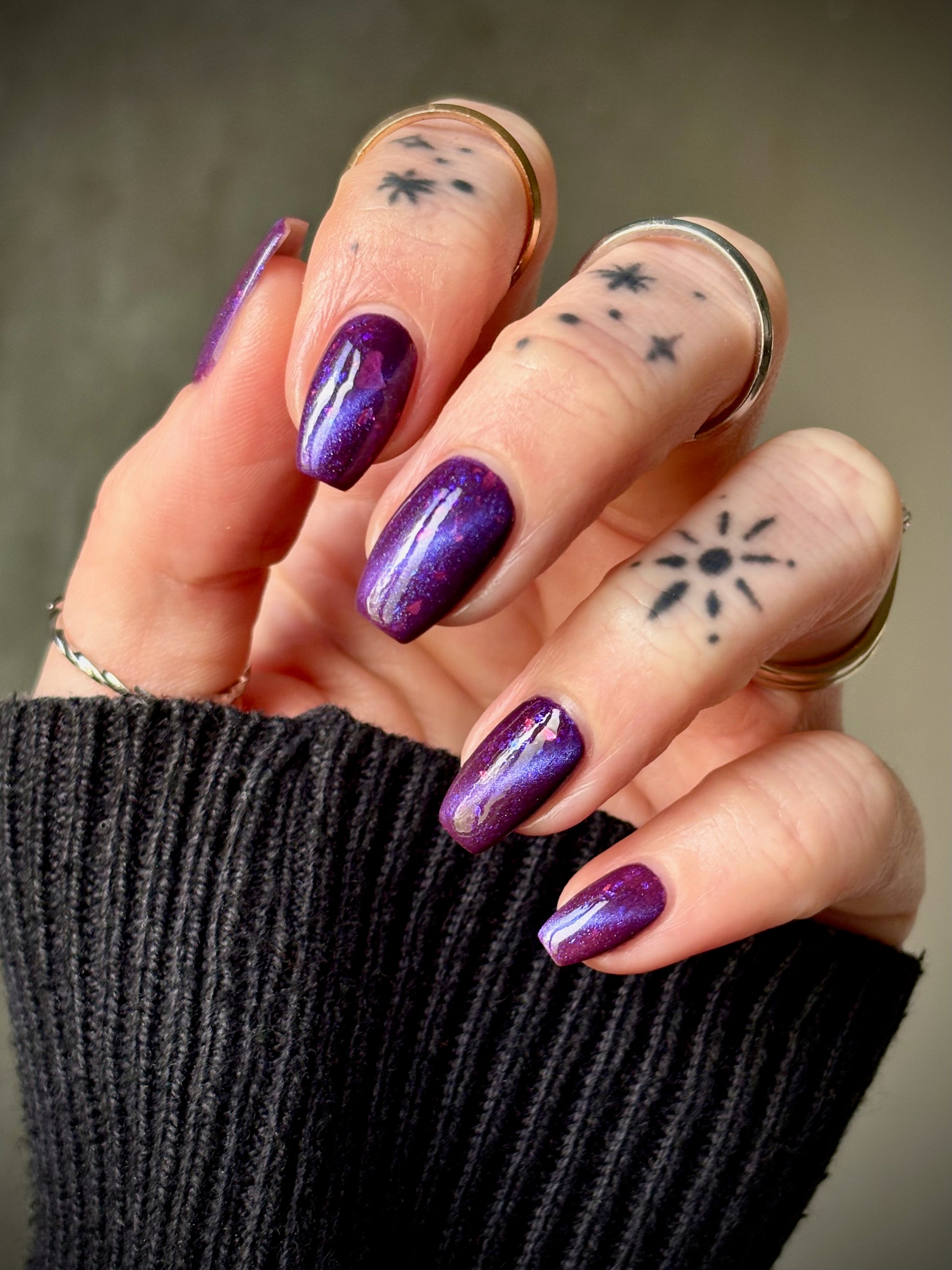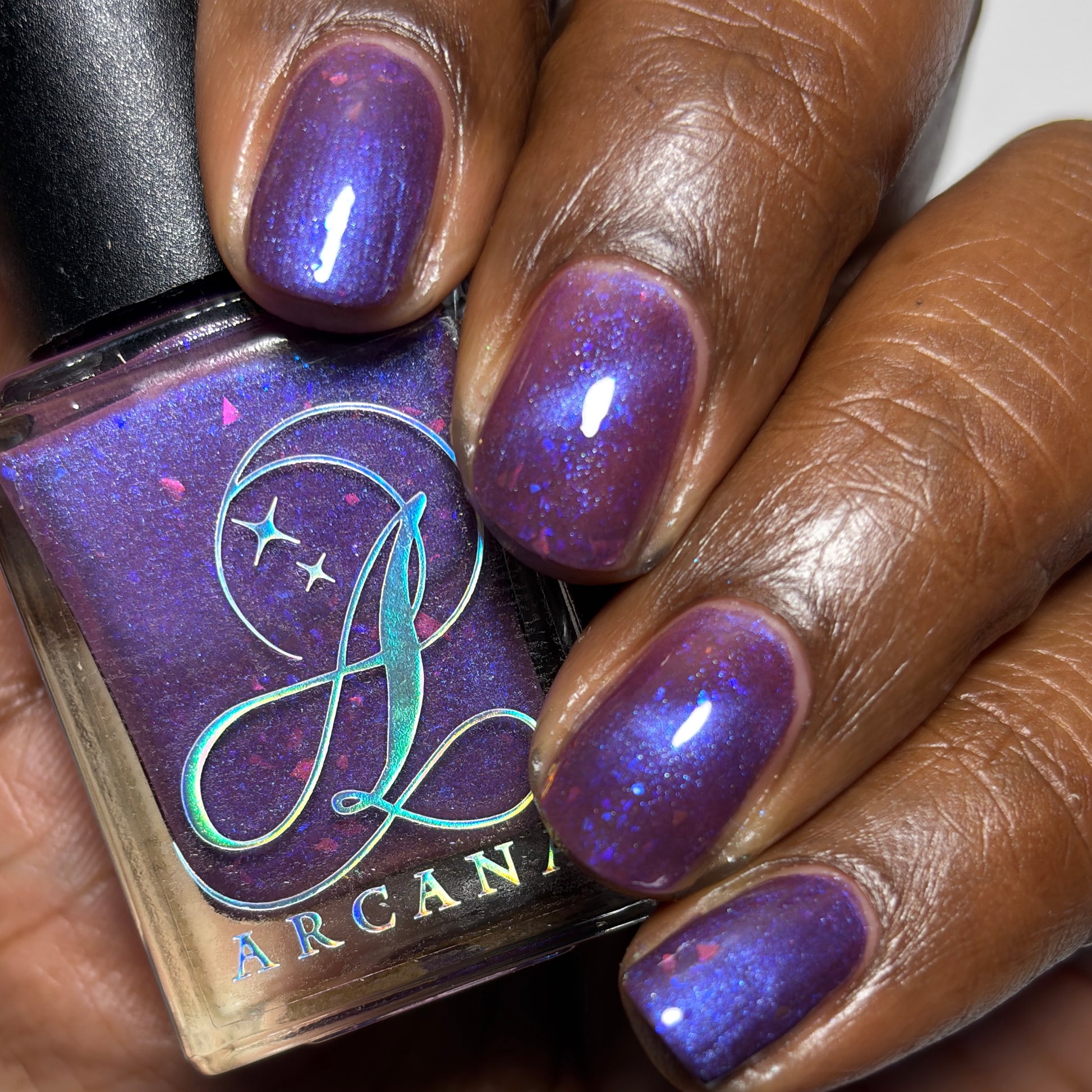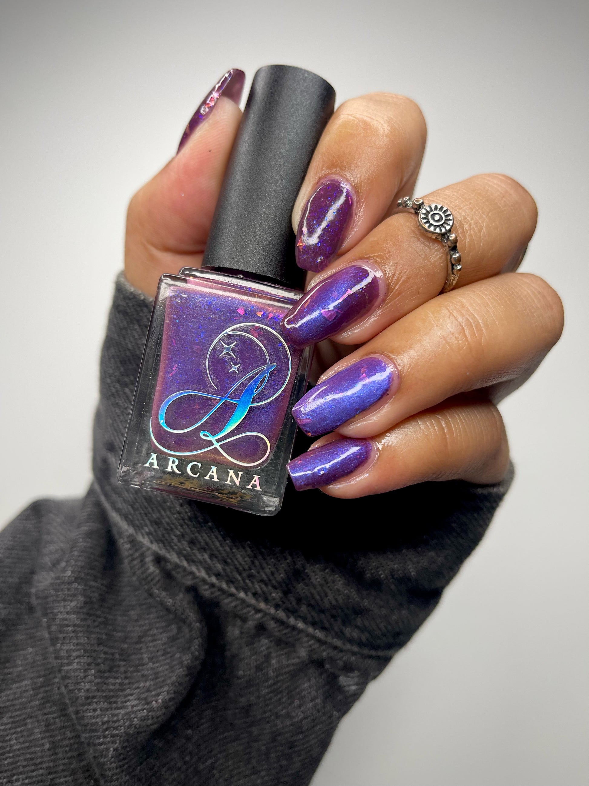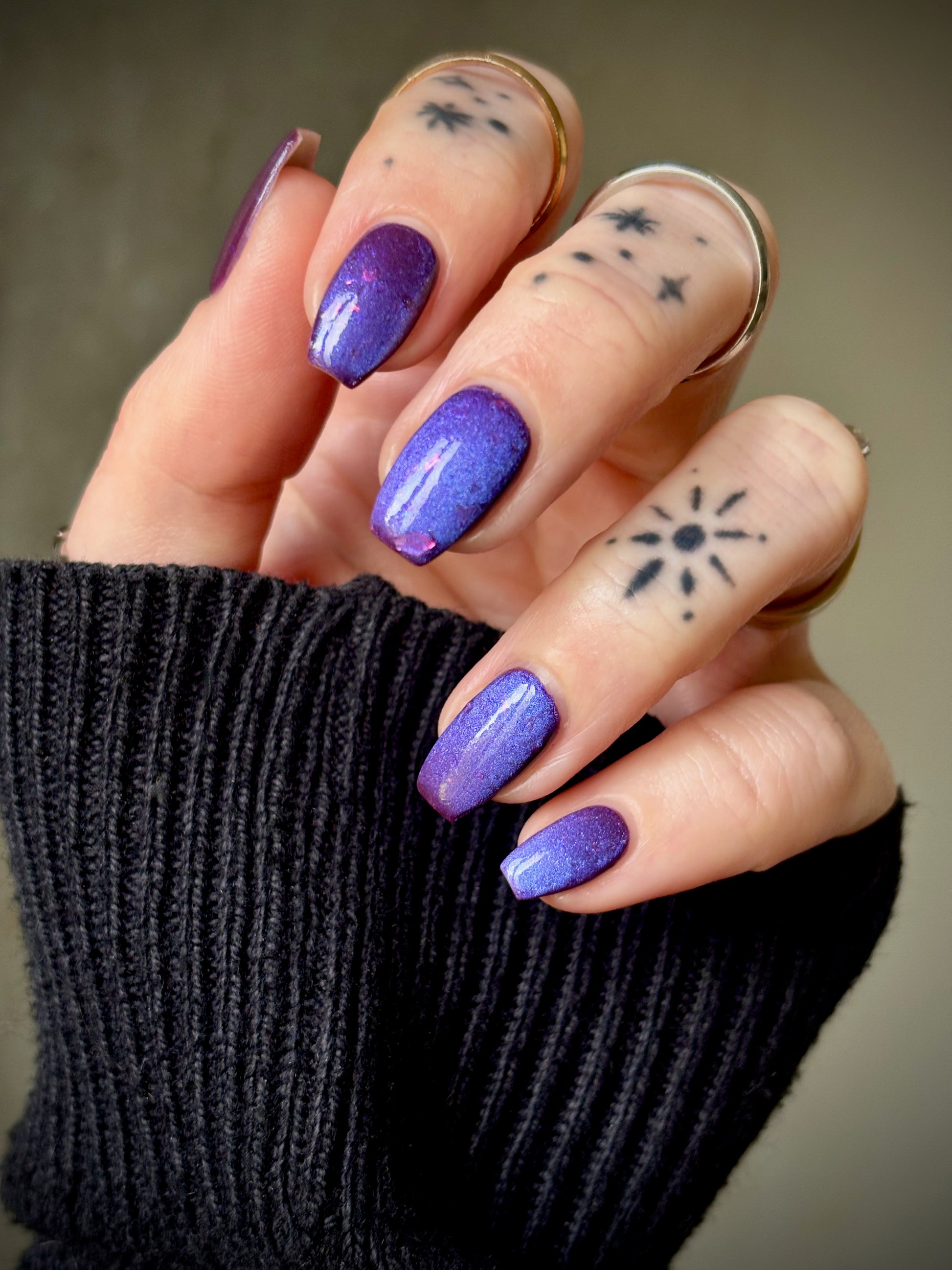 This polish is a dark reddish purple with bright pink to green flakes, ghostly purple to blue flakes, and aqua to blue to purple magnetic pigment.