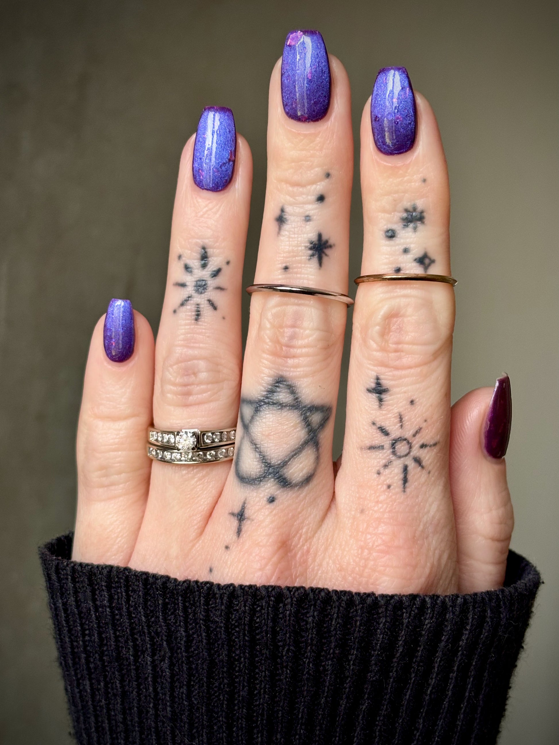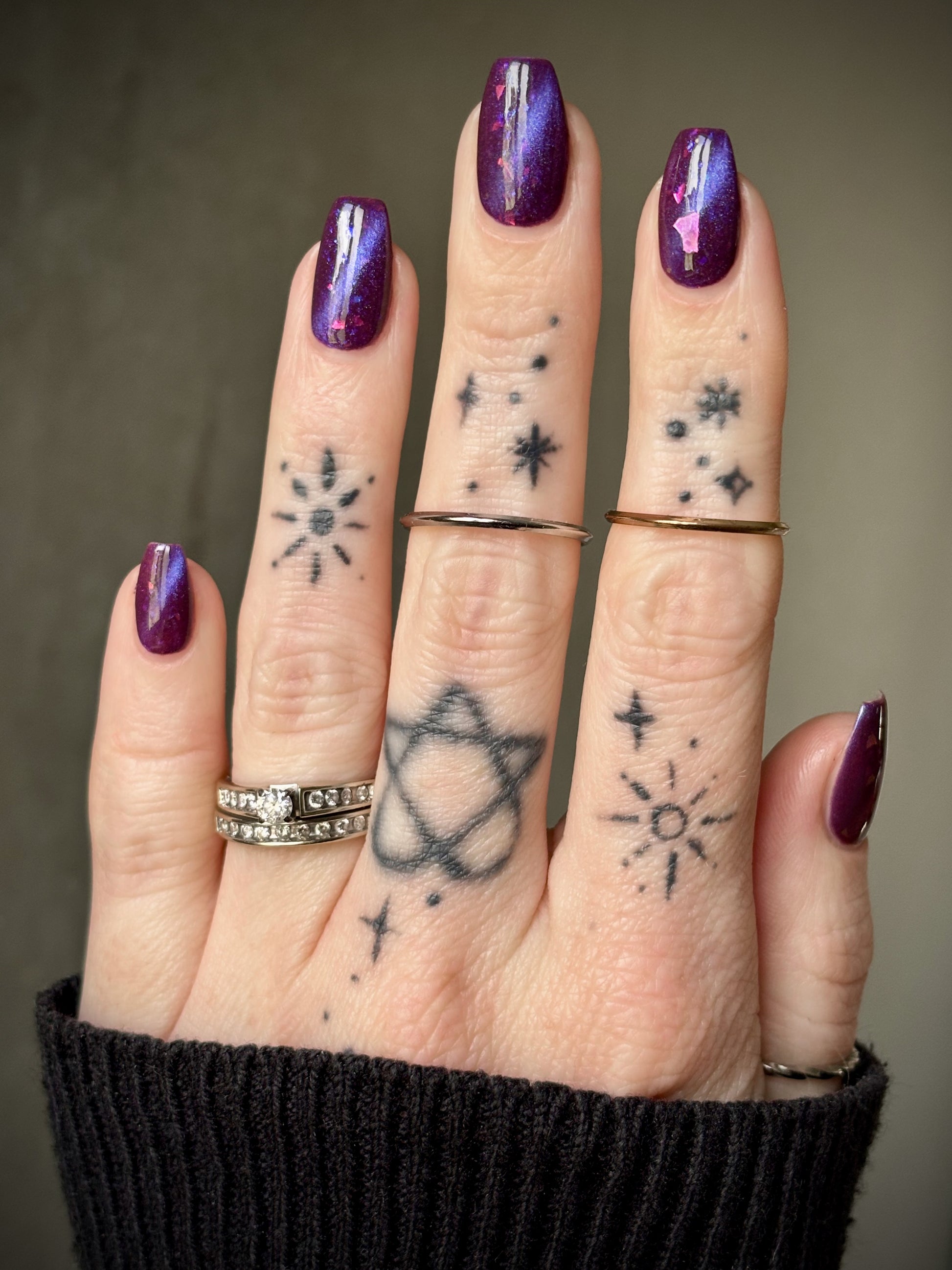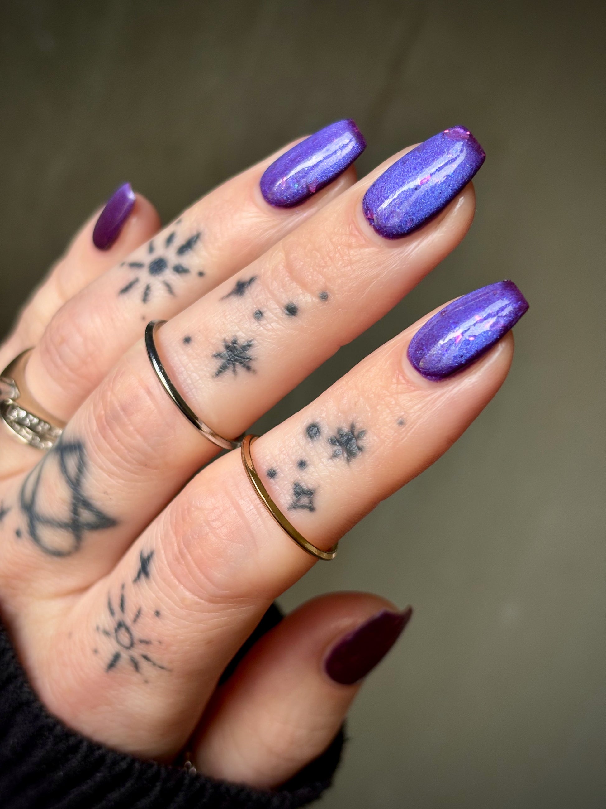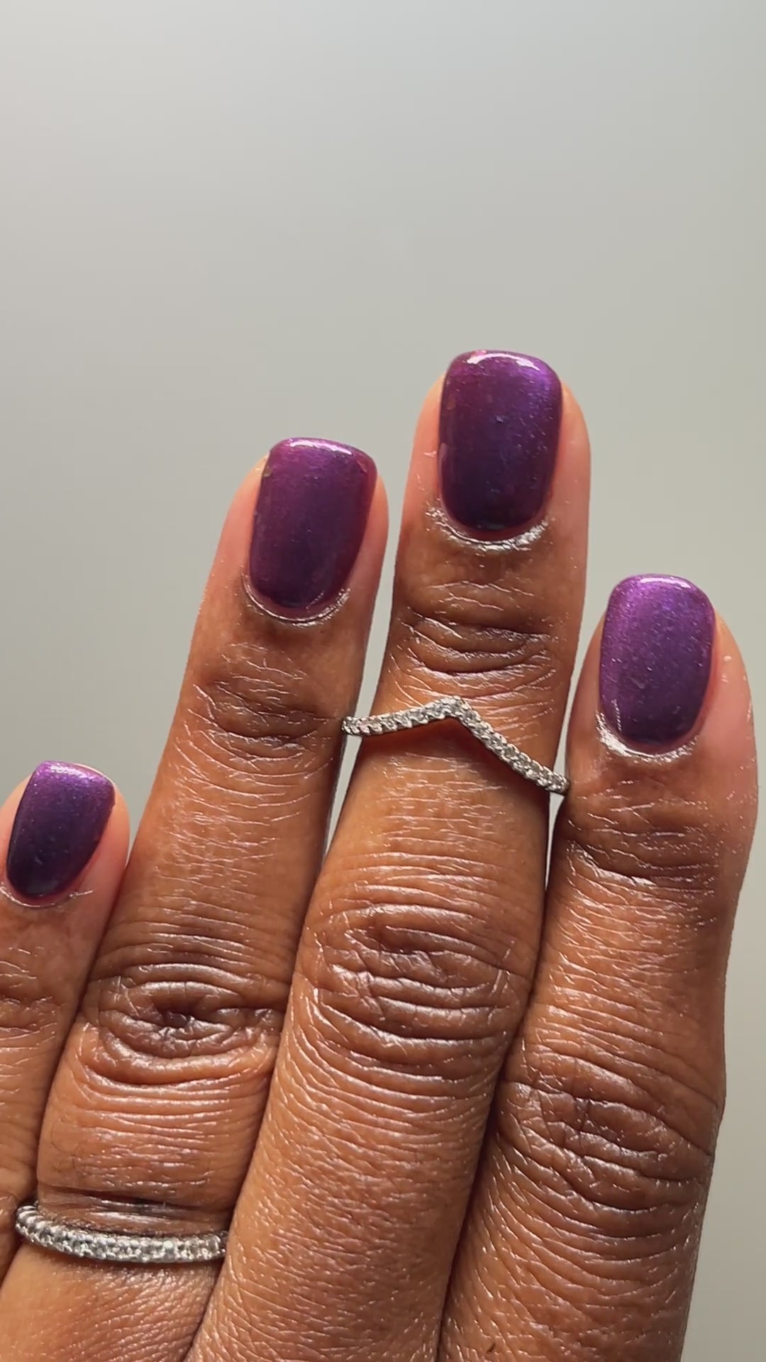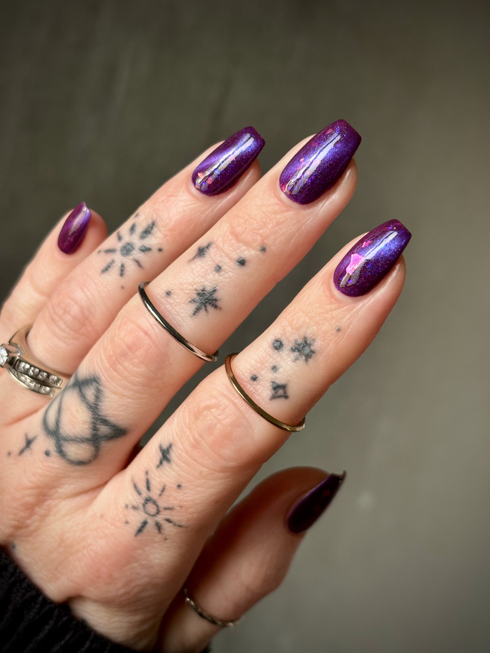 This polish is a dark reddish purple with bright pink to green flakes, ghostly purple to blue flakes, and aqua to blue to purple magnetic pigment.