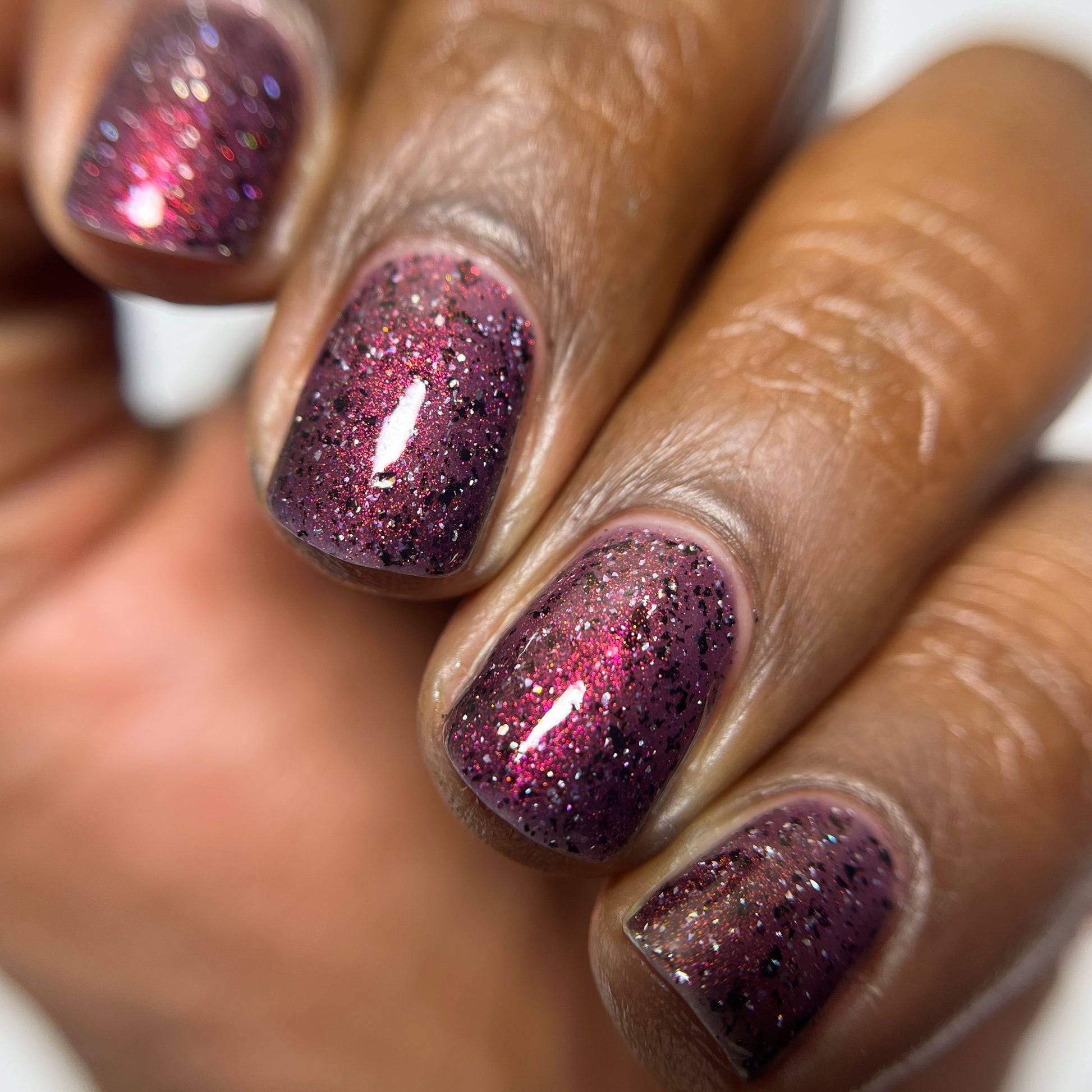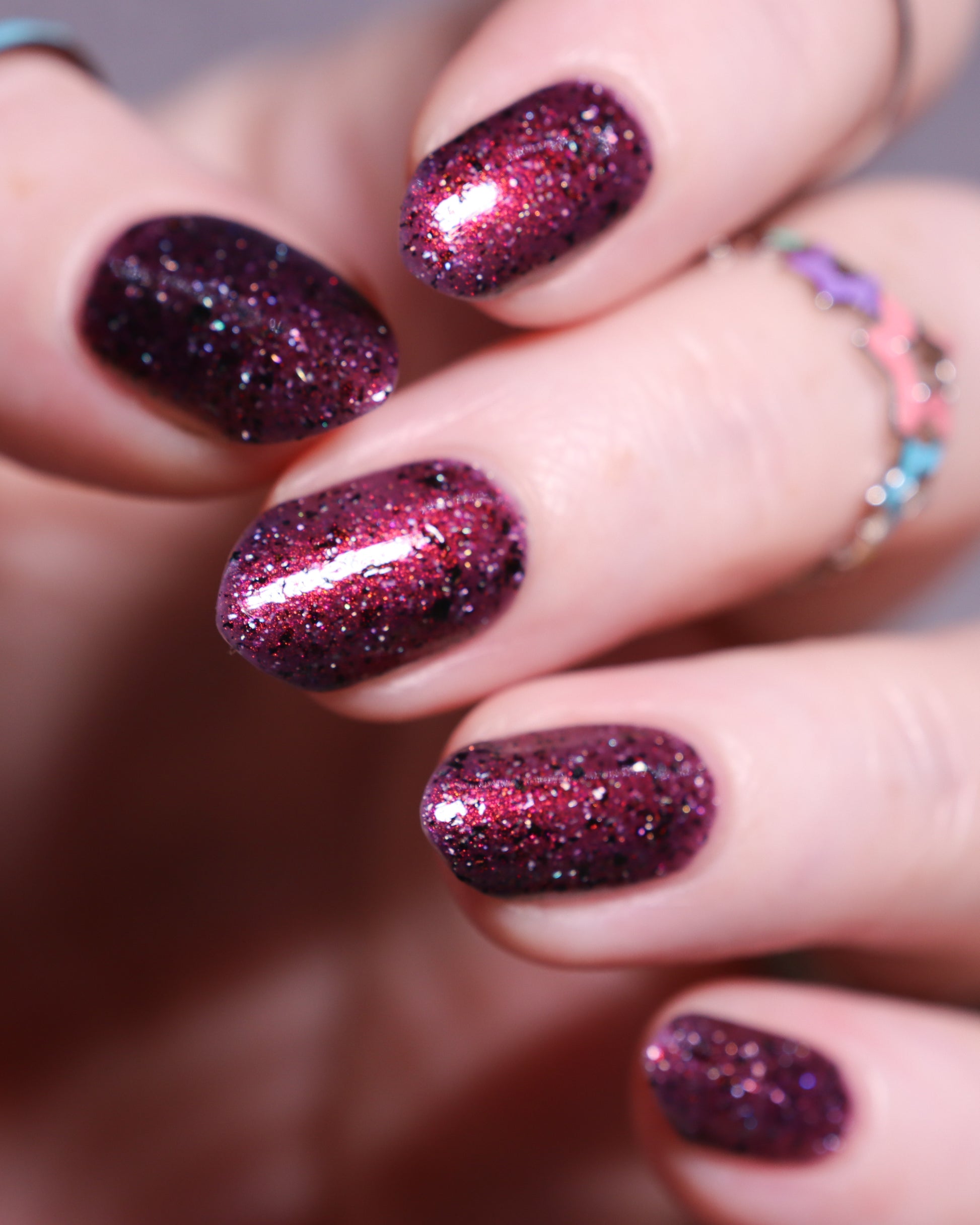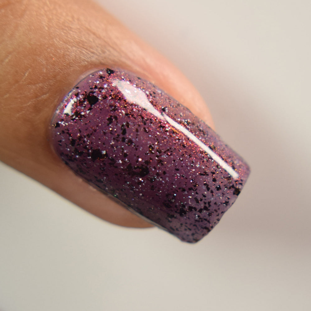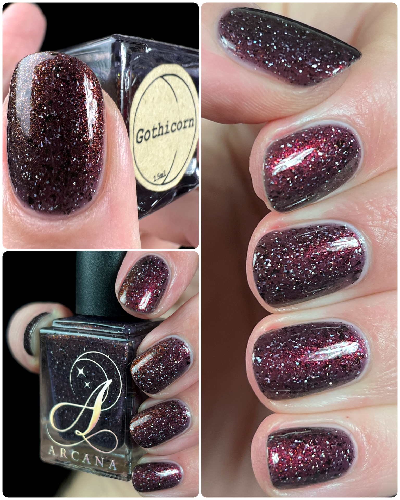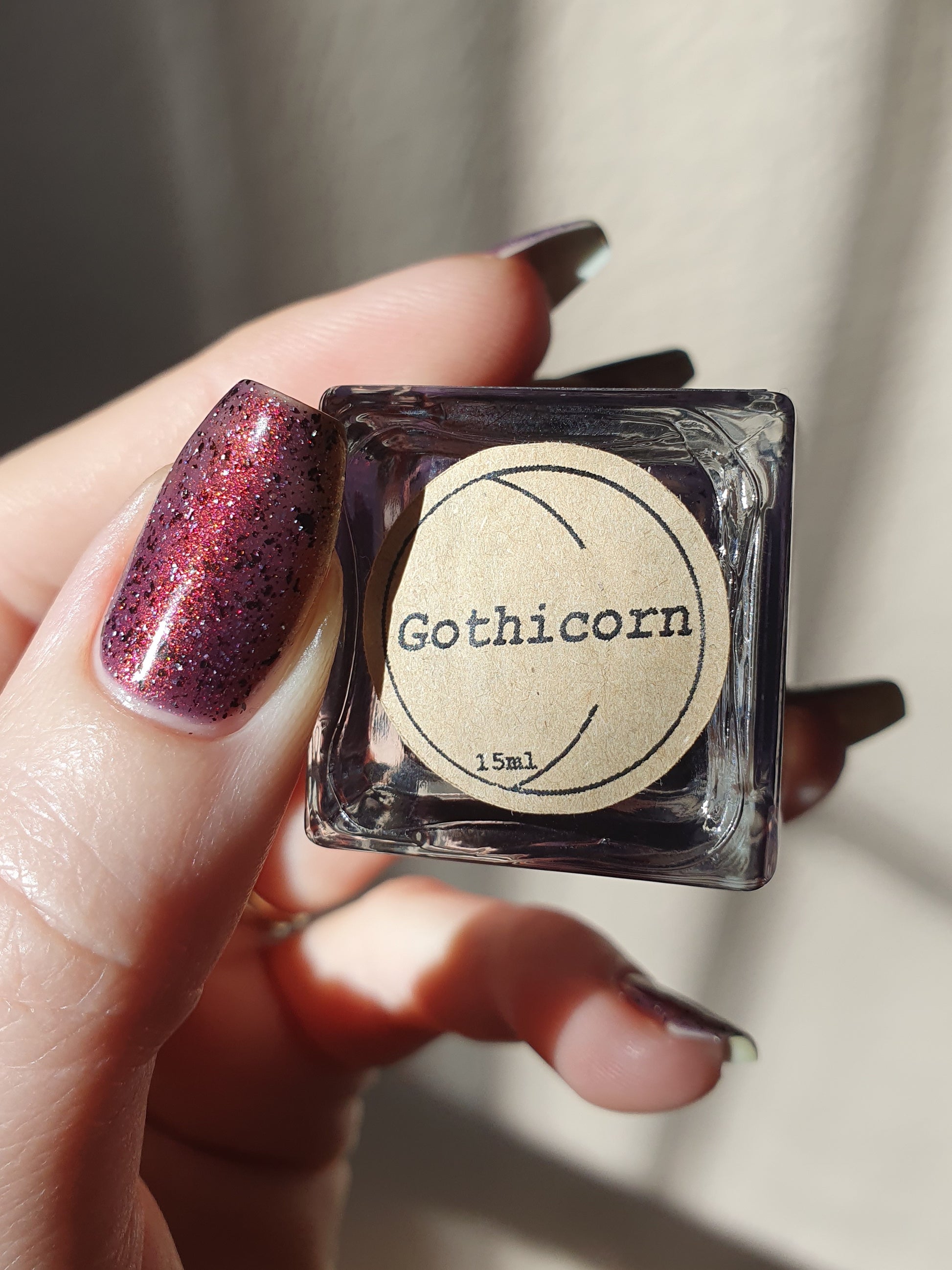 Gothicorn has a deep violet jelly base, red to orange shimmer, black flakes, and holographic microflakes!