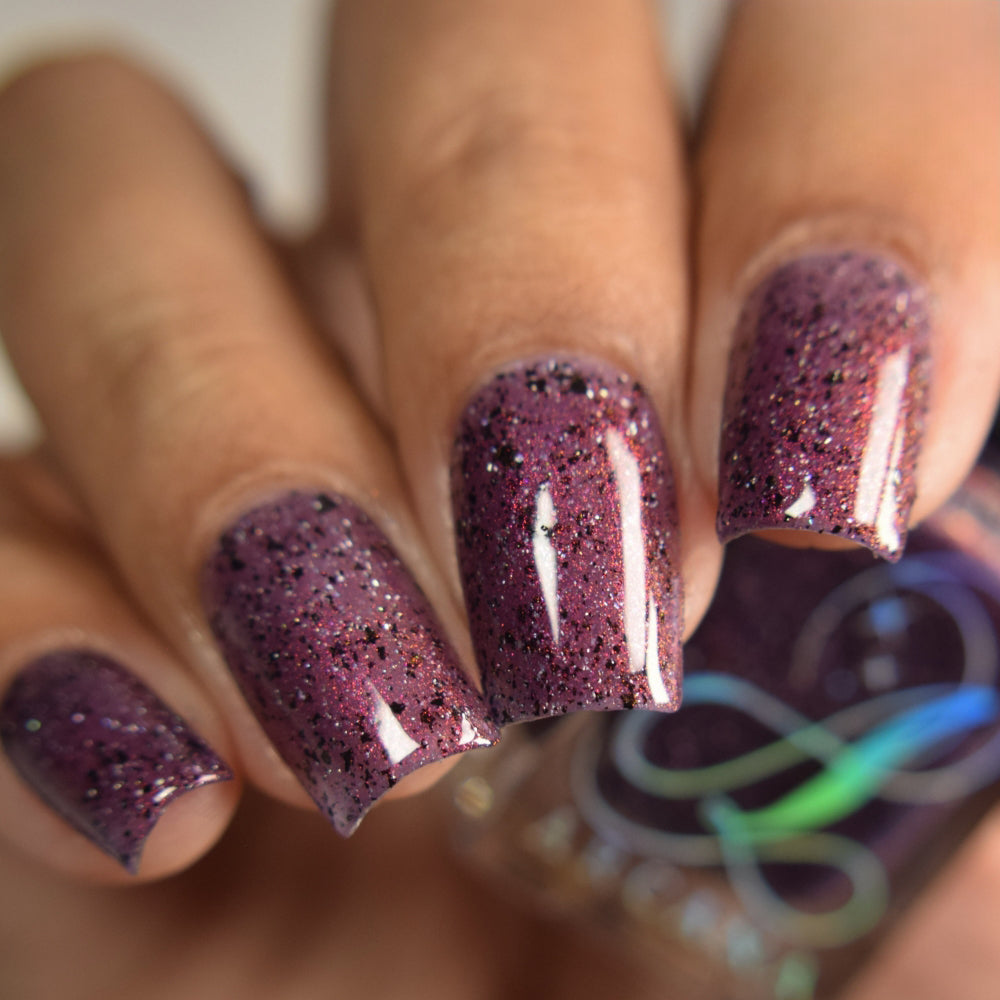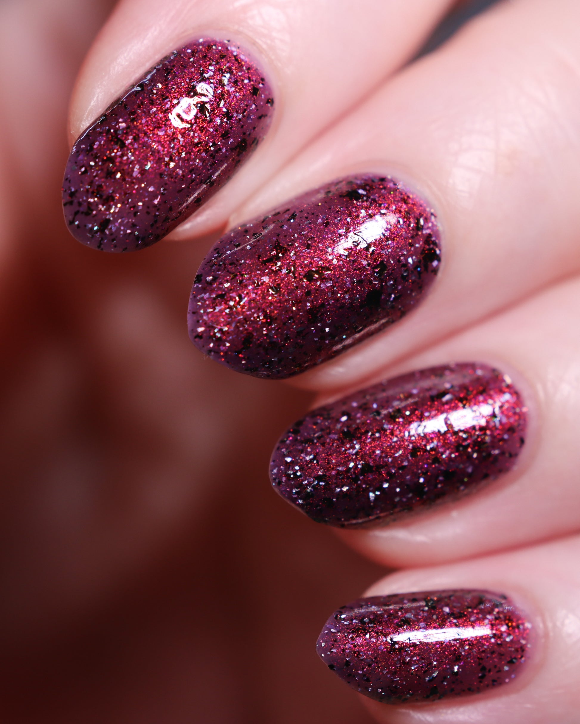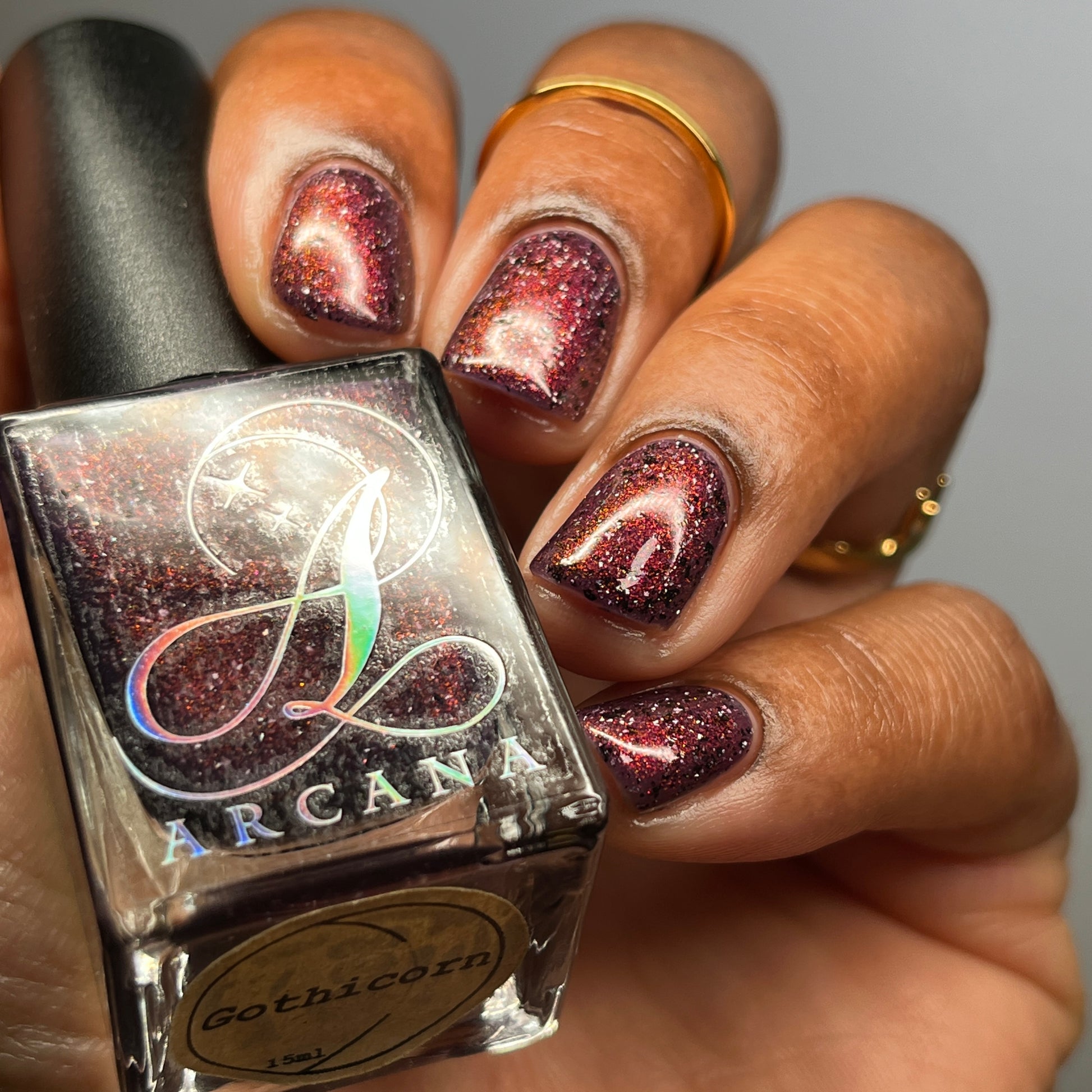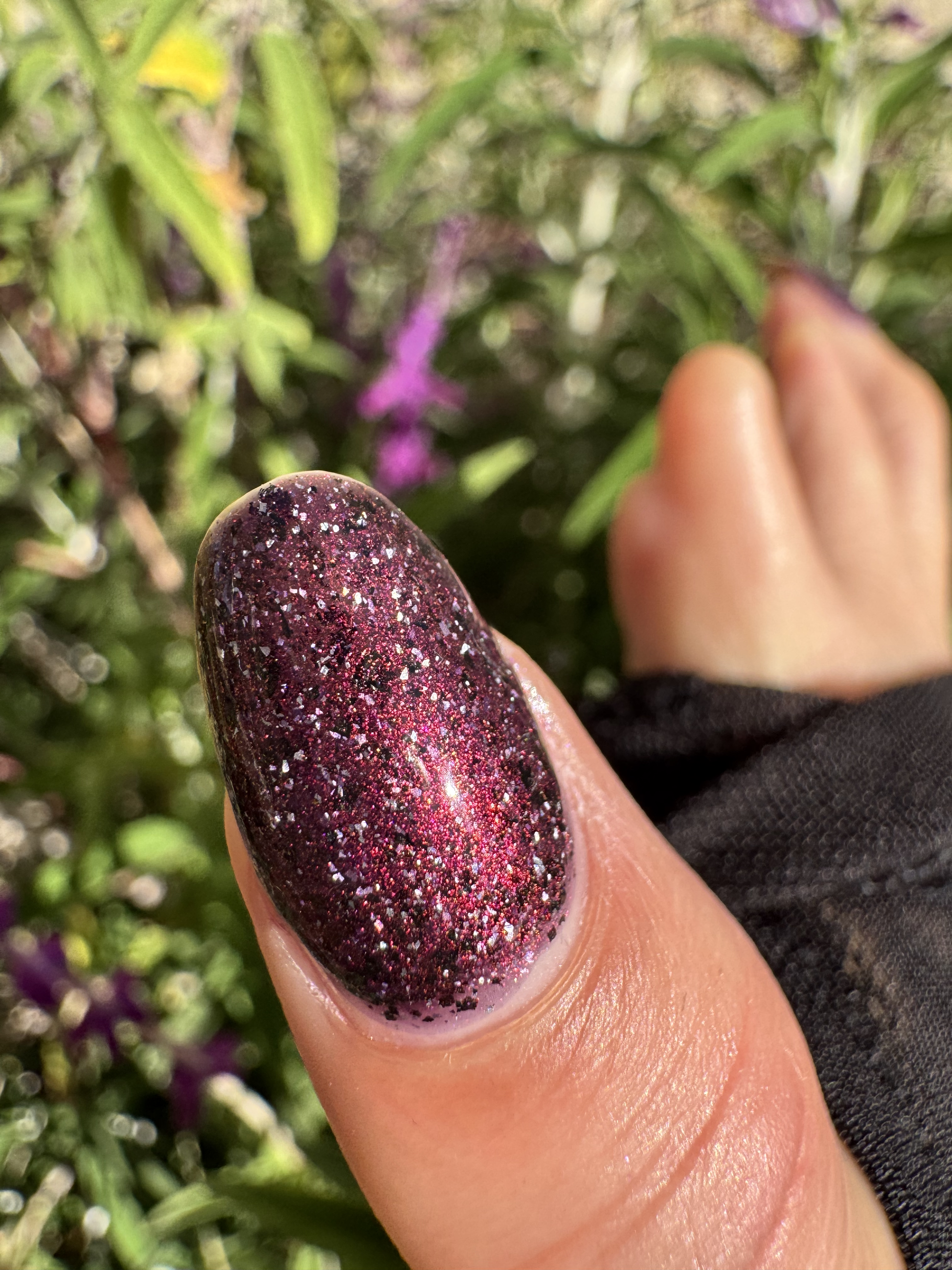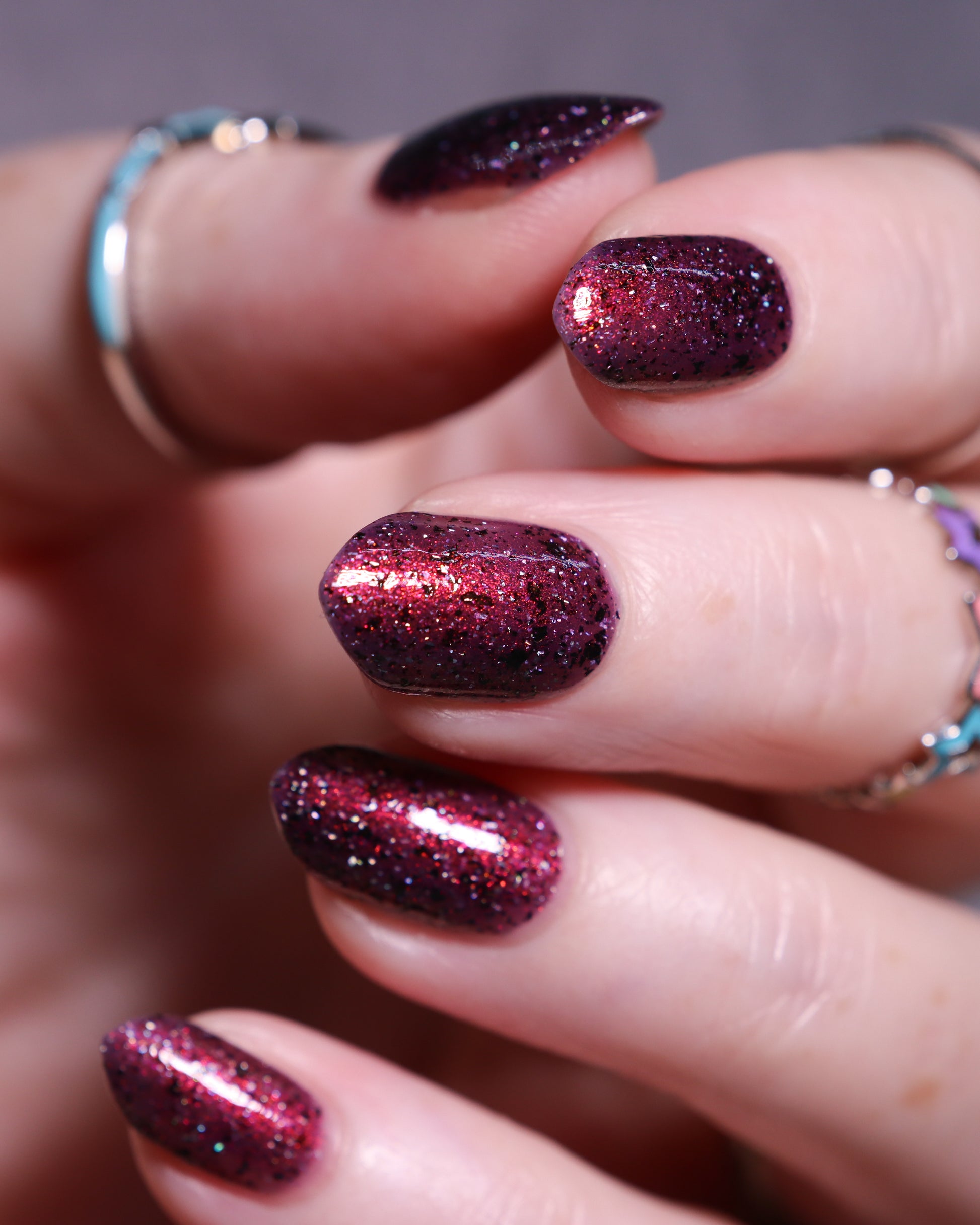 Gothicorn has a deep violet jelly base, red to orange shimmer, black flakes, and holographic microflakes!