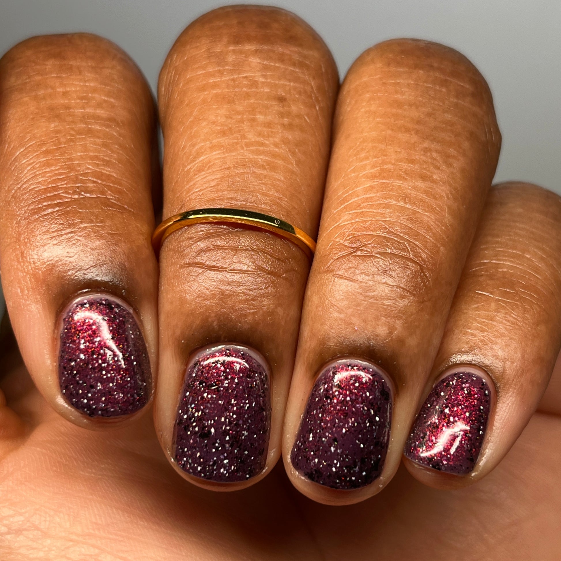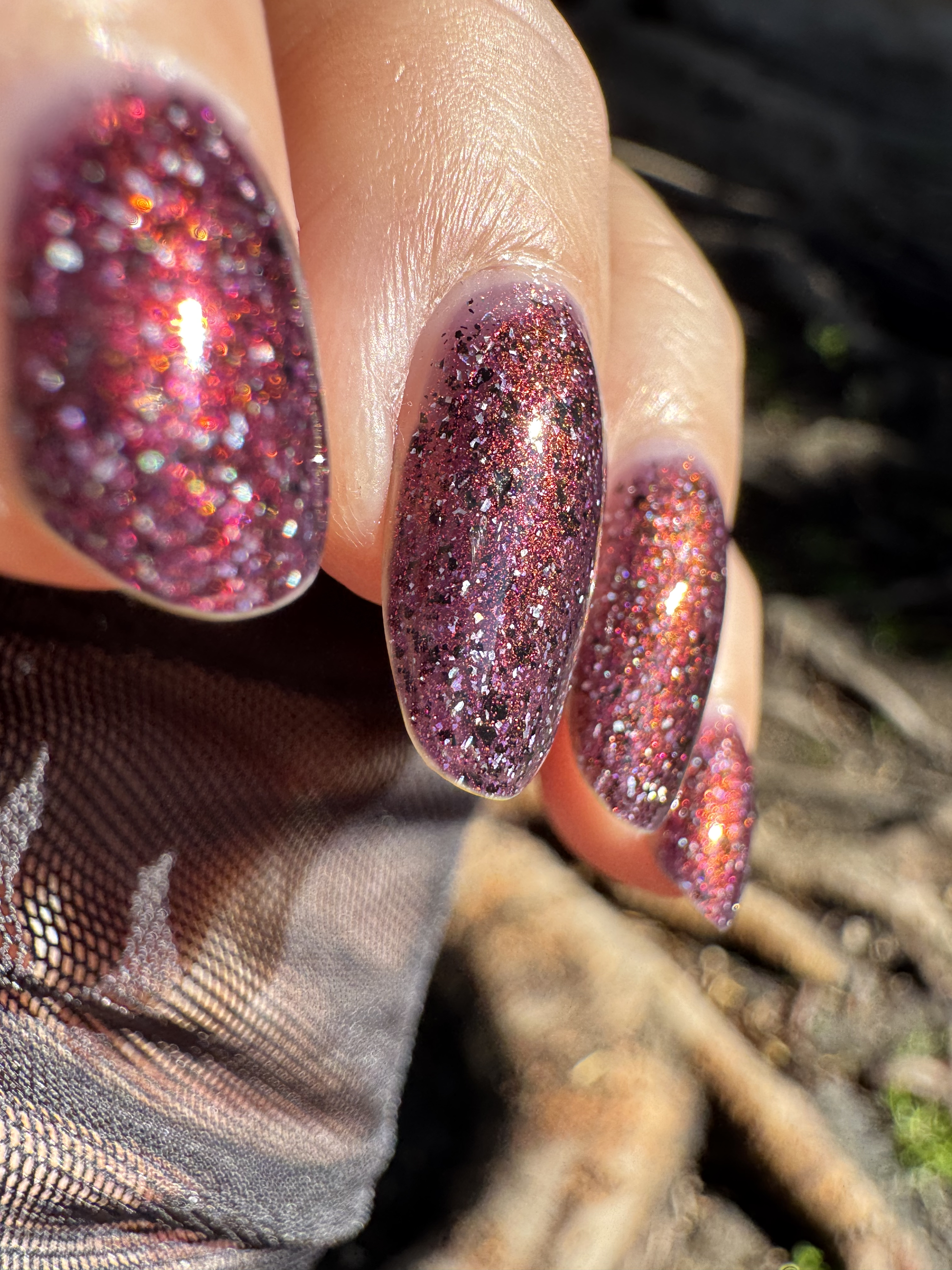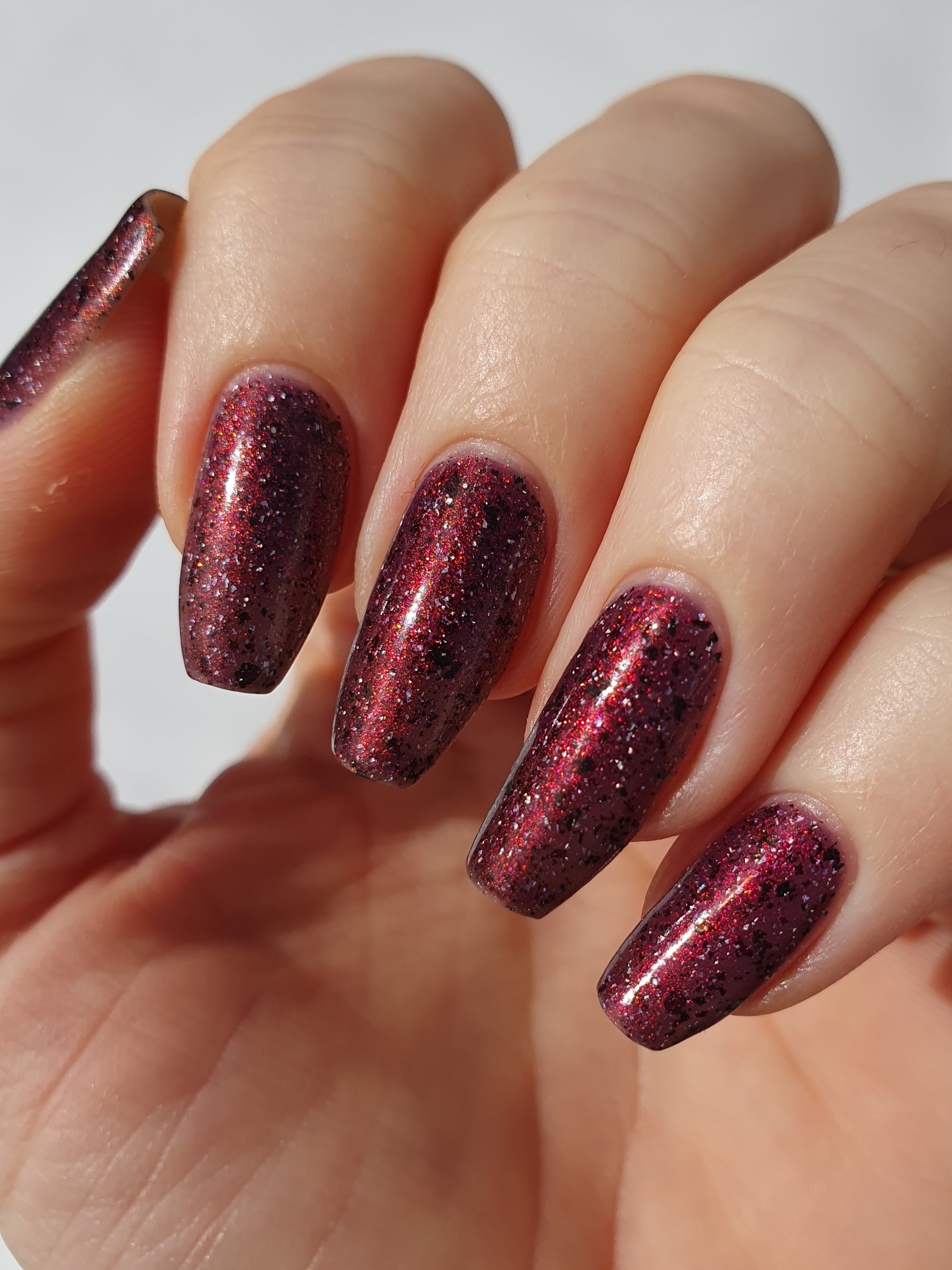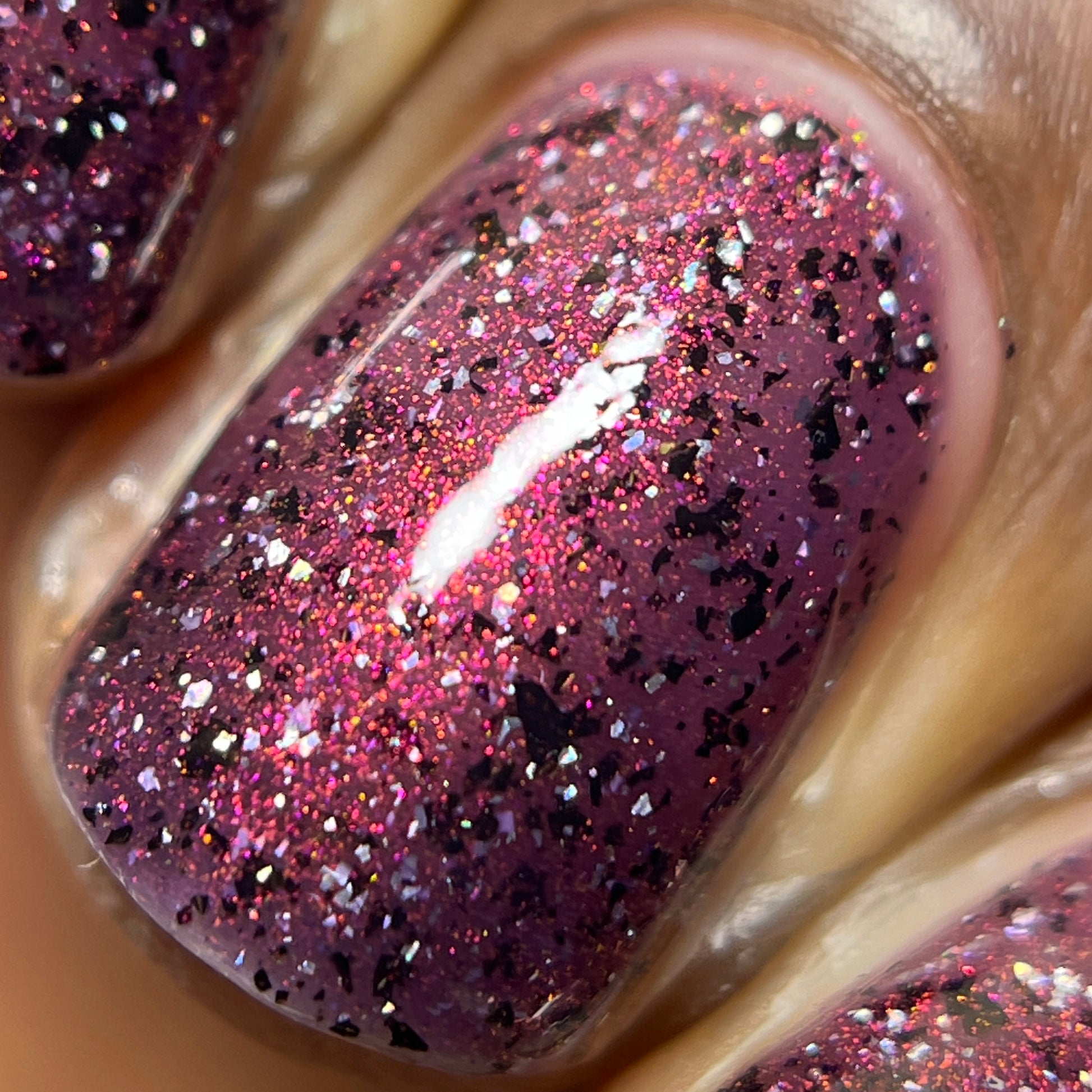 Gothicorn has a deep violet jelly base, red to orange shimmer, black flakes, and holographic microflakes!