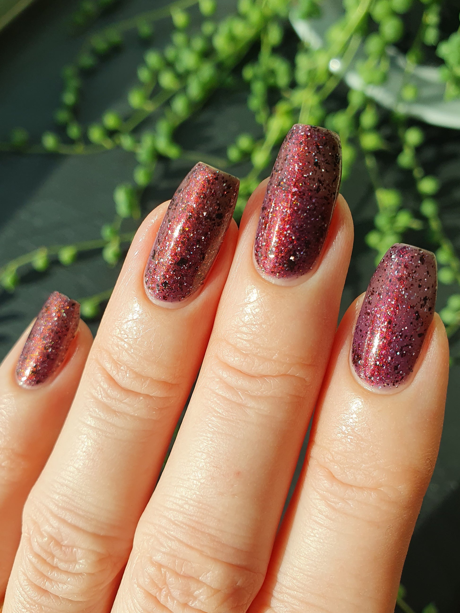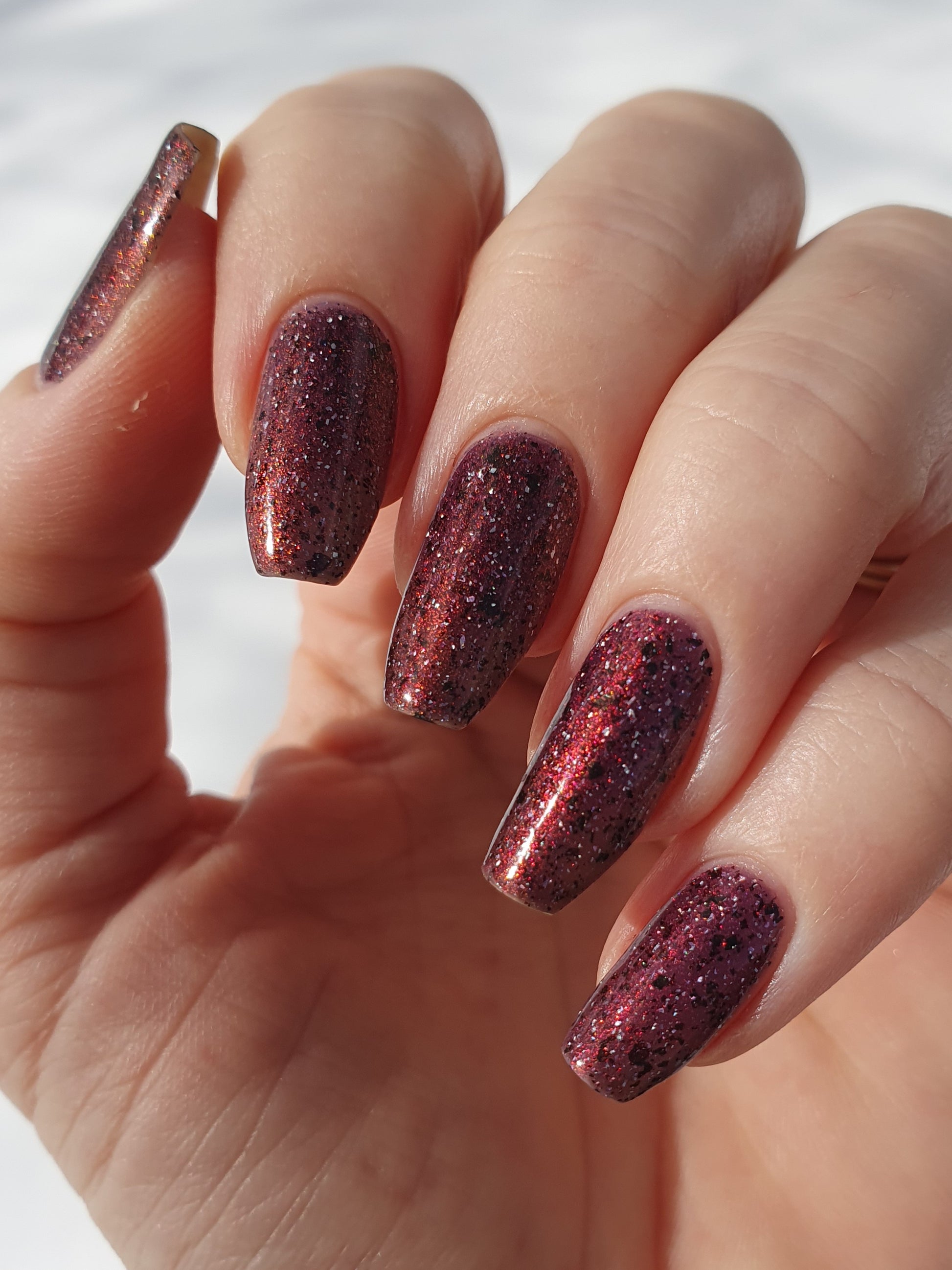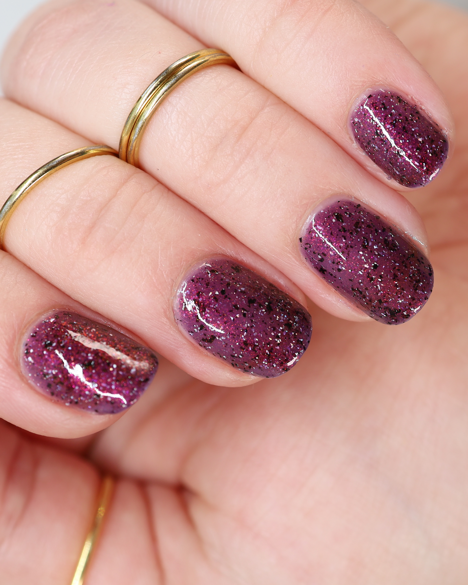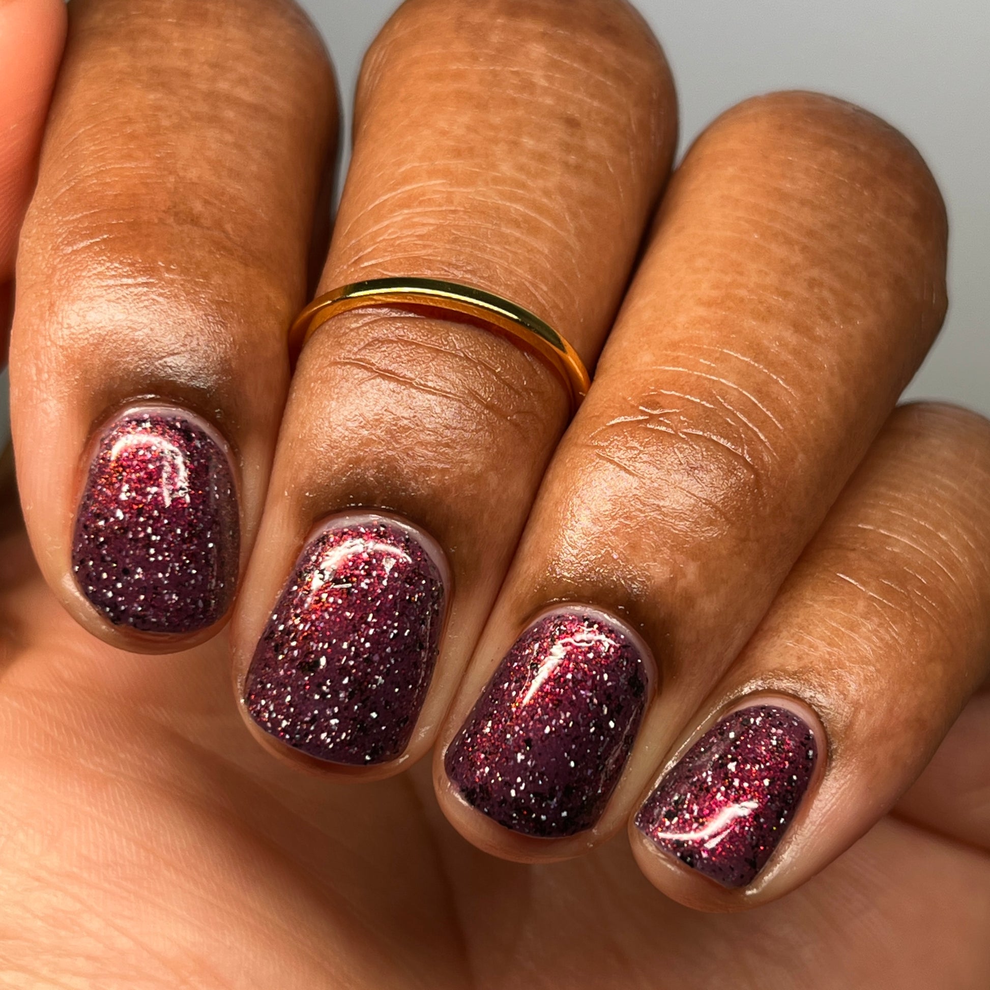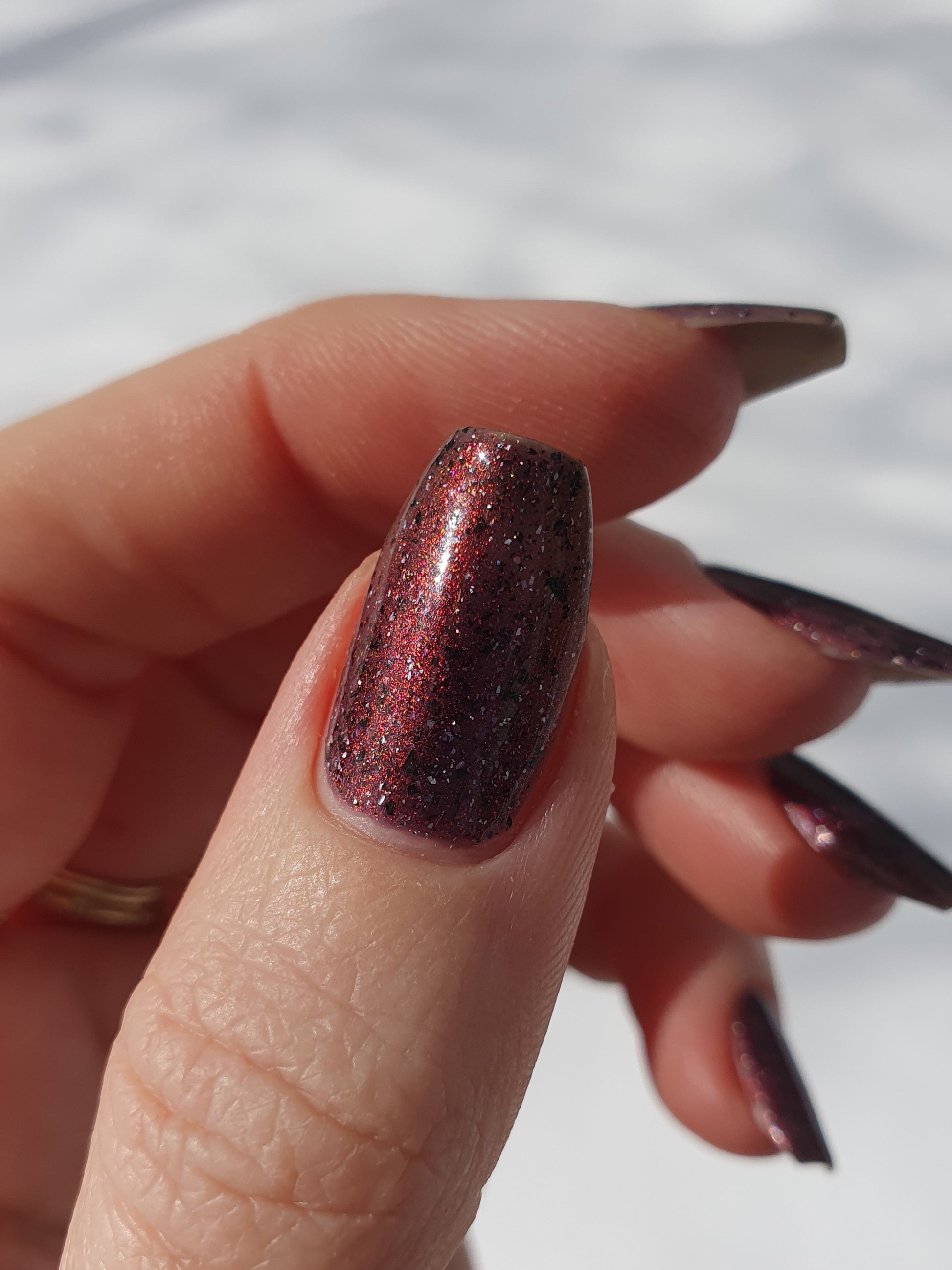 Gothicorn has a deep violet jelly base, red to orange shimmer, black flakes, and holographic microflakes!