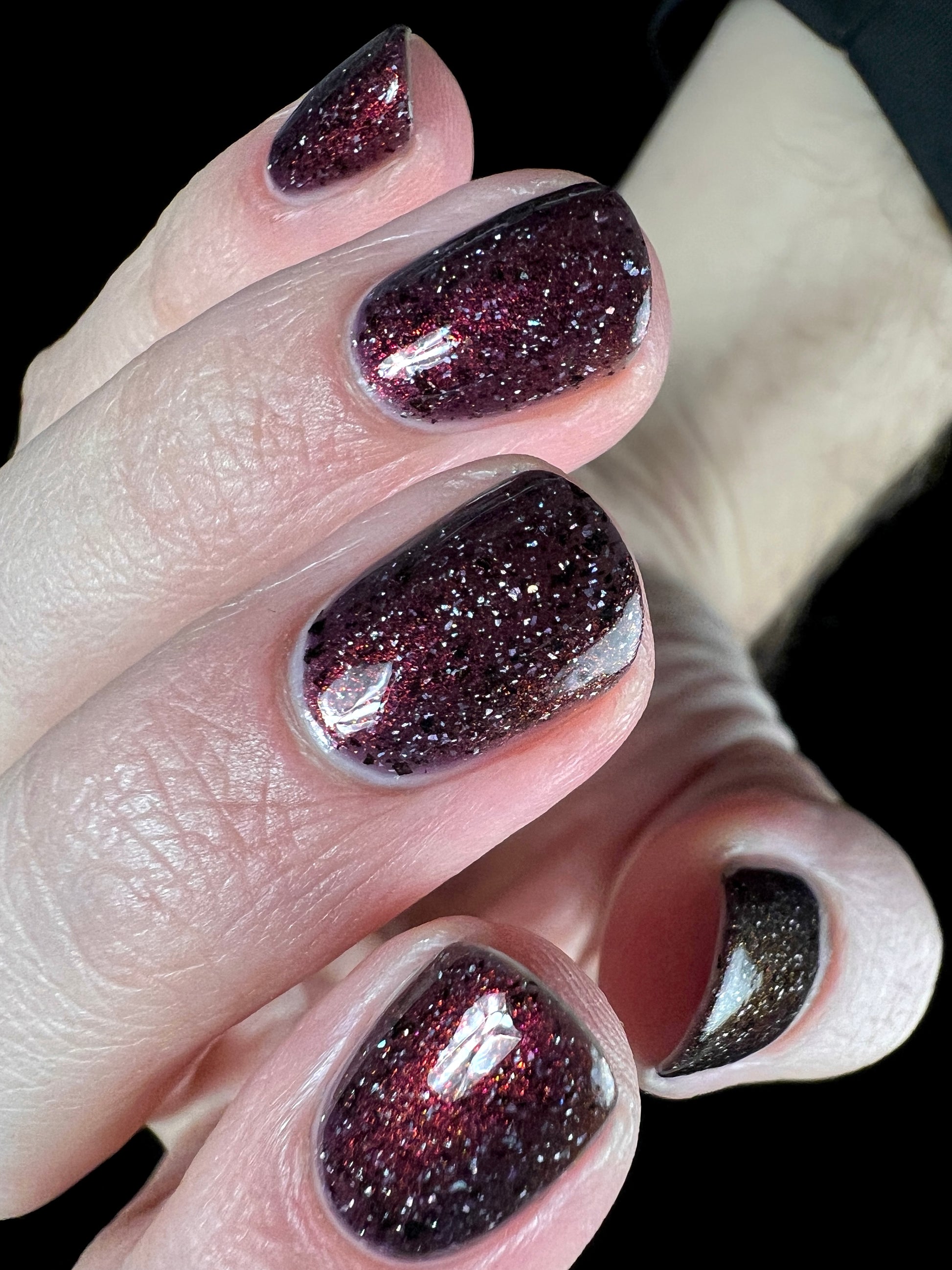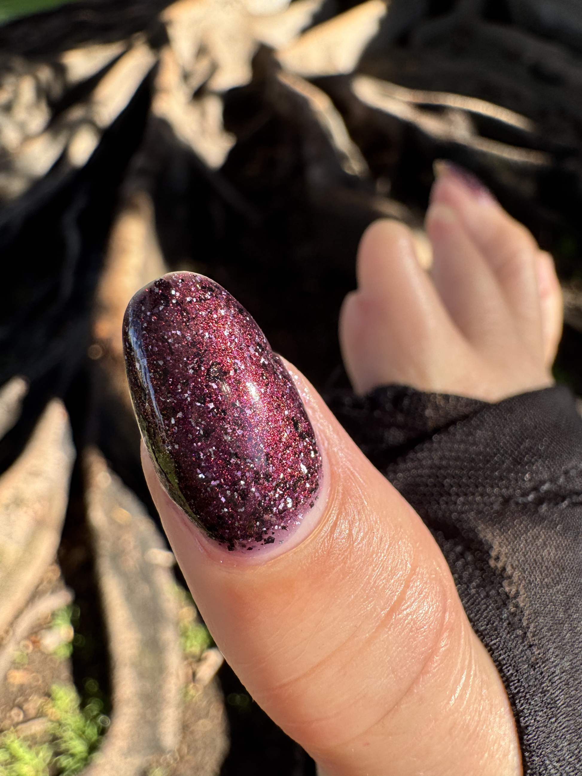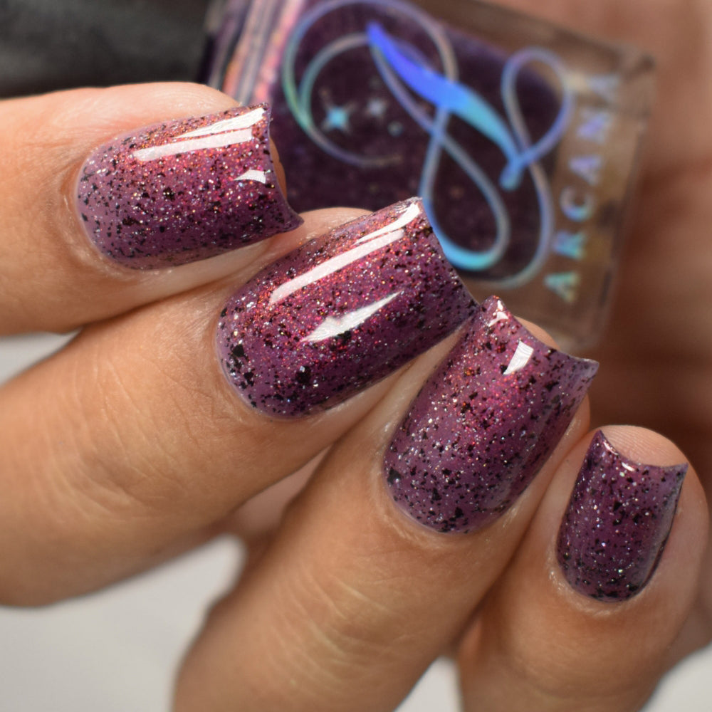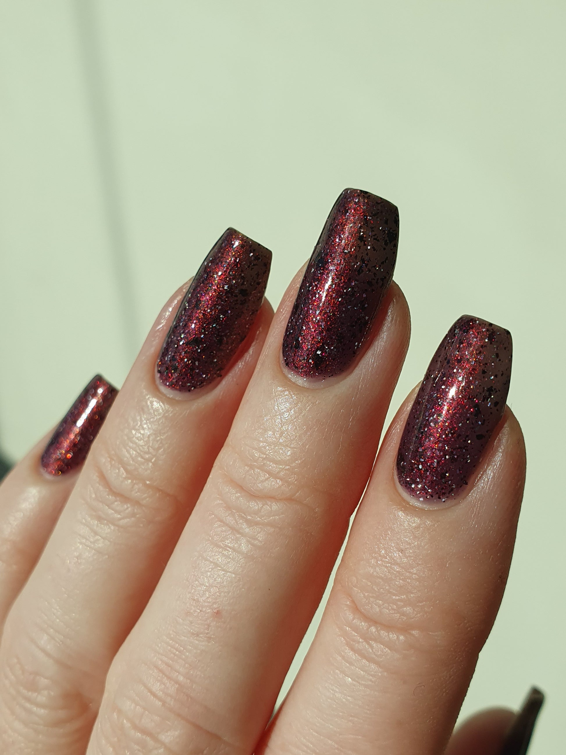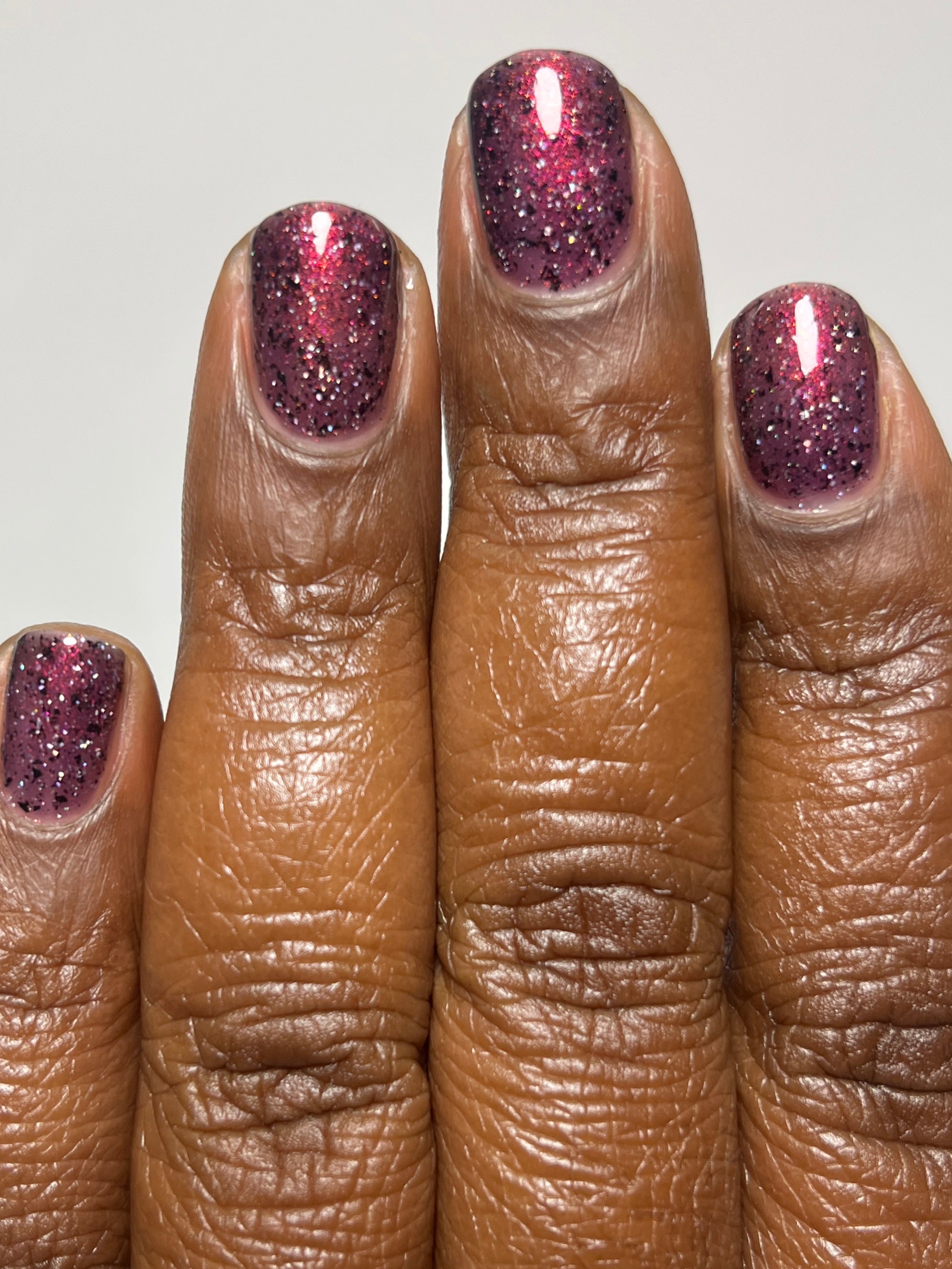 Gothicorn has a deep violet jelly base, red to orange shimmer, black flakes, and holographic microflakes!
