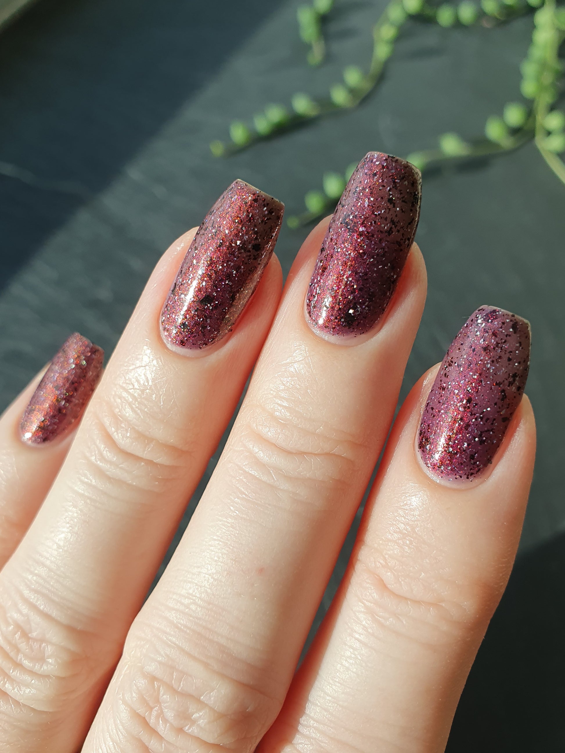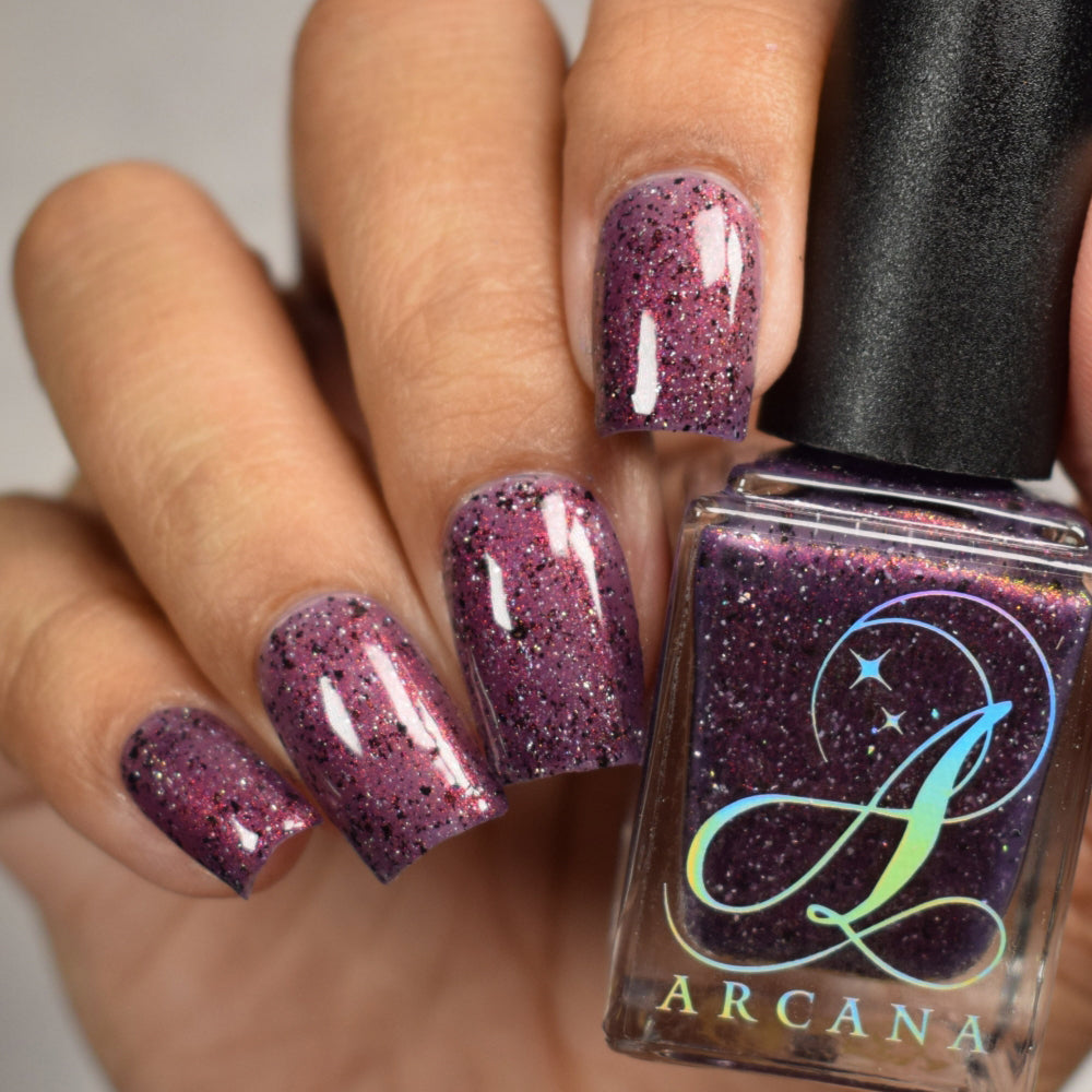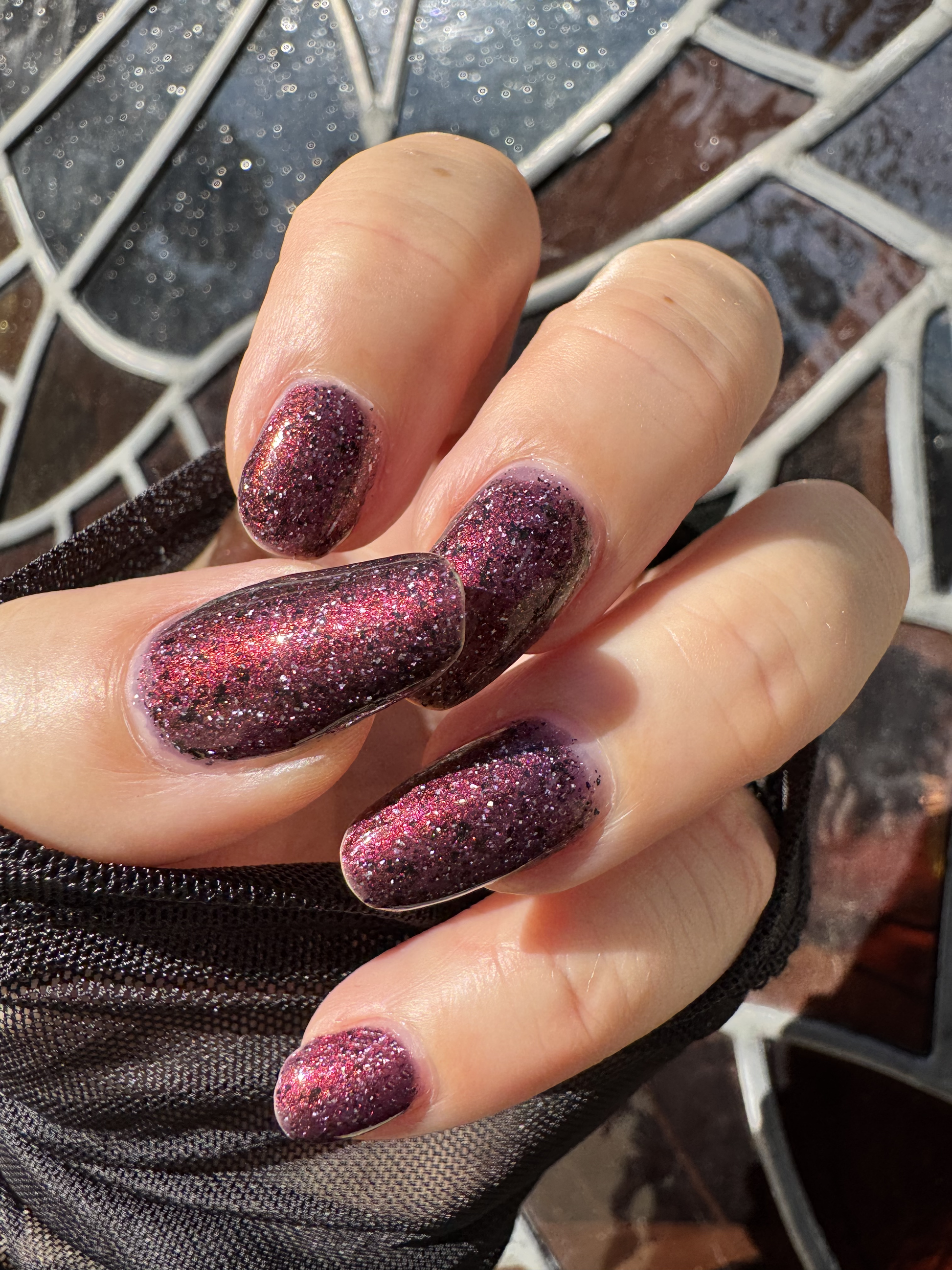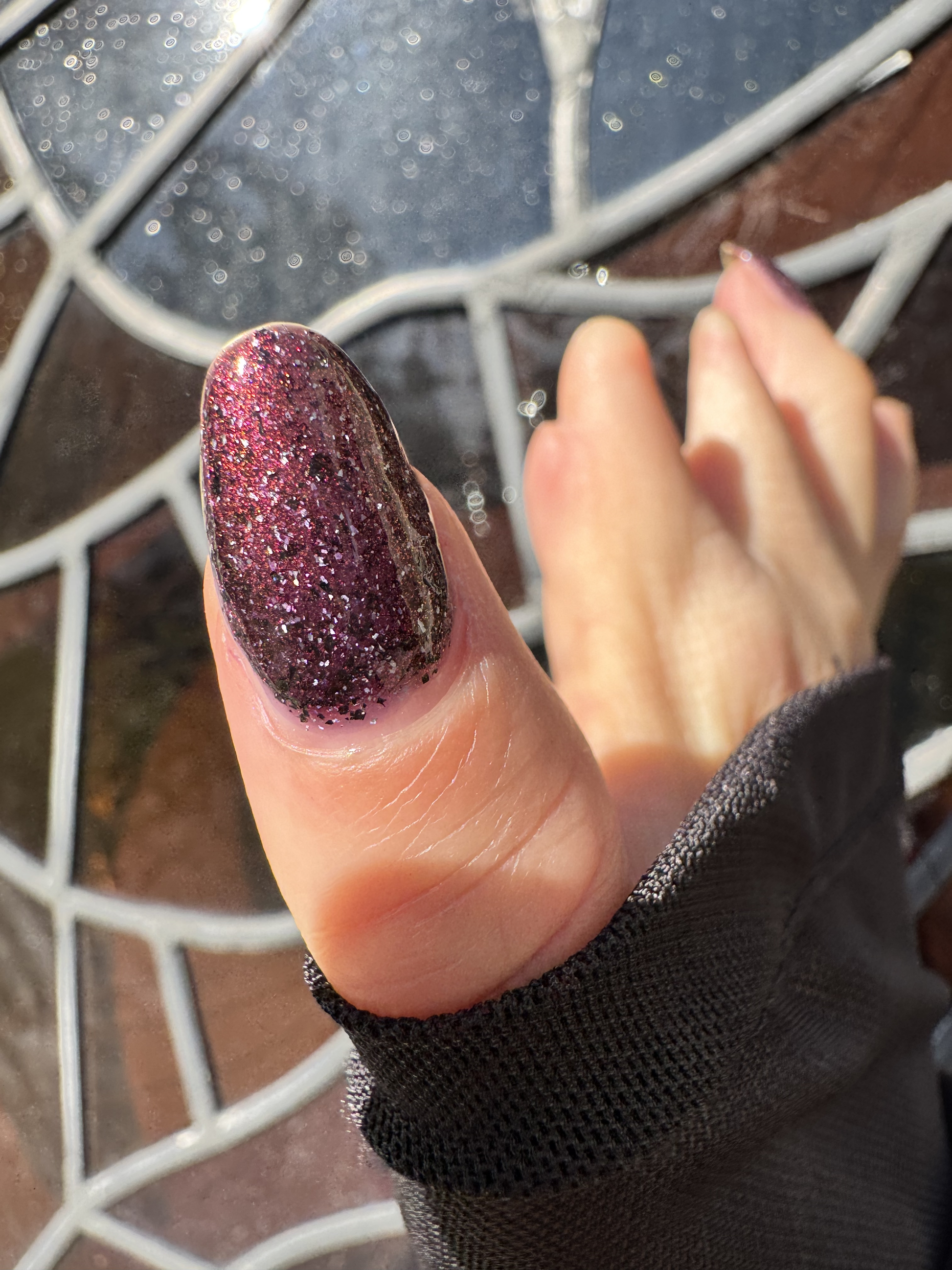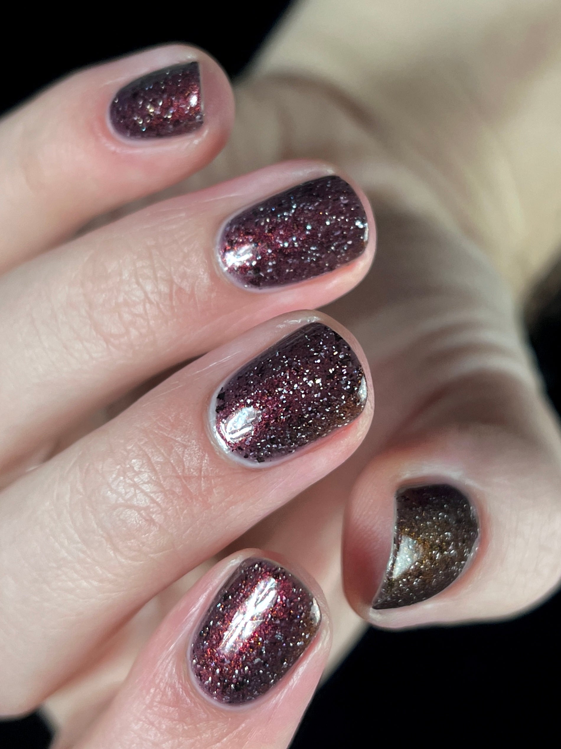 Gothicorn has a deep violet jelly base, red to orange shimmer, black flakes, and holographic microflakes!