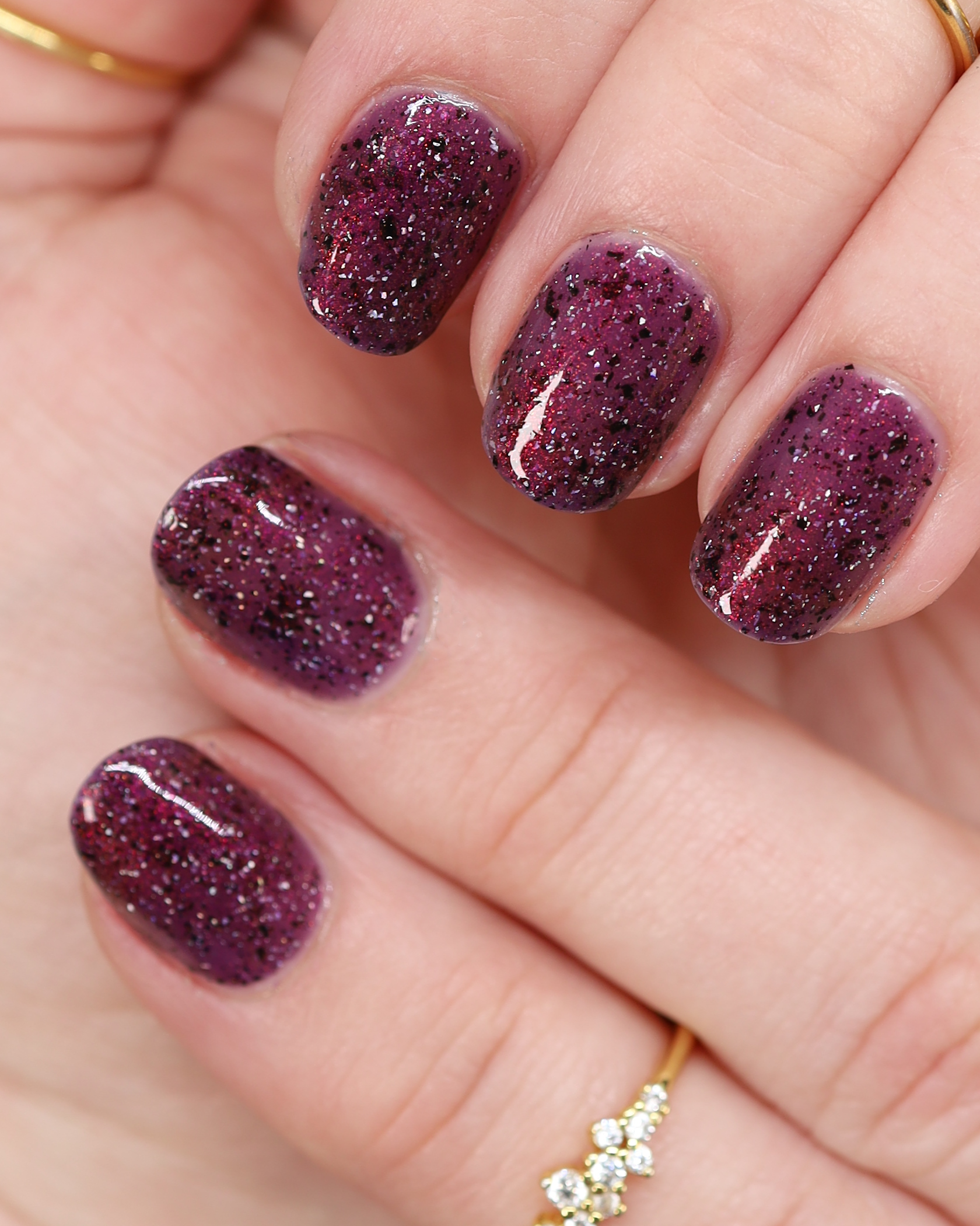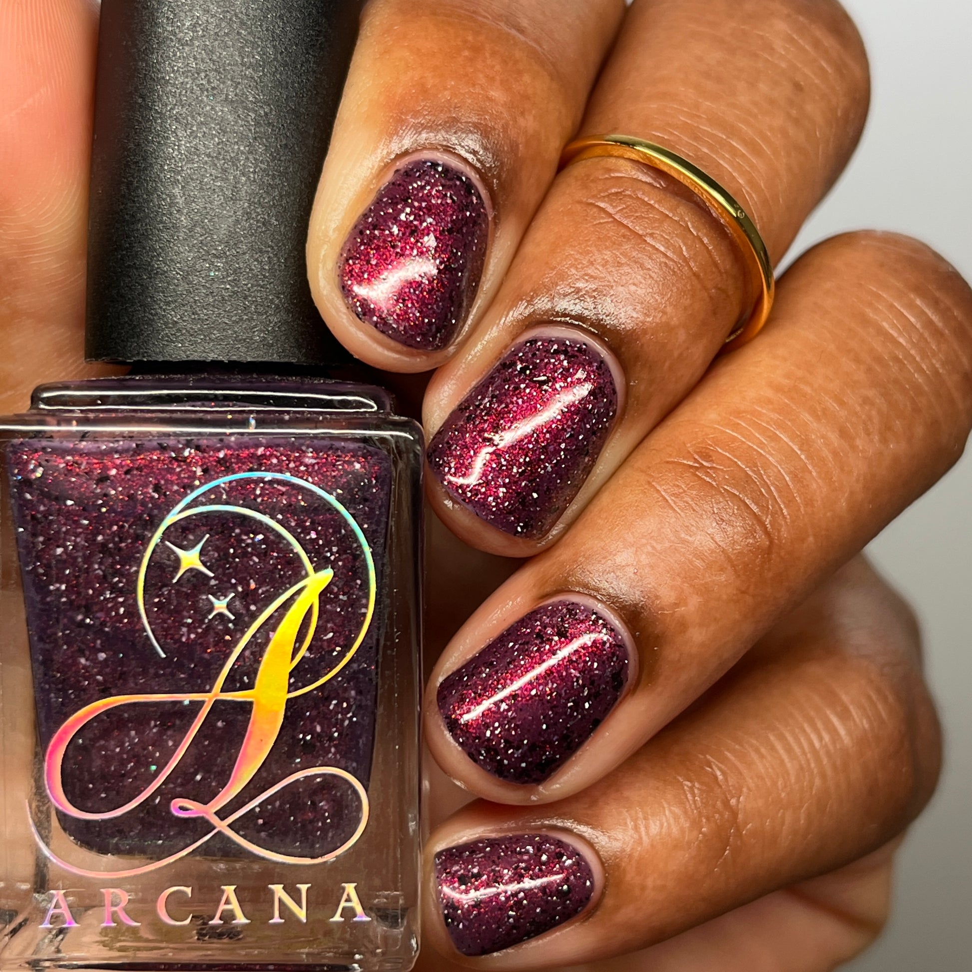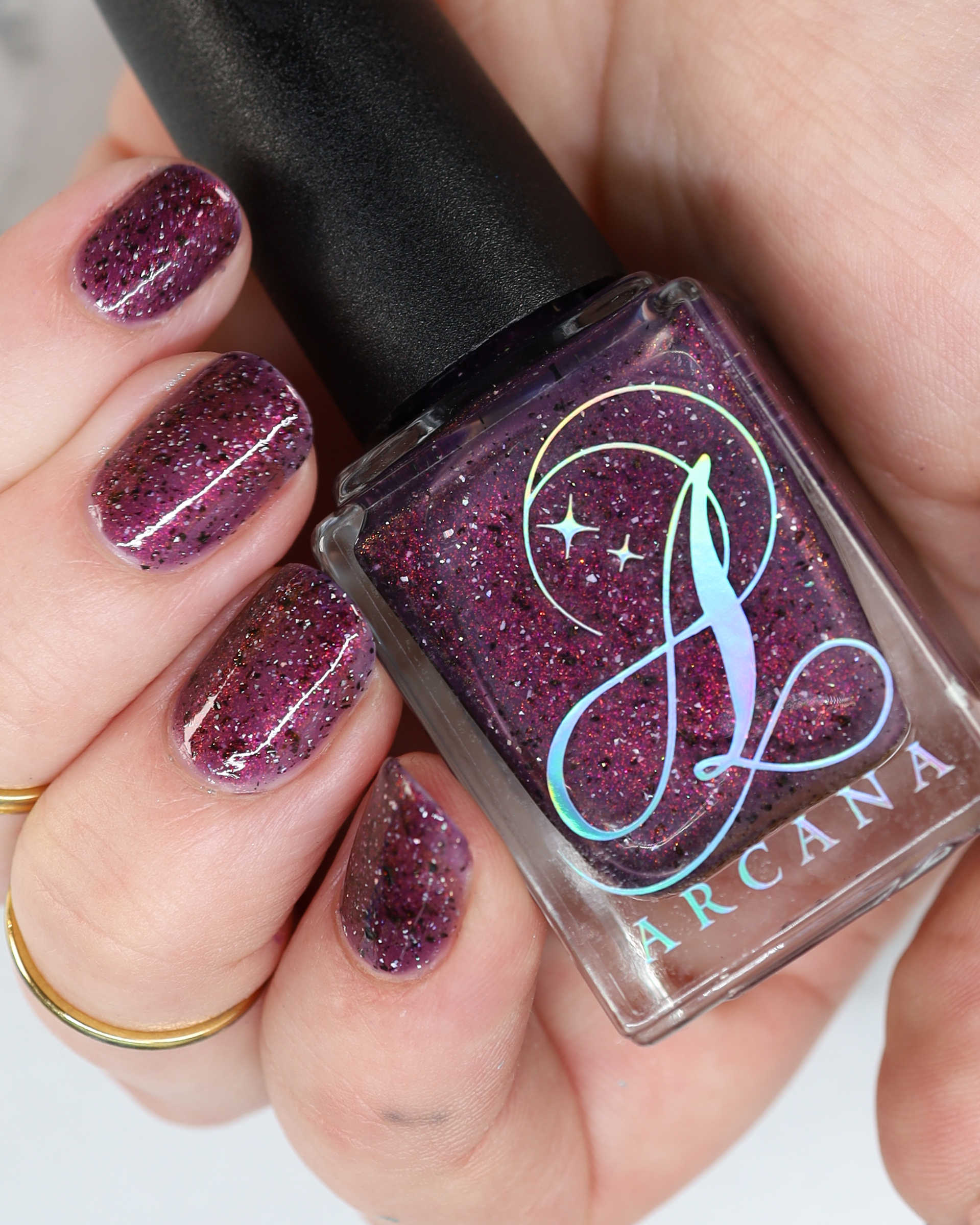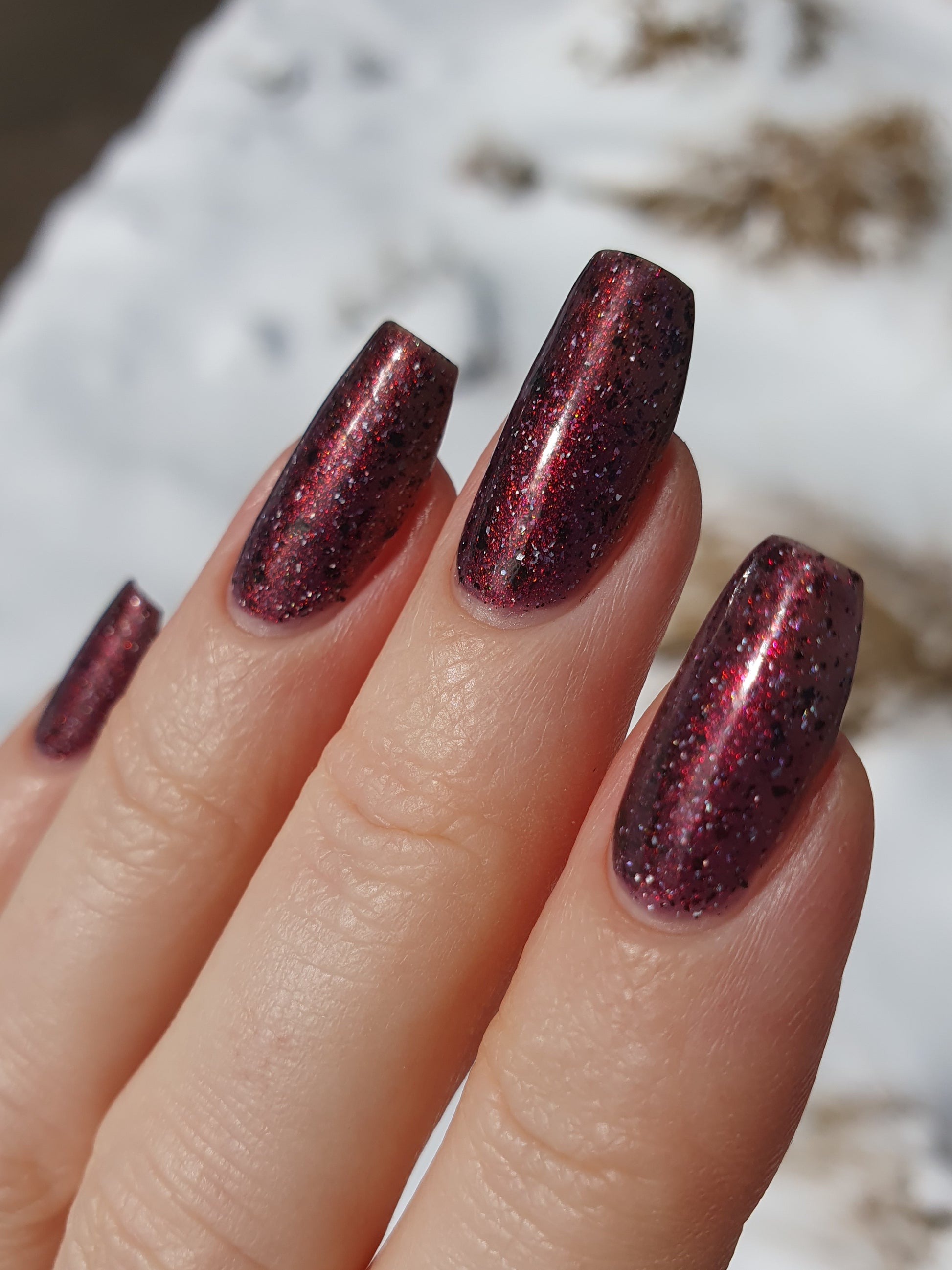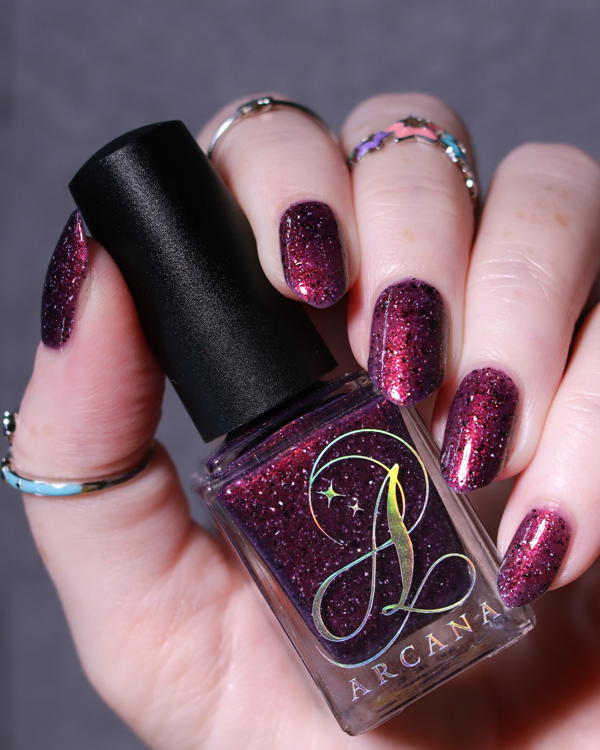 Gothicorn has a deep violet jelly base, red to orange shimmer, black flakes, and holographic microflakes!