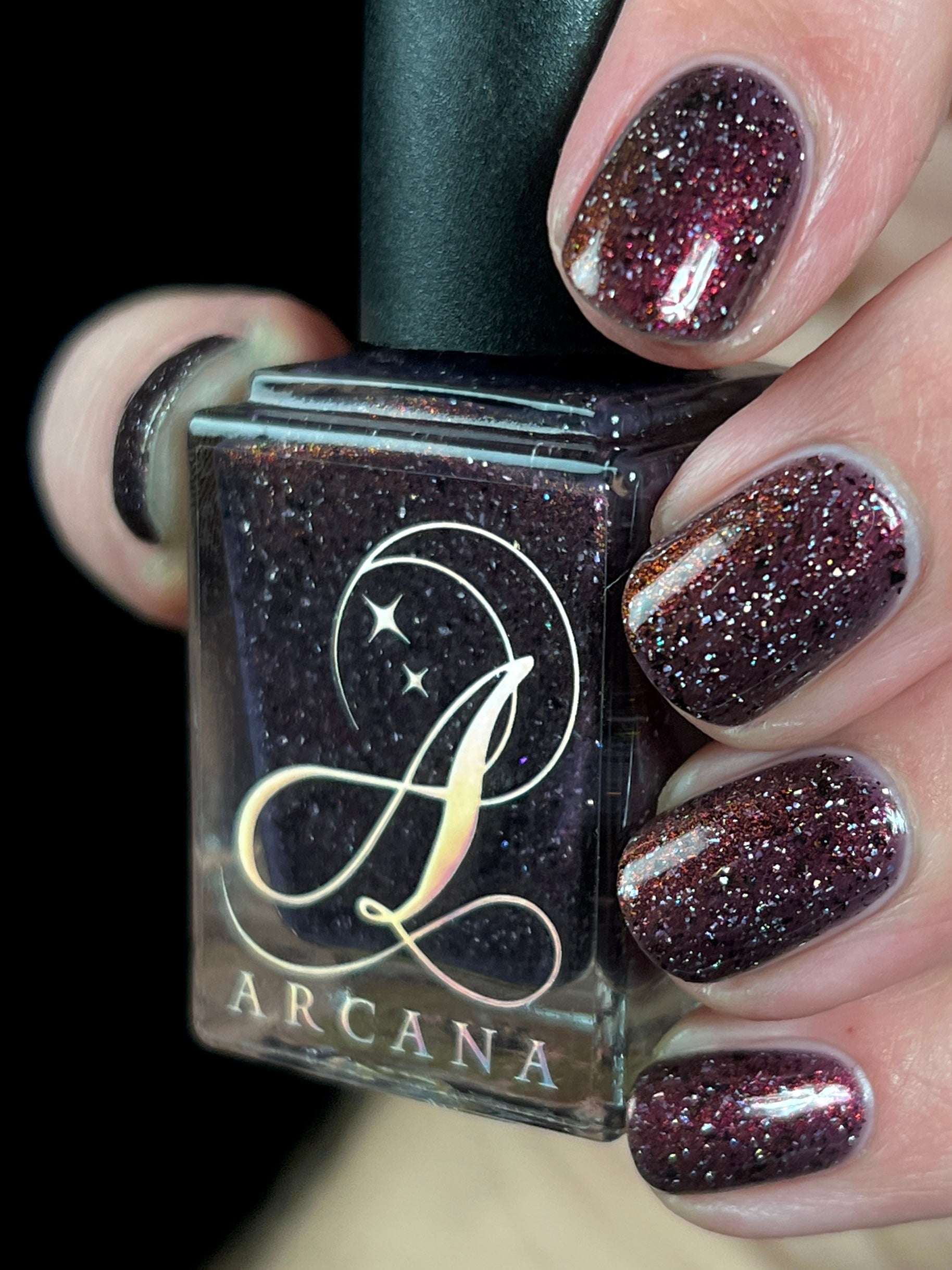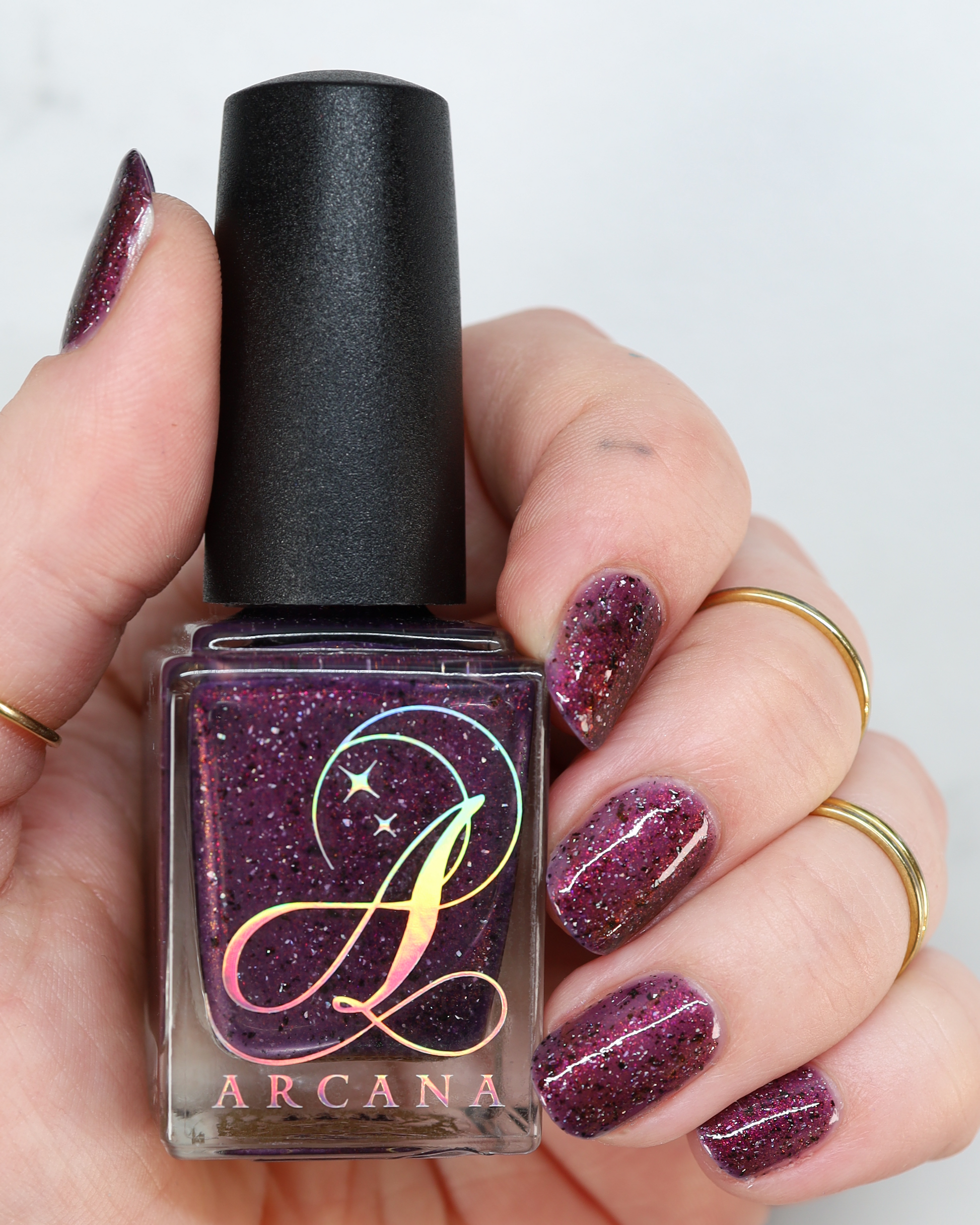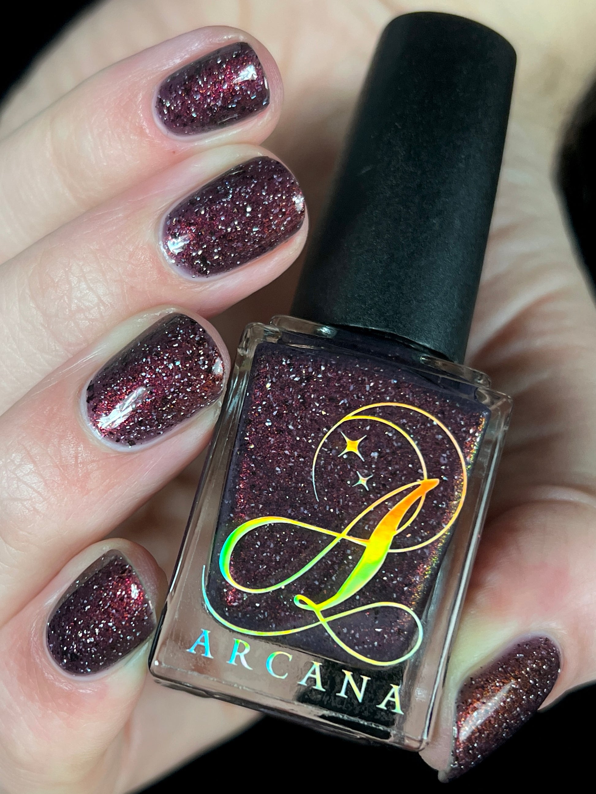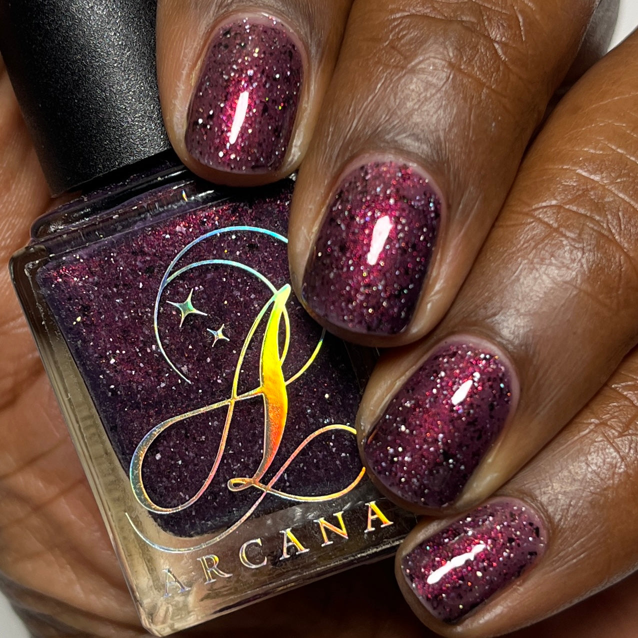 Gothicorn has a deep violet jelly base, red to orange shimmer, black flakes, and holographic microflakes!