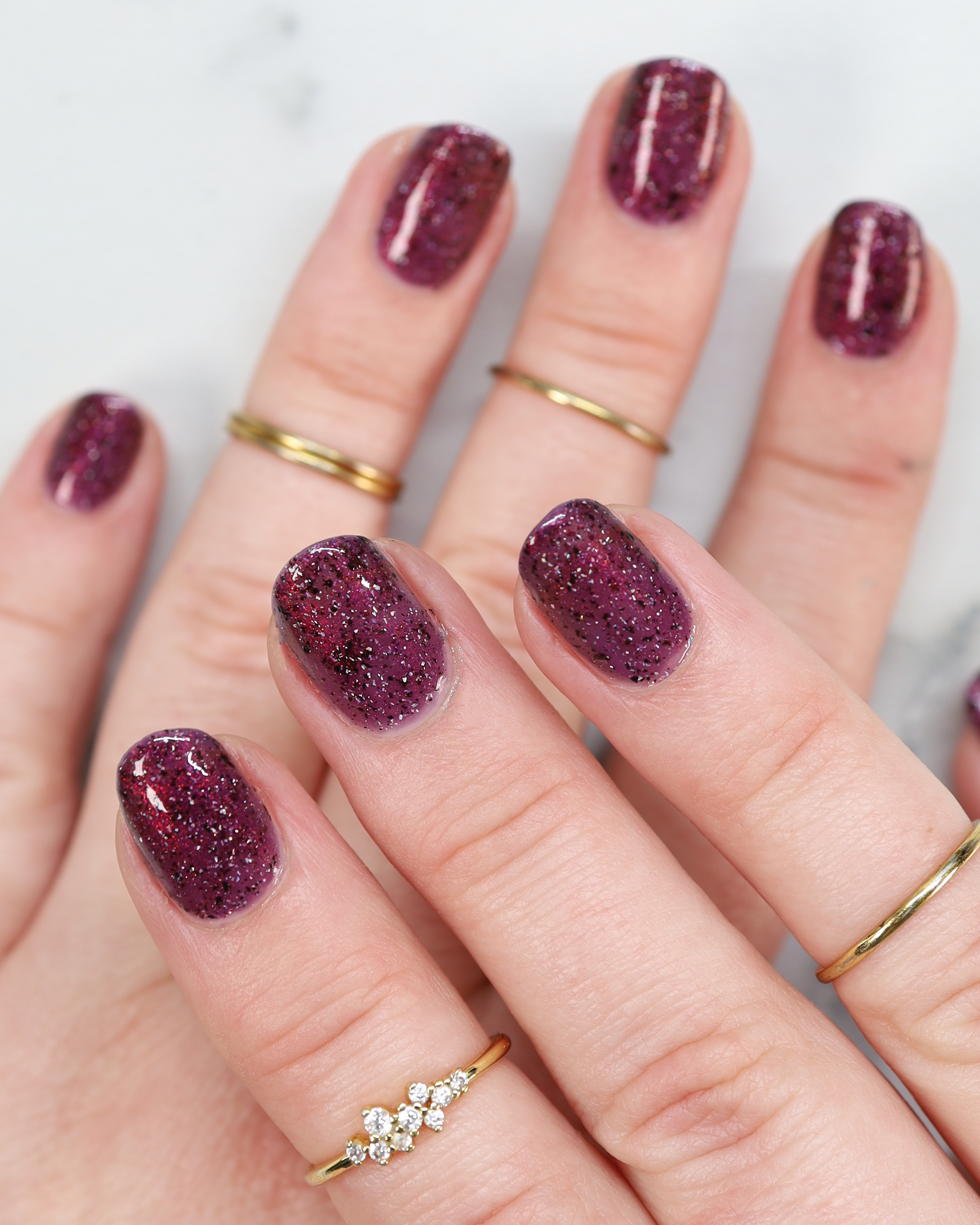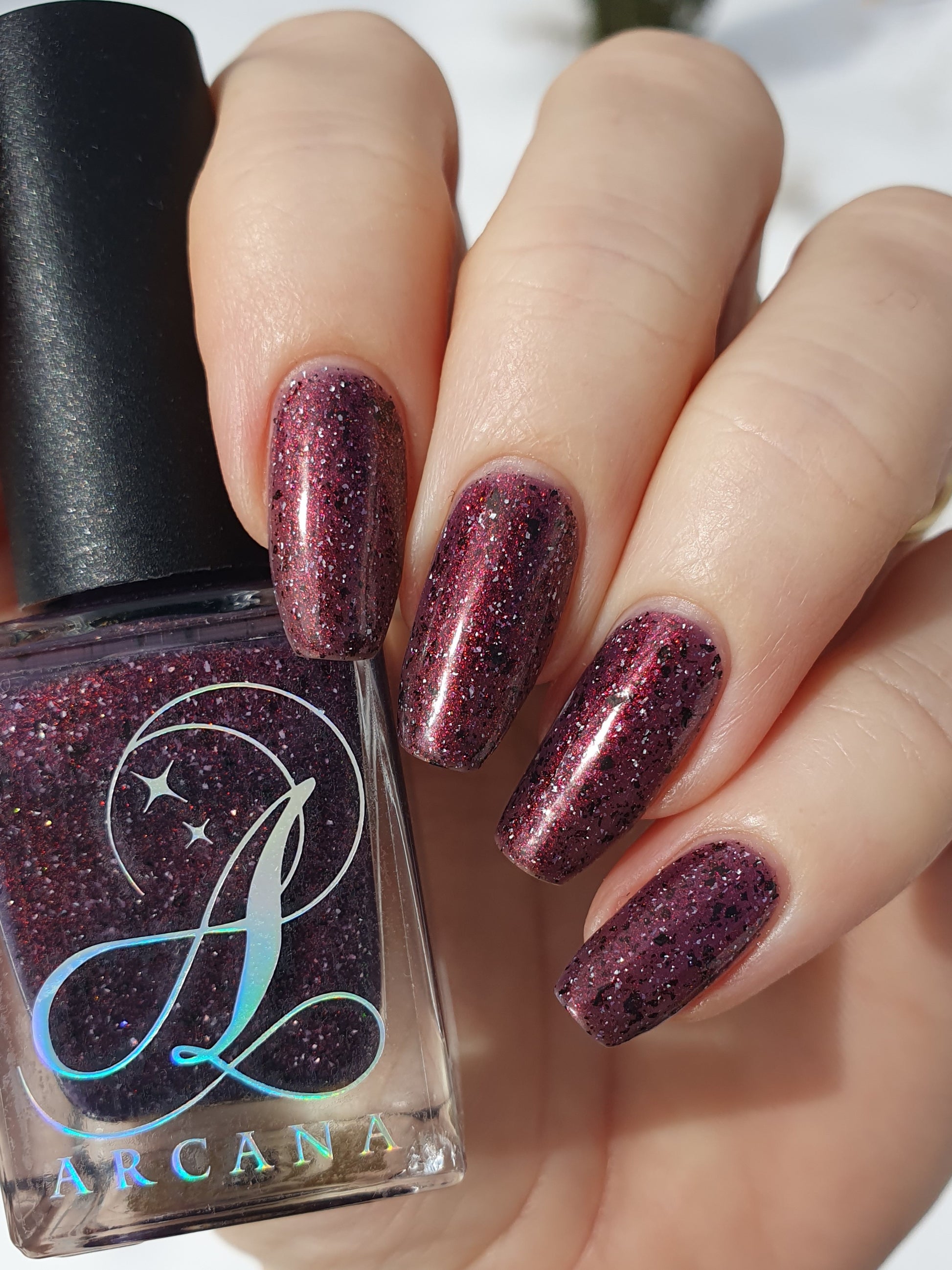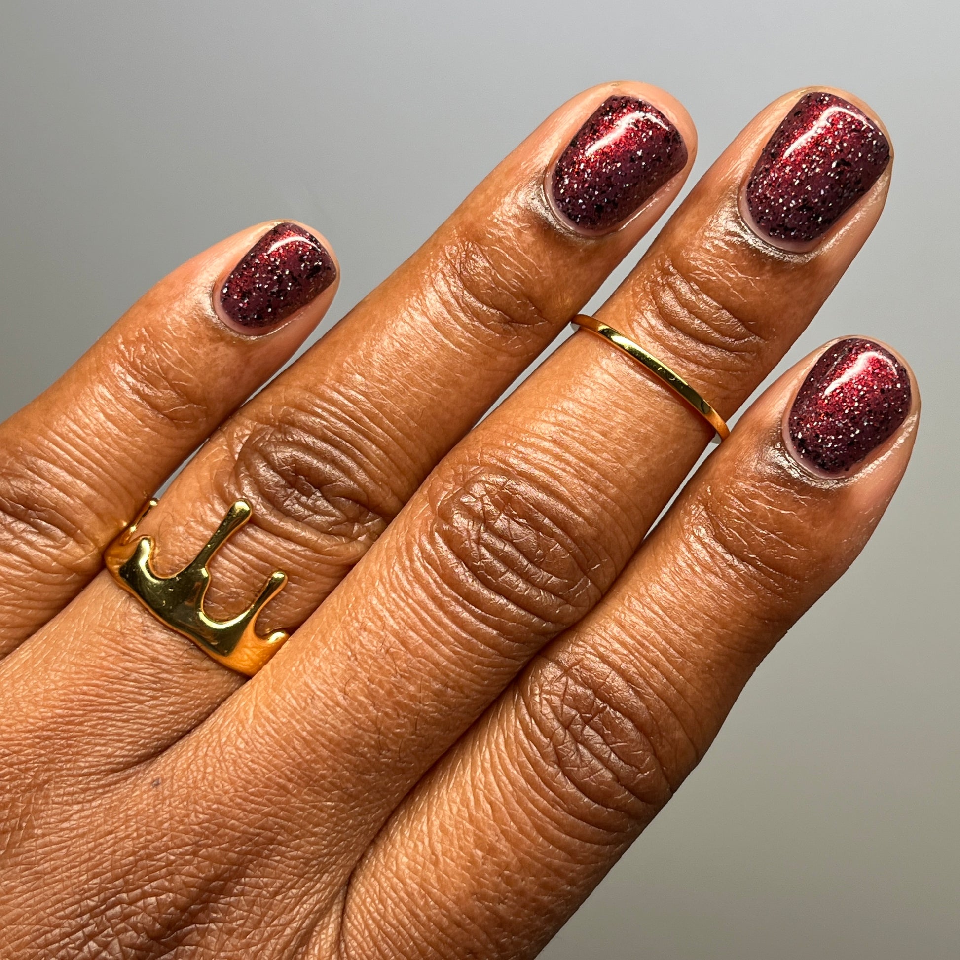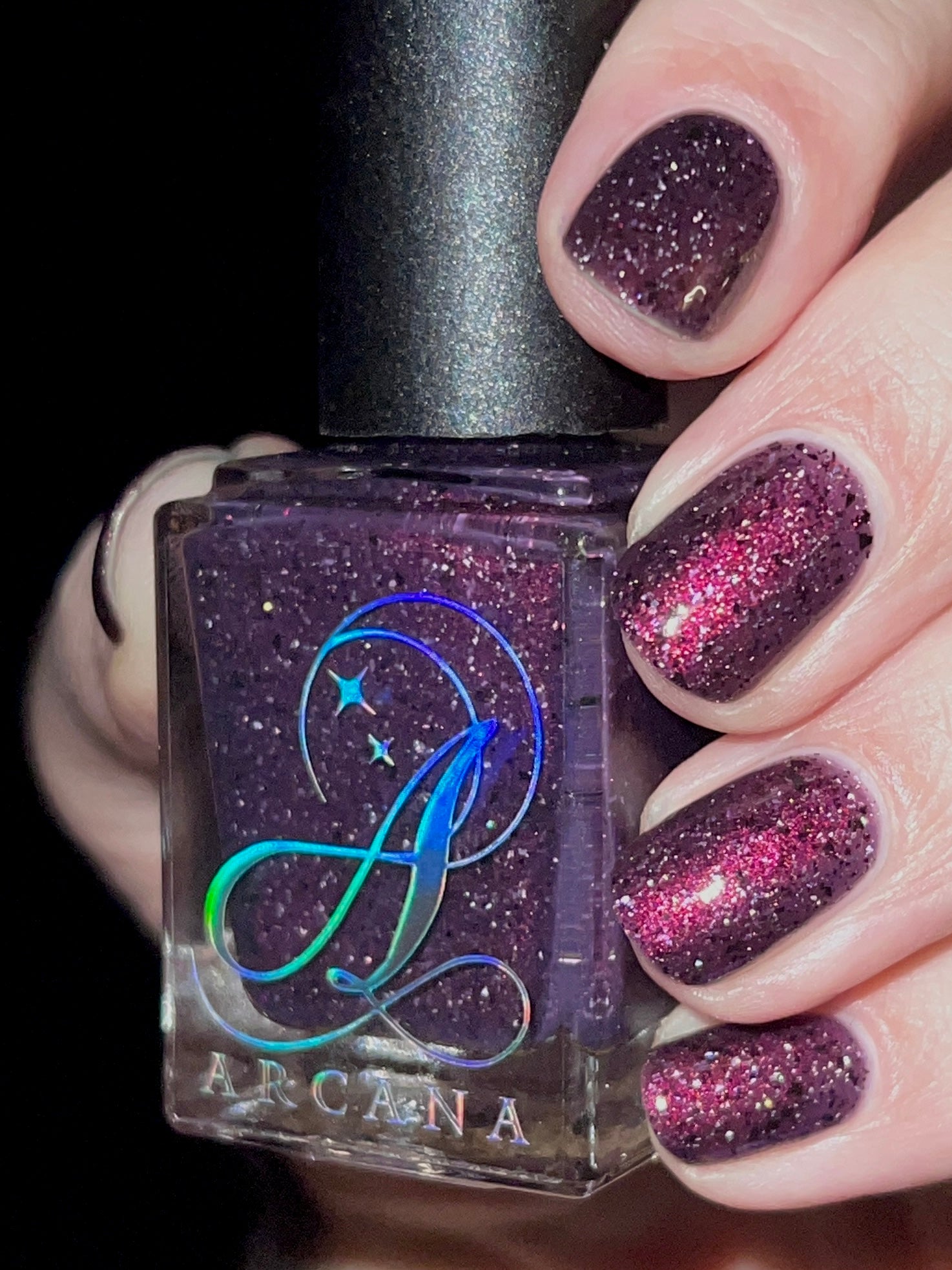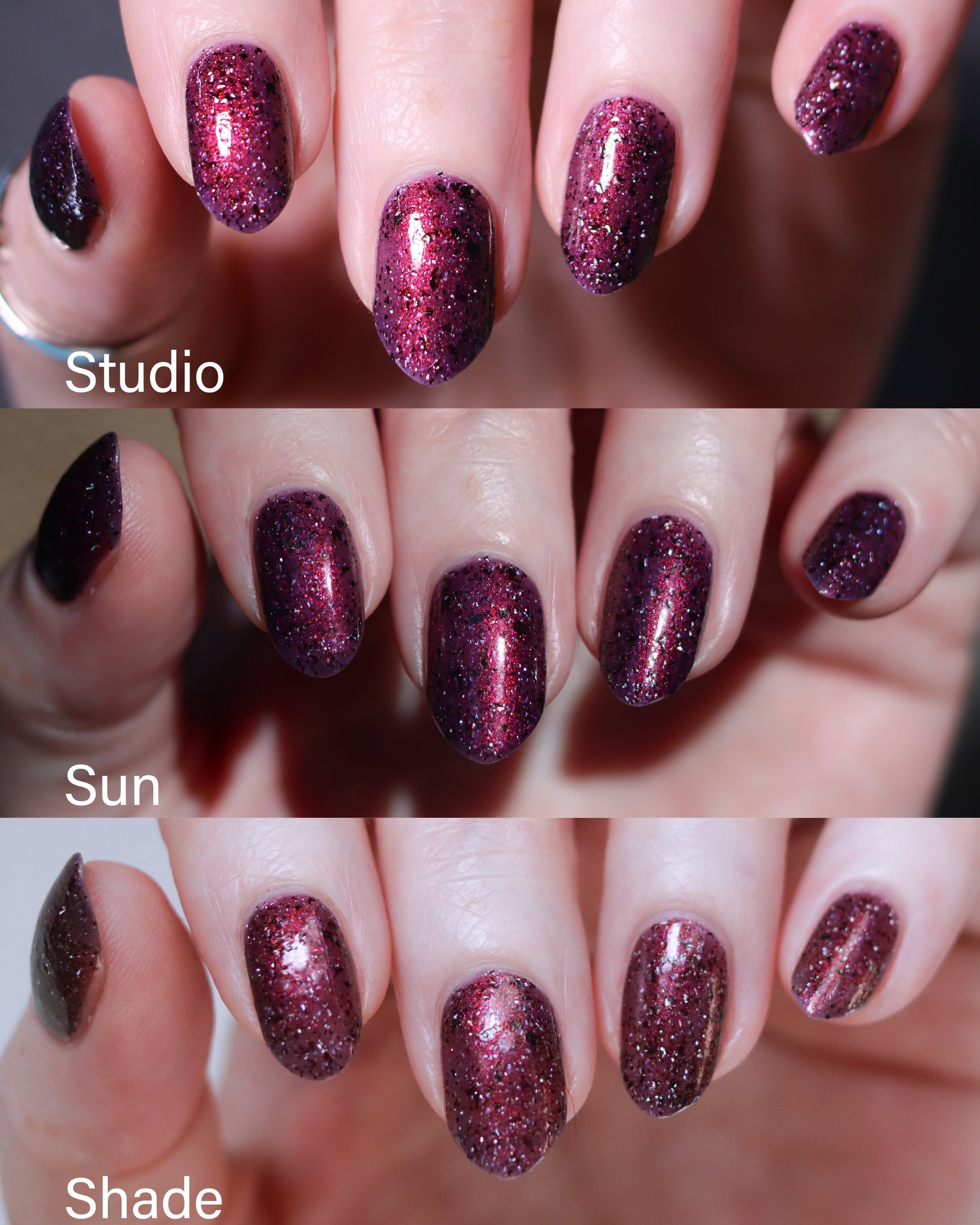 Gothicorn has a deep violet jelly base, red to orange shimmer, black flakes, and holographic microflakes!