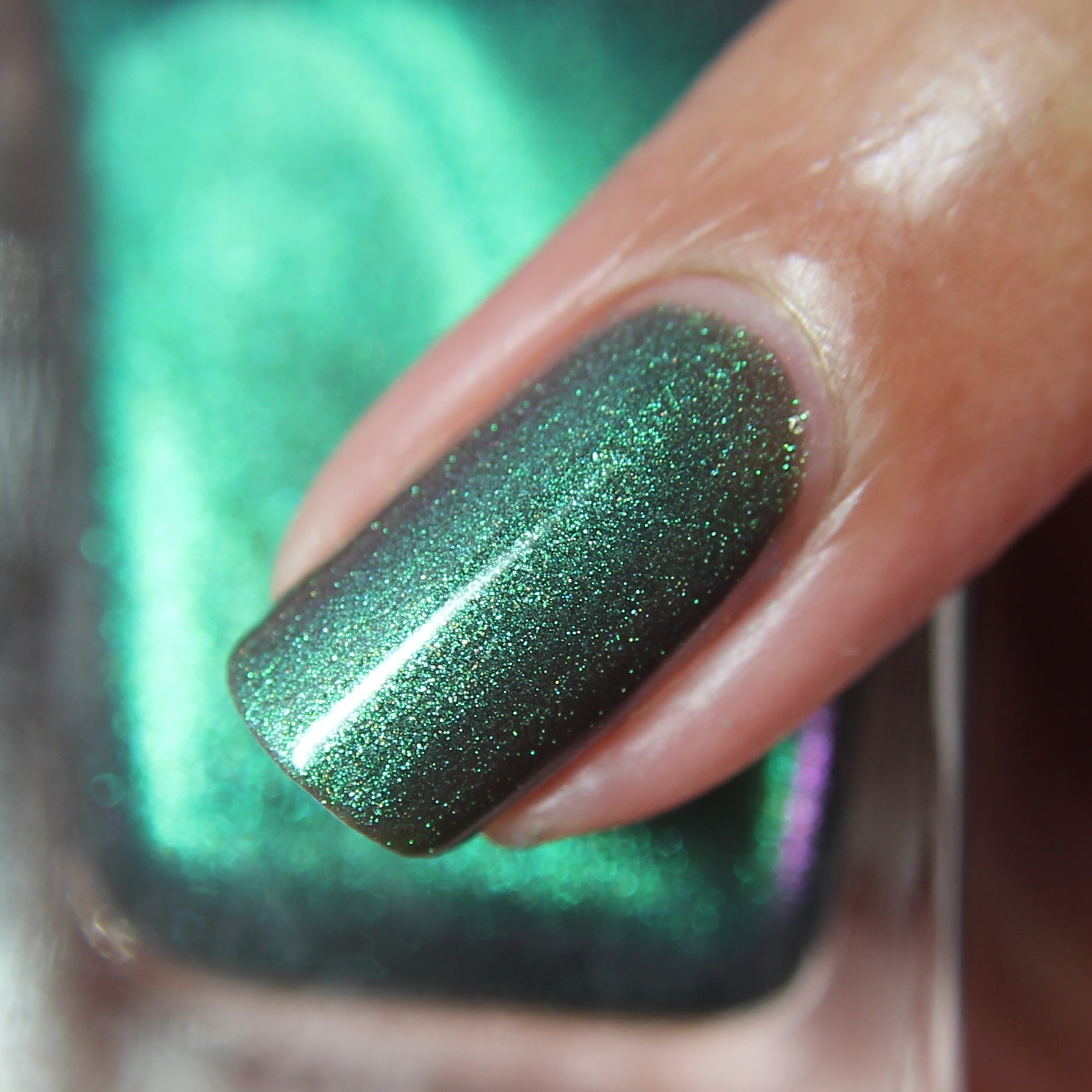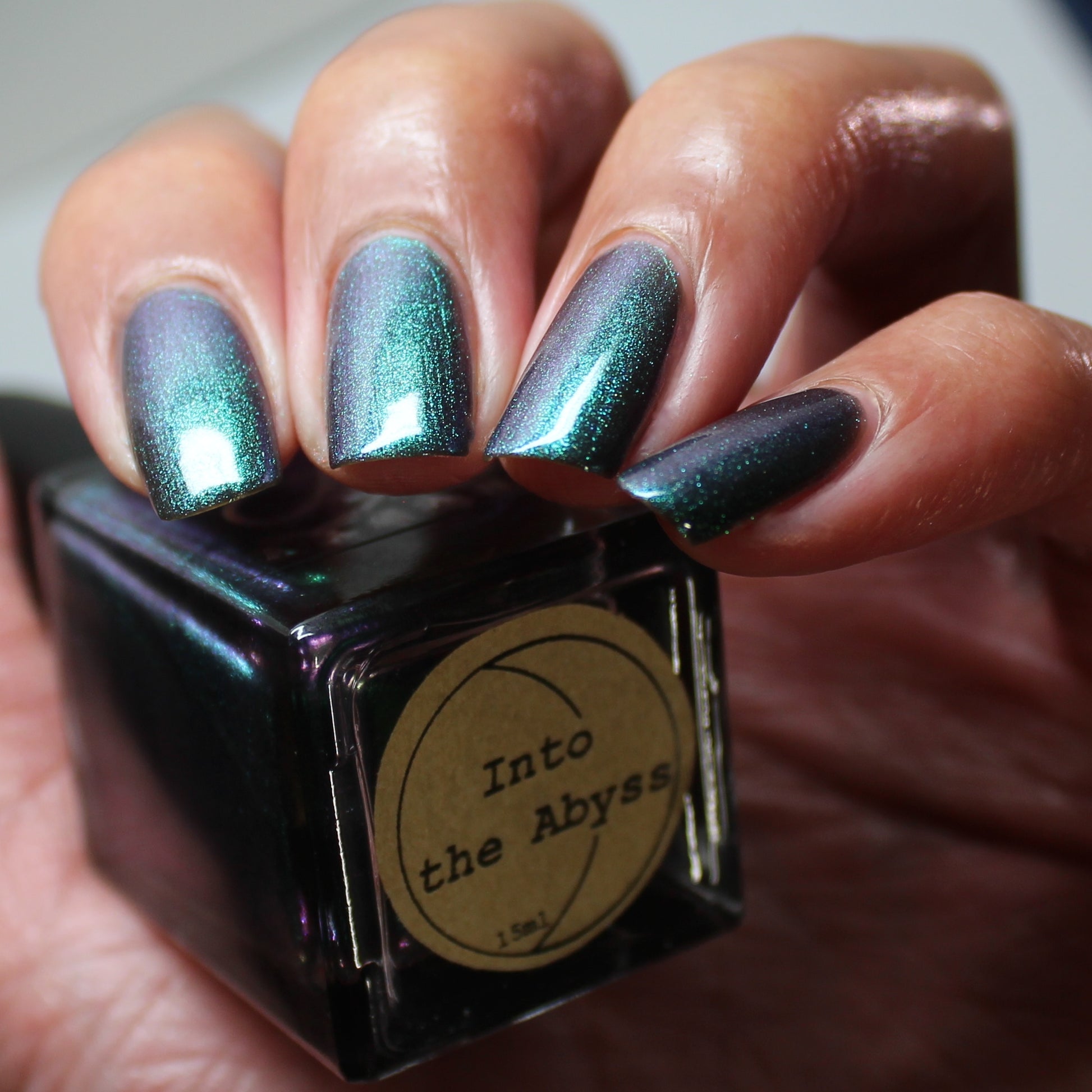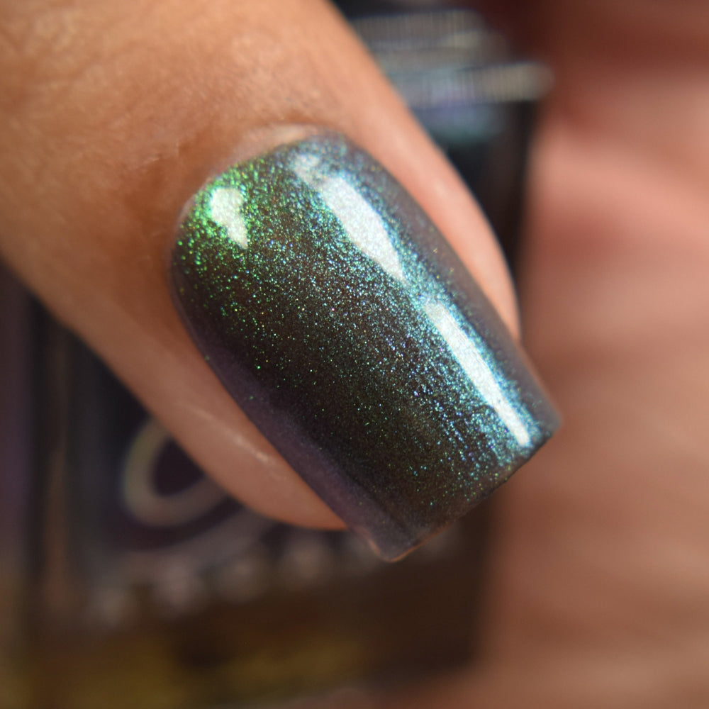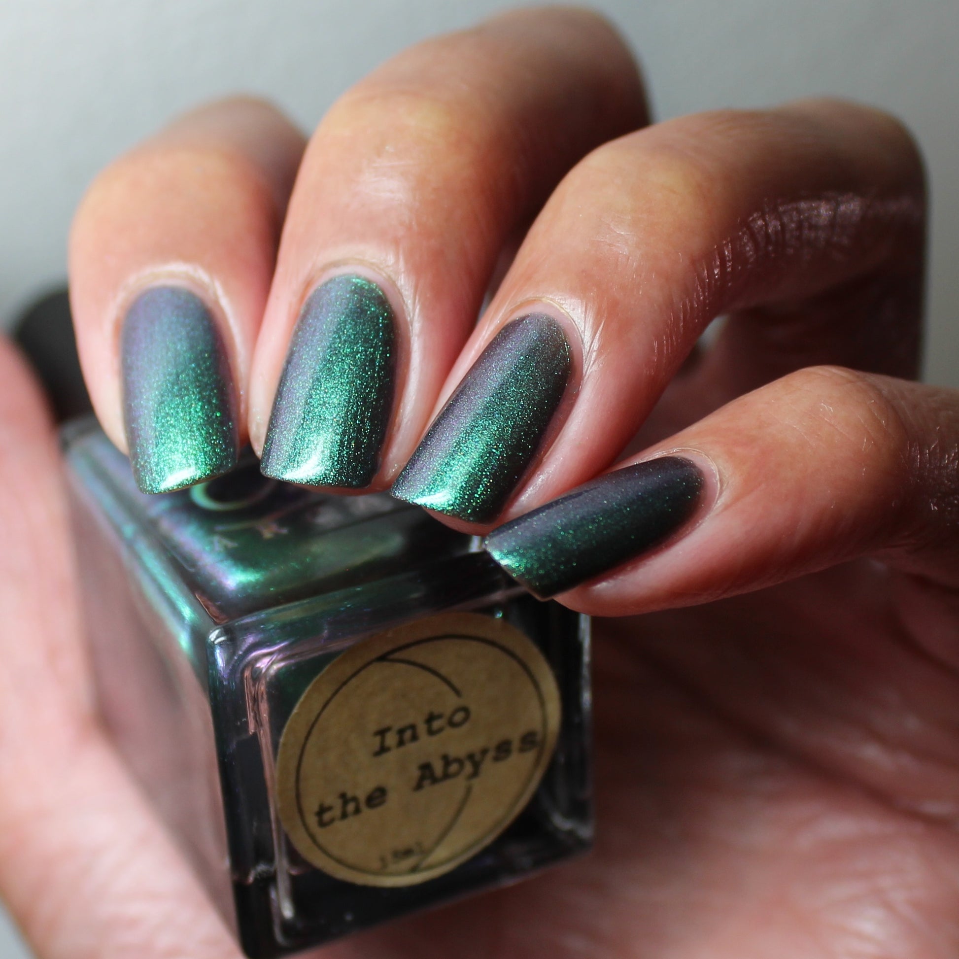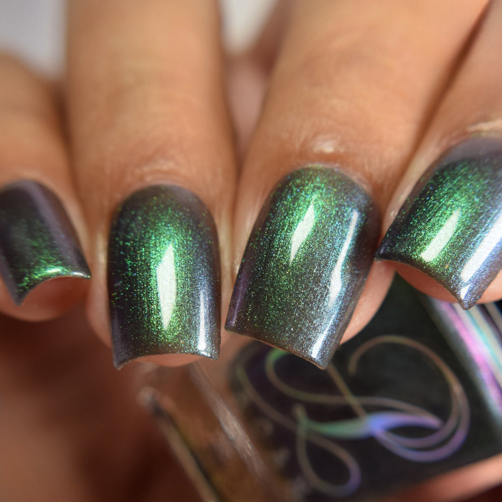 Into the Abyss is inspired by the depths of the ocean (and also the black and green nudibranch!) This polish has a smoky black base with strong larger particle green shimmer that shifts to purple at sharp angles.