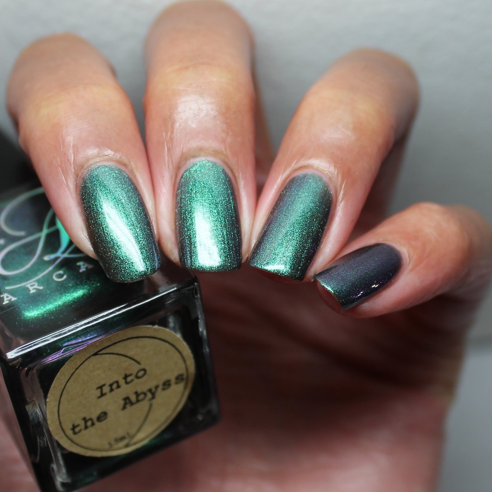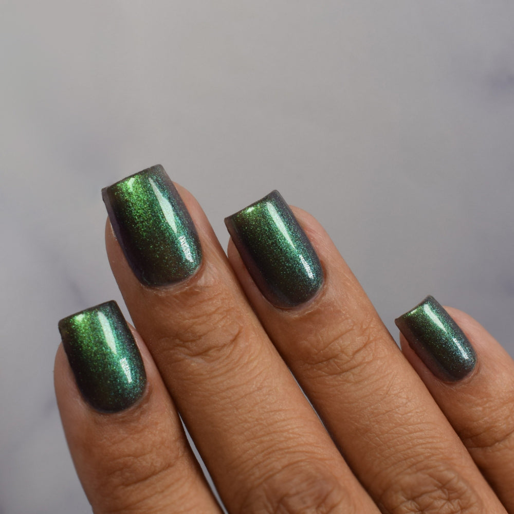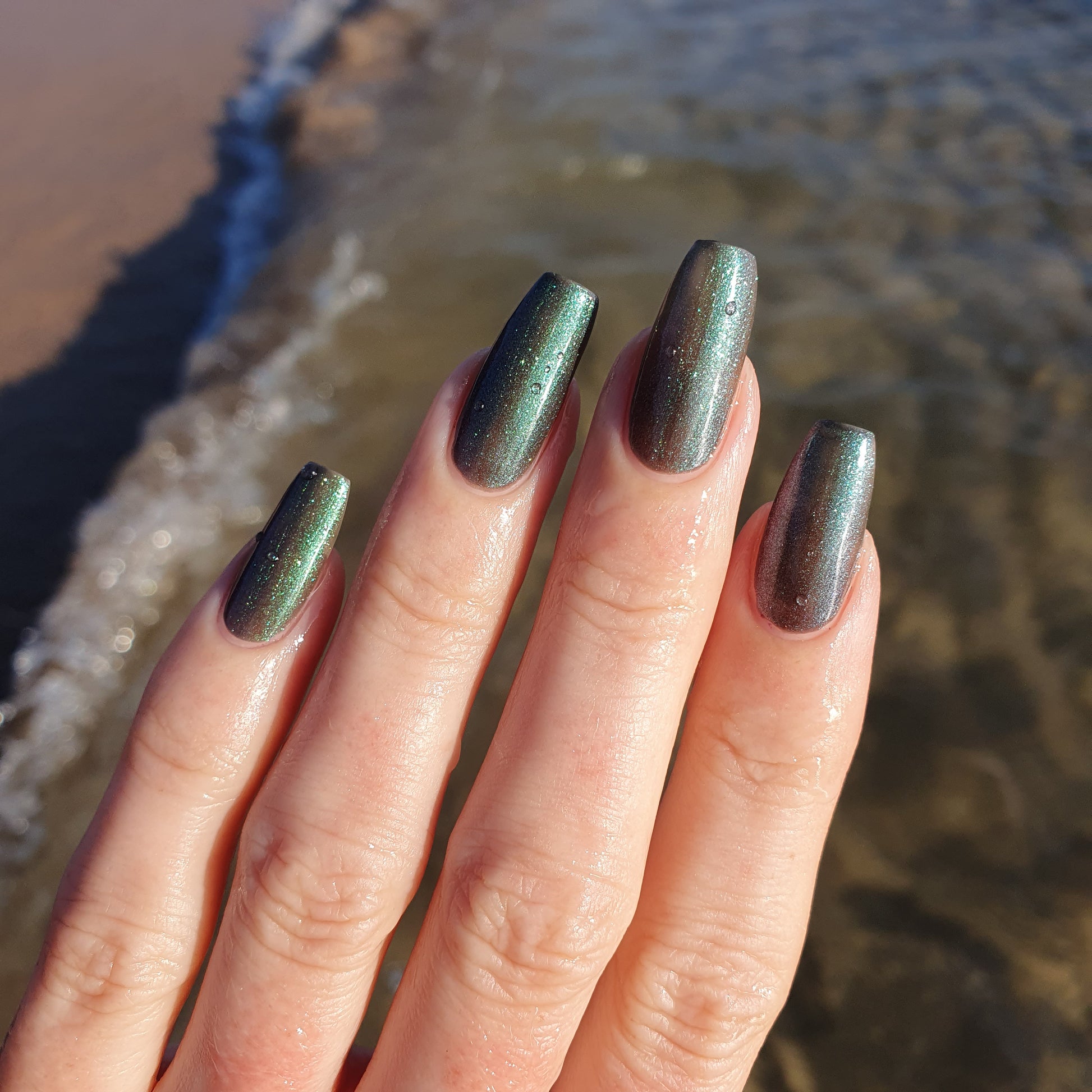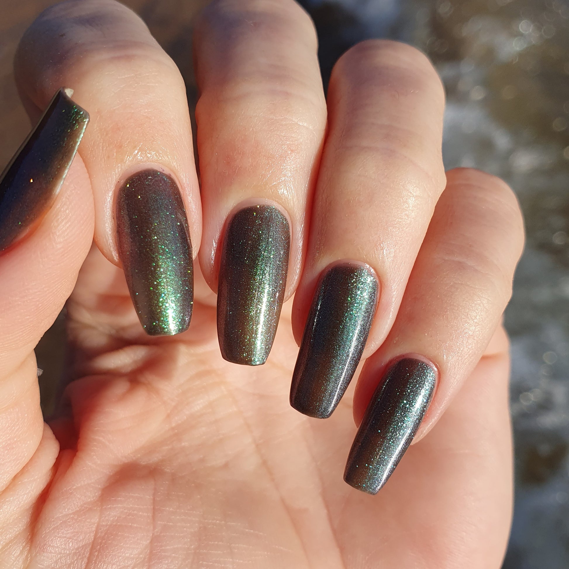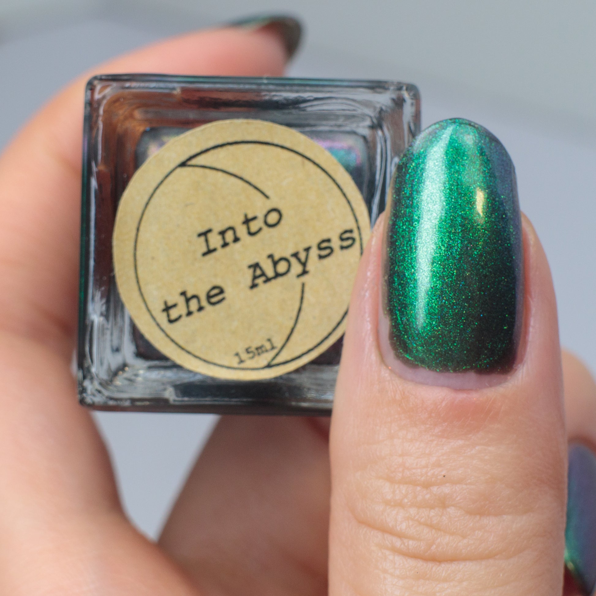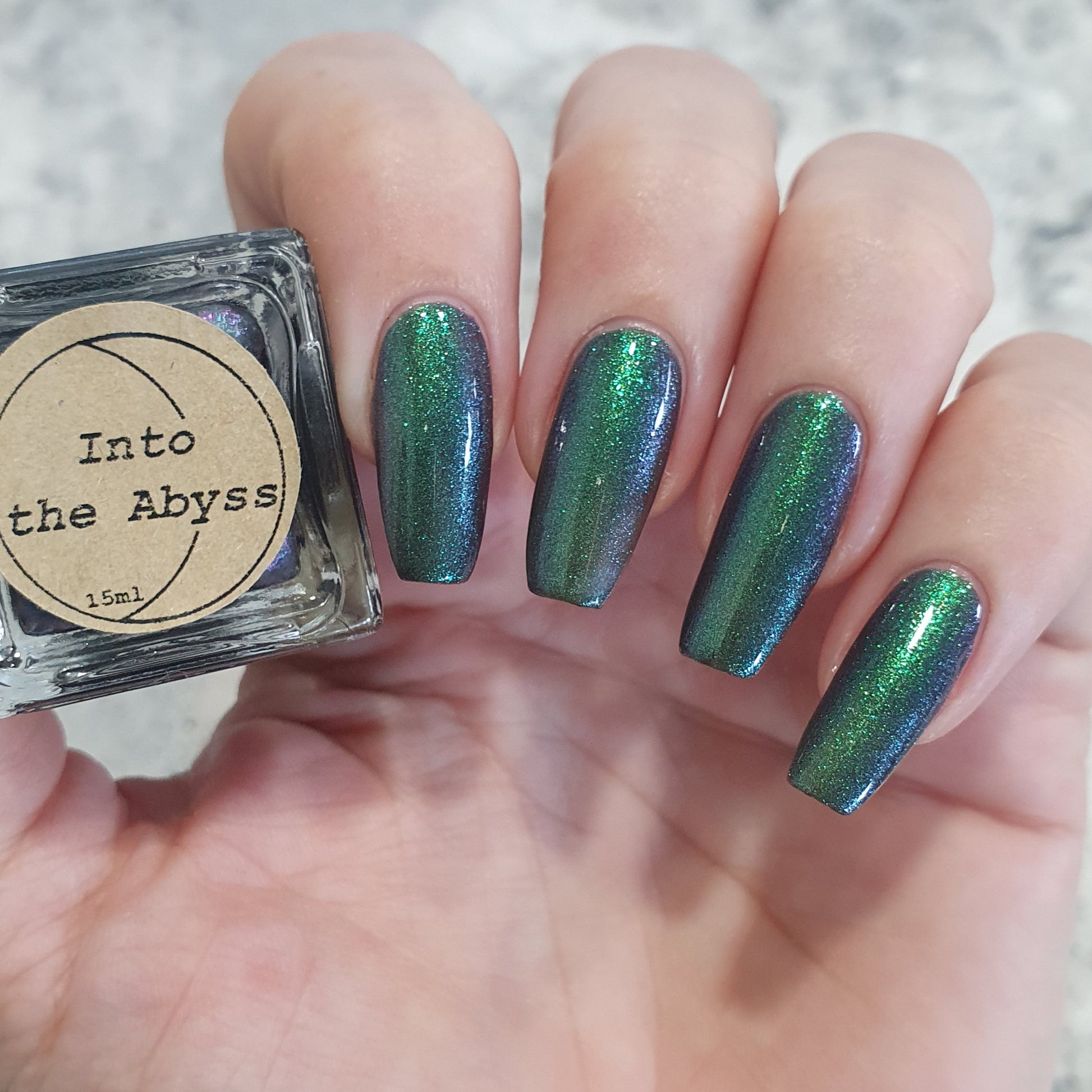 Into the Abyss is inspired by the depths of the ocean (and also the black and green nudibranch!) This polish has a smoky black base with strong larger particle green shimmer that shifts to purple at sharp angles.