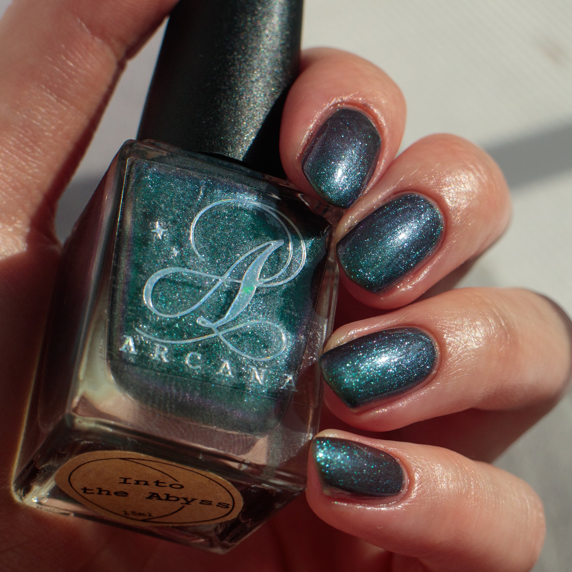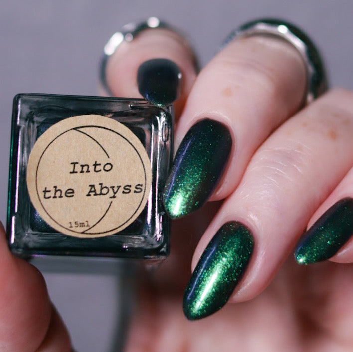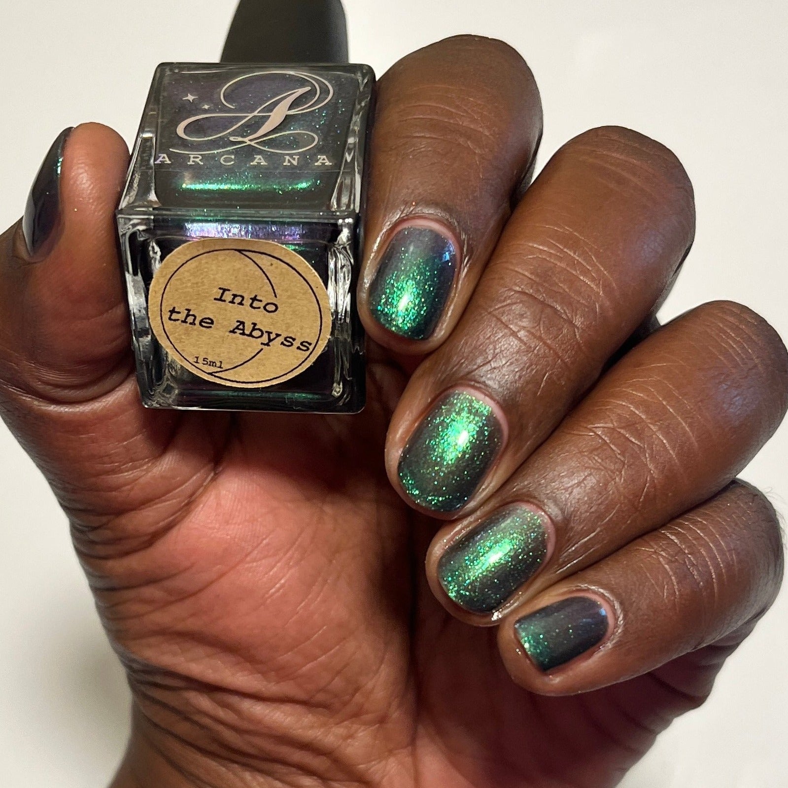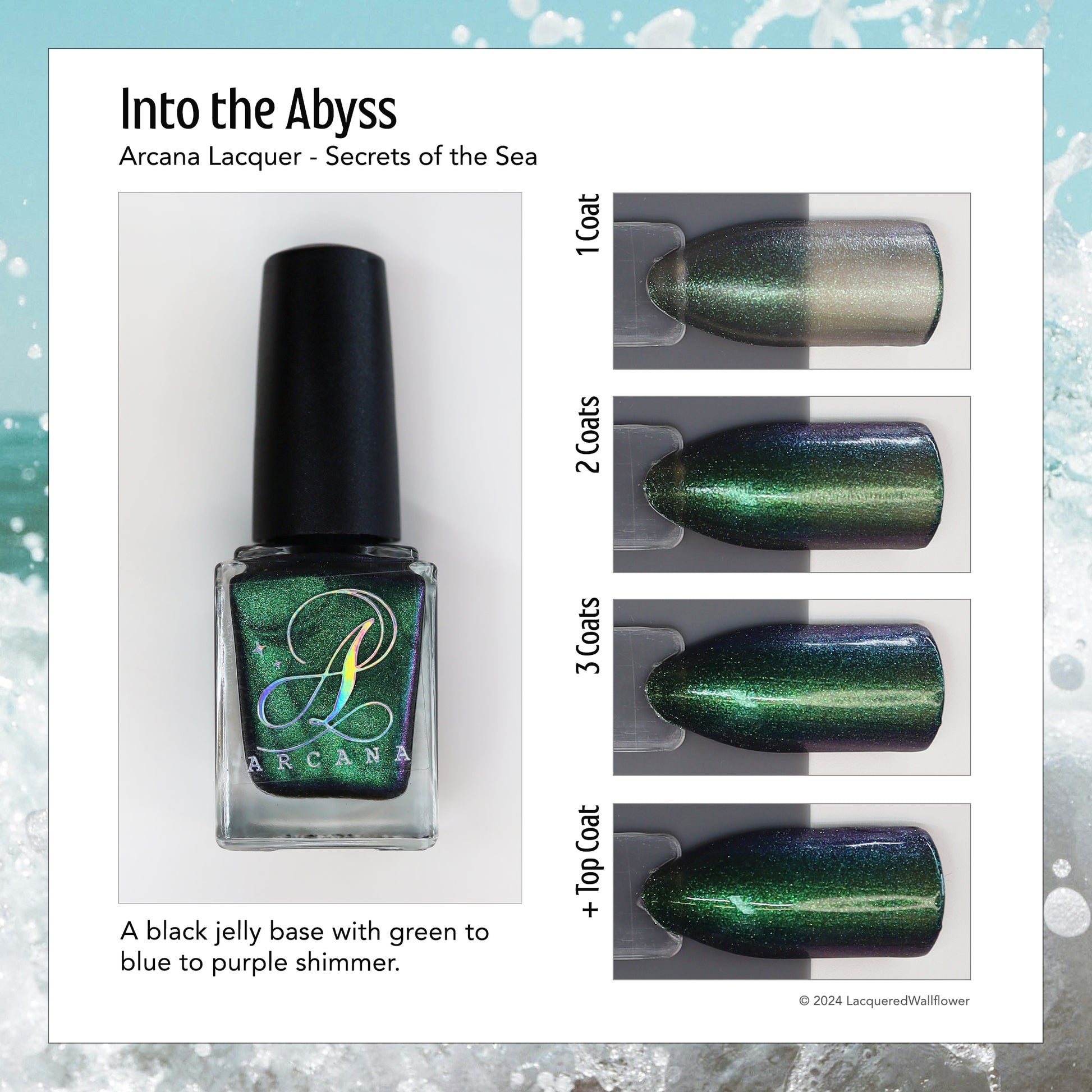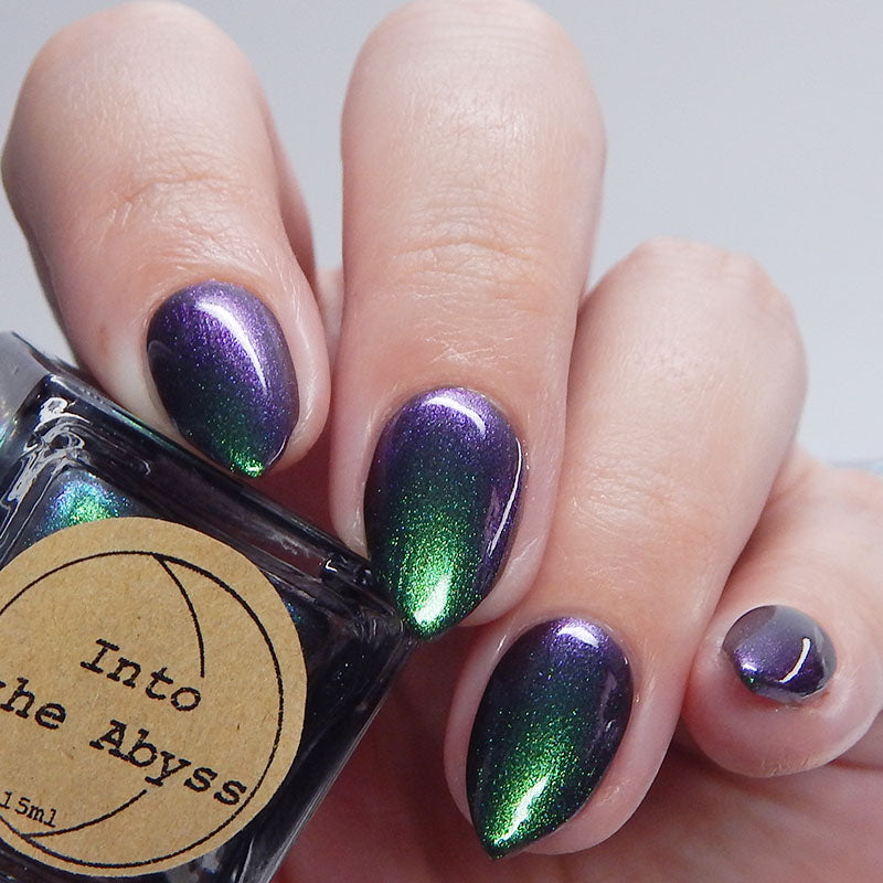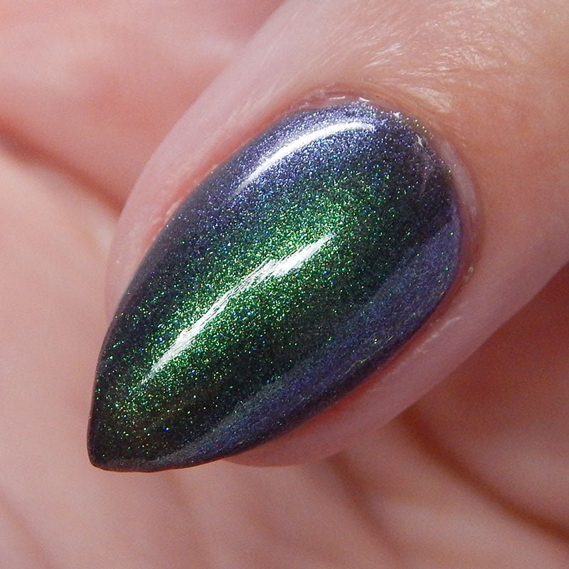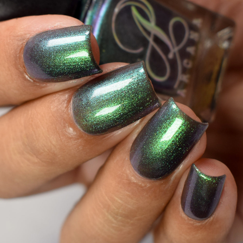 Into the Abyss is inspired by the depths of the ocean (and also the black and green nudibranch!) This polish has a smoky black base with strong larger particle green shimmer that shifts to purple at sharp angles.