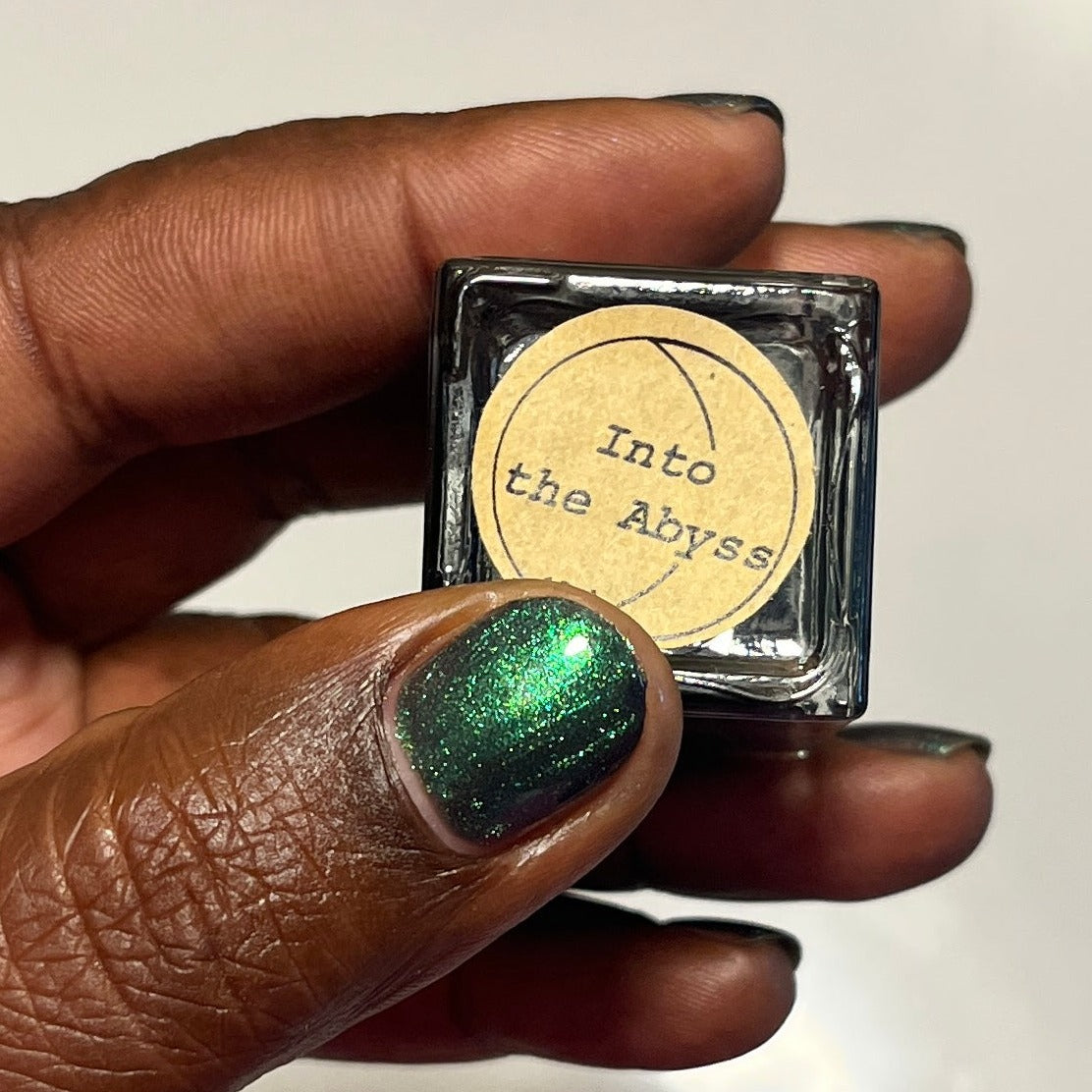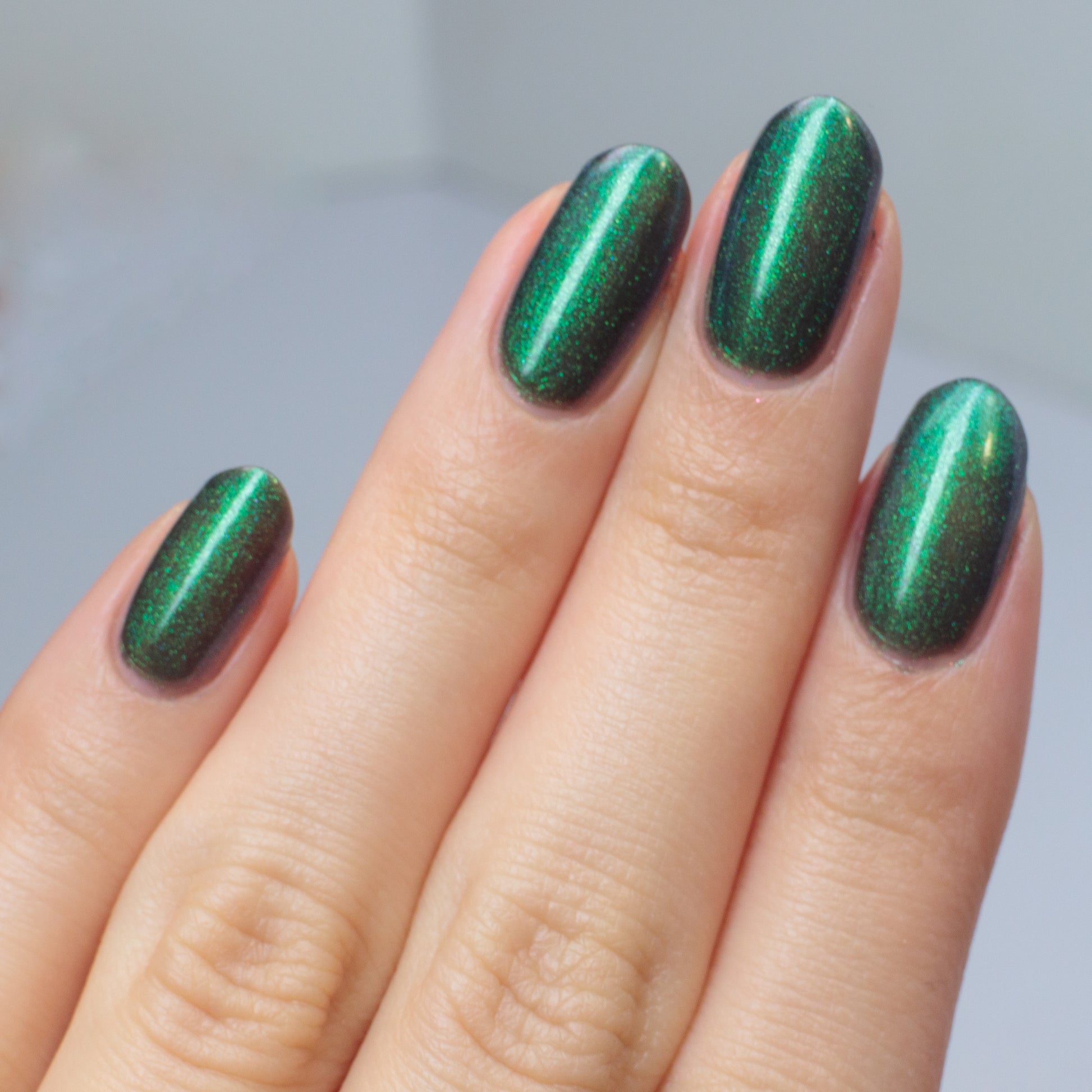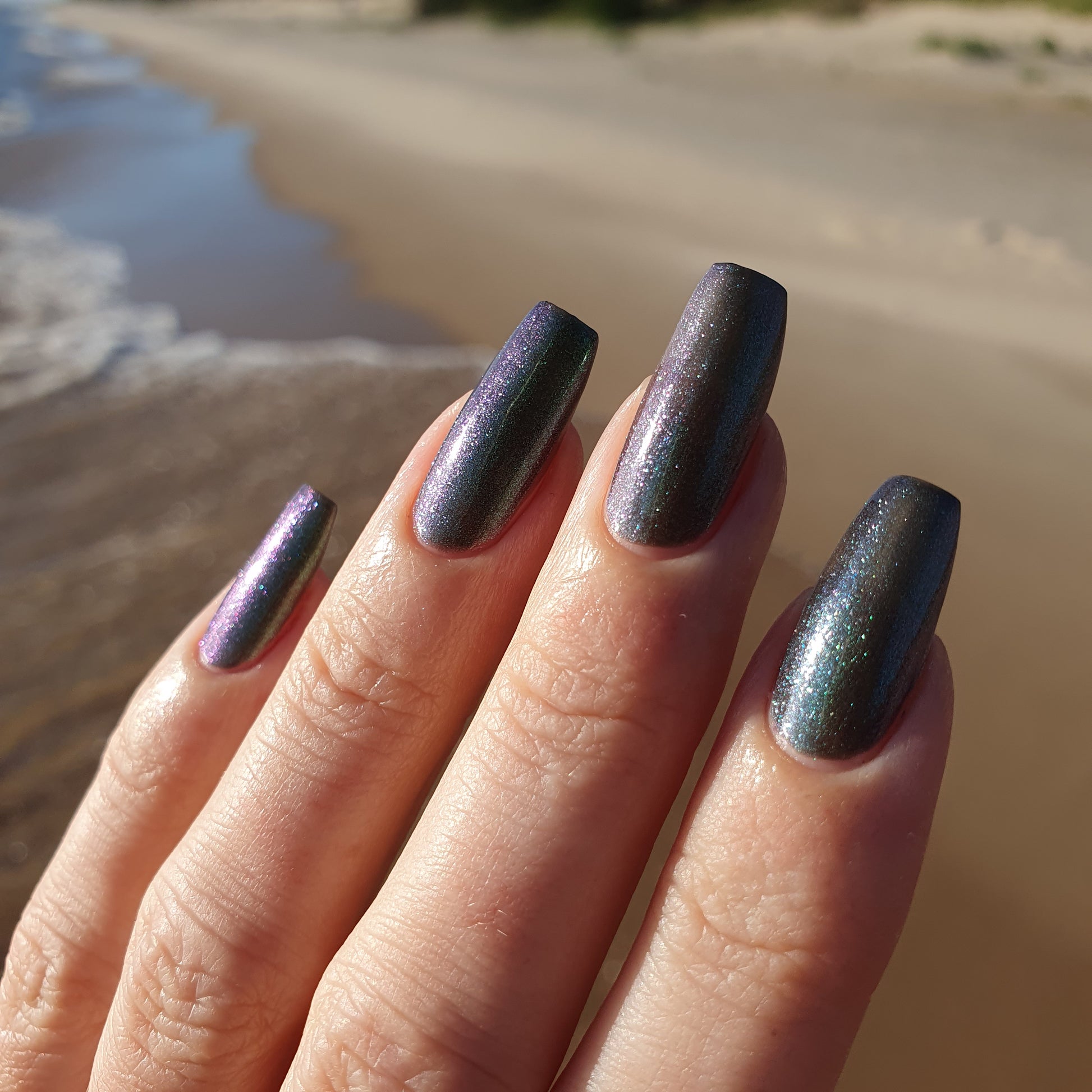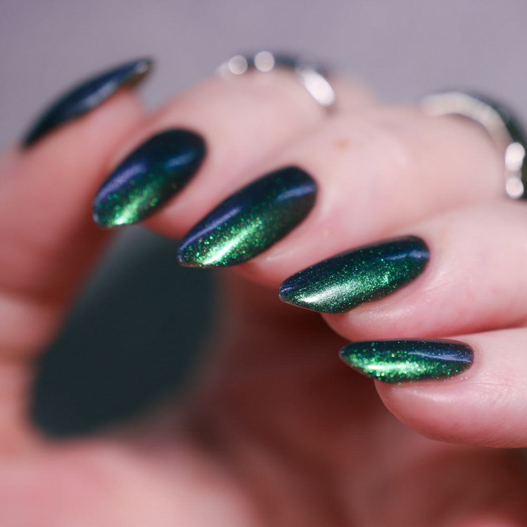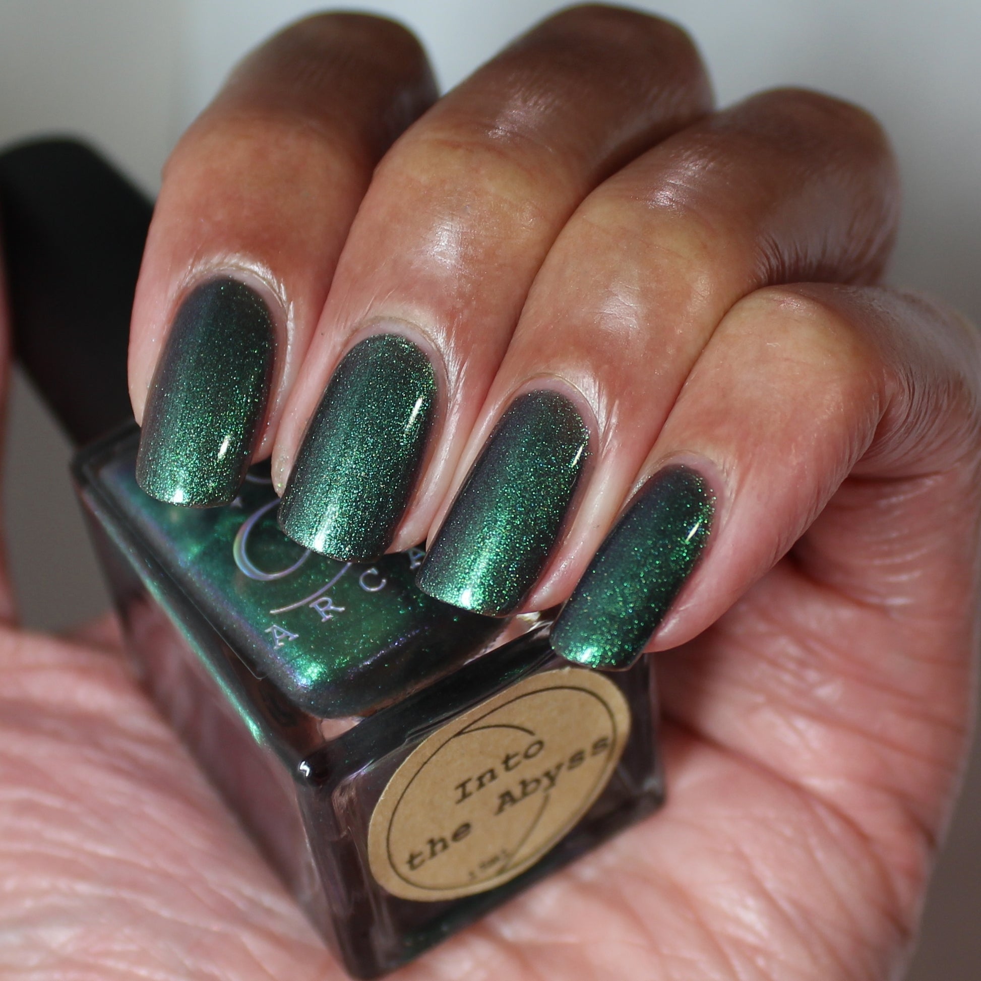 Into the Abyss is inspired by the depths of the ocean (and also the black and green nudibranch!) This polish has a smoky black base with strong larger particle green shimmer that shifts to purple at sharp angles.